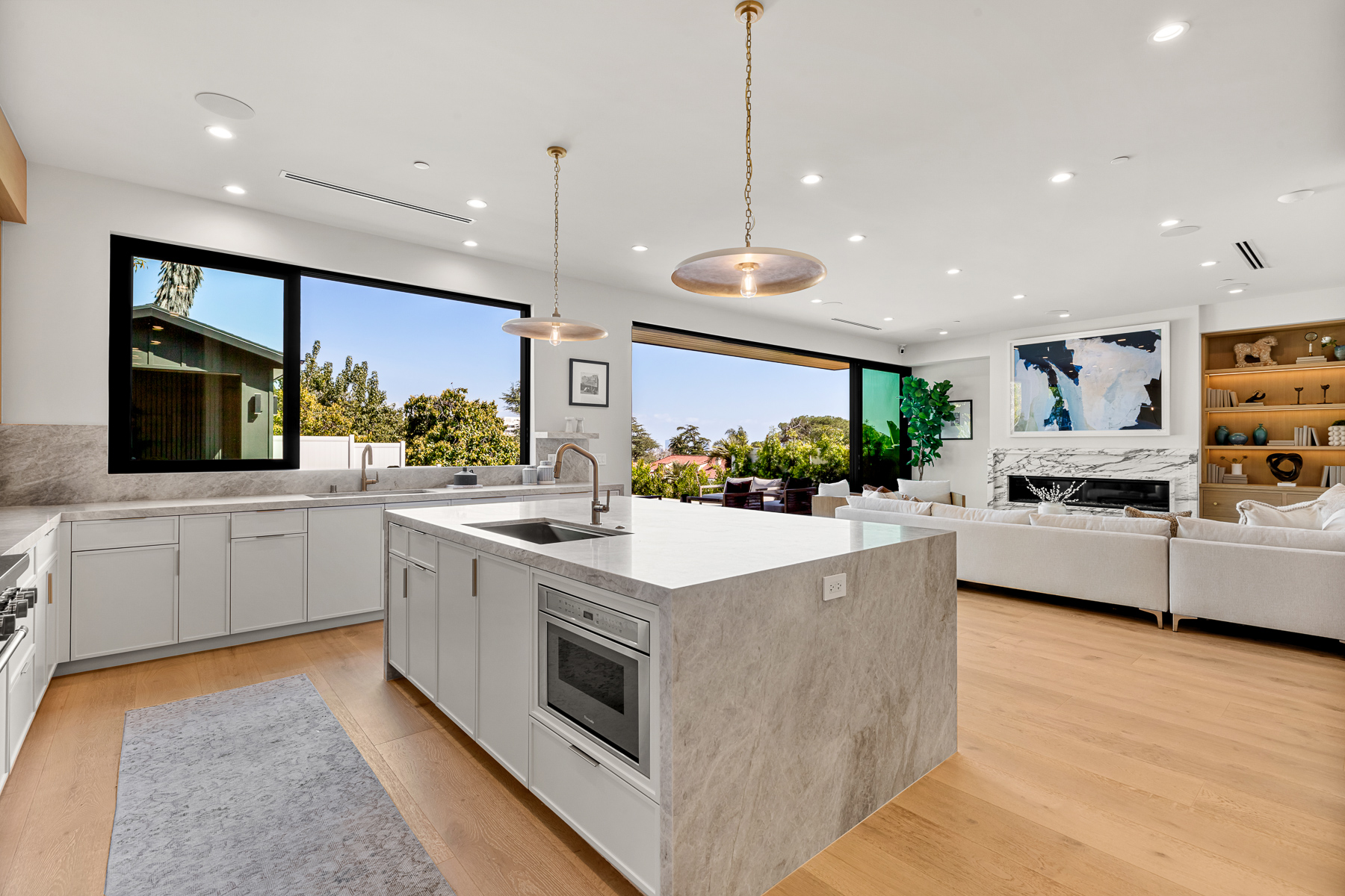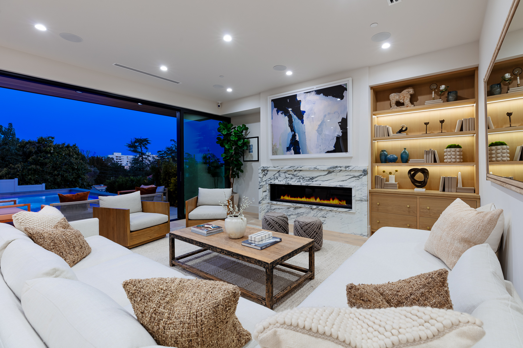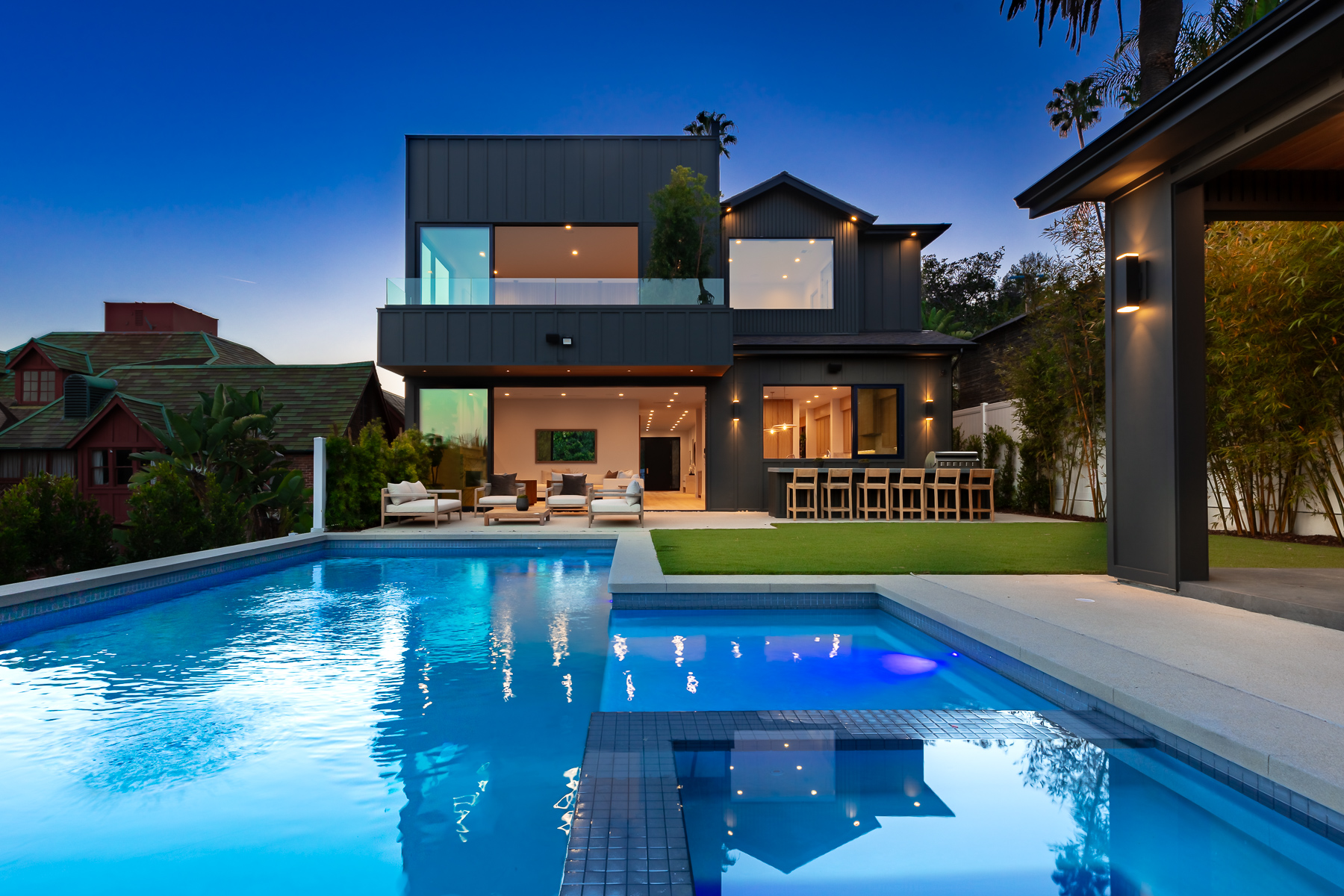 Hollywood Hills New Modern Luxury Estate with captivating Architecture is an undisputed Masterpiece with unparalleled Elegance and Sophistication. Spanning over 5,033 Square feet of indoor-outdoor living space and set on a huge 7,900 sq foot flat lot, with views of Downtown to Catalina Island, this is a rare find, truly one of a kind! Entryway opens to the grand foyer showcasing an incredible amount of natural light! Beyond the entry, the great room seamlessly flows into the striking gourmet kitchen, truly built for those who love to cook, with its Taj Mahal quartzite countertops, large center island, and lots of counter space which blends in beautifully with the naturally colored wood accents throughout the house. Top of the line Thermador appliances, butler pantry with a wall of glass sliding doors that open to the private backyard retreat with pool with spa and baja shelf, Plus cabana with a full bathroom, built-in BBQ with bar, perfect for large Hollywood Style Parties. The luxurious main suite is complete with a private balcony with stunning views of the Hollywood Hills, city lights. The awe-inspiring bathroom has double vanities, soaking tub, oversized shower, soaking tub, and a huge walk-in closet. This beautiful home has amenities throughout including an additional 3 ensuite bedrooms with built-in closets, a large theater room, bar, and state of the art sound systems throughout. Hosting an unmatched outdoor setting perfect for both entertaining and intimate settings, the backyard features an oversized pool with a spa, built in barbeque, a spacious grassy area, and covered cabana perfect for dining or lounging. The rooftop deck with amazing views as well as a firepit for complete entertainment, with the stars! Oversized 2 car garage plus room for 2 more cars in the driveway is hedged, private, and gated. This undisputed masterpiece with unparalleled luxury & modern finishes will not last. Set on quite a dead-end street near the largest off leash dog park in America; Runyon Canyon, this home in perfect location, near Sunset Strip, Hollywood, and the hottest trendy restaurants in West Hollywood nightlife, this home is perfect for the entertainer in you!