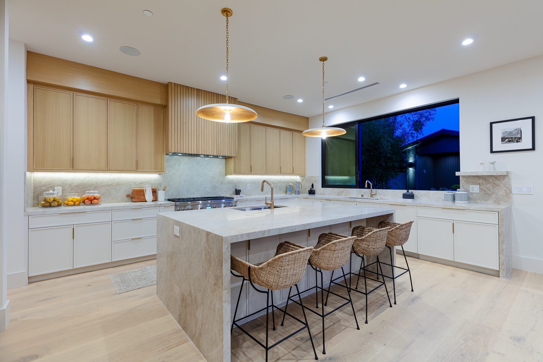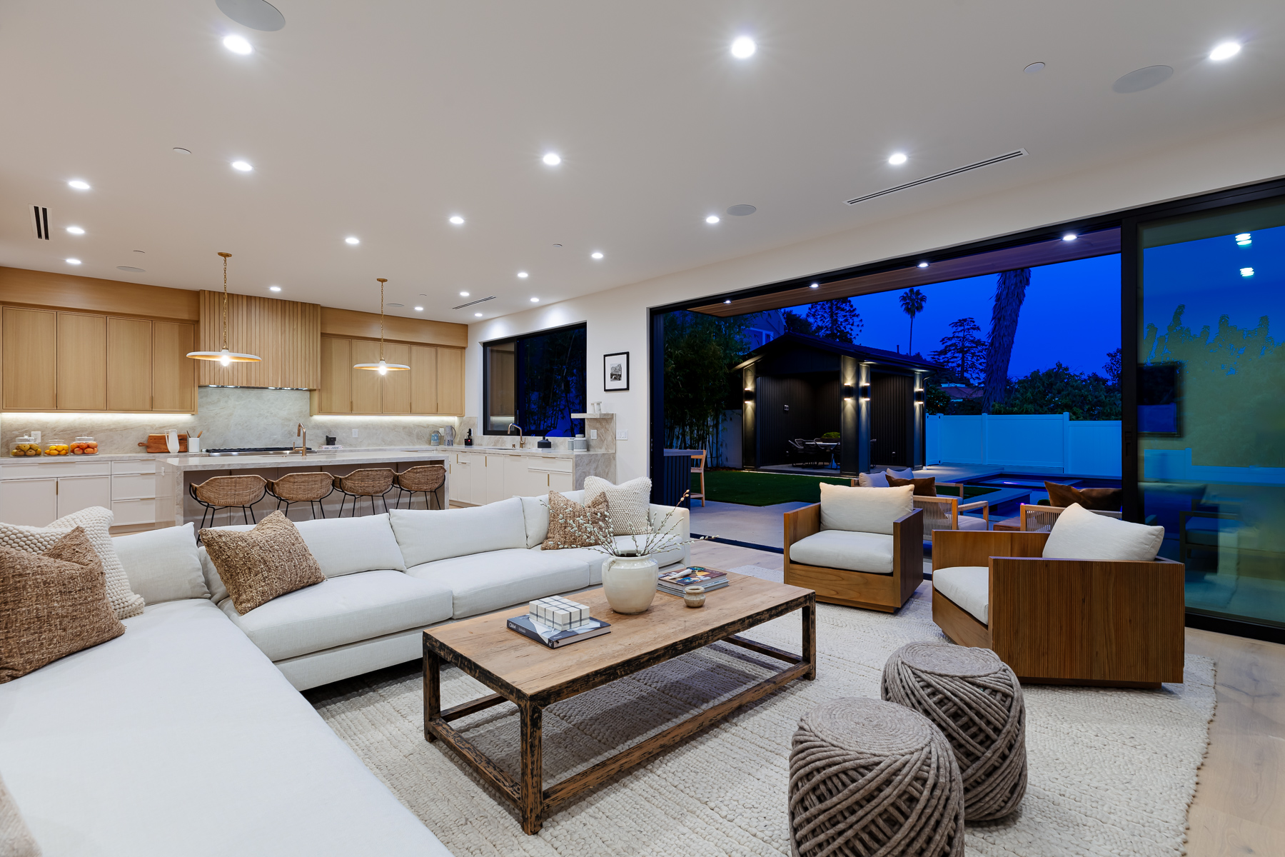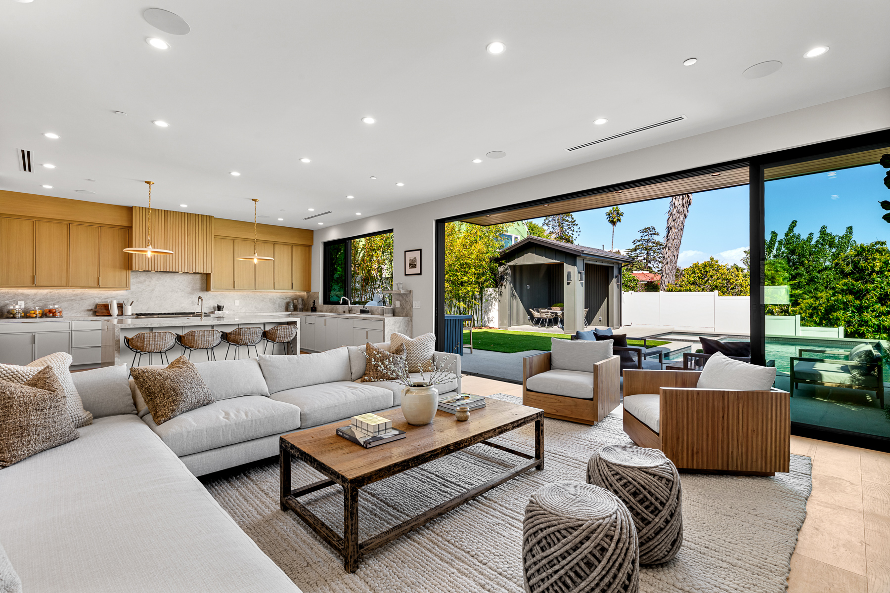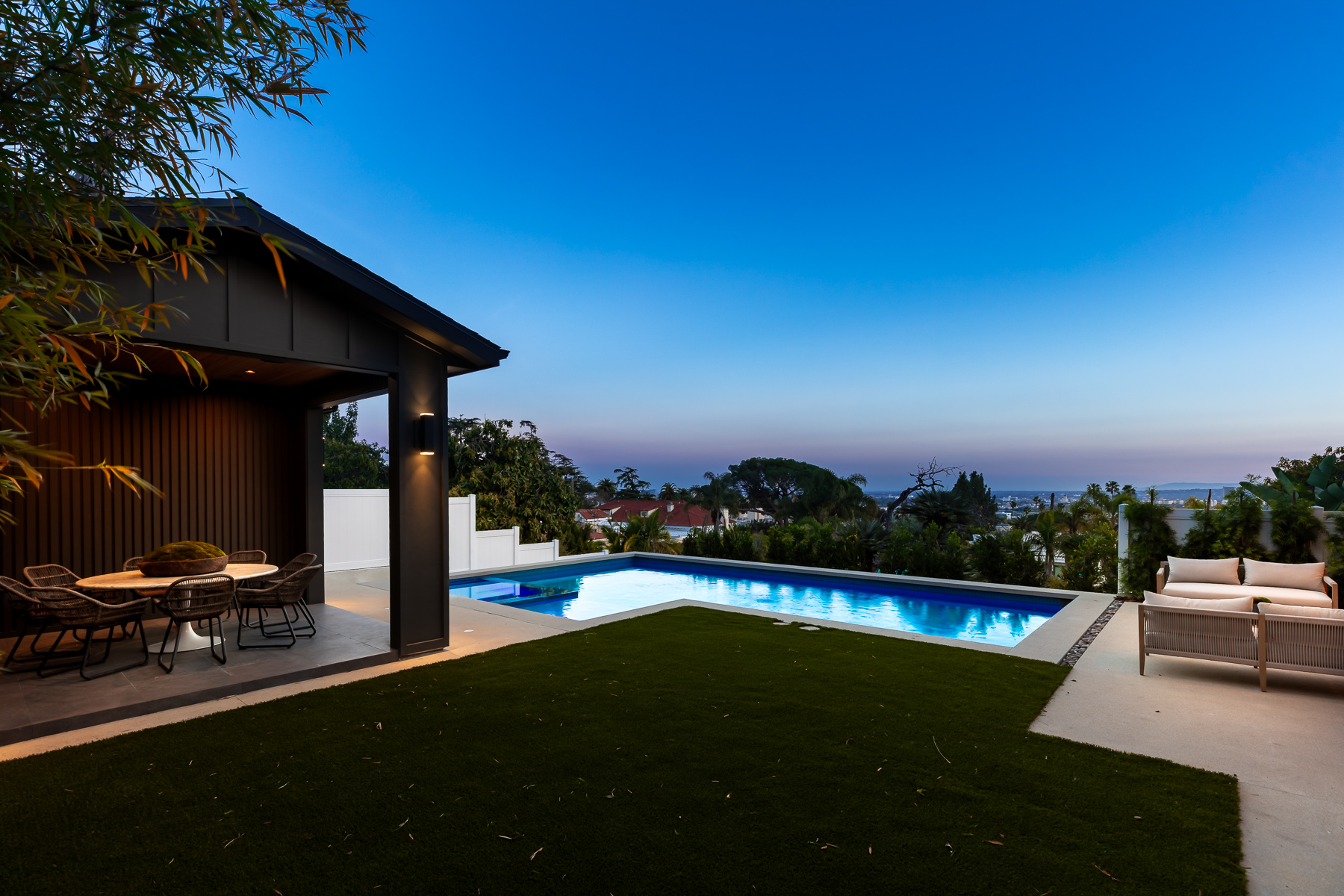 Hollywood Hills New Modern Luxury Estate with captivating Architecture is an undisputed Masterpiece with unparalleled Elegance and Sophistication. Spanning over 5,033 Square feet of indoor-outdoor living space and set on a huge 7,900 sq foot flat lot, with views of Downtown to Catalina Island, this is a rare find, truly one of a kind! Entryway opens to the grand foyer showcasing an incredible amount of natural light! Beyond the entry, the great room seamlessly flows into the striking gourmet kitchen, truly built for those who love to cook, with its Taj Mahal quartzite countertops, large center island, and lots of counter space which blends in beautifully with the naturally colored wood accents throughout the house. Top of the line Thermador appliances, butler pantry with a wall of glass sliding doors that open to the private backyard retreat with pool with spa and baja shelf, Plus cabana with a full bathroom, built-in BBQ with bar, perfect for large Hollywood Style Parties. The luxurious main suite is complete with a private balcony with stunning views of the Hollywood Hills, city lights. The awe-inspiring bathroom has double vanities, soaking tub, oversized shower, soaking tub, and a huge walk-in closet. This beautiful home has amenities throughout including an additional 3 ensuite bedrooms with built-in closets, a large theater room, bar, and state of the art sound systems throughout. Hosting an unmatched outdoor setting perfect for both entertaining and intimate settings, the backyard features an oversized pool with a spa, built in barbeque, a spacious grassy area, and covered cabana perfect for dining or lounging. The rooftop deck with amazing views as well as a firepit for complete entertainment, with the stars! Oversized 2 car garage plus room for 2 more cars in the driveway is hedged, private, and gated. This undisputed masterpiece with unparalleled luxury & modern finishes will not last. Set on quite a dead-end street near the largest off leash dog park in America; Runyon Canyon, this home in perfect location, near Sunset Strip, Hollywood, and the hottest trendy restaurants in West Hollywood nightlife, this home is perfect for the entertainer in you!