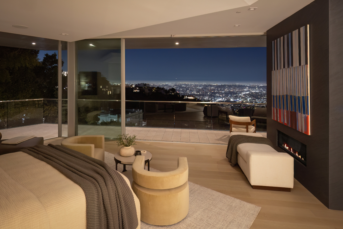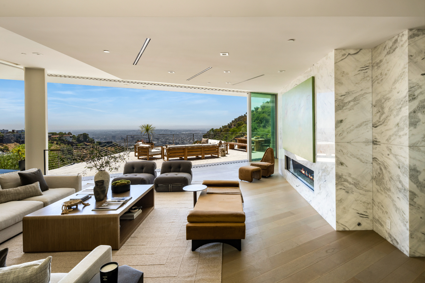Nestled in the prestigious Hollywood Hills on famed Rising Glen, this stunning contemporary estate offers the perfect blend of modern luxury and natural beauty. Designed with seamless indoor-outdoor living in mind, the residence features expansive floor-to-ceiling glass doors that frame breathtaking panoramic city views. The open-concept living space is anchored by a sleek, state-of-the-art kitchen with custom cabinetry, high-end appliances, and a spacious island that flows effortlessly into the dining and lounge areas. Elegant finishes, warm wood tones, and sophisticated marble accents add to the home's refined ambiance. The primary suite is a private sanctuary, complete with a fireplace, a spa-like bathroom with a soaking tub, and direct balcony access for uninterrupted sunset views. Additional bedrooms are designed for comfort and style, while a dedicated office, home gym, and lounge spaces provide the perfect setting for both productivity and relaxation. Step outside to a resort-inspired backyard featuring an infinity-edge pool, a serene spa, and multiple lounge areas designed for entertaining or unwinding in privacy. Lush landscaping and towering palms enhance the sense of tranquility, while an intimate outdoor courtyard offers a secluded retreat. With a flawless blend of architectural brilliance and contemporary elegance, this home is a true masterpiece, offering an unparalleled living experience in one of L.A.'s most sought-after neighborhoods.