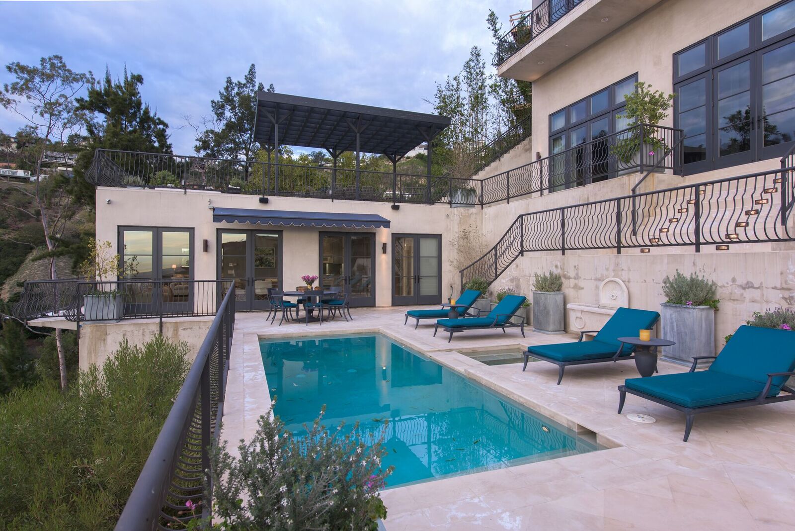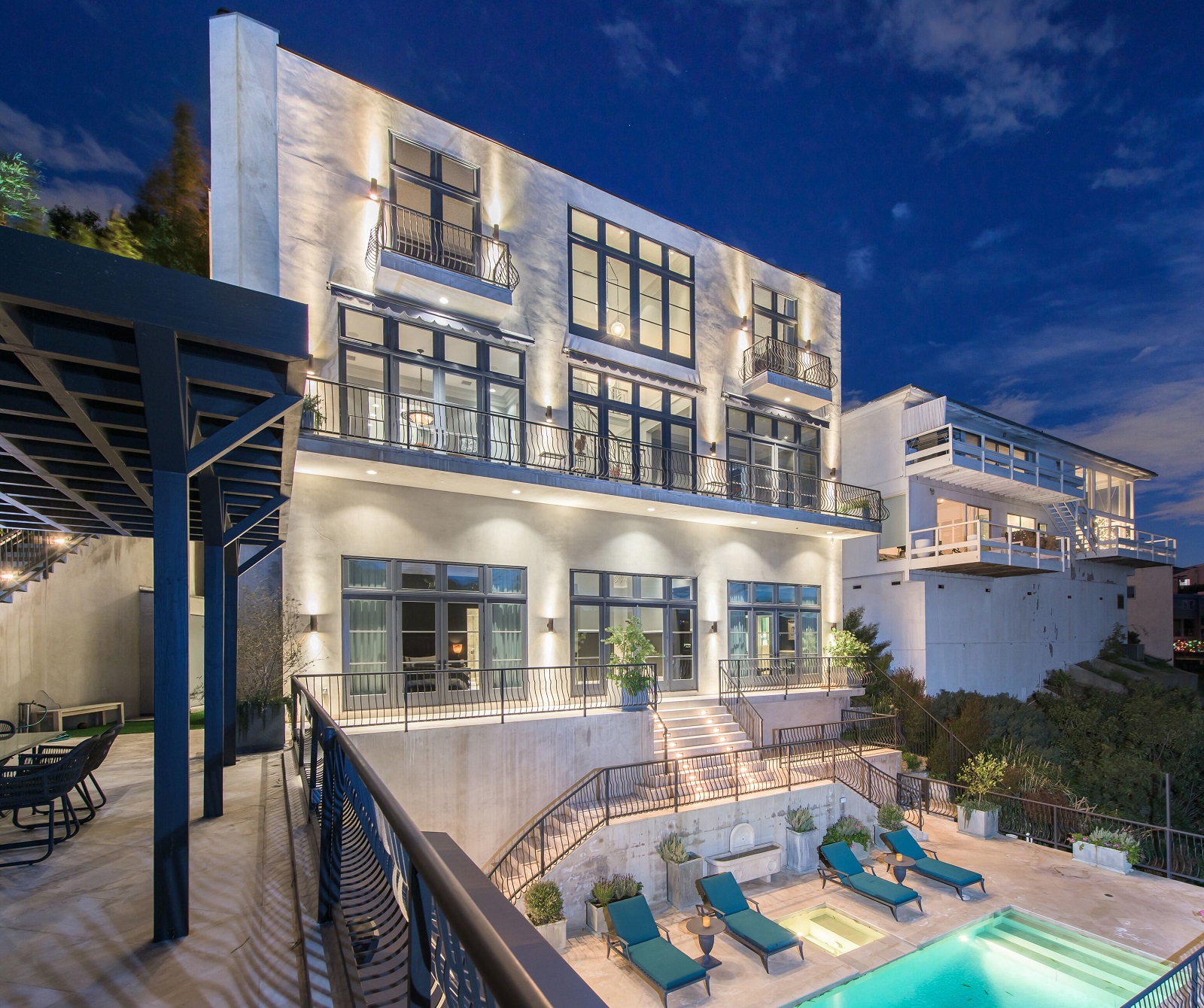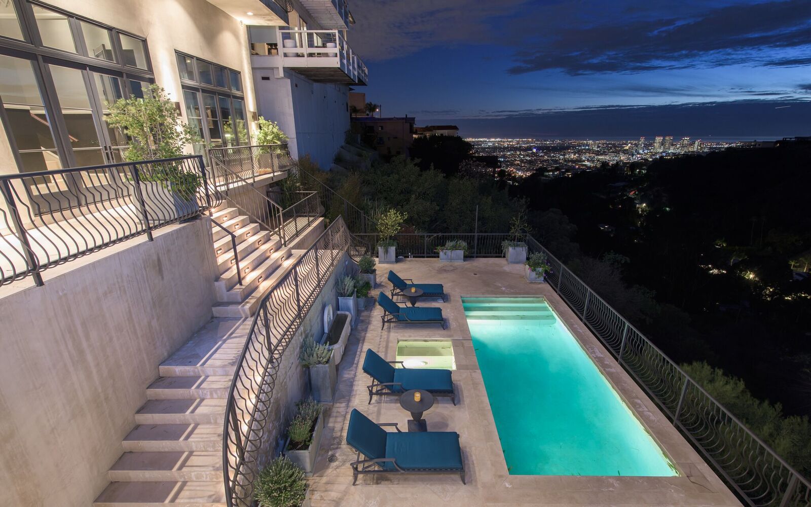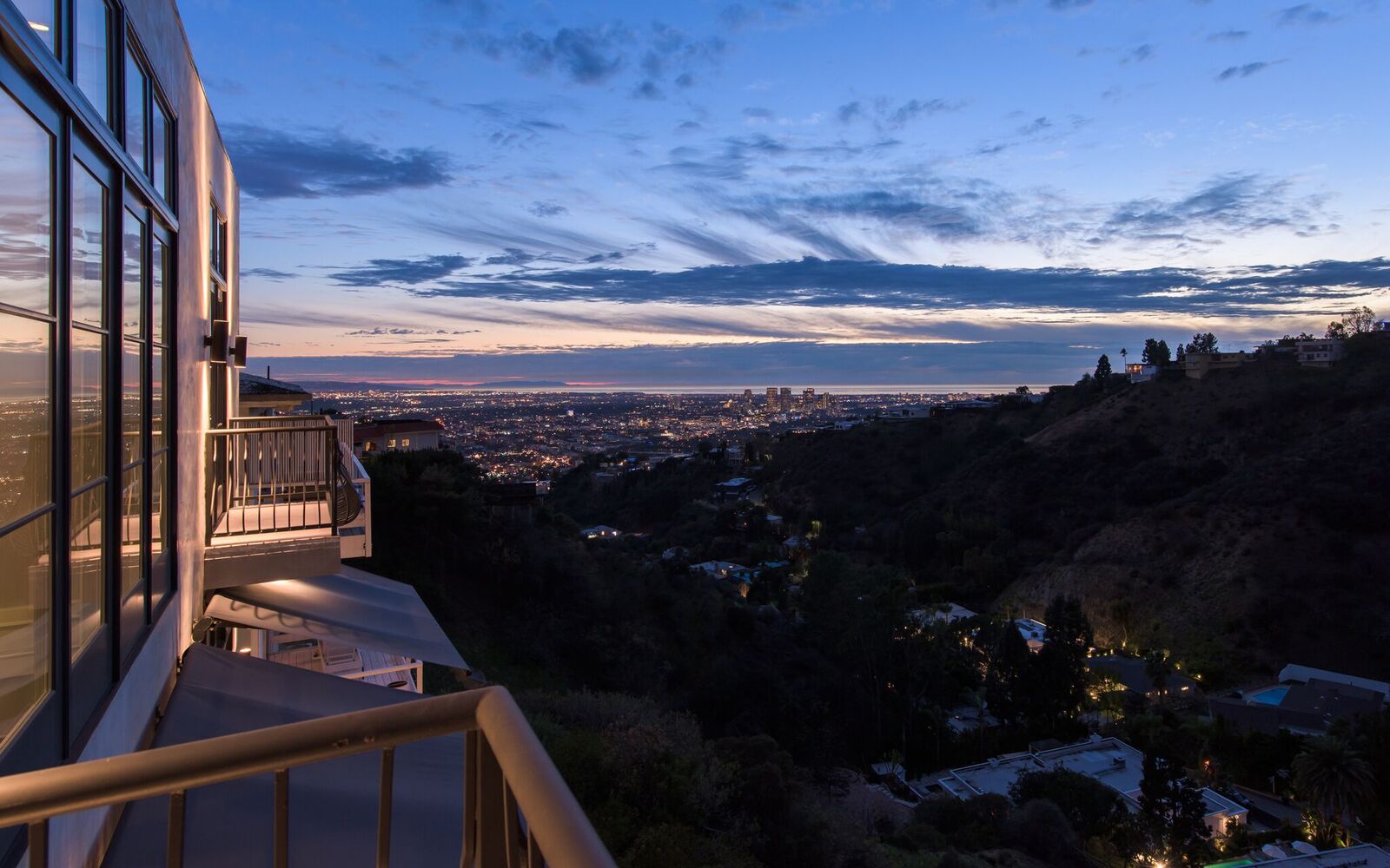 Iconic contemporary villa. Built with steel support construction and grand floor-to-ceiling windows that perfectly frame ocean, canyon and city views. An architectural trophy, its soaring volume of space, sunlight and double height ceilings surround a beautifully designed and extremely high quality interior. Master retreat is fit for royalty with cozy fireplace, top-of-the-line closets, luxurious stone baths with chrome accents, triple thick moldings and french doors leading you to views that remind you why Sunset Plaza is the most sought after are to live in. You can rest assured guests will feel welcome as each bedroom suite is outfitted with a spacious full bath, fireplace, ample closet space and terrace with views and a guest house complete with full kitchen, bath, and additional laundry. Party the night away on your huge outdoor terrace and lounge overlooking the pool, spa, and city you call home. Gourmet kitchen is outfitted with elite appliances, butler's pantry and leads to exquisite dining room, sophisticated living room, and media enclave. Nothing is visible from the street curb but a discreet entry and 4-car garage with direct access into the home.