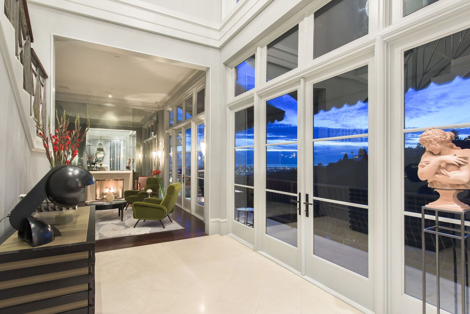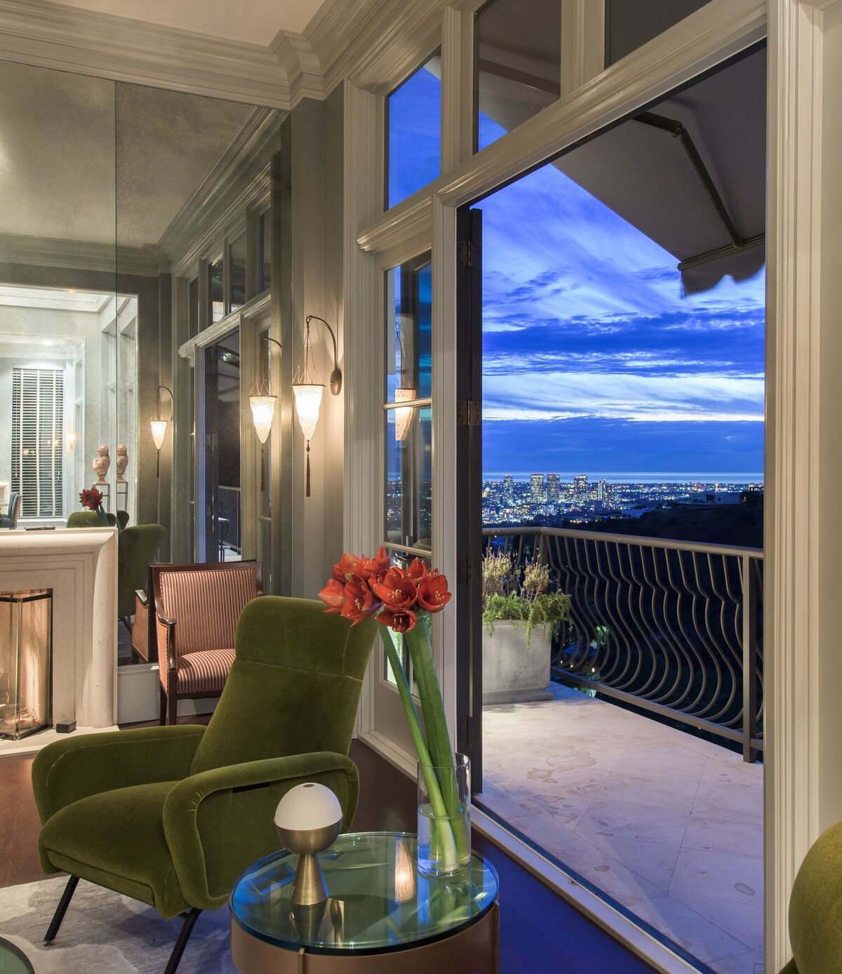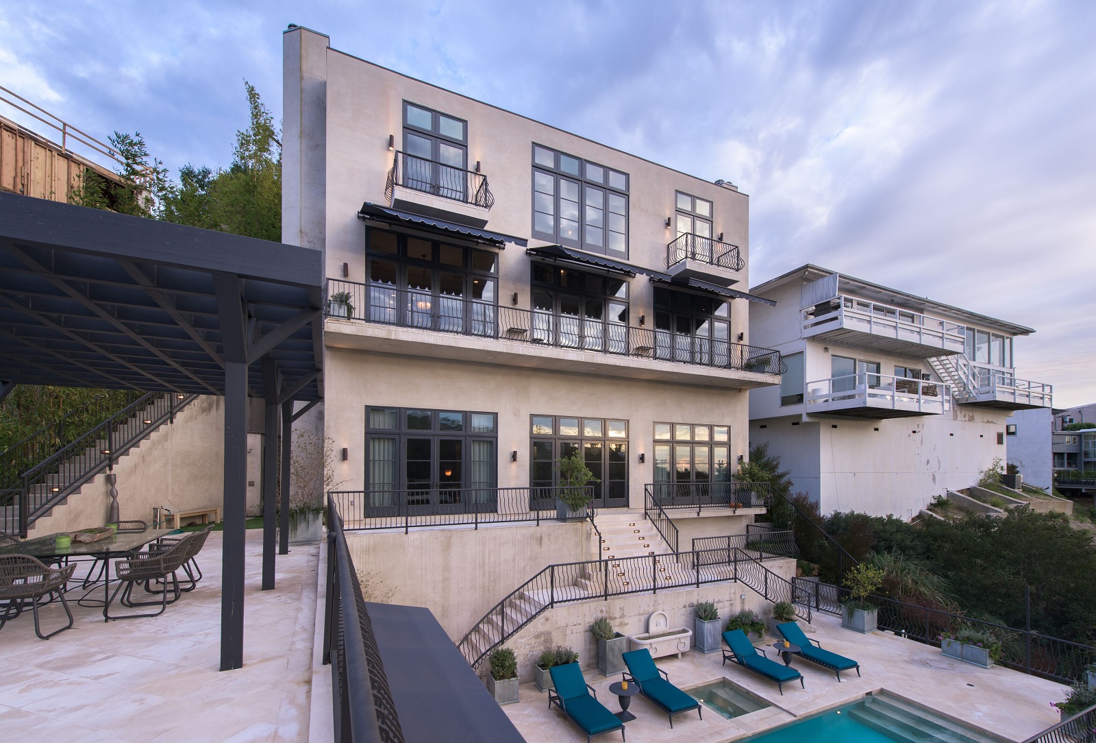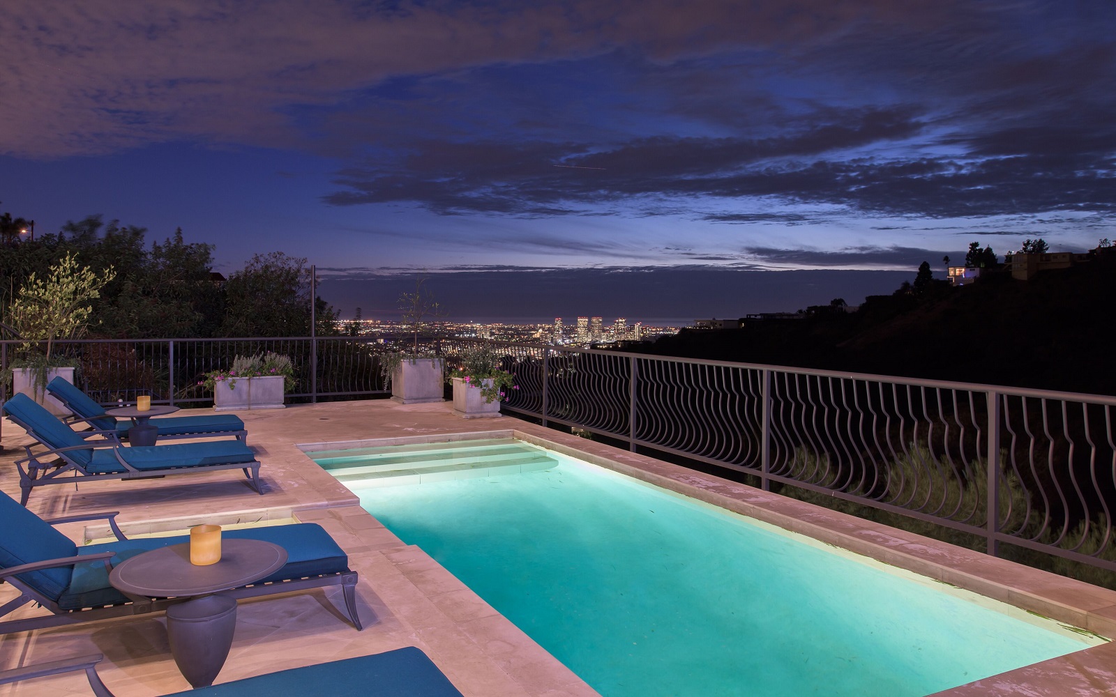 Iconic contemporary villa. Built with steel support construction and grand floor-to-ceiling windows that perfectly frame ocean, canyon and city views. An architectural trophy, its soaring volume of space, sunlight and double height ceilings surround a beautifully designed and extremely high quality interior. Master retreat is fit for royalty with cozy fireplace, top-of-the-line closets, luxurious stone baths with chrome accents, triple thick moldings and french doors leading you to views that remind you why Sunset Plaza is the most sought after are to live in. You can rest assured guests will feel welcome as each bedroom suite is outfitted with a spacious full bath, fireplace, ample closet space and terrace with views and a guest house complete with full kitchen, bath, and additional laundry. Party the night away on your huge outdoor terrace and lounge overlooking the pool, spa, and city you call home. Gourmet kitchen is outfitted with elite appliances, butler's pantry and leads to exquisite dining room, sophisticated living room, and media enclave. Nothing is visible from the street curb but a discreet entry and 4-car garage with direct access into the home.