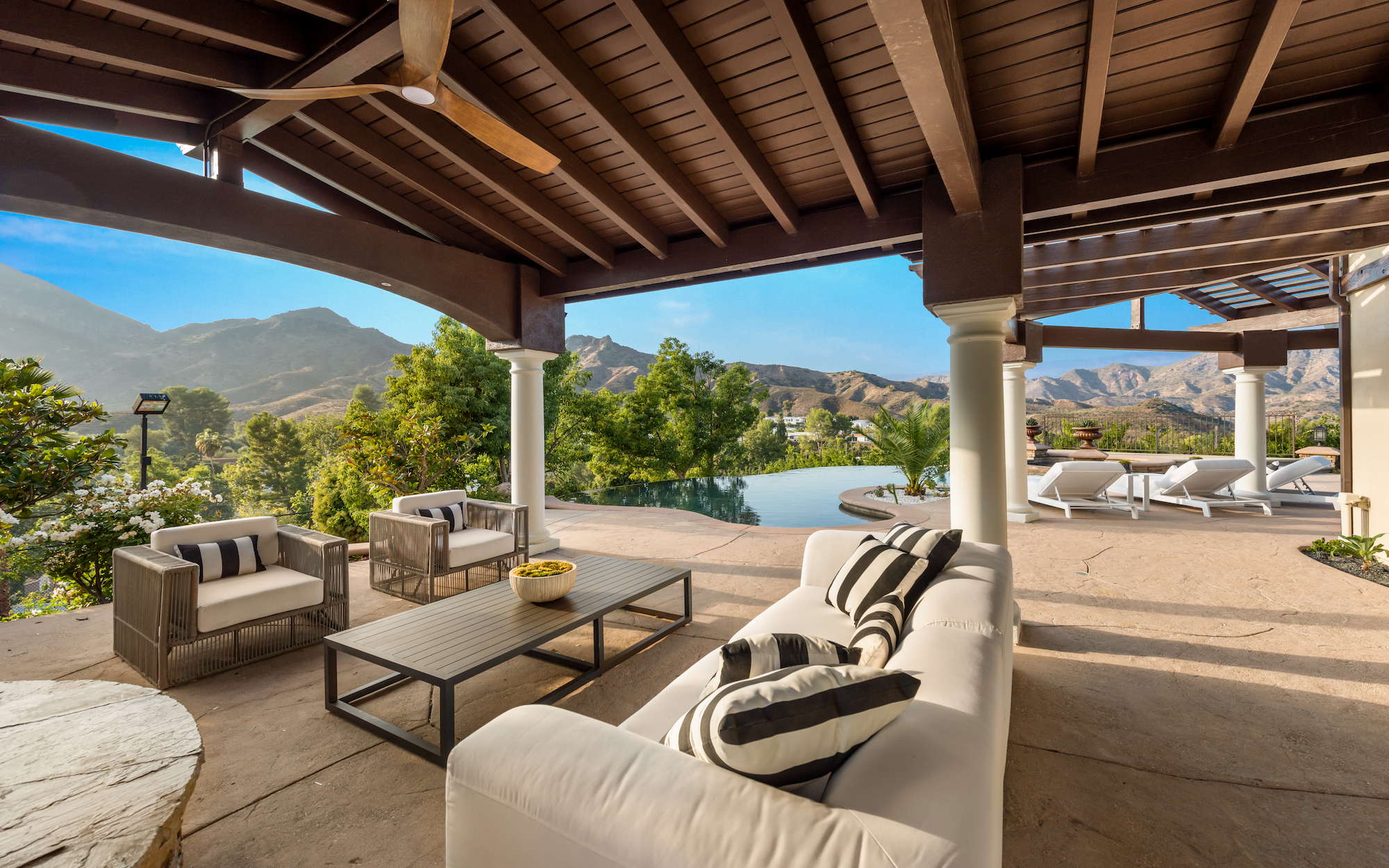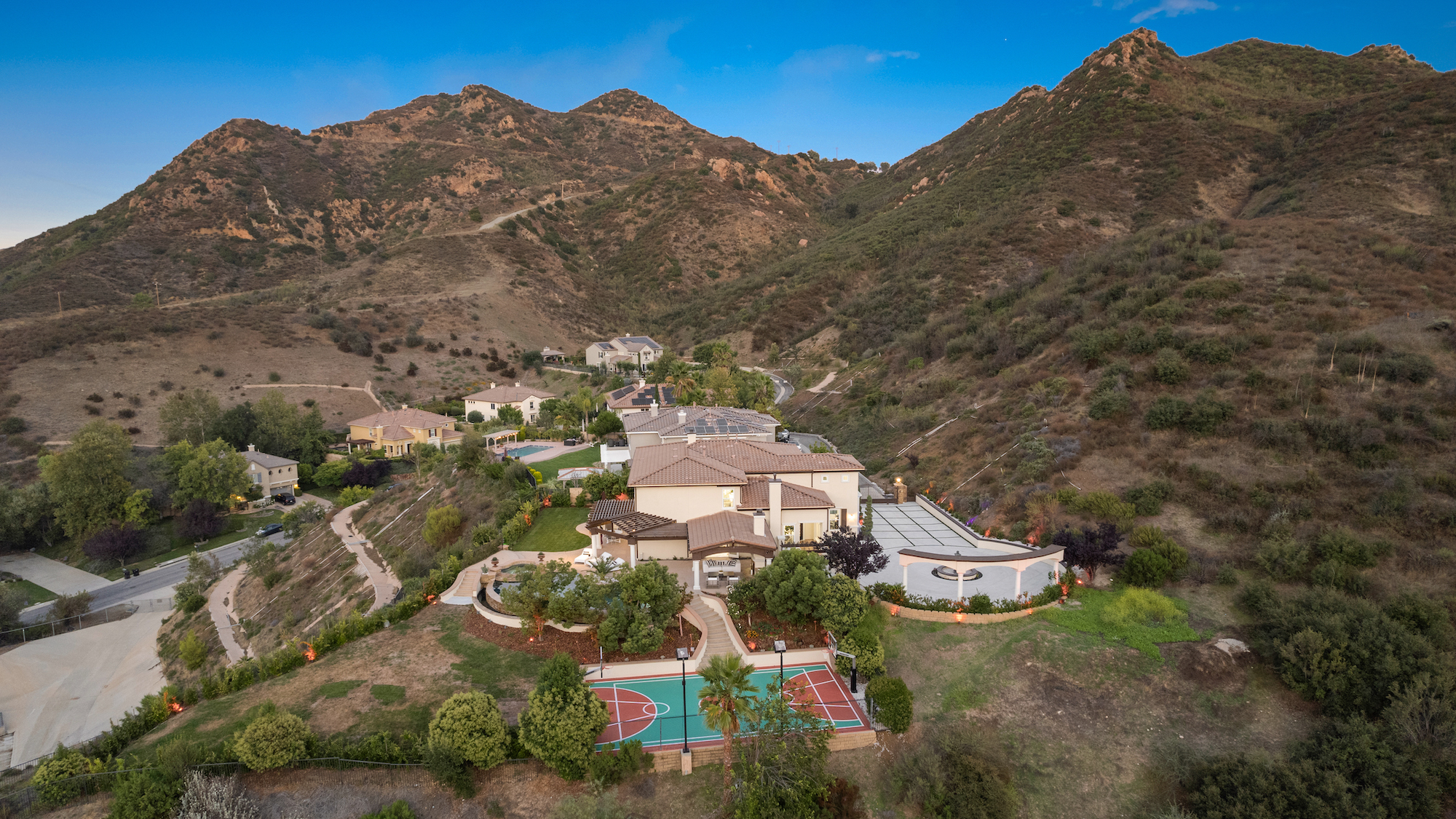 string(2440) "Immerse yourself in the enchanting Toscana lifestyle, basking in the radiant Southern California sun within the confines of this sprawling thirteen-acre gated estate, cradled amidst the awe-inspiring Santa Monica Mountains. Nestled at the end of a tranquil cul-de-sac in Agoura Hills, a community renowned for its exceptional schools and natural splendor, this Mediterranean masterpiece boasts 5 bedrooms, 5 and a half bathrooms, and is only moments away from the world-famous shores of Malibu and local wineries. As you enter, the main level welcomes you with a flood of natural light, accentuating the lustrous stone floors, lofty ceilings, and a captivating grand foyer. The elegant living room, complete with a distinctive fireplace, serves as a gracious haven for welcoming your esteemed guests. The distinguished formal dining room leads to an expansive outdoor oasis graced by an infinity pool that gazes out at the breathtaking mountain vistas under the star-studded night sky. Descend a few steps to discover your private basketball court, equipped with top-of-the-line lighting, offering endless hours of play and recreation. The kitchen is a chef's delight, showcasing top-tier stainless steel appliances and culinary excellence. It effortlessly flows into a spacious family room, adorned with a gas fireplace and a wall of windows that frame the luxuriantly landscaped backyard and a charming gazebo. Additionally, on the lower level, you'll find a versatile bedroom or office with an en suite bathroom, providing both convenience and flexibility. Venture upstairs to encounter a spacious landing bathed in natural light. The romantic primary suite, a private sanctuary, features a spa-like en-suite bath with a soaking tub, a walk-in closet, and awe-inspiring panoramic views. Three additional bedrooms, each with its own en suite bathroom, offer abundant space for your loved ones. Relish in nightly al fresco dining amidst the beautifully landscaped backyard, complete with a built-in grill and bar. Conclude your day with a rejuvenating dip in the shimmering pool and spa beneath the starry canvas above. Additional features encompass gated parking for up to twelve cars, central dual-zone AC and heating, and a cutting-edge smart home system affording control over security, music, and lighting. With top-ranked schools and shopping nearby, seize the opportunity to transform this extraordinary estate into your dream home!"