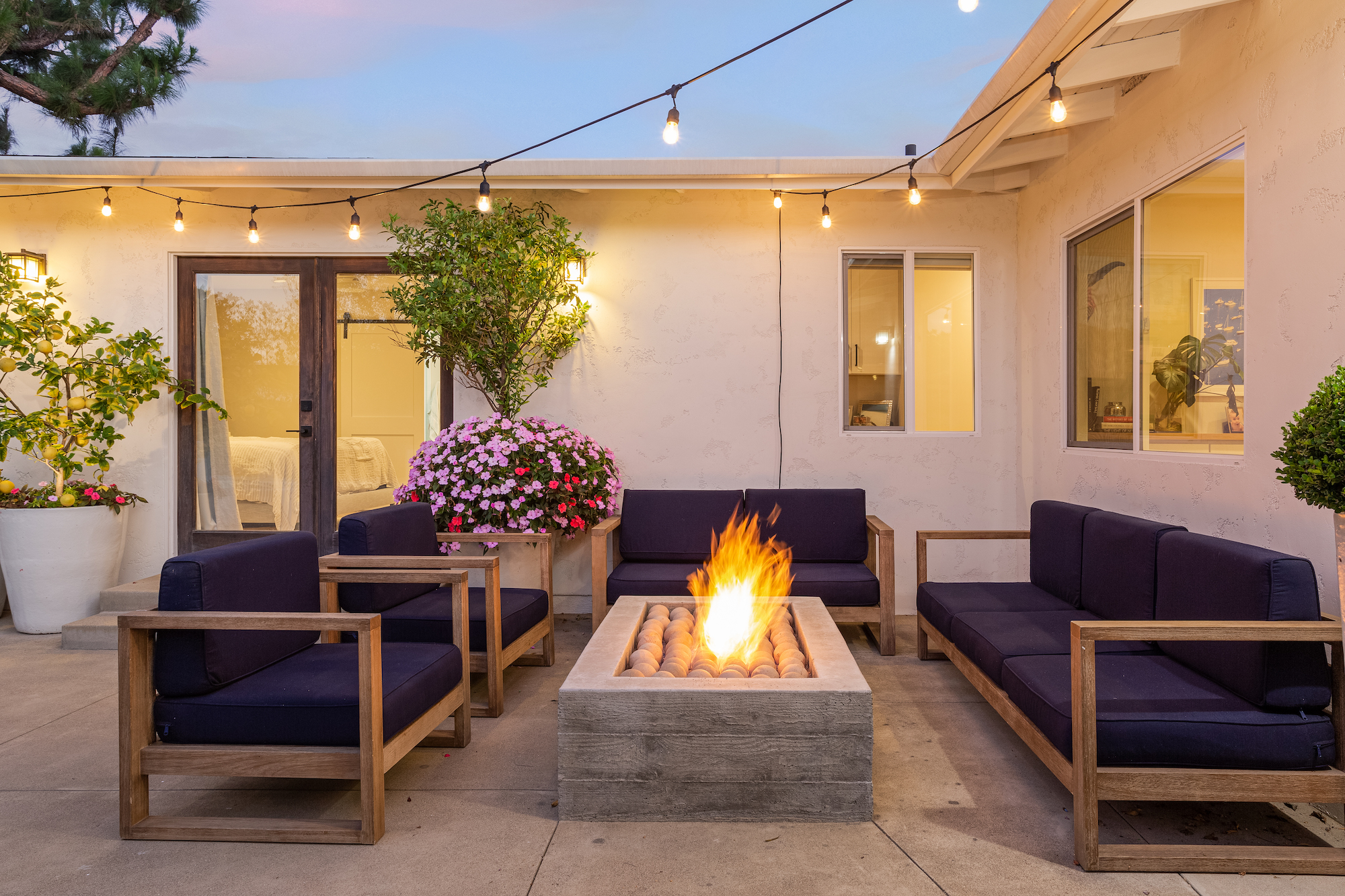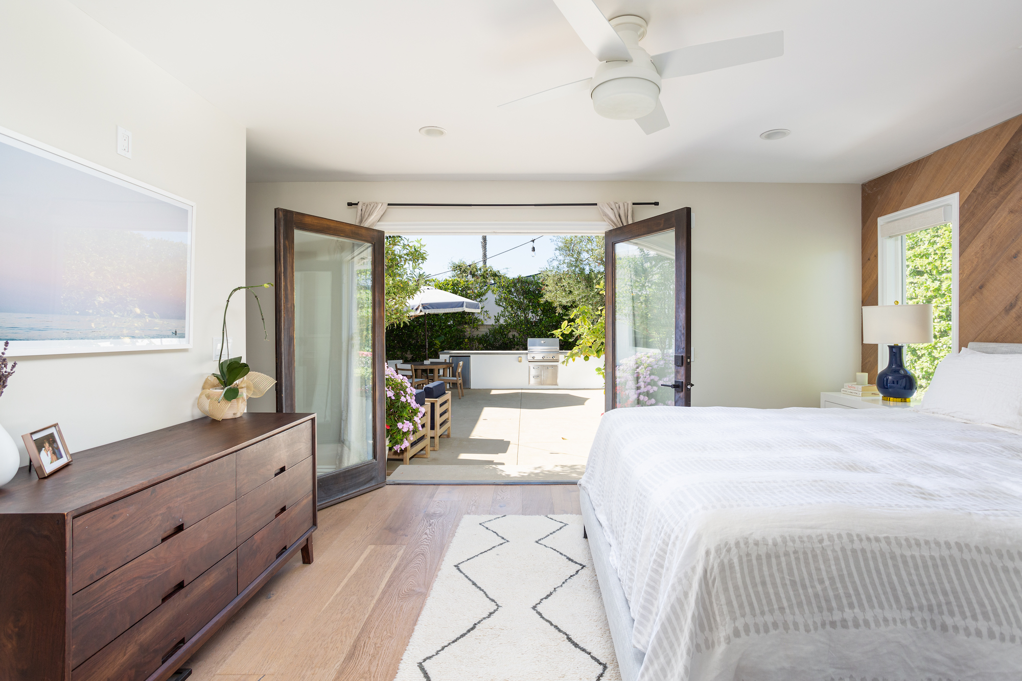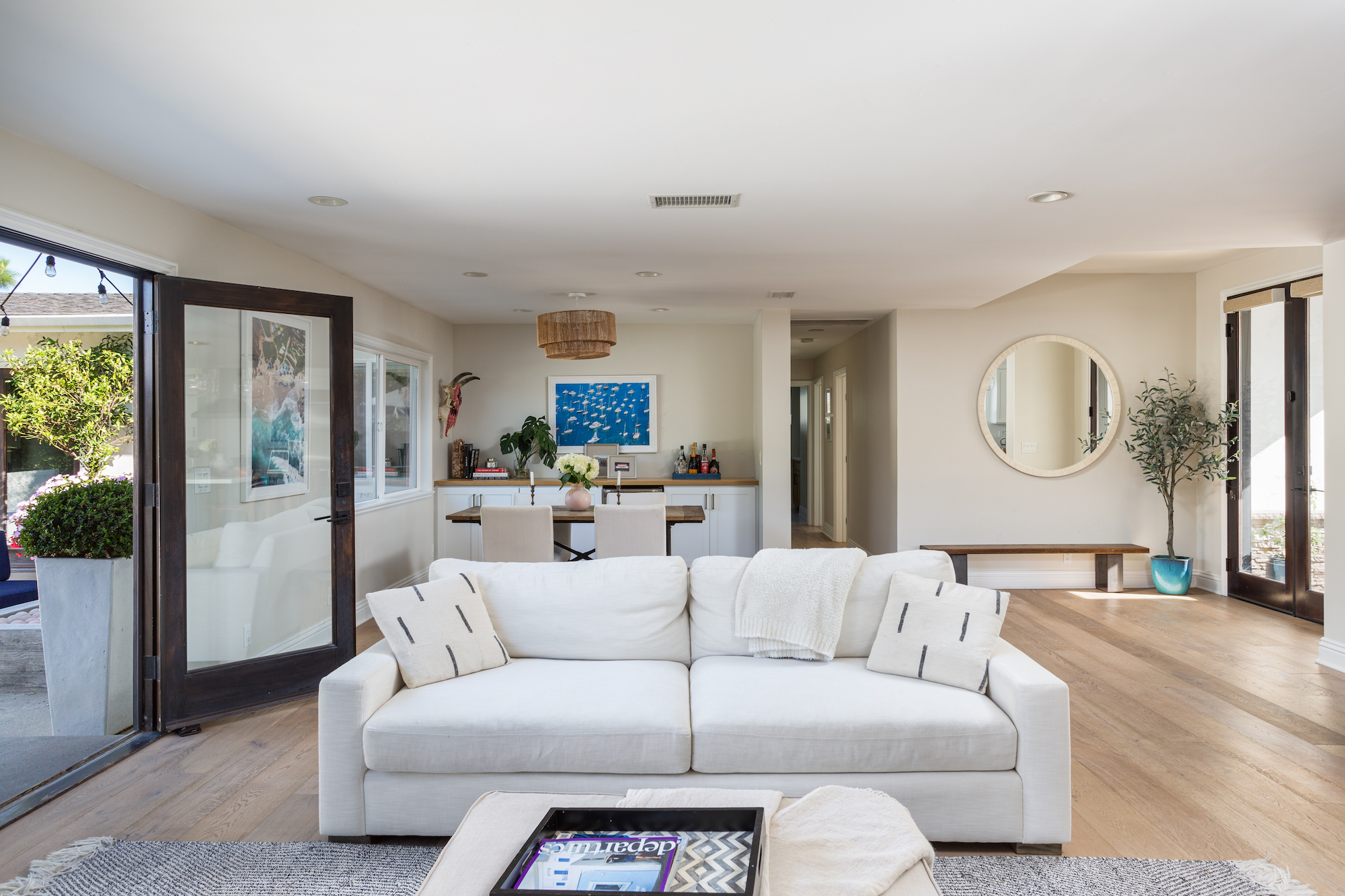 Sophistication & Privacy describes this updated Newport Beach residence. This 4 bedroom 3 bath home epitomizes the California lifestyle. With an open floor plan that showcases sliding glass doors to a beautiful and serene outdoor setting with a spa/water features, Bocce ball court, built in BBQ and fire pit. The inside has an expansive kitchen with large island counter that flows open to the great room area. Wide plank French Oak floors through out the home. The primary suite with large shower, dual sinks also has an office area that opens to the patio. The front of the property is enclosed with a private pass through gated drive and front porch patio areas to relax and enjoy the community atmosphere. This is all set within close proximity to Parks, schools, shopping and restaurants.