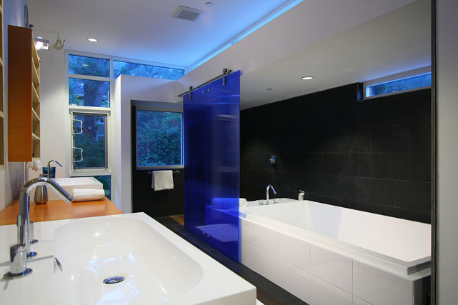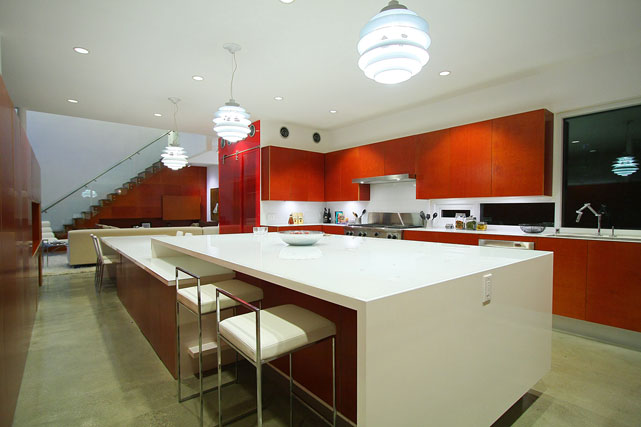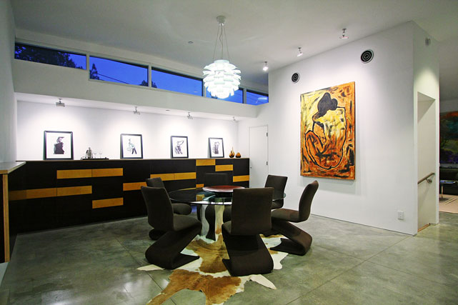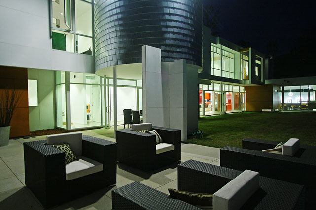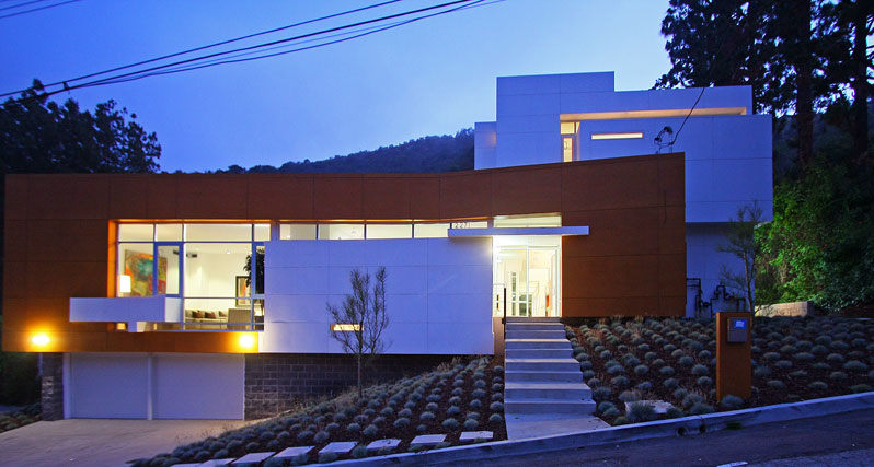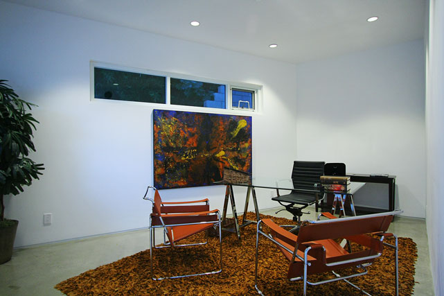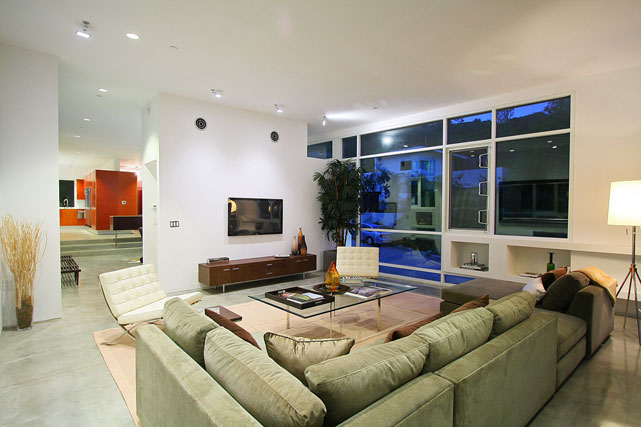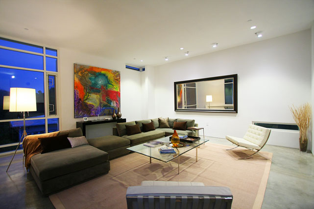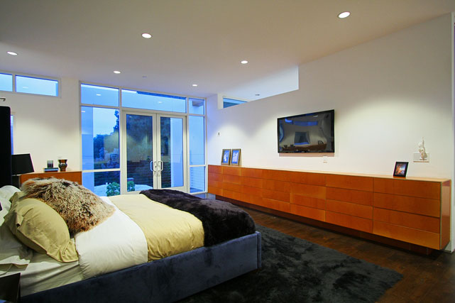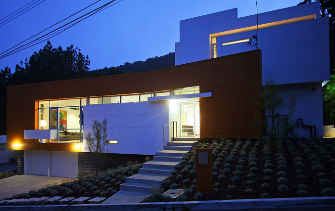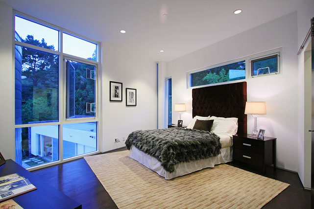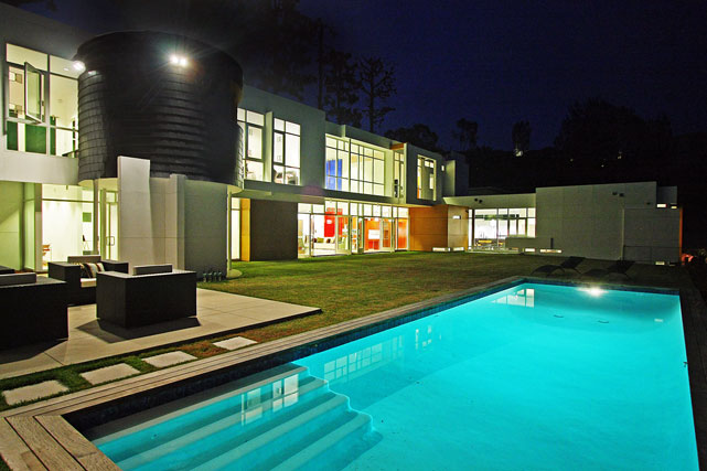 Striking. Just completed modern home. Large living room with 12′ ceilings and polished concrete floors. Kitchen and family room with 21′ ceilings overlooking the pool and grassy yard. Wide gallery hallways. Downstairs are two office suites and a workout room. Upstairs are a loft-like master suite, three additional bedrooms plus a game room. Approximately 6,000 square feet of living space. Environmentally friendly green design with state-of-the-art features including led lighting, massive walls of tempered glass, polished concrete and oak floors. Swimmers' pool with separate pool house and bath. Exterior materials include steel shingles, fiber cement panels, and resin-infused wood. A rare opportunity to own new construction on a quiet cul-de-sac street in best bhpo location.
