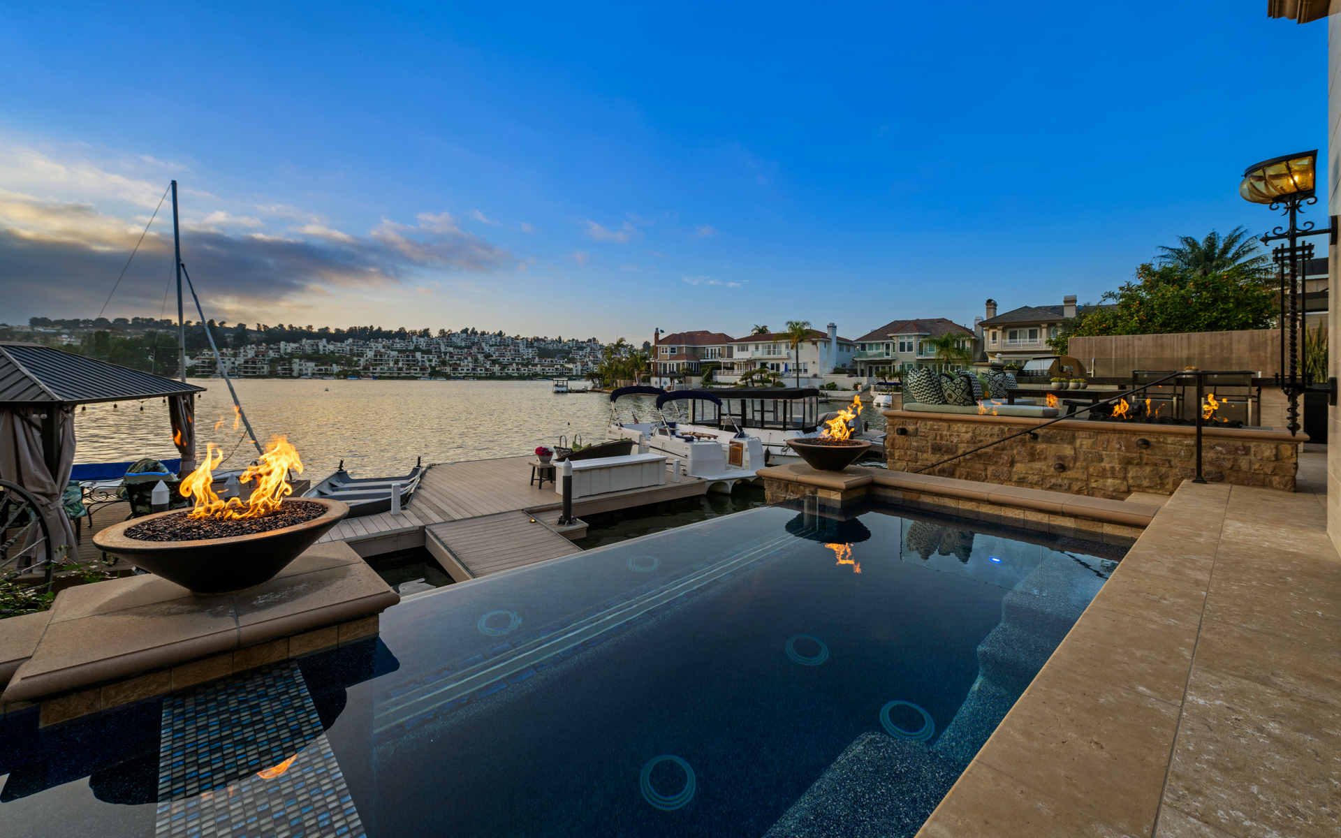 Seize the rare opportunity to experience waterfront living on Lake Mission Viejo. 22791 Tindaya, a dream-like retreat offering breathtaking lake views and a private dock for your Duffy boat—right in your backyard. Spanning over 6,000 square feet, this exquisite 4-bedroom estate with an office and gym seamlessly blends Tuscan-inspired elegance with modern luxury. Fully renovated in 2013, it showcases custom, top-tier finishes throughout. From the moment you step inside, you are greeted by soaring ceilings, exquisite stone flooring, and a grand wraparound staircase—yet, the true showstopper awaits just beyond the main living space: a stunning backyard entertainment area with unobstructed lake views. The outdoor oasis features a pool and spa, built-in BBQ, fire pits, and multiple seating areas, all set against the picturesque waterfront backdrop. Indoors, the home continues to impress with the chef’s kitchen, a true masterpiece, featuring stainless steel appliances, a spacious island, a walk-in pantry, and stone accent walls. Additionally, the main level includes a guest bedroom, dining room, and gym that could easily serve as a fifth bedroom, while the upper floor boasts three ensuite bedrooms, an office, and a grand media room. The primary suite is pure luxury, complete with dual walk-in closets and vanities, a soaking tub, and a spacious standing shower—a true retreat within this stunning estate. Additional highlights include a 2-car garage, private gated driveway with parking for three more vehicles, Savant A/V system, and a temperature-controlled wine room. Experience twinkling lights from the hillside reflect off the water, evoking the charm of a European retreat—reminiscent of Mallorca. As a Lake Mission Viejo resident, you’ll have access to exclusive perks, such as summer concerts on the water, 4th of July fireworks, fishing, paddle boarding, and endless recreation. This isn’t just a home—it’s a lifestyle of luxury, exclusivity, and endless waterfront enjoyment.