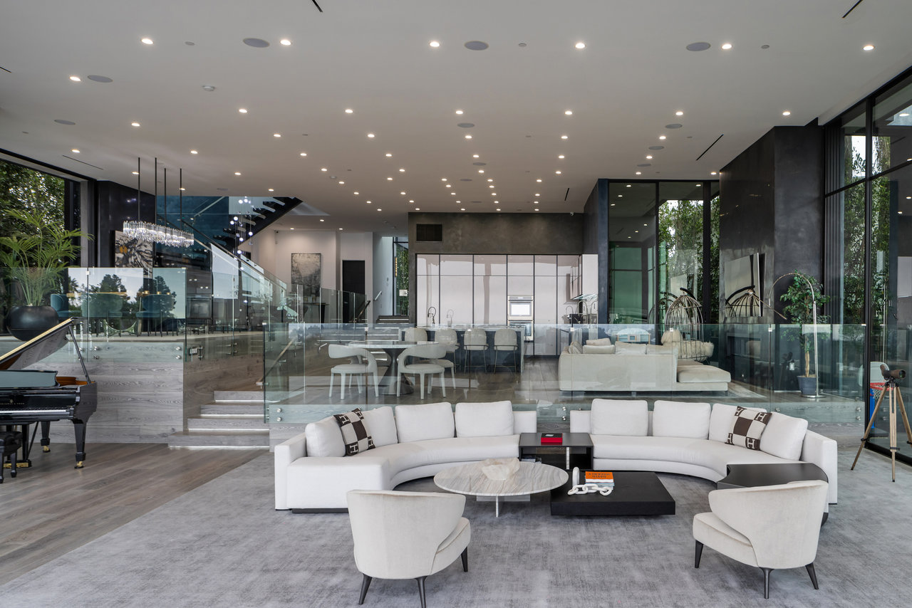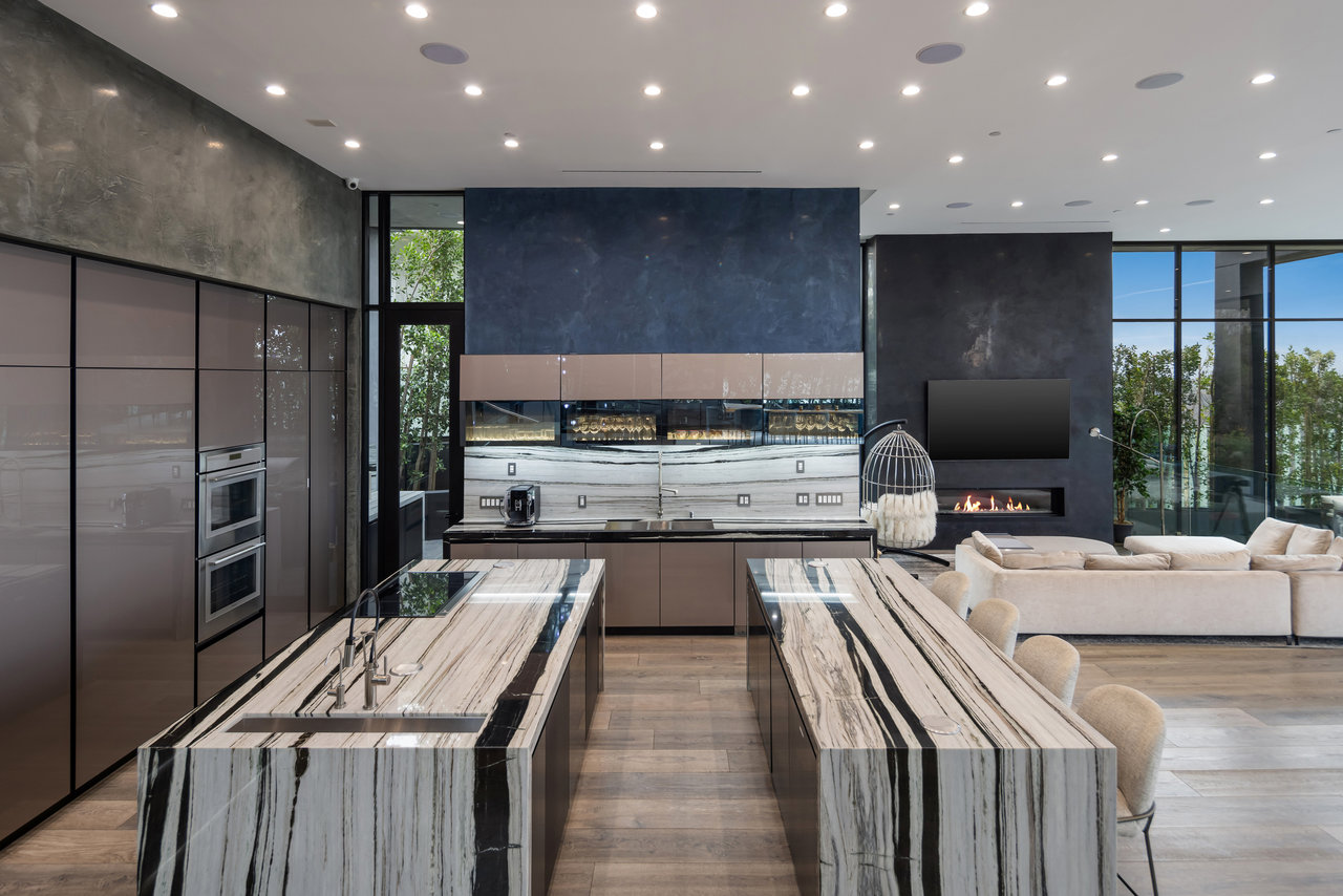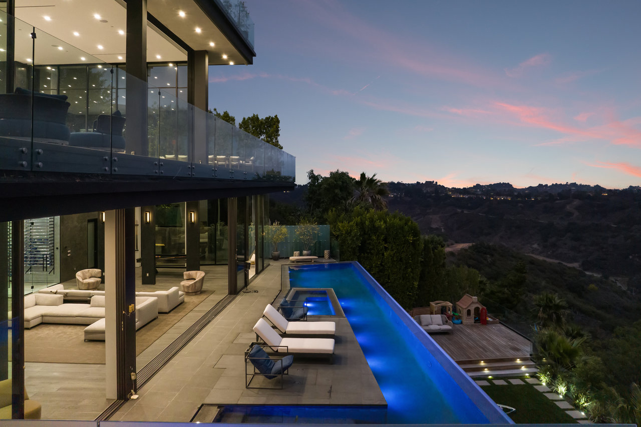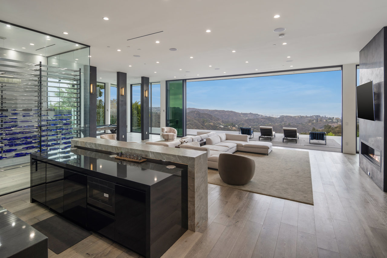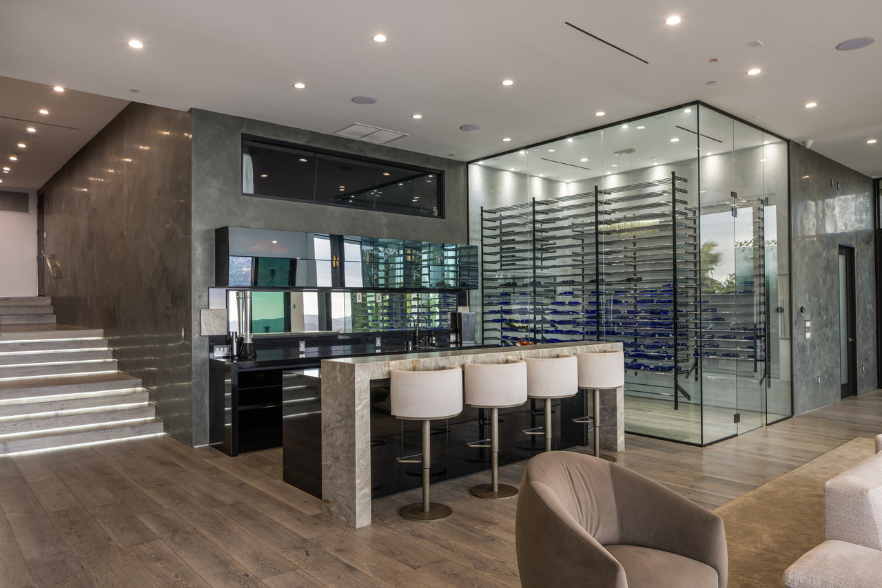 Nestled in prestigious Bel Air, this architectural masterpiece redefines modern luxury with impeccable design and breathtaking views of the hills and lake. The custom Italian-designed kitchen boasts sleek black countertops, a waterfall island, and a striking glass-enclosed wine cellar. The decadent primary bath is adorned with exotic Spanish tiles and features a steam shower, a soaker tub, dual stone sinks, and a double-sided fireplace. Spanning four levels accessible by a private elevator, this home offers an oversized entertainment space, a 1,000+ bottle walk-in wine cellar, a gym, and more. Additional amenities include a gated driveway, a 5-car garage, a Sonos sound system, LED lighting, crystal chandeliers, and exquisite white oak floors. Seamless indoor-outdoor flow is enhanced by floor-to-ceiling glass walls, leading to expansive terraces and an infinity-edge pool that blends harmoniously with the serene surroundings. This Bel Air estate is a showcase of elegance, sophistication, and ultimate comfort.