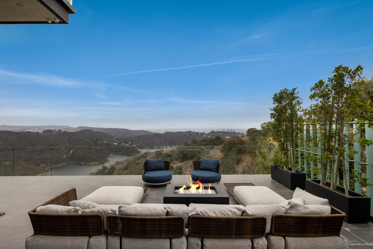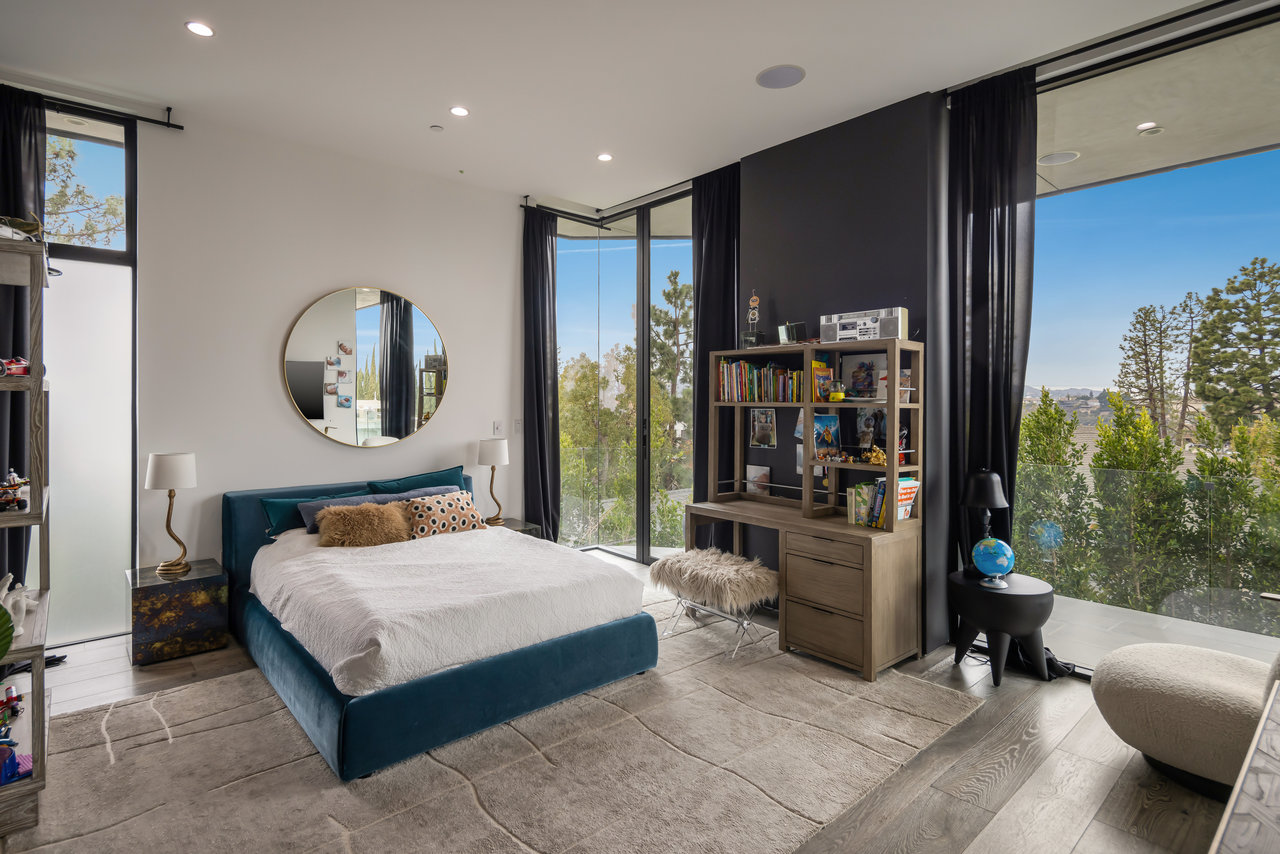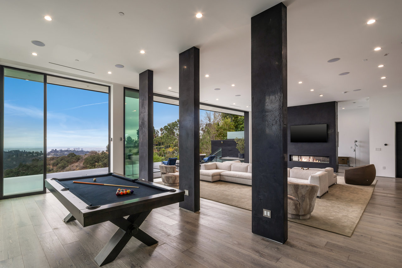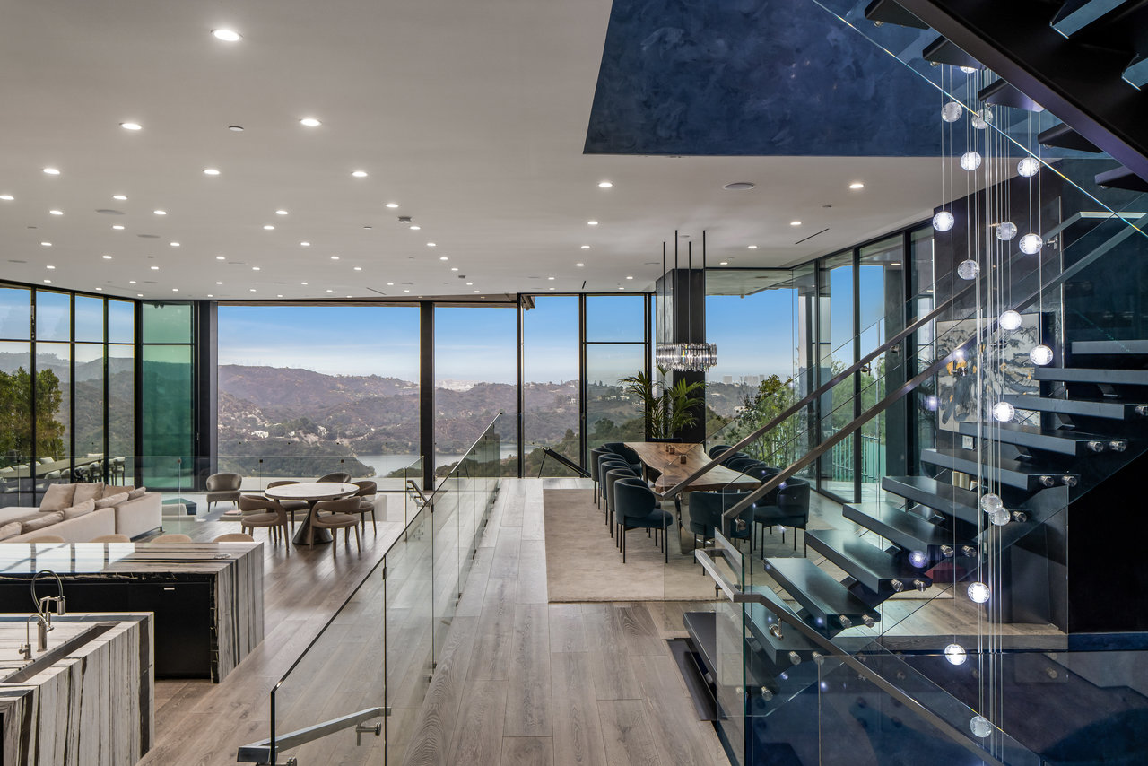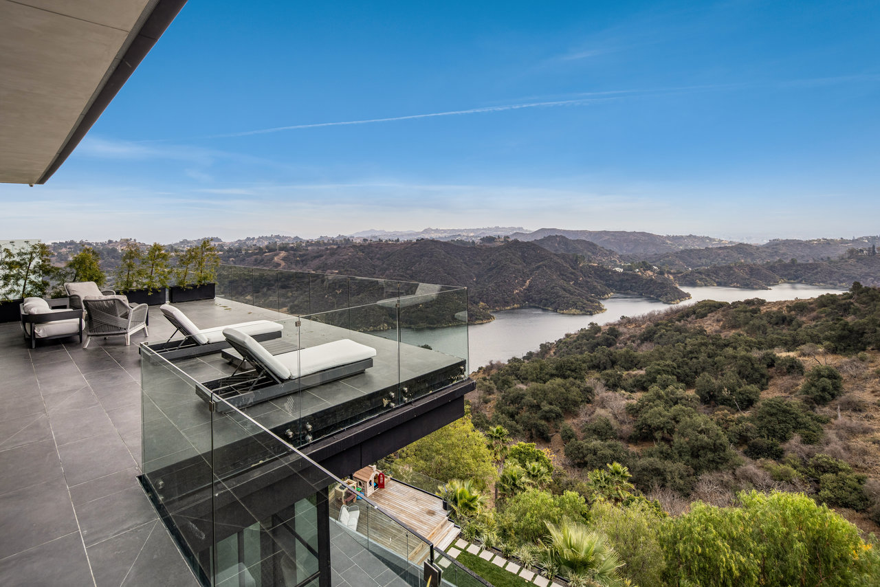 Nestled in prestigious Bel Air, this architectural masterpiece redefines modern luxury with impeccable design and breathtaking views of the hills and lake. The custom Italian-designed kitchen boasts sleek black countertops, a waterfall island, and a striking glass-enclosed wine cellar. The decadent primary bath is adorned with exotic Spanish tiles and features a steam shower, a soaker tub, dual stone sinks, and a double-sided fireplace. Spanning four levels accessible by a private elevator, this home offers an oversized entertainment space, a 1,000+ bottle walk-in wine cellar, a gym, and more. Additional amenities include a gated driveway, a 5-car garage, a Sonos sound system, LED lighting, crystal chandeliers, and exquisite white oak floors. Seamless indoor-outdoor flow is enhanced by floor-to-ceiling glass walls, leading to expansive terraces and an infinity-edge pool that blends harmoniously with the serene surroundings. This Bel Air estate is a showcase of elegance, sophistication, and ultimate comfort.