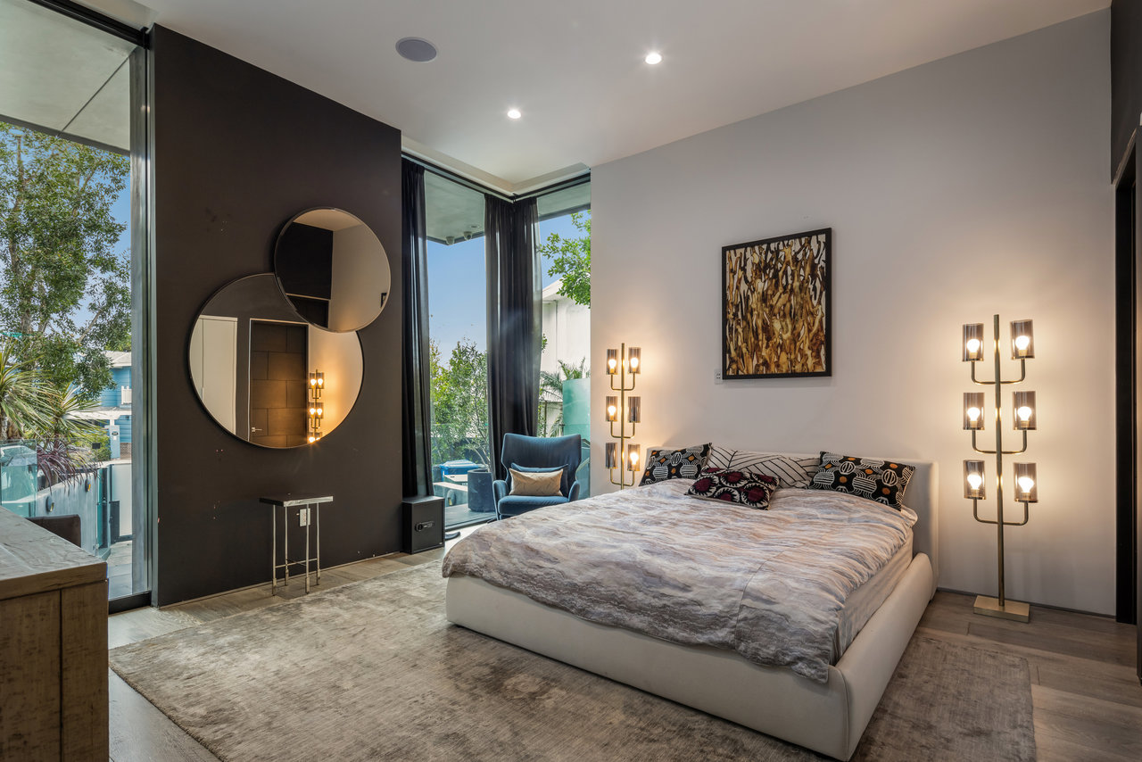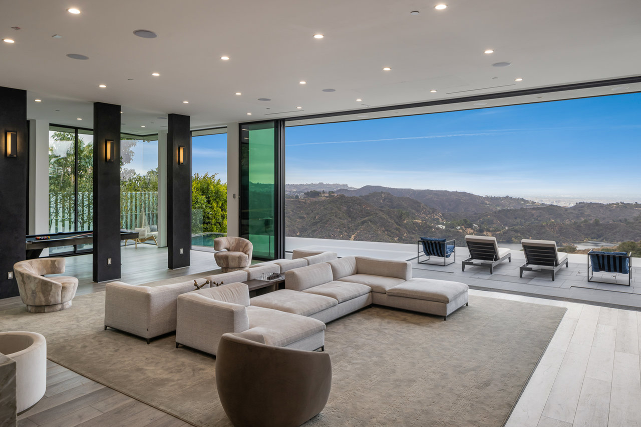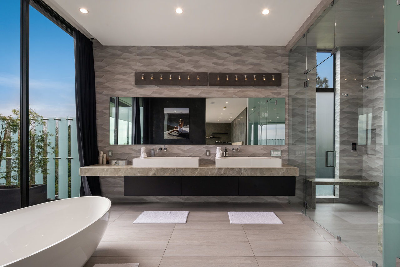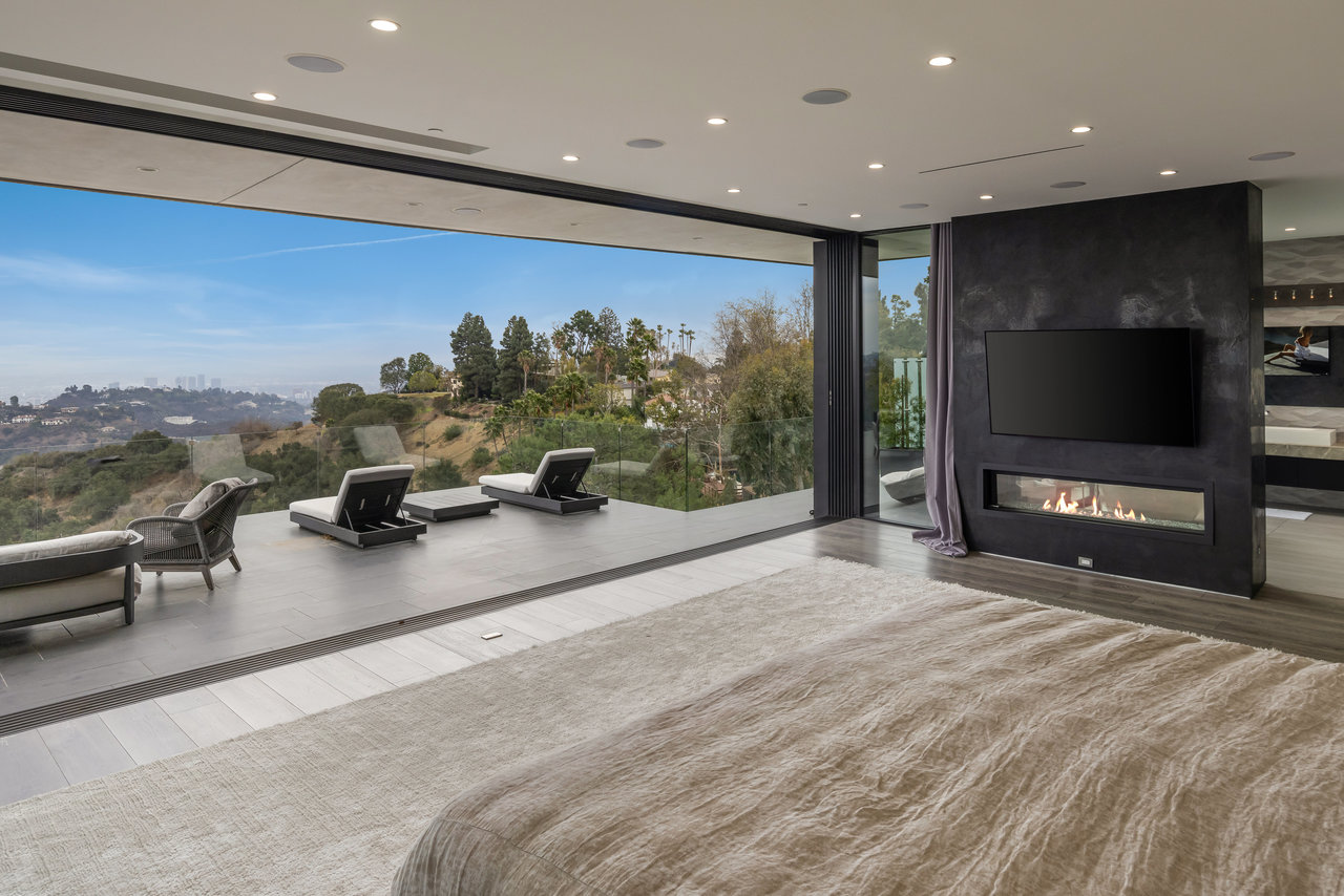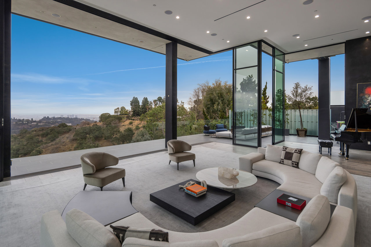 Nestled in prestigious Bel Air, this architectural masterpiece redefines modern luxury with impeccable design and breathtaking views of the hills and lake. The custom Italian-designed kitchen boasts sleek black countertops, a waterfall island, and a striking glass-enclosed wine cellar. The decadent primary bath is adorned with exotic Spanish tiles and features a steam shower, a soaker tub, dual stone sinks, and a double-sided fireplace. Spanning four levels accessible by a private elevator, this home offers an oversized entertainment space, a 1,000+ bottle walk-in wine cellar, a gym, and more. Additional amenities include a gated driveway, a 5-car garage, a Sonos sound system, LED lighting, crystal chandeliers, and exquisite white oak floors. Seamless indoor-outdoor flow is enhanced by floor-to-ceiling glass walls, leading to expansive terraces and an infinity-edge pool that blends harmoniously with the serene surroundings. This Bel Air estate is a showcase of elegance, sophistication, and ultimate comfort.