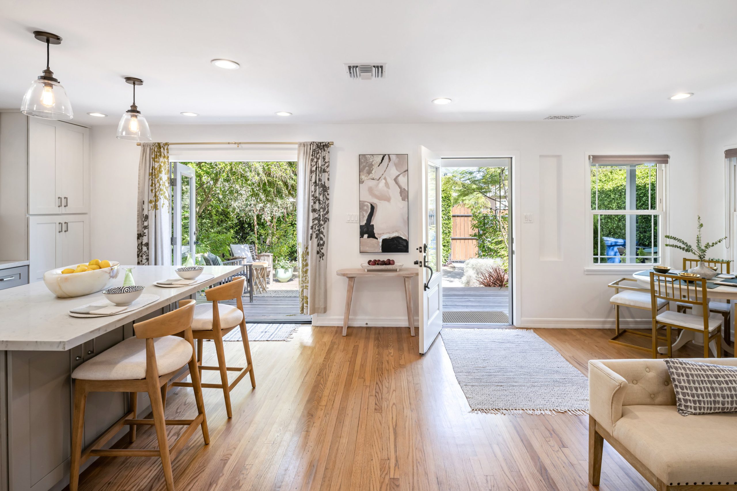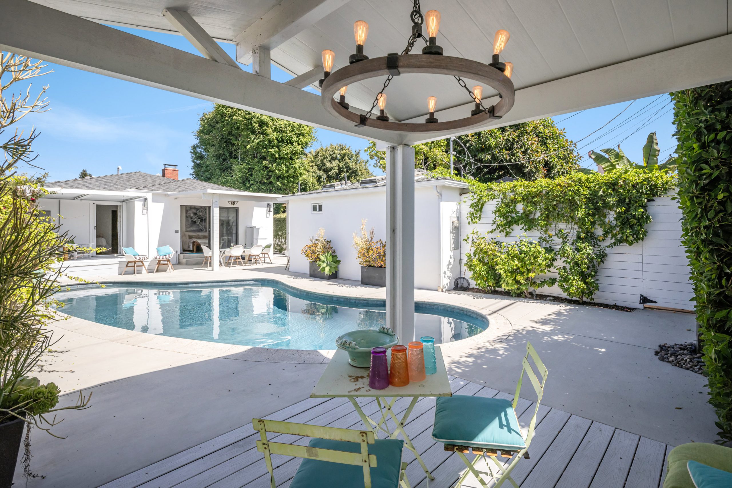 Surrounded by lush landscaping and multiple garden spaces, this private Venice compound is a true retreat. Designed for relaxation and everyday living, the property offers multiple outdoor areas that invite you to leave the doors open and enjoy a constant Ocean breeze. Inside, the main residence features an airy open layout with natural tones and seamless indoor-outdoor flow. The kitchen is the heart of the home with an oversized island, stool seating and opens into the living and dining areas. Three bedrooms in the main house include a spacious primary suite that opens directly to the backyard & sparkling pool. The yard itself offers room to gather, play, and entertain, with generous garden space & passion fruit vines surrounding the pool at it's center. Completing the property is a fully permitted detached one-bedroom guest house (ADU) with full kitchen, bathroom, and separate entrance ideal for in-laws, a home office, or generating rental income. Designed for vibrant living, this property combines indoor comfort with outdoor lifestyle, a true Venice retreat for families looking to enjoy every moment at home.