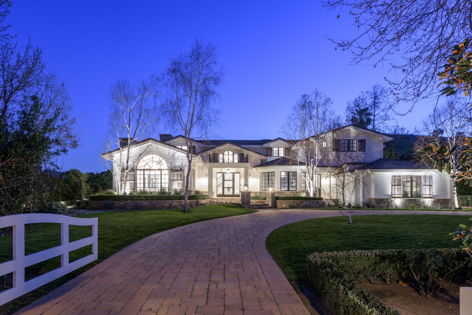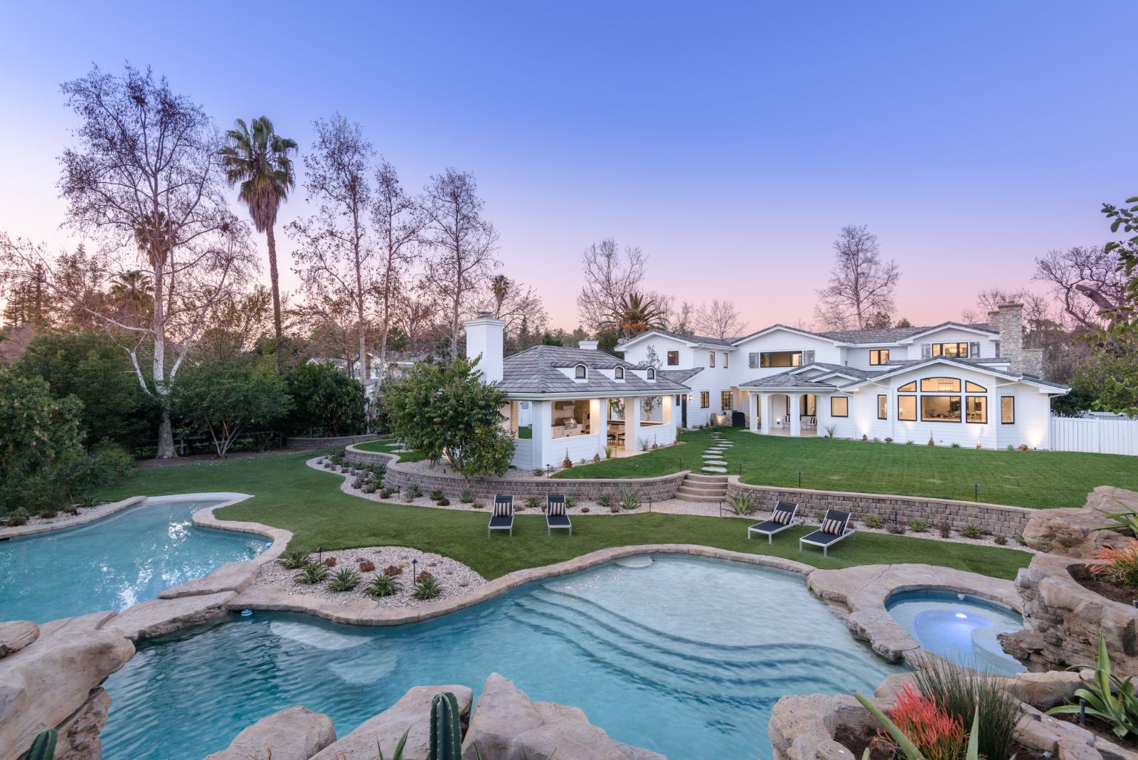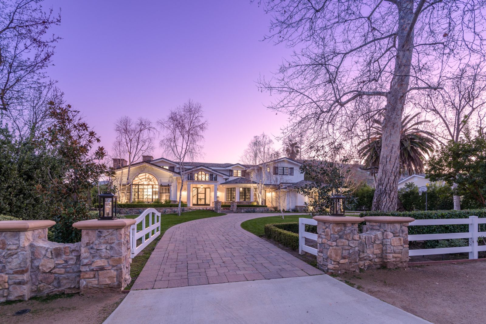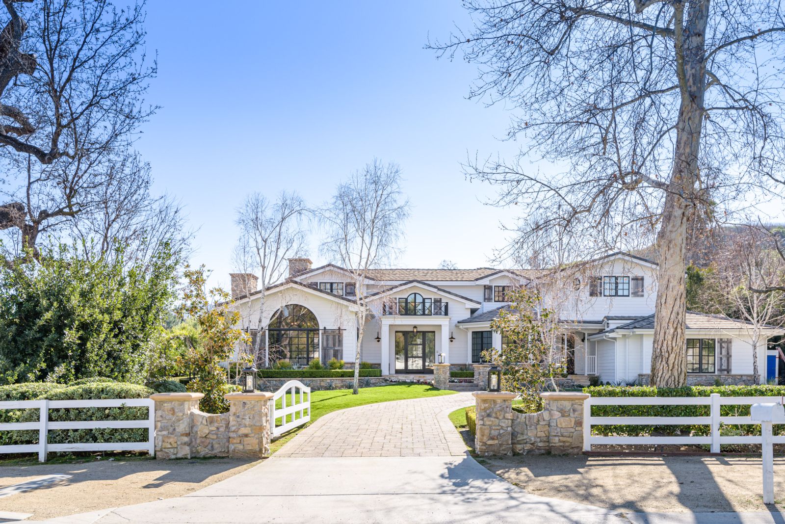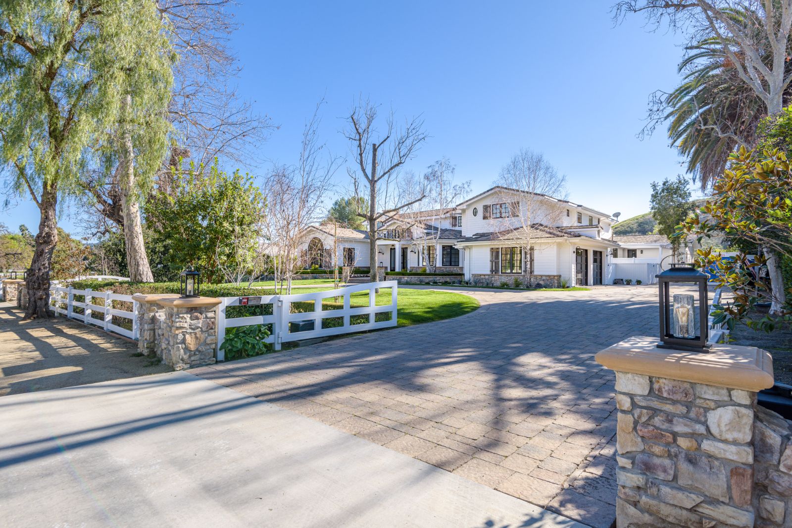 Beautifully remodeled throughout, this gated Hidden Hills Estate spans ~8,500 square feet of immaculate quality and design. Features include soaring open beam ceilings, wood floors, grand living spaces, and a luxurious master suite w/ 2 fireplaces, dual stone baths, and boutique-style custom closets. Offering a wrap-around center island w/ seating, a freestanding Wolf range, four ovens, Miele Coffee center, and pizza oven the chef's kitchen flows seamlessly into the custom family room with a stunning fireplace. Additionally, there is a home theater, dedicated wine room with refrigerated wine storage & linear fireplace, formal living, dining & breakfast rooms, and a sunny front office with large picture windows that overlook the manicured grounds. The wonderfully private resort-like yard hosts one of the most beautiful beach entry pools in the city with multiple waterfalls and a spa. The adjoining large entertainer's pavilion includes a fireplace, music system, TV, pizza oven, and an outdoor kitchen. Lush landscaping and mature fruit & shade trees surround the grounds.
