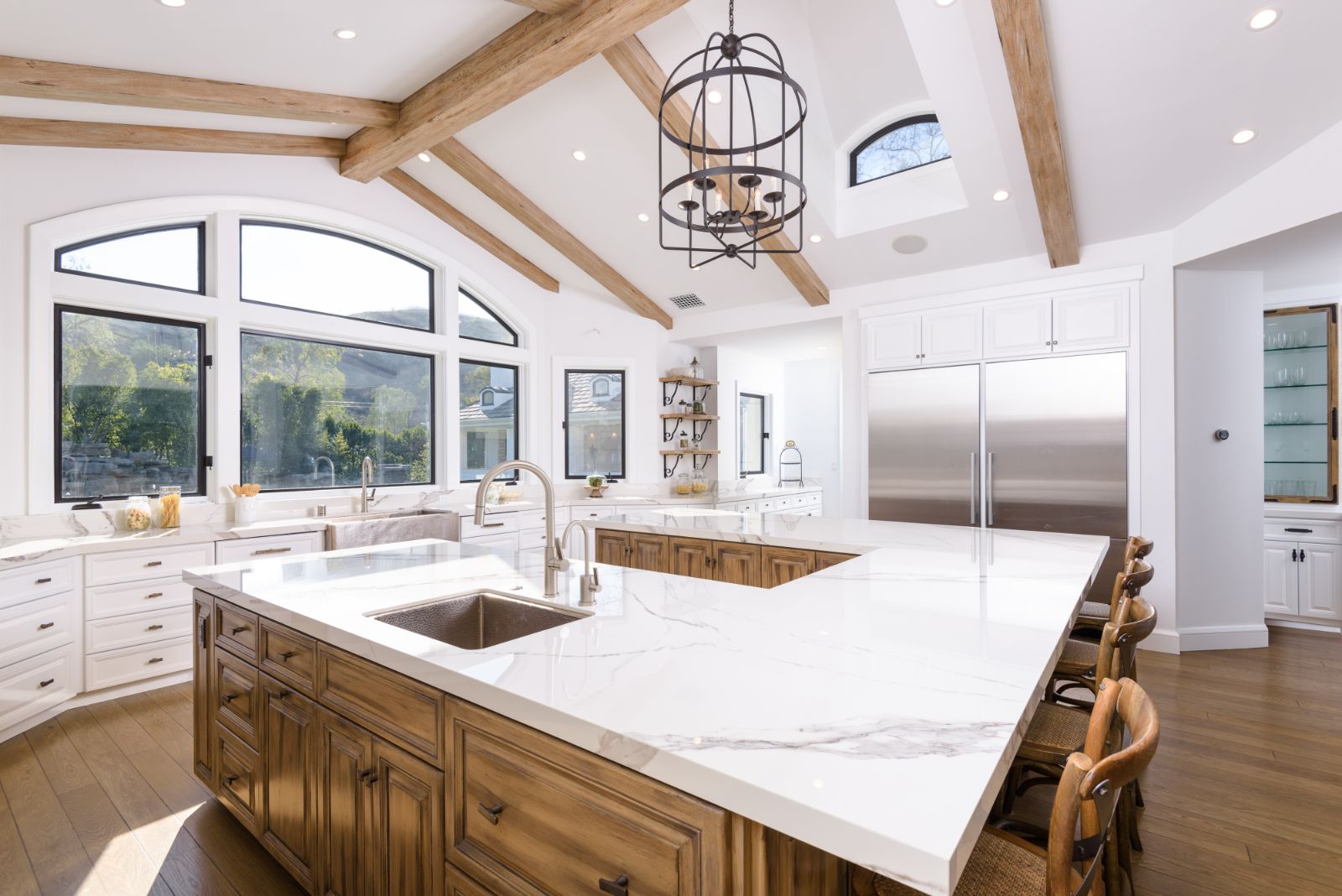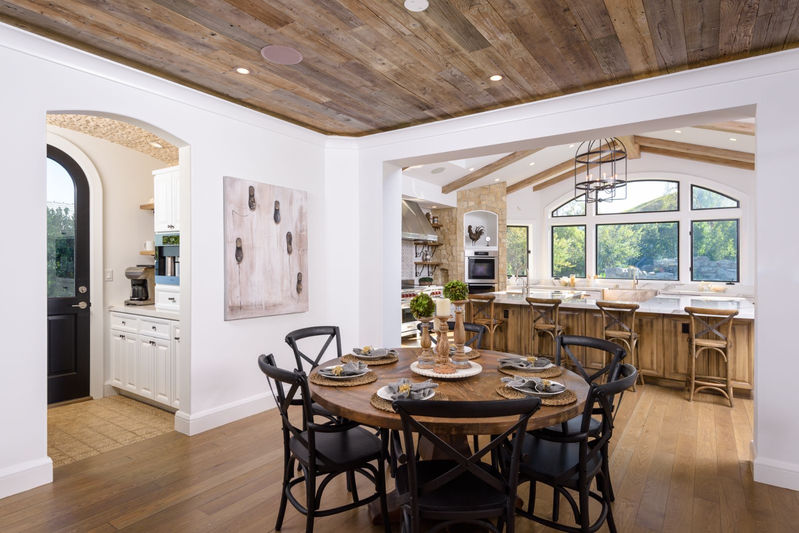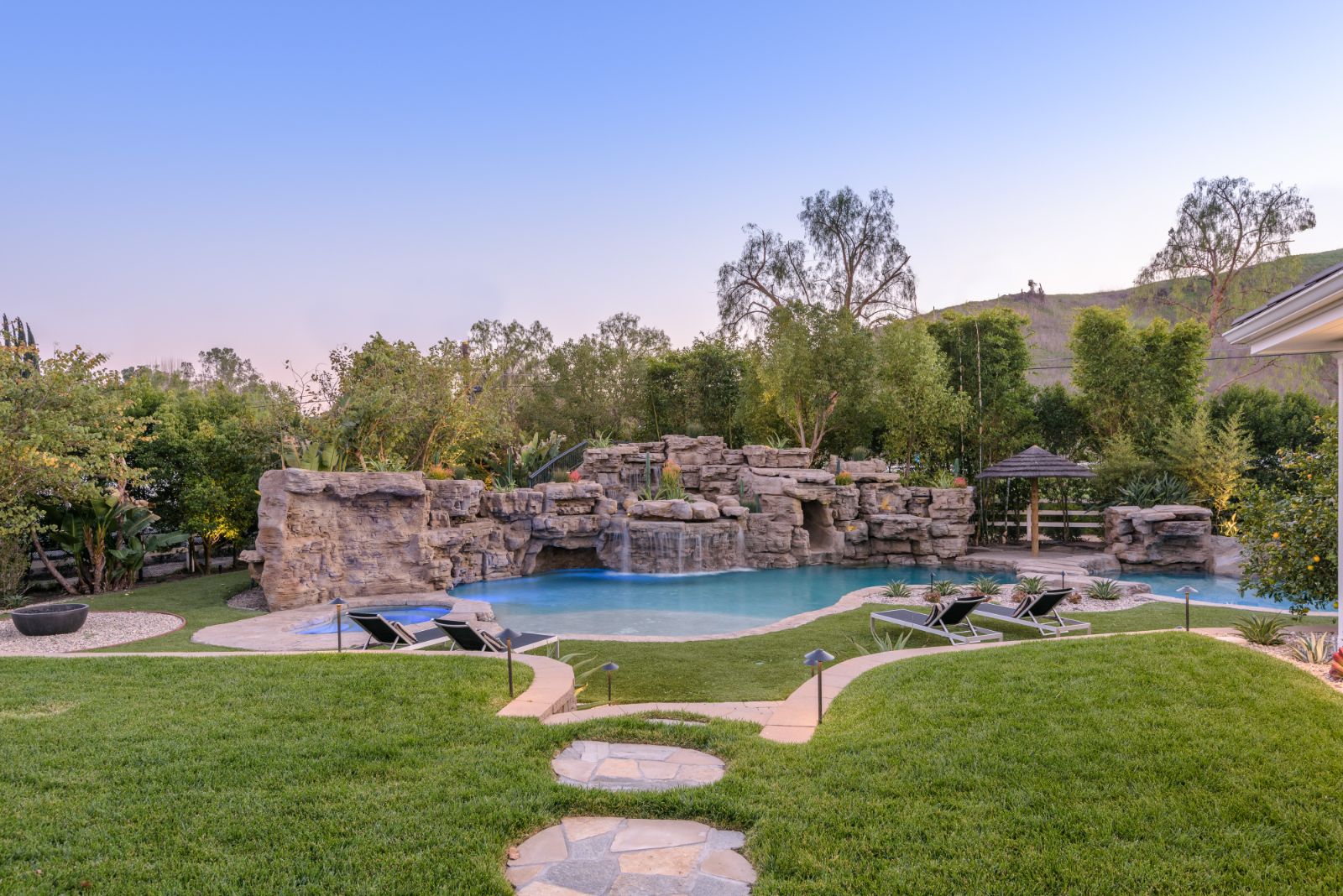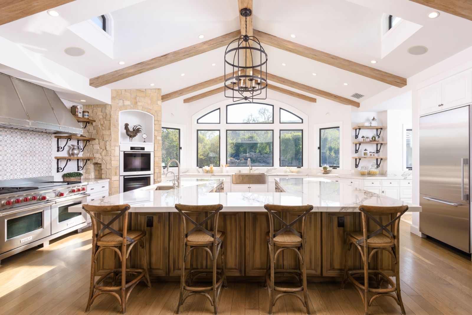 Beautifully remodeled throughout, this gated Hidden Hills Estate spans ~8,500 square feet of immaculate quality and design. Features include soaring open beam ceilings, wood floors, grand living spaces, and a luxurious master suite w/ 2 fireplaces, dual stone baths, and boutique-style custom closets. Offering a wrap-around center island w/ seating, a freestanding Wolf range, four ovens, Miele Coffee center, and pizza oven the chef's kitchen flows seamlessly into the custom family room with a stunning fireplace. Additionally, there is a home theater, dedicated wine room with refrigerated wine storage & linear fireplace, formal living, dining & breakfast rooms, and a sunny front office with large picture windows that overlook the manicured grounds. The wonderfully private resort-like yard hosts one of the most beautiful beach entry pools in the city with multiple waterfalls and a spa. The adjoining large entertainer's pavilion includes a fireplace, music system, TV, pizza oven, and an outdoor kitchen. Lush landscaping and mature fruit & shade trees surround the grounds.