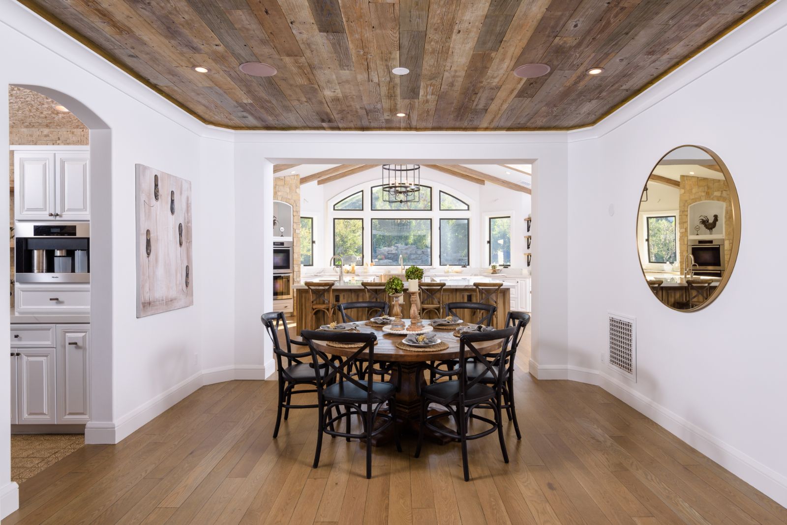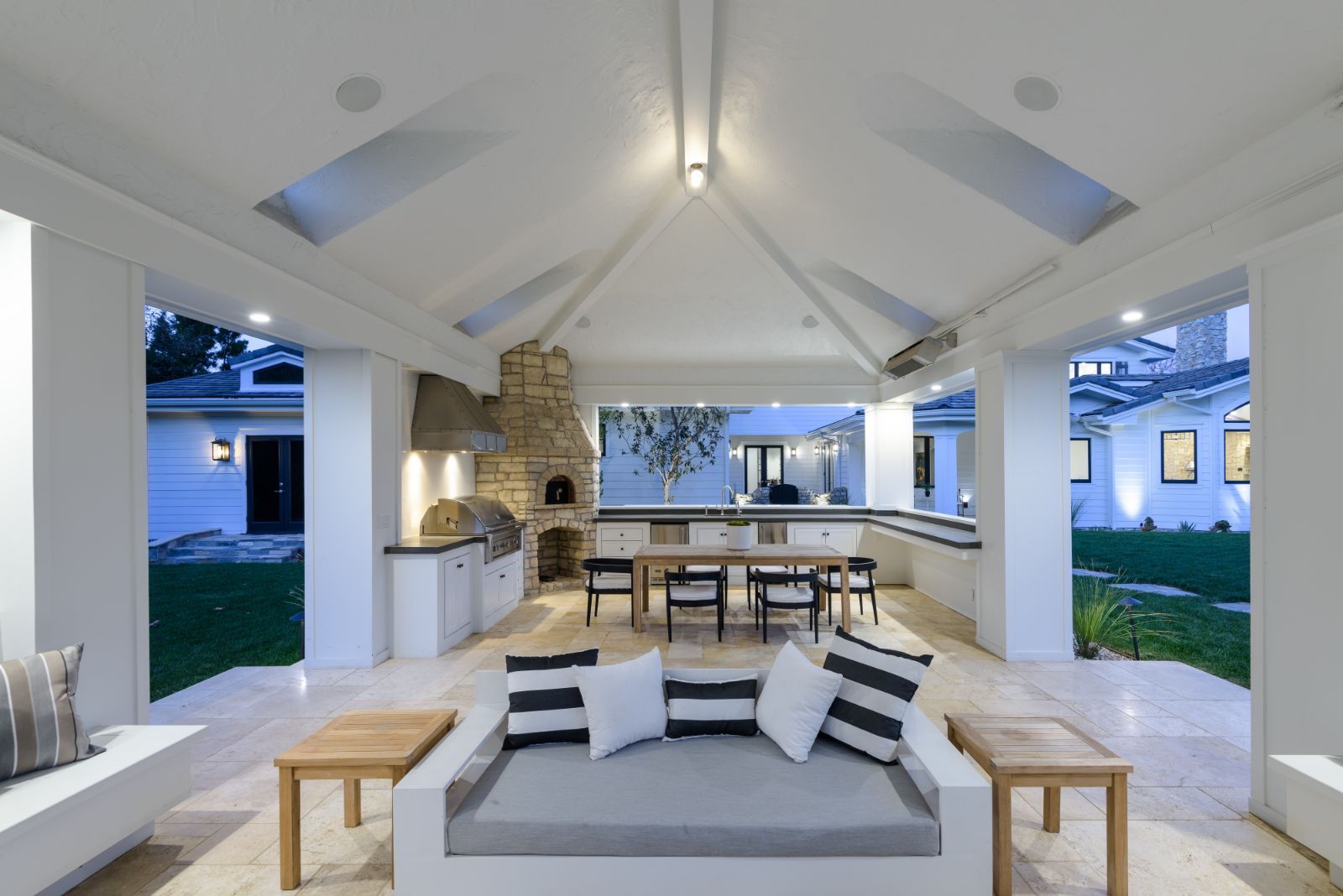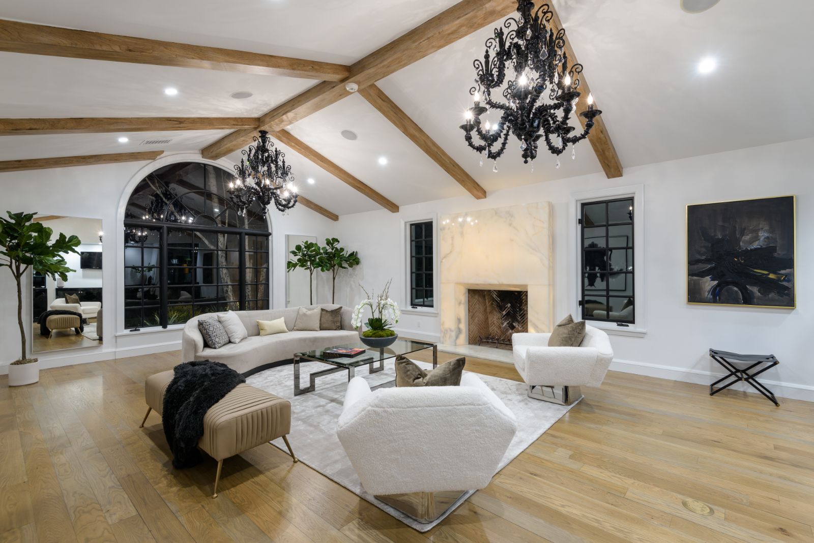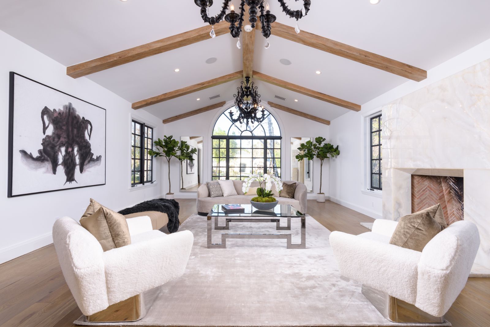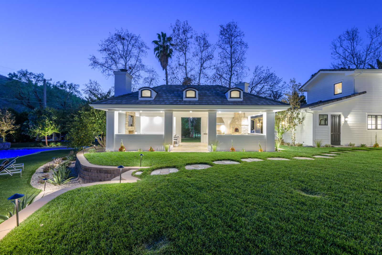 Beautifully remodeled throughout, this gated Hidden Hills Estate spans ~8,500 square feet of immaculate quality and design. Features include soaring open beam ceilings, wood floors, grand living spaces, and a luxurious master suite w/ 2 fireplaces, dual stone baths, and boutique-style custom closets. Offering a wrap-around center island w/ seating, a freestanding Wolf range, four ovens, Miele Coffee center, and pizza oven the chef's kitchen flows seamlessly into the custom family room with a stunning fireplace. Additionally, there is a home theater, dedicated wine room with refrigerated wine storage & linear fireplace, formal living, dining & breakfast rooms, and a sunny front office with large picture windows that overlook the manicured grounds. The wonderfully private resort-like yard hosts one of the most beautiful beach entry pools in the city with multiple waterfalls and a spa. The adjoining large entertainer's pavilion includes a fireplace, music system, TV, pizza oven, and an outdoor kitchen. Lush landscaping and mature fruit & shade trees surround the grounds.