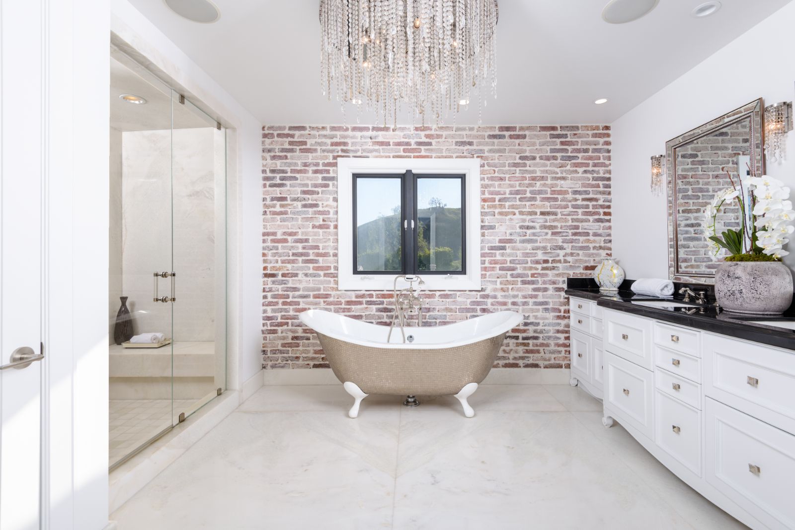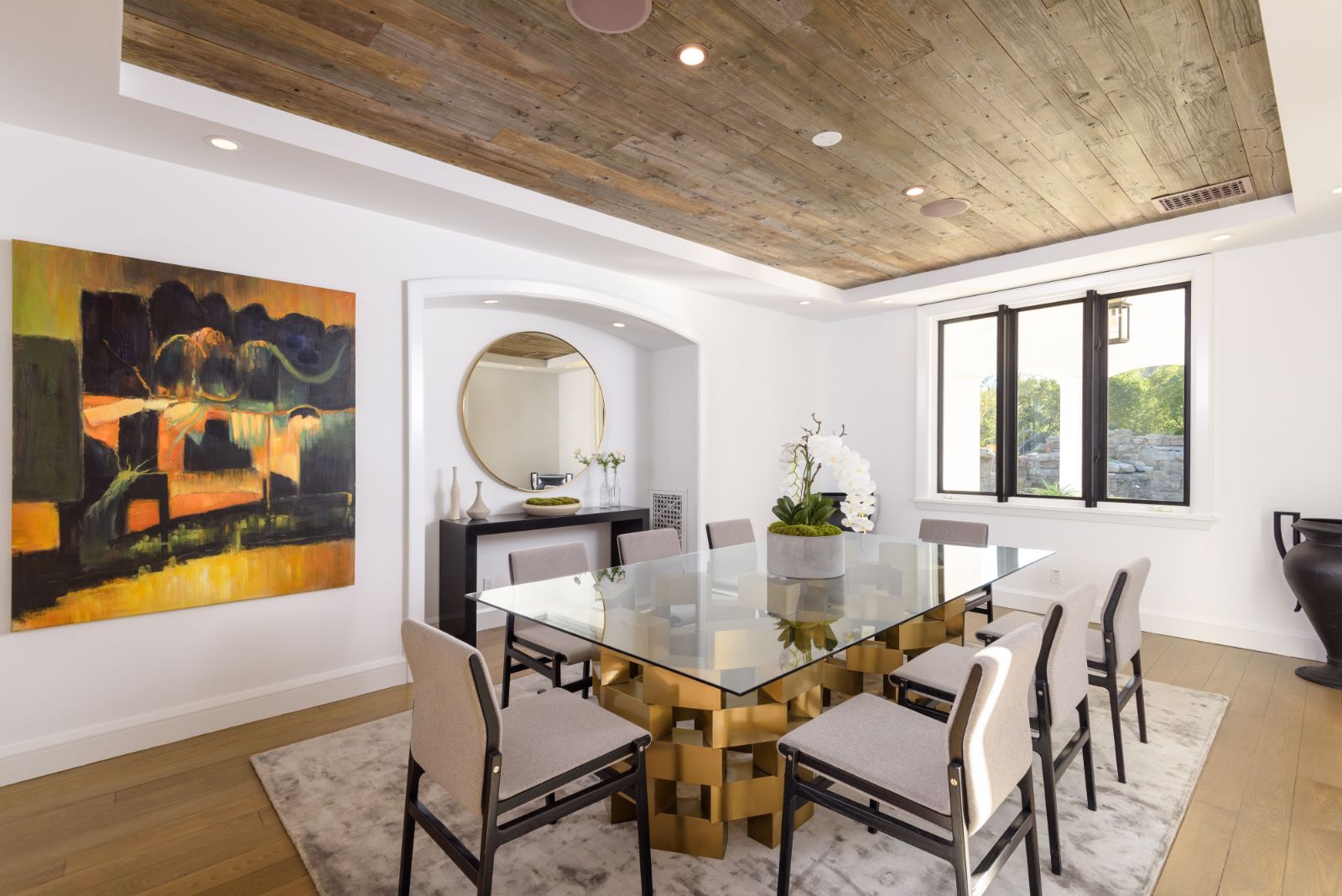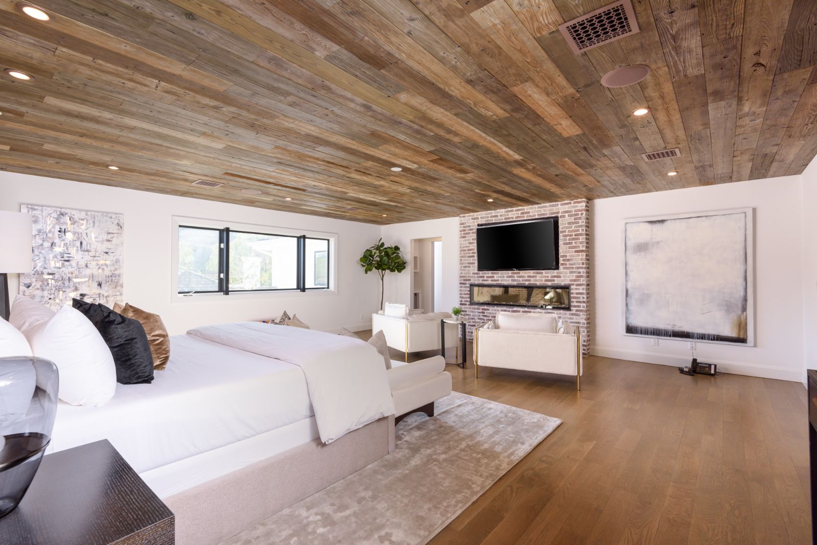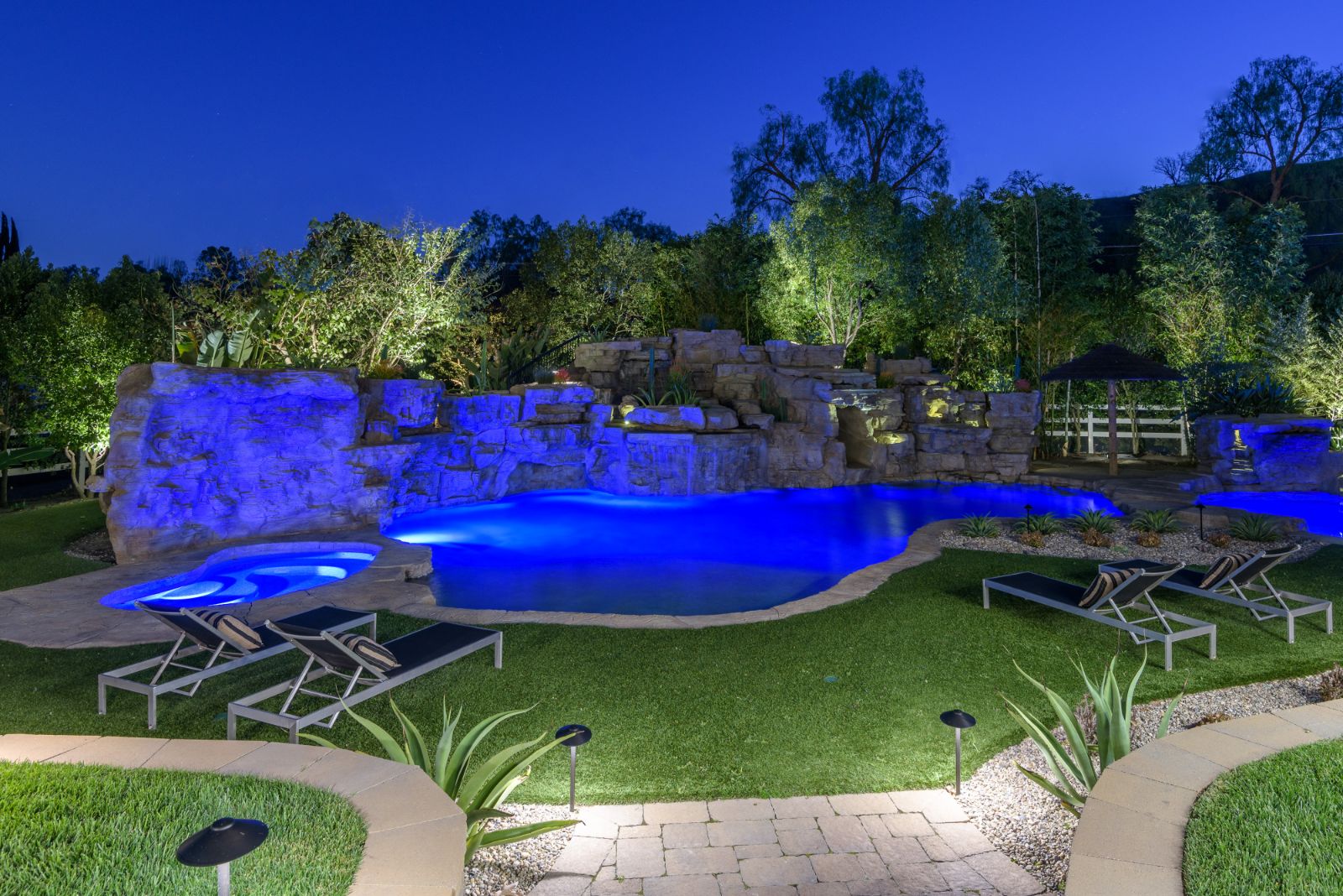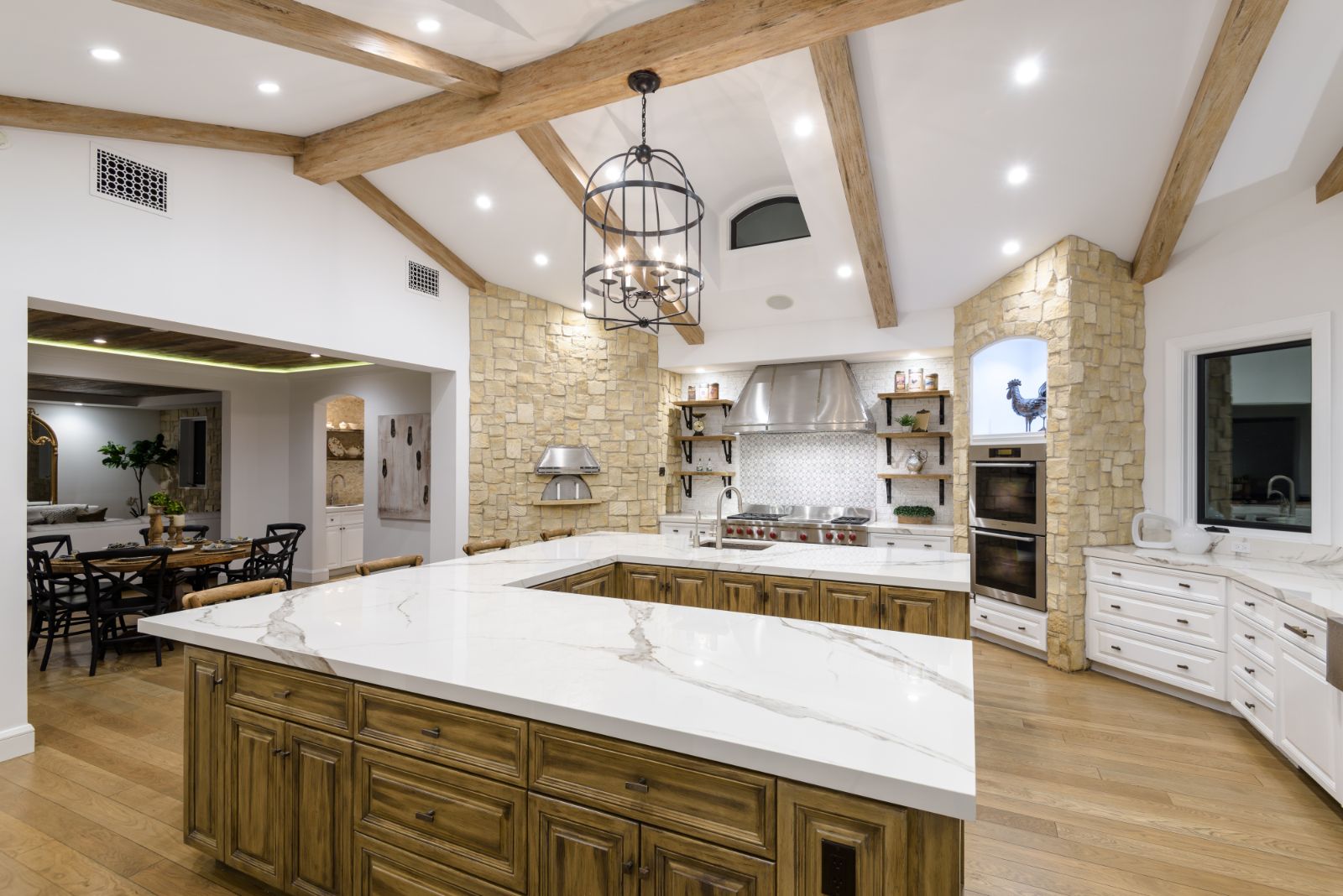 Beautifully remodeled throughout, this gated Hidden Hills Estate spans ~8,500 square feet of immaculate quality and design. Features include soaring open beam ceilings, wood floors, grand living spaces, and a luxurious master suite w/ 2 fireplaces, dual stone baths, and boutique-style custom closets. Offering a wrap-around center island w/ seating, a freestanding Wolf range, four ovens, Miele Coffee center, and pizza oven the chef's kitchen flows seamlessly into the custom family room with a stunning fireplace. Additionally, there is a home theater, dedicated wine room with refrigerated wine storage & linear fireplace, formal living, dining & breakfast rooms, and a sunny front office with large picture windows that overlook the manicured grounds. The wonderfully private resort-like yard hosts one of the most beautiful beach entry pools in the city with multiple waterfalls and a spa. The adjoining large entertainer's pavilion includes a fireplace, music system, TV, pizza oven, and an outdoor kitchen. Lush landscaping and mature fruit & shade trees surround the grounds.