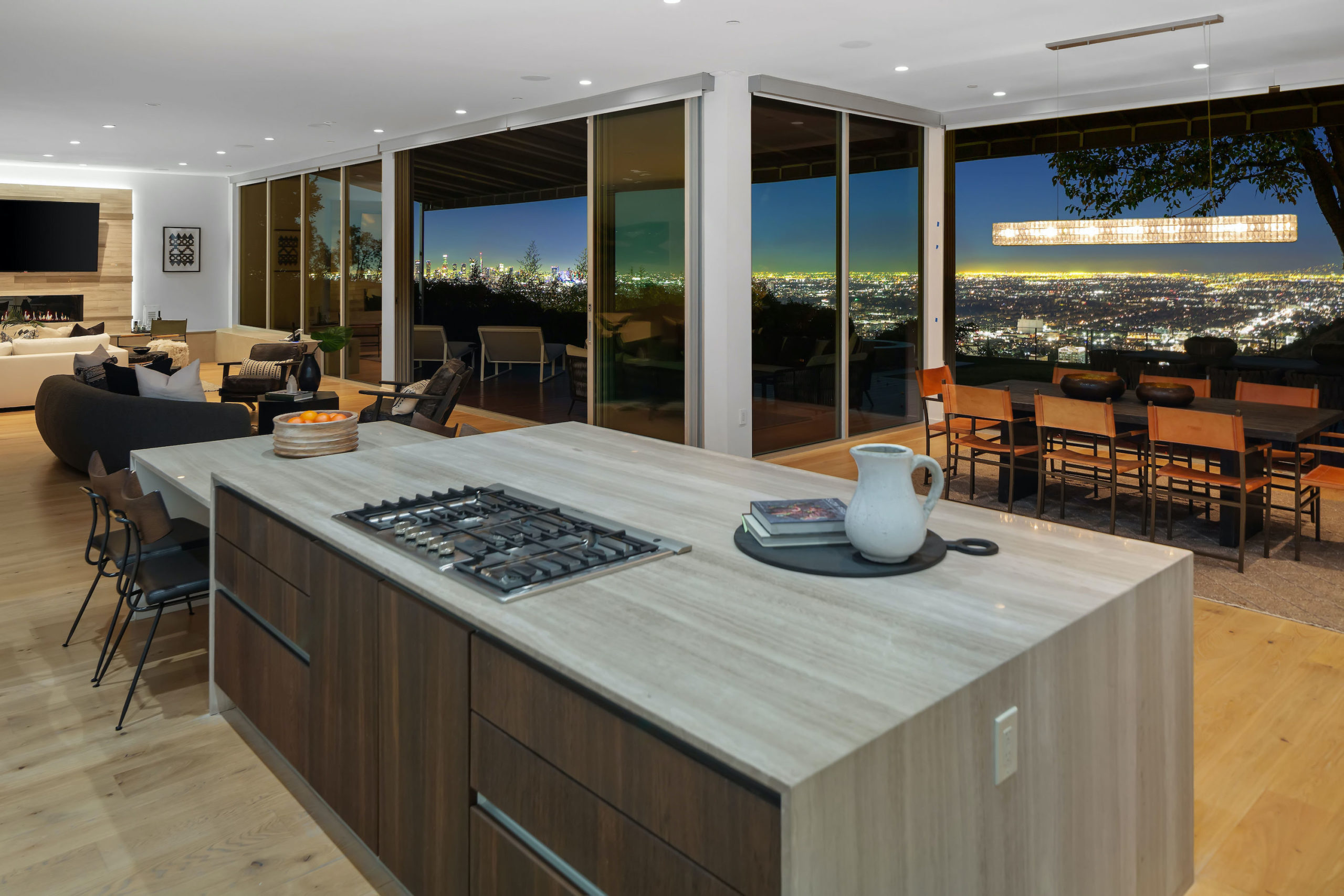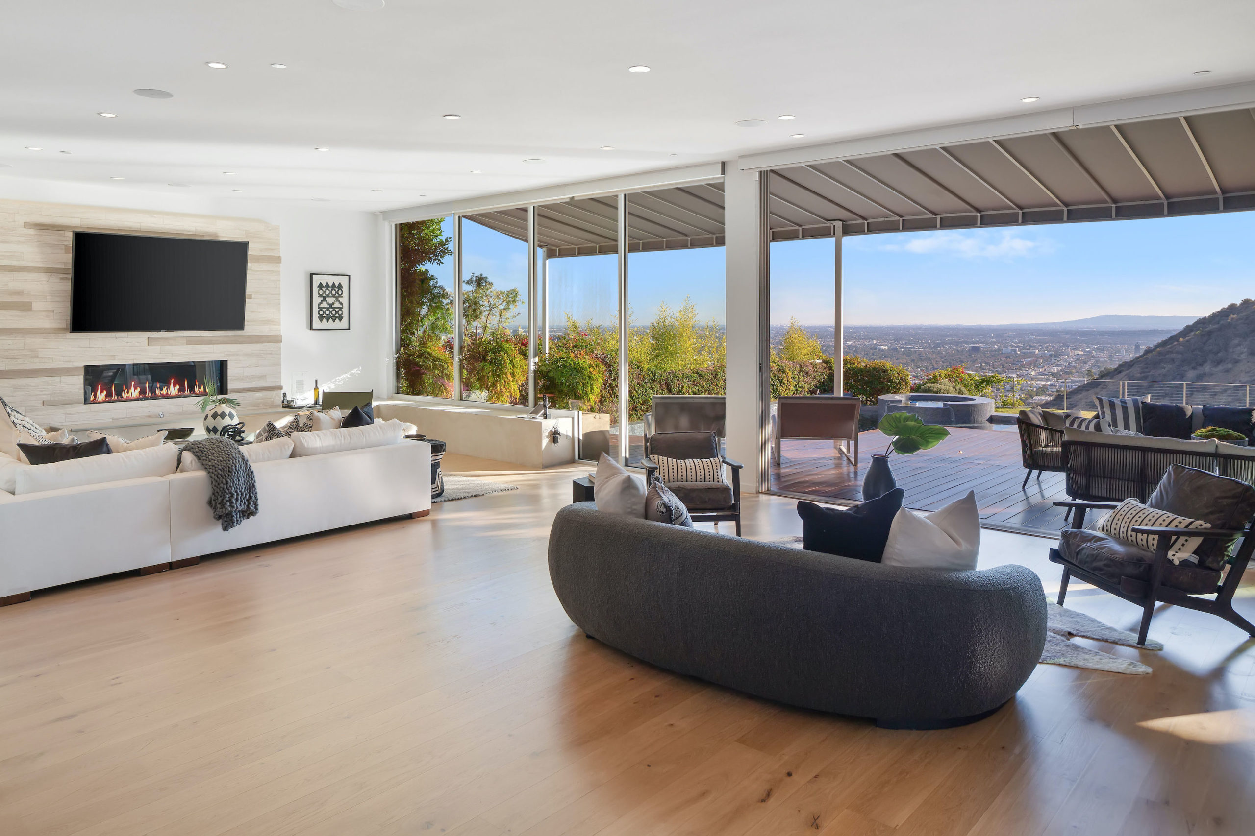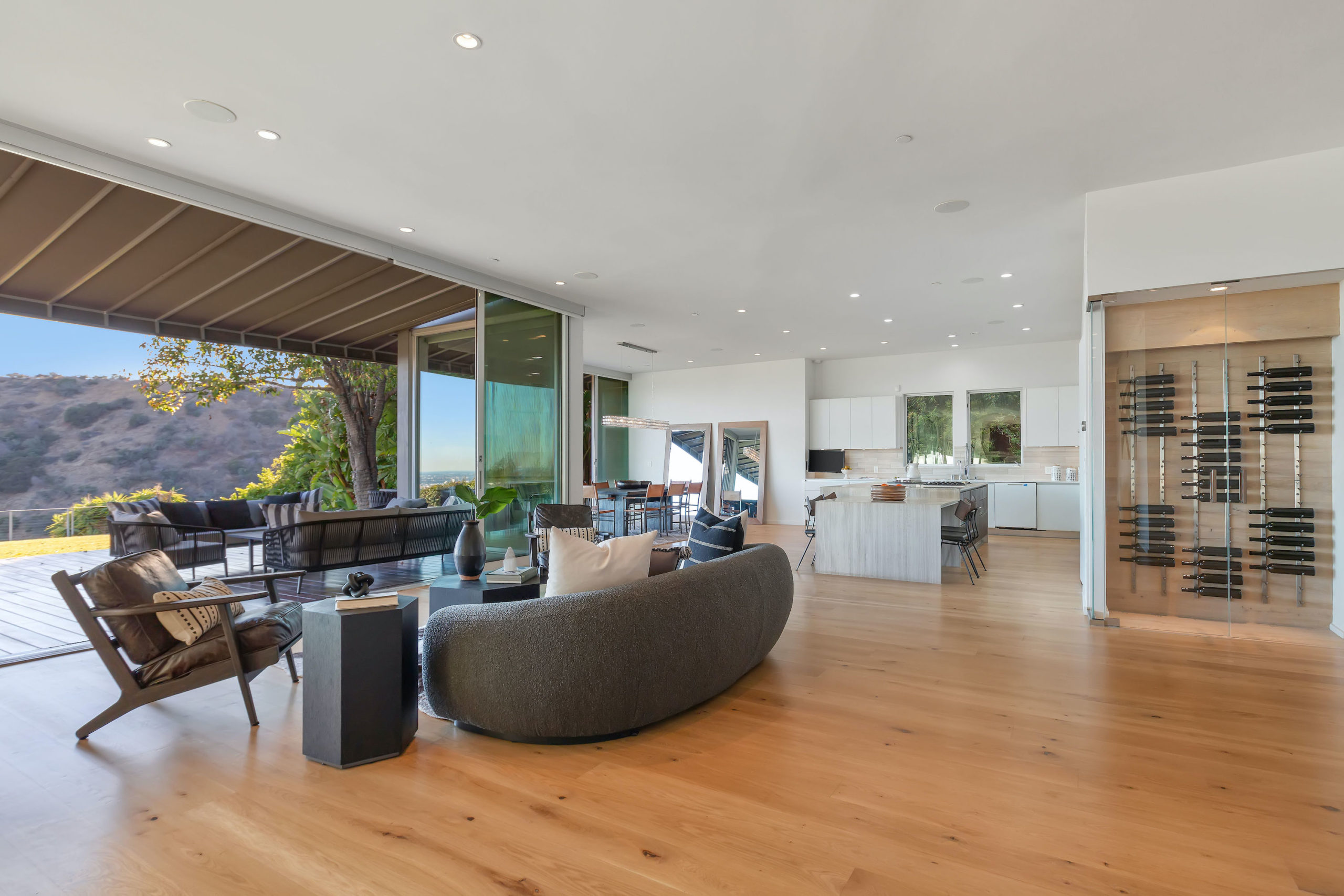 Set in the highly sought-after Outpost Estates, this modern architectural home offers the grandeur of expansive indoor-outdoor living with breathtaking city views. Spanning nearly 5,000 square feet incapsulated by soaring ceilings and white oak floors, the masterfully designed open floor plan features 5 bedrooms, 6 bathrooms, a wine cellar and office. From the living room, dining room & kitchen, walls of glass vanish opening up to the backyard positioned atop the Los Angeles skyline. The custom kitchen is suited with top-of-the-line appliances, a waterfall island and breakfast bar, all open to the other main entertainment spaces. Upstairs, the Master Suite is complete with a private balcony, walk in closet and a jaw dropping stone filled bathroom with a free-standing tub looking over the entire city. Perfect for both entertaining and relaxation, the backyard hosts a pool, elevated spa, and lush grass area. Fully equipped with the latest technology, the smart home allows for the most convenient living experience.