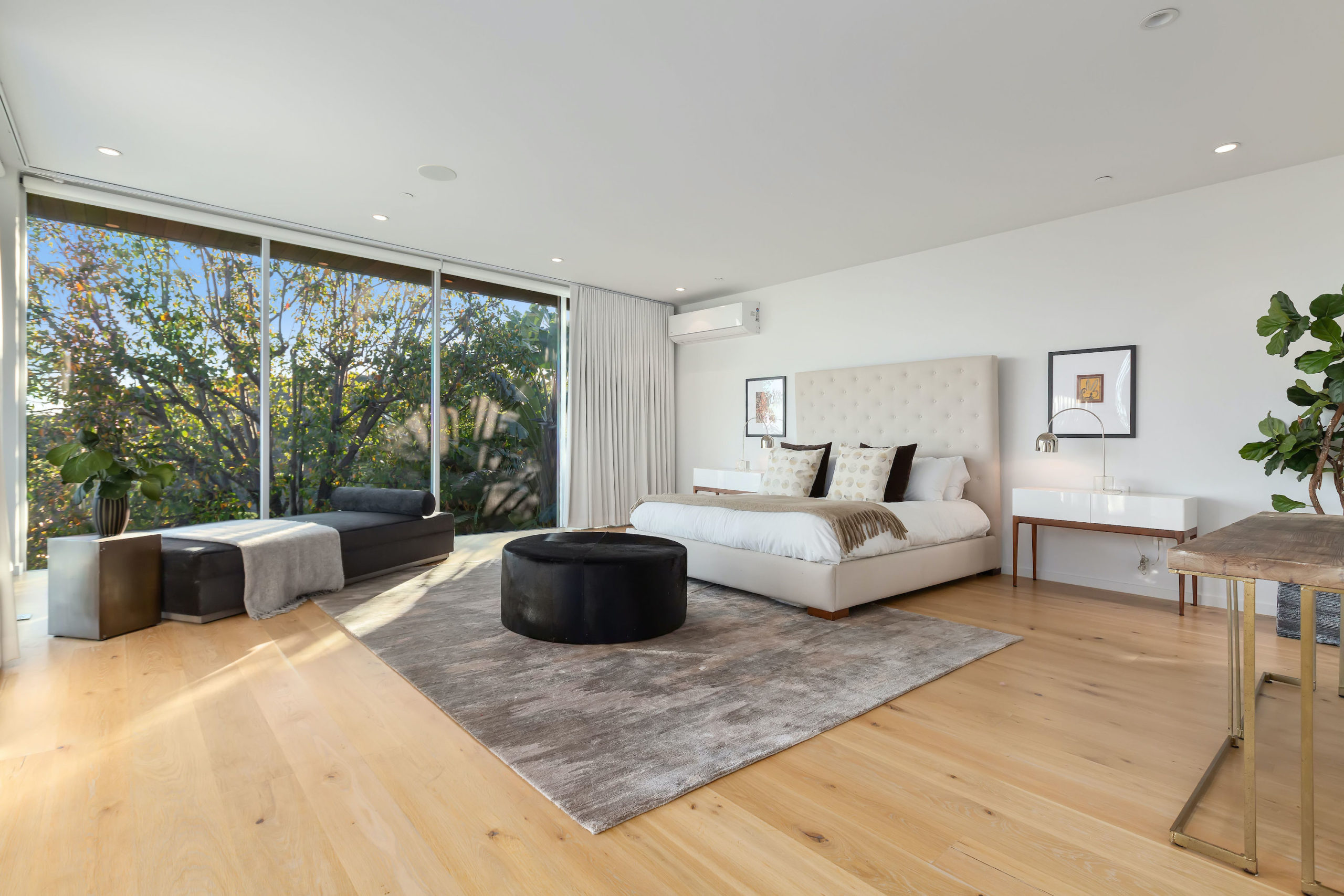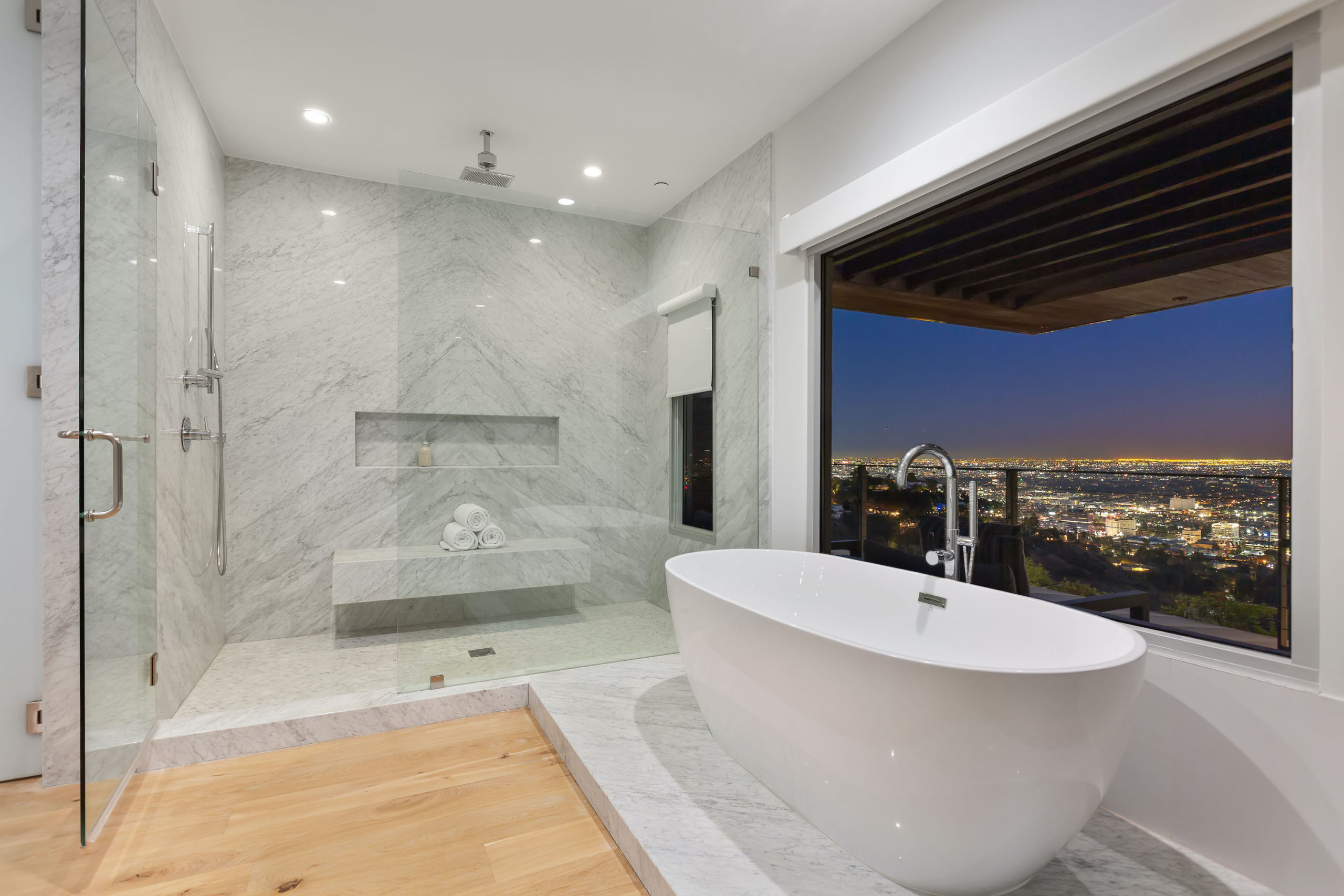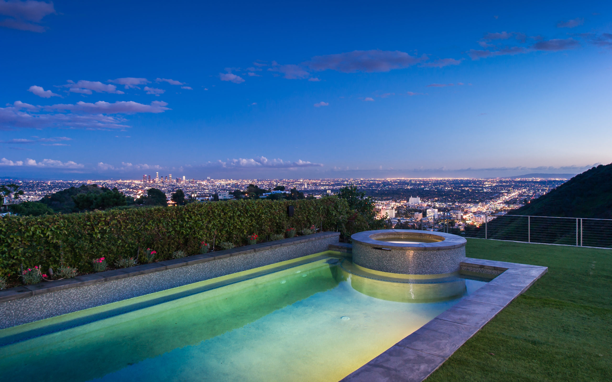 Set in the highly sought-after Outpost Estates, this modern architectural home offers the grandeur of expansive indoor-outdoor living with breathtaking city views. Spanning nearly 5,000 square feet incapsulated by soaring ceilings and white oak floors, the masterfully designed open floor plan features 5 bedrooms, 6 bathrooms, a wine cellar and office. From the living room, dining room & kitchen, walls of glass vanish opening up to the backyard positioned atop the Los Angeles skyline. The custom kitchen is suited with top-of-the-line appliances, a waterfall island and breakfast bar, all open to the other main entertainment spaces. Upstairs, the Master Suite is complete with a private balcony, walk in closet and a jaw dropping stone filled bathroom with a free-standing tub looking over the entire city. Perfect for both entertaining and relaxation, the backyard hosts a pool, elevated spa, and lush grass area. Fully equipped with the latest technology, the smart home allows for the most convenient living experience.