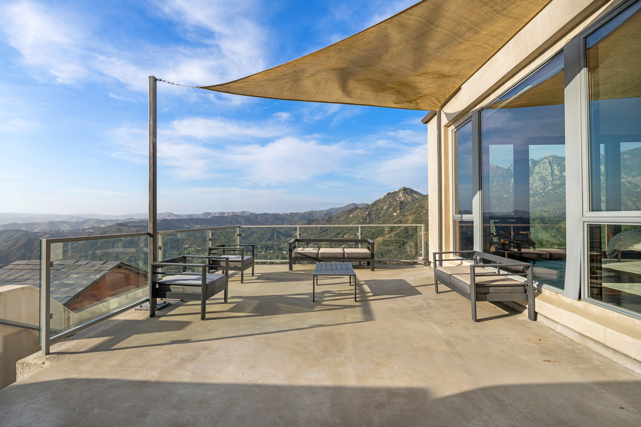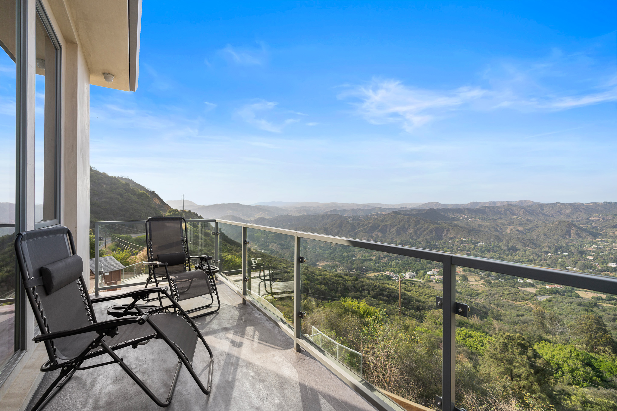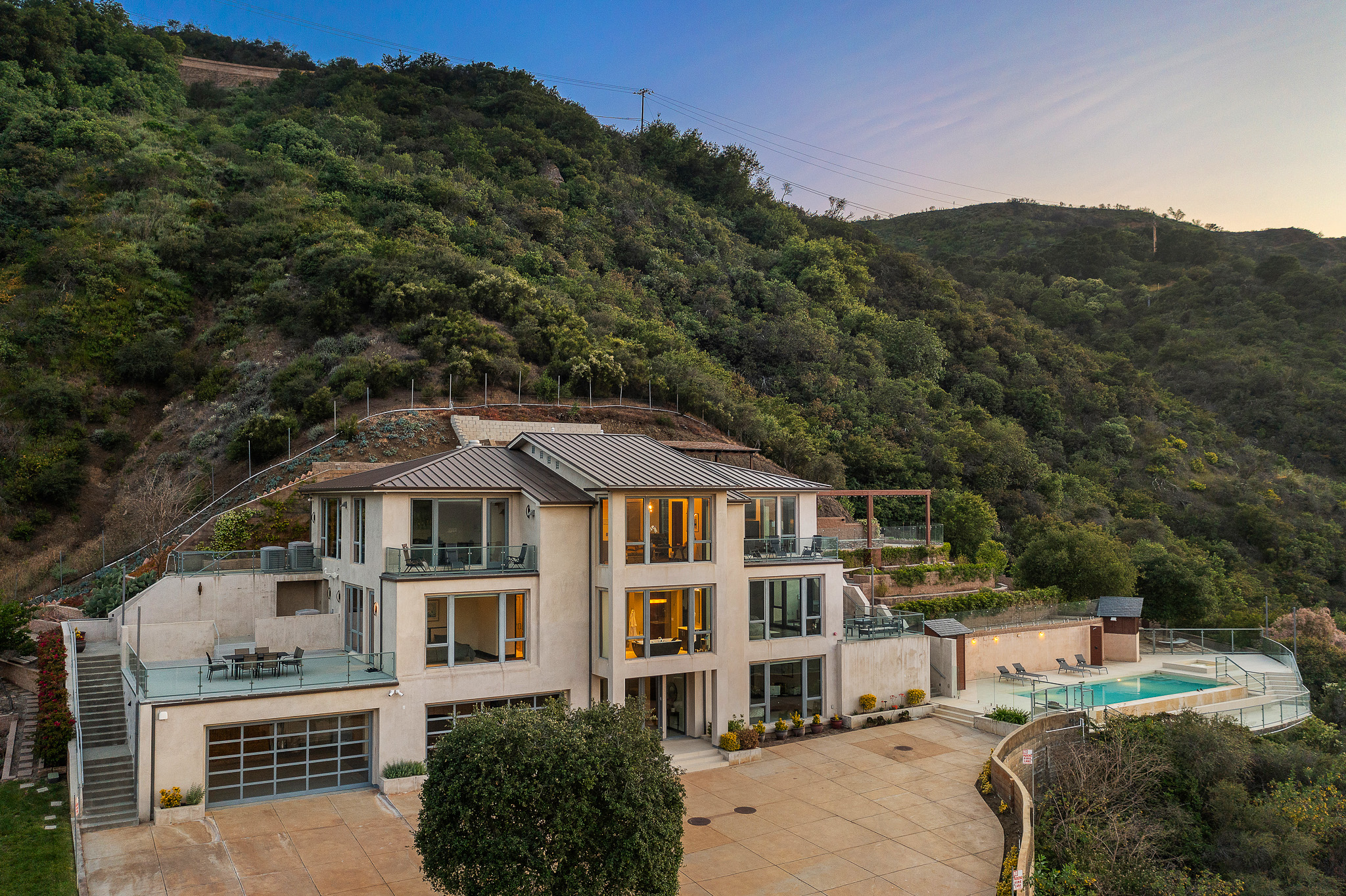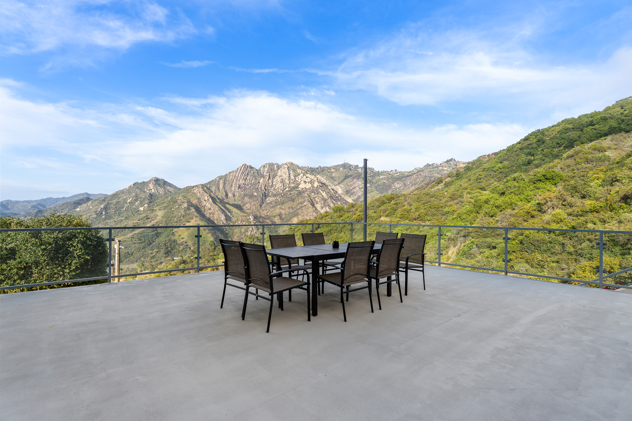Welcome to 25155 Piuma Road - a one-of-a-kind architectural masterpiece by acclaimed architect Jack Moses, perched on a private promontory in the Malibu hills. Set behind gates and surrounded by a mile of open space with no neighboring homes in sight, this striking modern retreat offers unmatched privacy, tranquility, and panoramic views of the Santa Monica Mountains. Often described as a "sanctuary in the sky" or "a house in the clouds," this home is truly unlike any other and simply cannot be duplicated. Expansive walls of glass flood the interiors with natural light and frame breathtaking vistas from nearly every room. The open-concept living area features wide-plank hardwood floors, a sleek fireplace, and seamless indoor-outdoor flow to multiple terraces. The chef's kitchen is outfitted with top-of-the-line appliances, custom cabinetry, and a large island ideal for entertaining. This multi-level estate offers generously sized bedrooms, including a luxurious primary suite with spa-like amenities, a soaking tub, and jaw-dropping views. Additional features include a media room, home office, and ample guest accommodations. The outdoor spaces are nothing short of spectacular, with a resort-style infinity pool and spa, expansive decks for lounging and dining, a pergola-covered firepit lounge, and beautifully curated gardens featuring 26 fruit and citrus trees. Environmentally conscious buyers will appreciate that the home is set up to be completely off the grid, with a reverse osmosis water filtration system and a private well that pumps water from 200 feet below into two 5,000-gallon storage tanks, providing clean, free water year-round. Tucked within the Santa Monica Mountains National Recreation Area, yet just 10 minutes from both Calabasas and Nobu Malibu, 25155 Piuma Road offers the perfect blend of secluded luxury and accessible convenience. A rare opportunity to own an extraordinary retreat in the sky, where nature, design, and serenity converge.