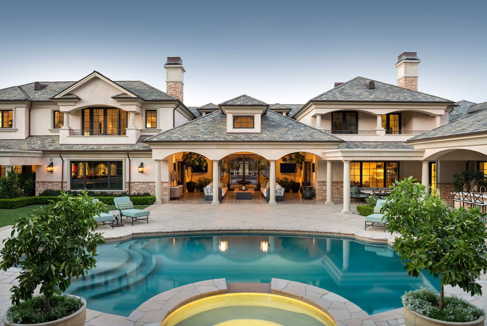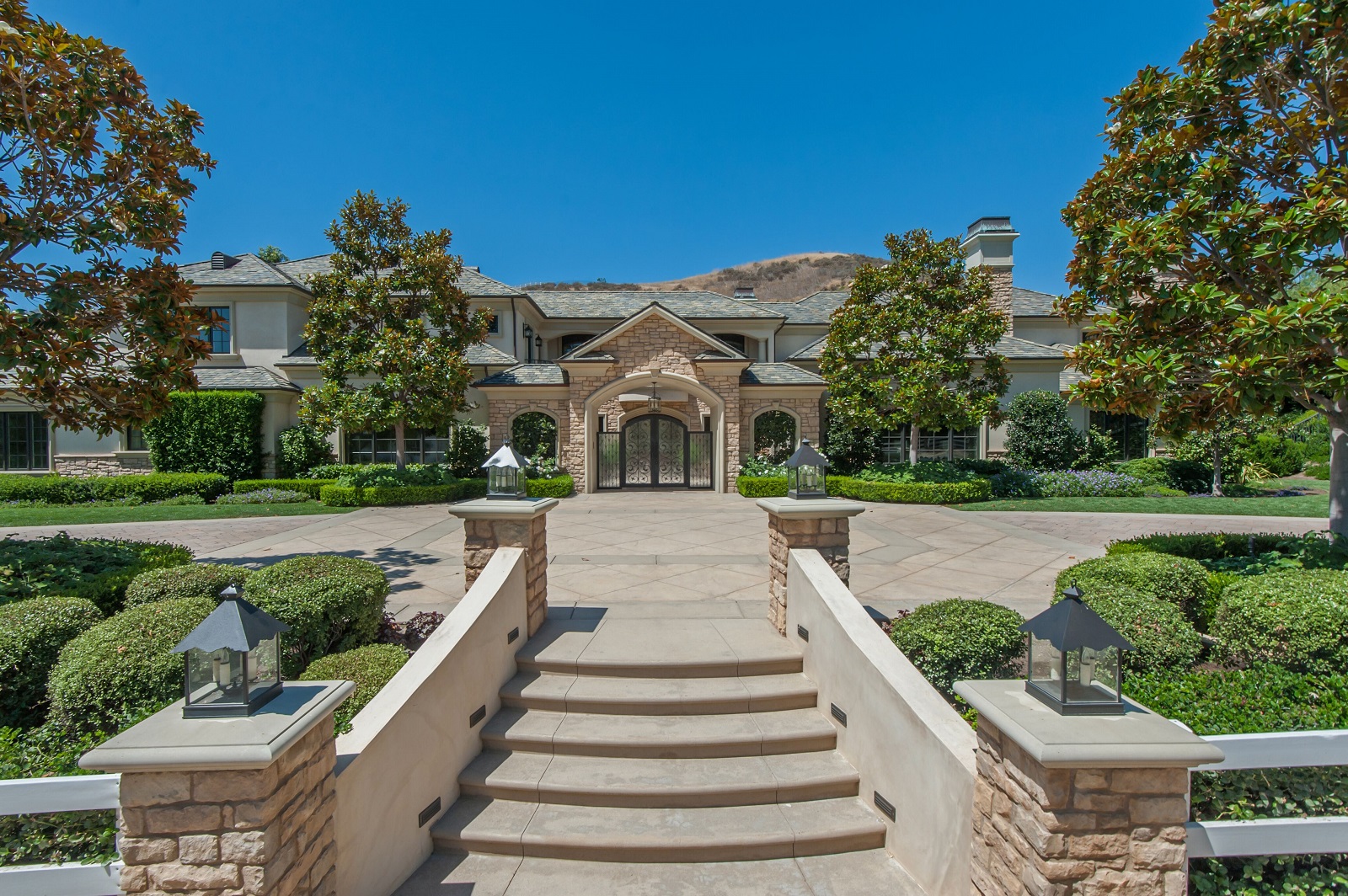 This truly spectacular country French estate is located in the prime Ashley Ridge section of Hidden Hills and spans approximately 13,000 square feet of gorgeous quality and custom elegance including a beautiful detached two-room guesthouse and separate gym. Highlights include a magnificent gourmet kitchen with two islands opening to the large family room, plus formal dining room with refrigerated wine cellar, custom theatre, finished office/study, sunny living room opening to the gated courtyard, luxurious master suite with dual walk-in closets and stone bath with steam shower, plus covered outdoor entertaining patios, circular drive, and six-car garage behind electric gates. Amenities include limestone and walnut floors, marble, granite and limestone counters, open beam ceilings, top quality stainless steel appliances, vintage lighting, and smart home system. The lush manicured grounds include a pebble sheen pool, large grass yard, fruit orchard, covered BBQ center, and great privacy. Located near the end of a quiet cul-de-sac, this estate is absolutely immaculate throughout and shows true pride of ownership.