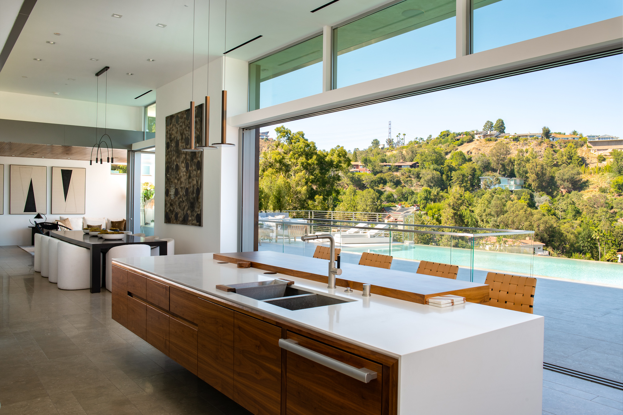 string(928) "Set in the Hollywood Hills on a premier private cul-de-sac, this architectural masterpiece boasts jetliner city and canyon views with unparalleled scale and design. With 3,800sf of luxury living, this 3-bedroom, 4-bathroom home showcases an expansive floor plan with a state-of-the-art chef's kitchen, oversized center island and top of the line appliances. The entire enclave is met by floor-to-ceiling sliding doors giving a seamless transition to your outdoor patio space and 75 foot raised zero-edge infinity pool that cascades into thin air. The living room features a built-in media center with stealth audio in the walls. The primary suite is its own sanctuary surrounded by lush green canyon views, including a private gym room and sun-drenched spa bathroom. Additional amenities include a 2-story subterranean garage with car lifts, a private Zen Garden in the center, and a backyard cut from the Getty Museums grounds."
