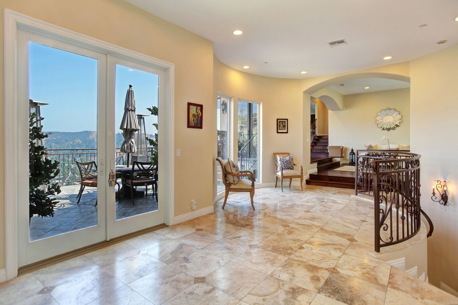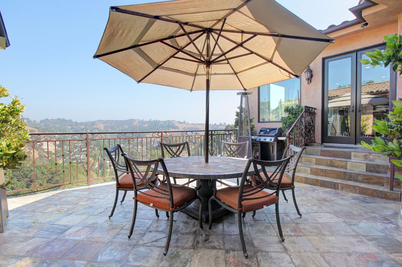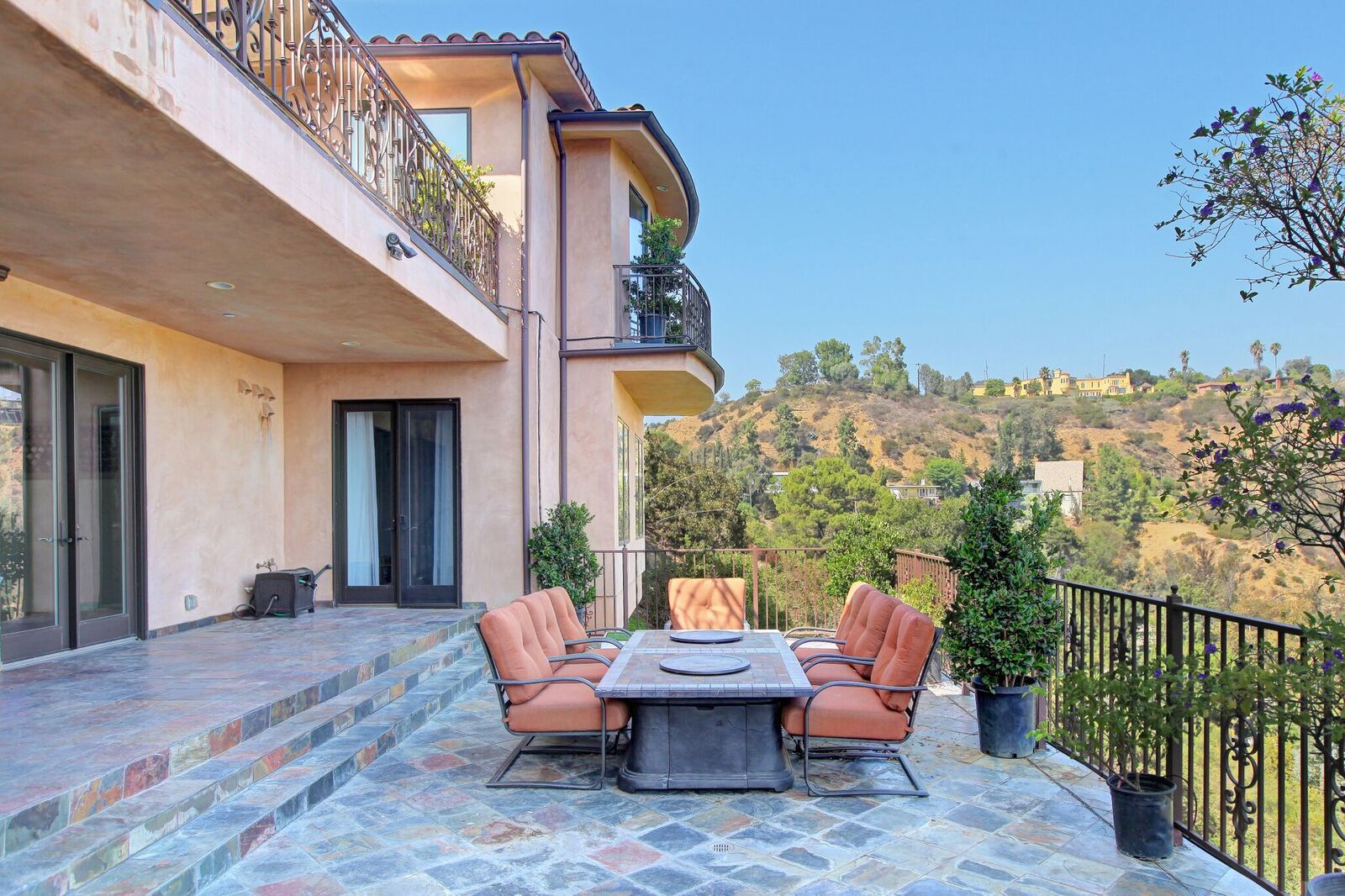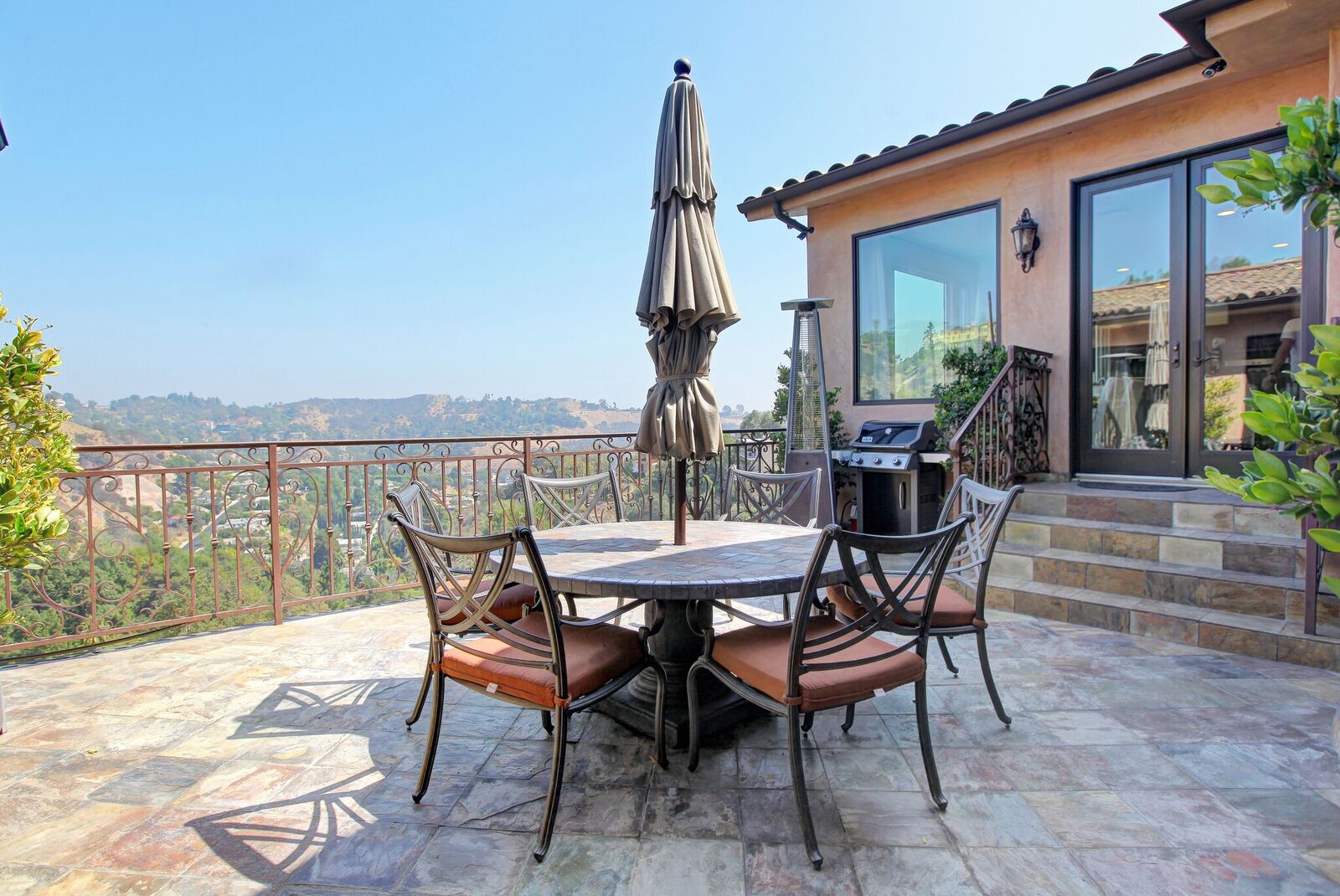 Newly built Spanish Mediterranean in the hills with sweeping canyon views from all rooms. Gated courtyard leads to inviting formal entry with travertine floors, custom wrought iron banisters, and railings. Light and bright floor plan boasting 3 bedrooms (one main floor bedroom), four bathrooms and office. Chef's kitchen with granite countertops, center island with breakfast bar, stainless steel appliances and wine cooler and opening to formal dining room and family room with fireplace. Expansive master with soaring ceilings, fireplace and beautiful hardwood floors leading out to balcony with tranquil canyon views. All rooms open to sprawling slate terrace with plenty of room for outdoor entertaining. Over 4,100 square feet with hardwood flooring and attached 2car garage. This elegant home located at the corner of Woodstock and Willow Glen offers panoramic views and privacy yet close enough to the center of all the action in Los Angeles.