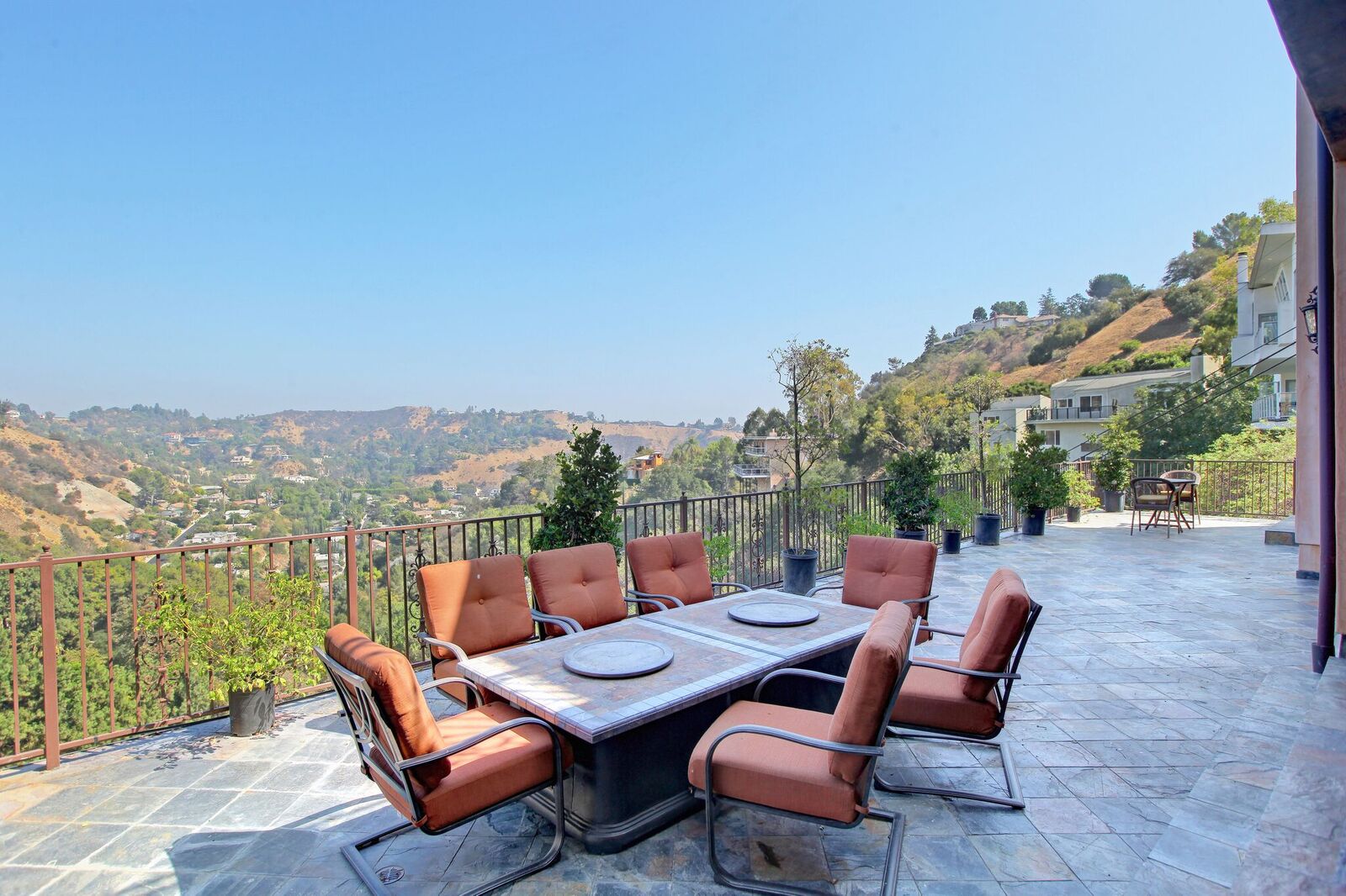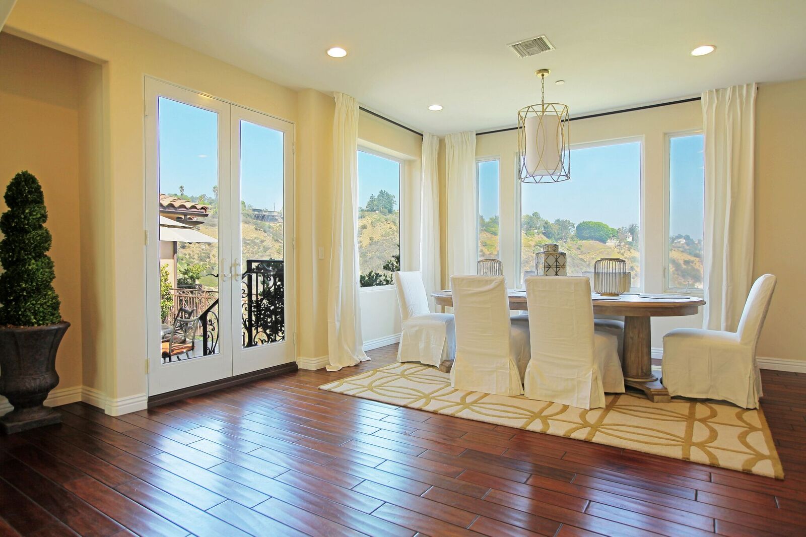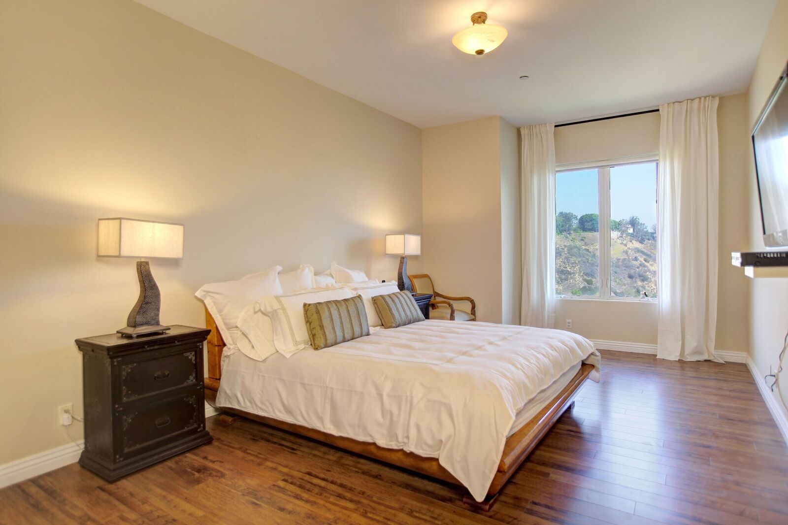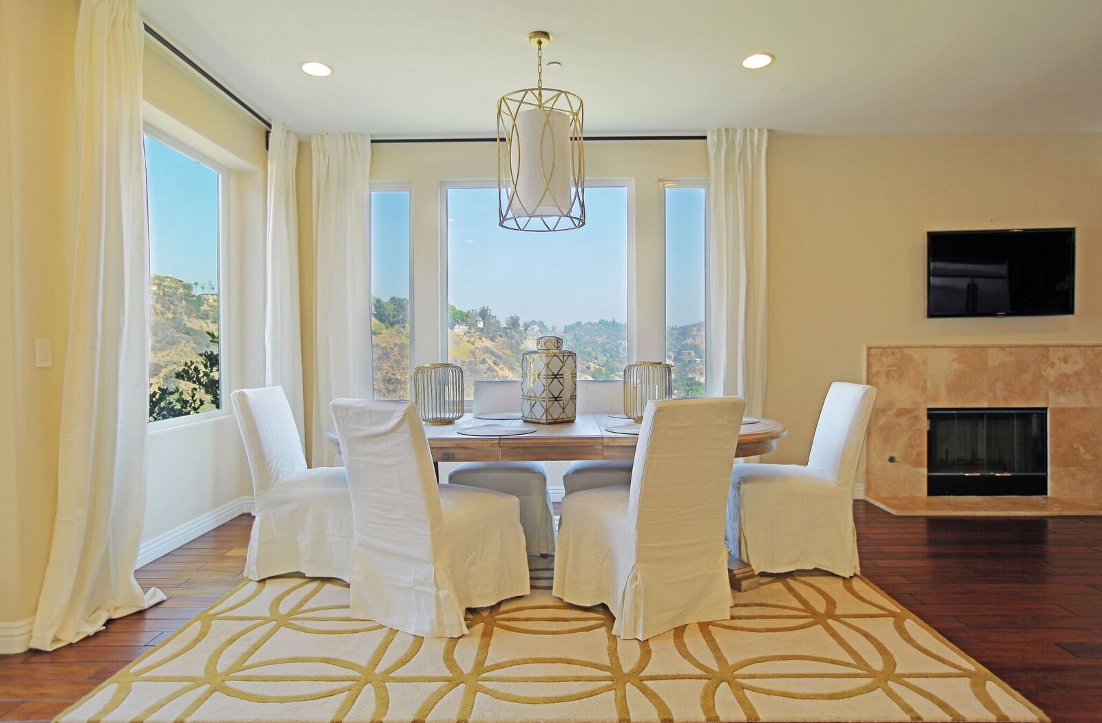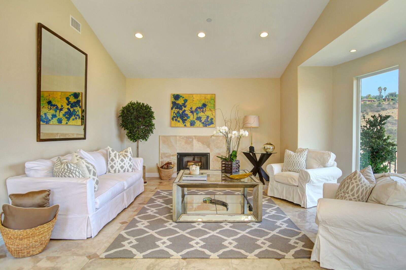 Newly built Spanish Mediterranean in the hills with sweeping canyon views from all rooms. Gated courtyard leads to inviting formal entry with travertine floors, custom wrought iron banisters, and railings. Light and bright floor plan boasting 3 bedrooms (one main floor bedroom), four bathrooms and office. Chef's kitchen with granite countertops, center island with breakfast bar, stainless steel appliances and wine cooler and opening to formal dining room and family room with fireplace. Expansive master with soaring ceilings, fireplace and beautiful hardwood floors leading out to balcony with tranquil canyon views. All rooms open to sprawling slate terrace with plenty of room for outdoor entertaining. Over 4,100 square feet with hardwood flooring and attached 2car garage. This elegant home located at the corner of Woodstock and Willow Glen offers panoramic views and privacy yet close enough to the center of all the action in Los Angeles.