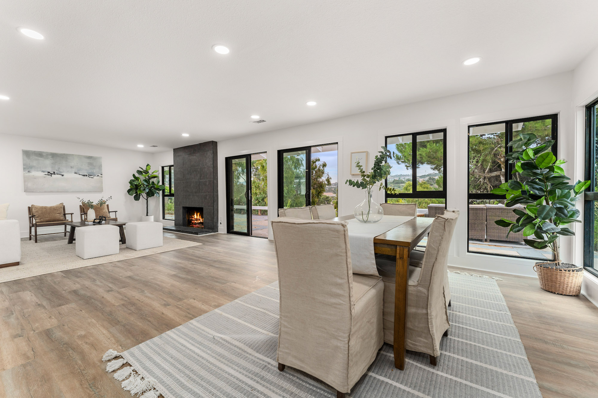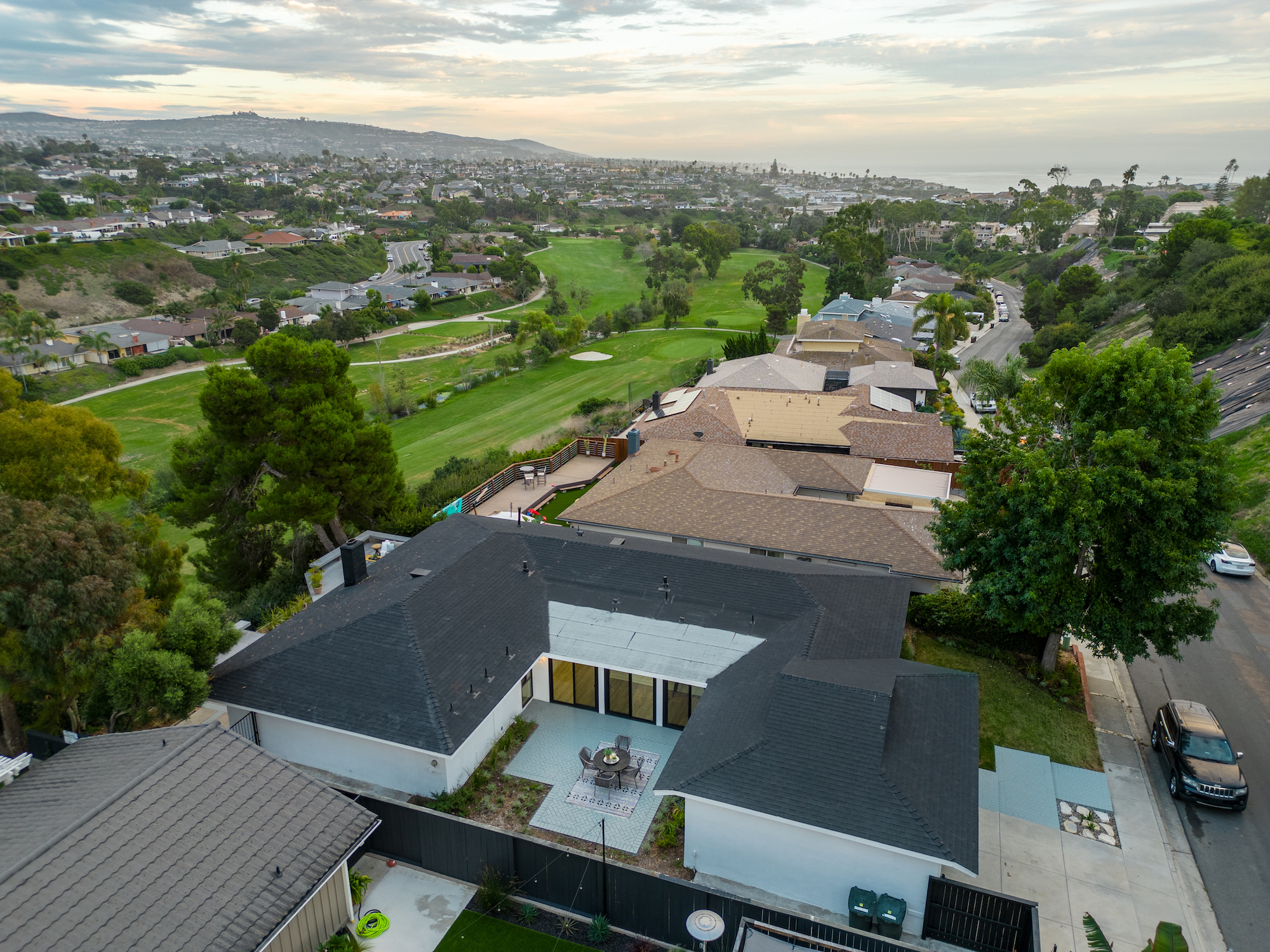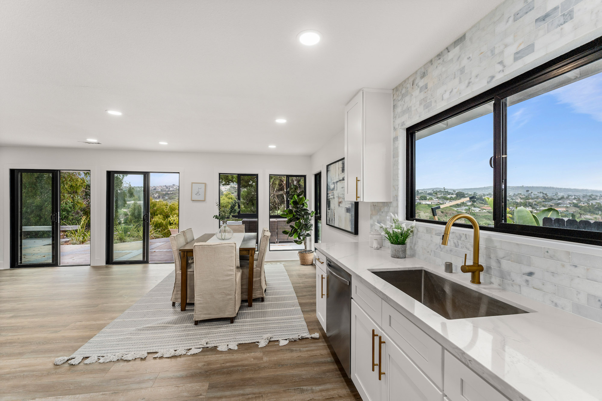 Welcome to 2966 Calle Grande Vista, a recently reimagined and luxurious coastal haven perched above the first hole of the prestigious Shorecliffs Golf Course. This stunning single-story residence redefines elegance and sophistication, offering a seamless blend of opulence and comfort in the heart of San Clemente. Upon arrival, a grand custom front door sets the tone for the extraordinary living experience that awaits. Bathed in natural light, the open-concept design effortlessly connects the family room, dining area, and kitchen, creating a spacious and inviting ambiance. No detail has been spared in this magnificent renovation. A gourmet chef's kitchen boasts new white custom cabinets, quartz counters, and a marble backsplash, complemented by state-of-the-art stainless steel appliances, including a Cosmo Range and hood. Recessed lights and brass fixtures illuminate the space, while waterproof laminate floors flow seamlessly throughout. The primary suite is a sanctuary of relaxation, featuring a walk-in closet and a lavish bath adorned with custom tile, a rain shower, and exquisite finishes. Two additional bedrooms with vaulted ceilings provide comfort and style, while the guest bath offers double sinks and modern amenities. Step outside to an enchanting backyard oasis, where sweeping ocean, mountain, and canyon views create an unforgettable backdrop for outdoor gatherings and tranquil moments. This 2,350 sqft residence resides on a single-loaded street and features a 2-car attached garage. With scraped ceilings, double pane windows, and a new fireplace with porcelain tile, no expense has been spared in making this home a true masterpiece. Live the best life in San Clemente, where coastal living meets modern luxury. Welcome home to 2966 Calle Grande Vista, your recently reimagined retreat of endless beauty and comfort.