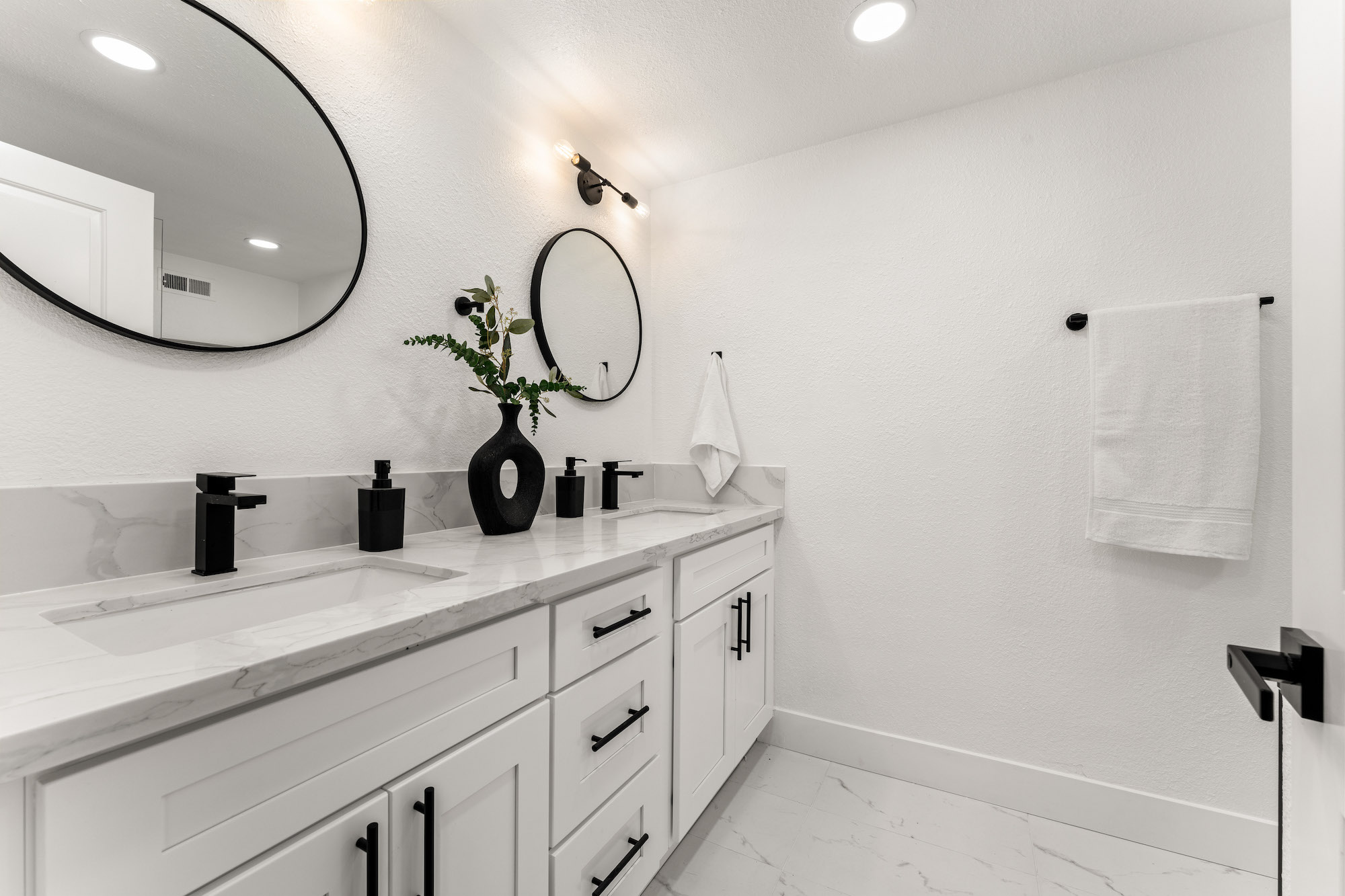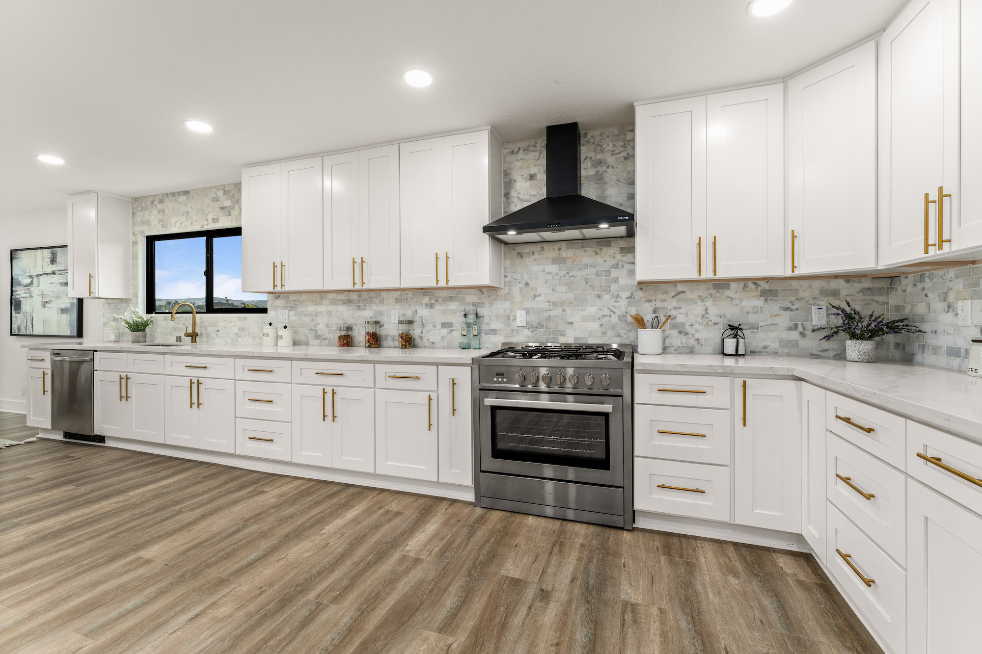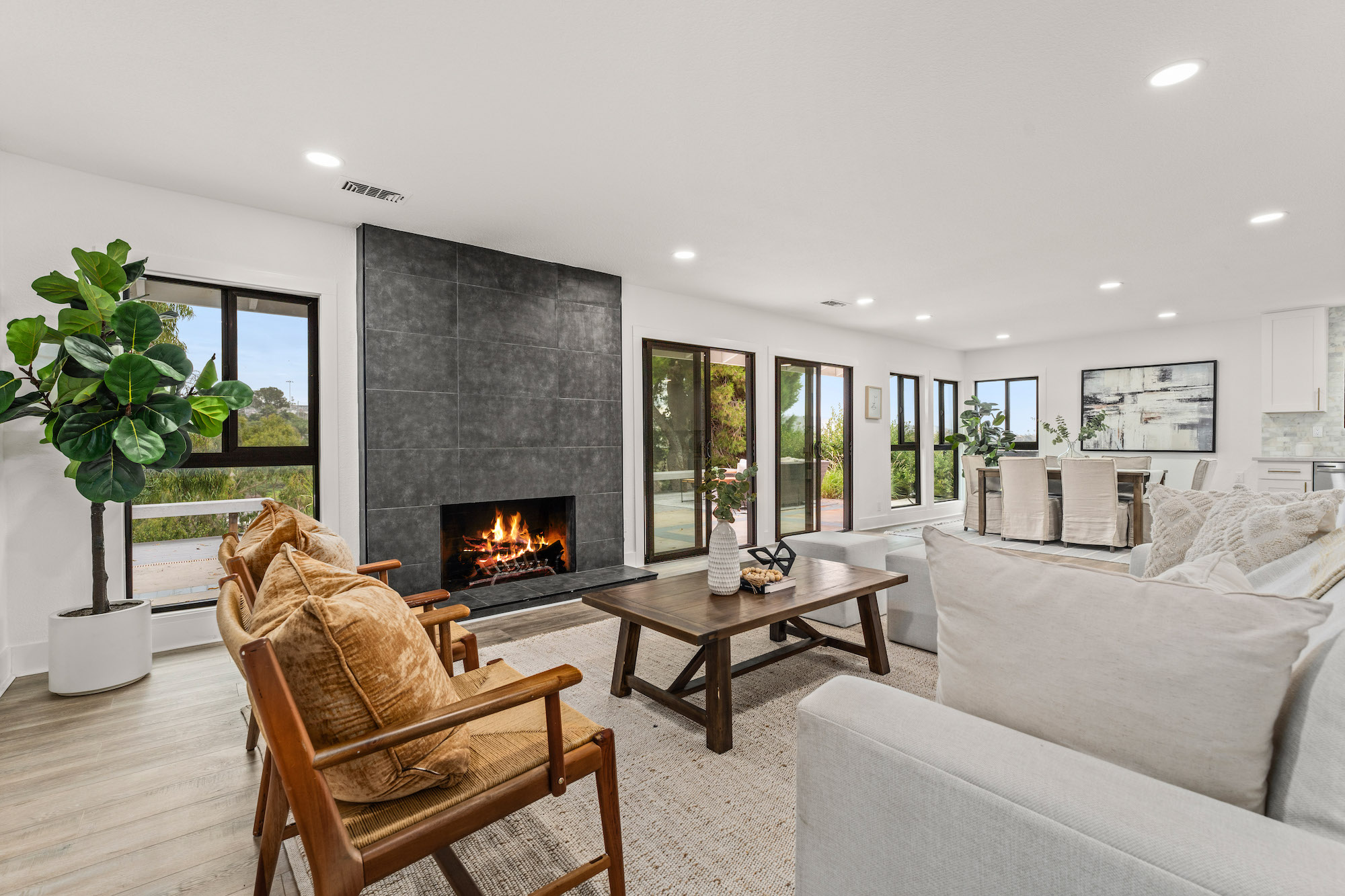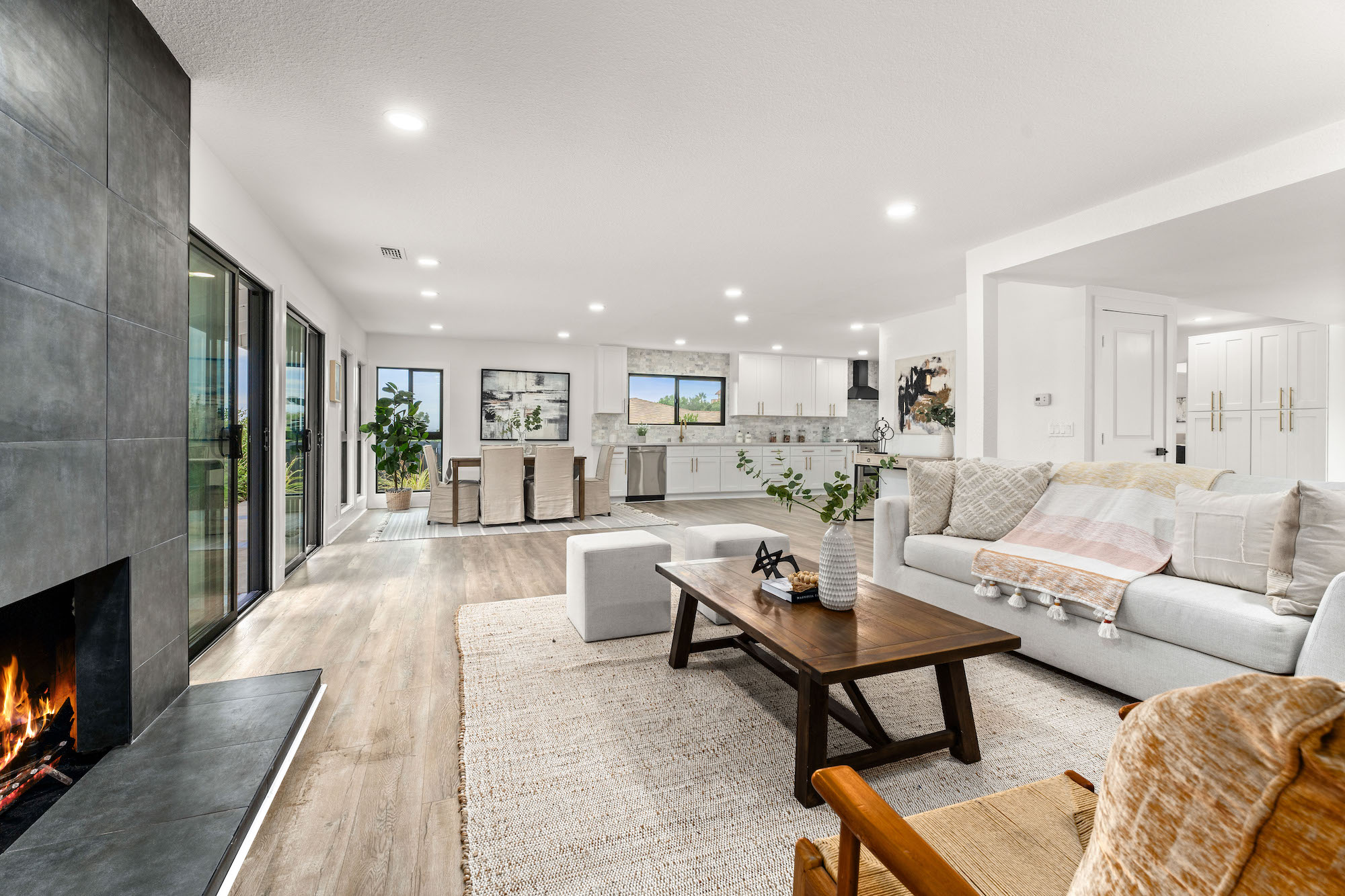 Welcome to 2966 Calle Grande Vista, a recently reimagined and luxurious coastal haven perched above the first hole of the prestigious Shorecliffs Golf Course. This stunning single-story residence redefines elegance and sophistication, offering a seamless blend of opulence and comfort in the heart of San Clemente. Upon arrival, a grand custom front door sets the tone for the extraordinary living experience that awaits. Bathed in natural light, the open-concept design effortlessly connects the family room, dining area, and kitchen, creating a spacious and inviting ambiance. No detail has been spared in this magnificent renovation. A gourmet chef's kitchen boasts new white custom cabinets, quartz counters, and a marble backsplash, complemented by state-of-the-art stainless steel appliances, including a Cosmo Range and hood. Recessed lights and brass fixtures illuminate the space, while waterproof laminate floors flow seamlessly throughout. The primary suite is a sanctuary of relaxation, featuring a walk-in closet and a lavish bath adorned with custom tile, a rain shower, and exquisite finishes. Two additional bedrooms with vaulted ceilings provide comfort and style, while the guest bath offers double sinks and modern amenities. Step outside to an enchanting backyard oasis, where sweeping ocean, mountain, and canyon views create an unforgettable backdrop for outdoor gatherings and tranquil moments. This 2,350 sqft residence resides on a single-loaded street and features a 2-car attached garage. With scraped ceilings, double pane windows, and a new fireplace with porcelain tile, no expense has been spared in making this home a true masterpiece. Live the best life in San Clemente, where coastal living meets modern luxury. Welcome home to 2966 Calle Grande Vista, your recently reimagined retreat of endless beauty and comfort.