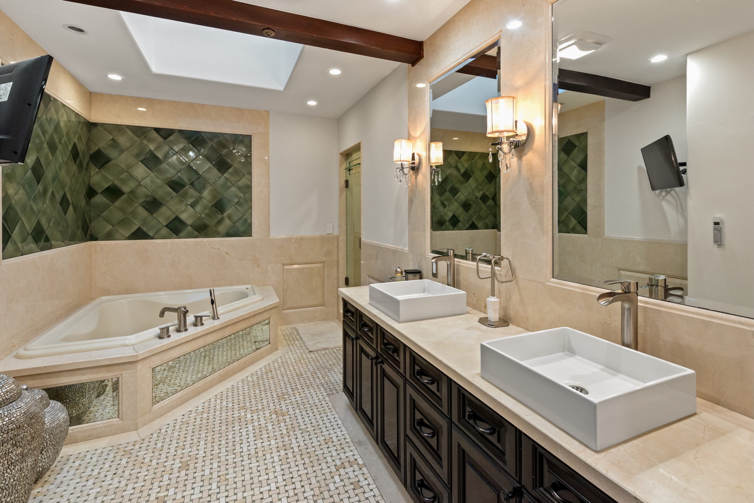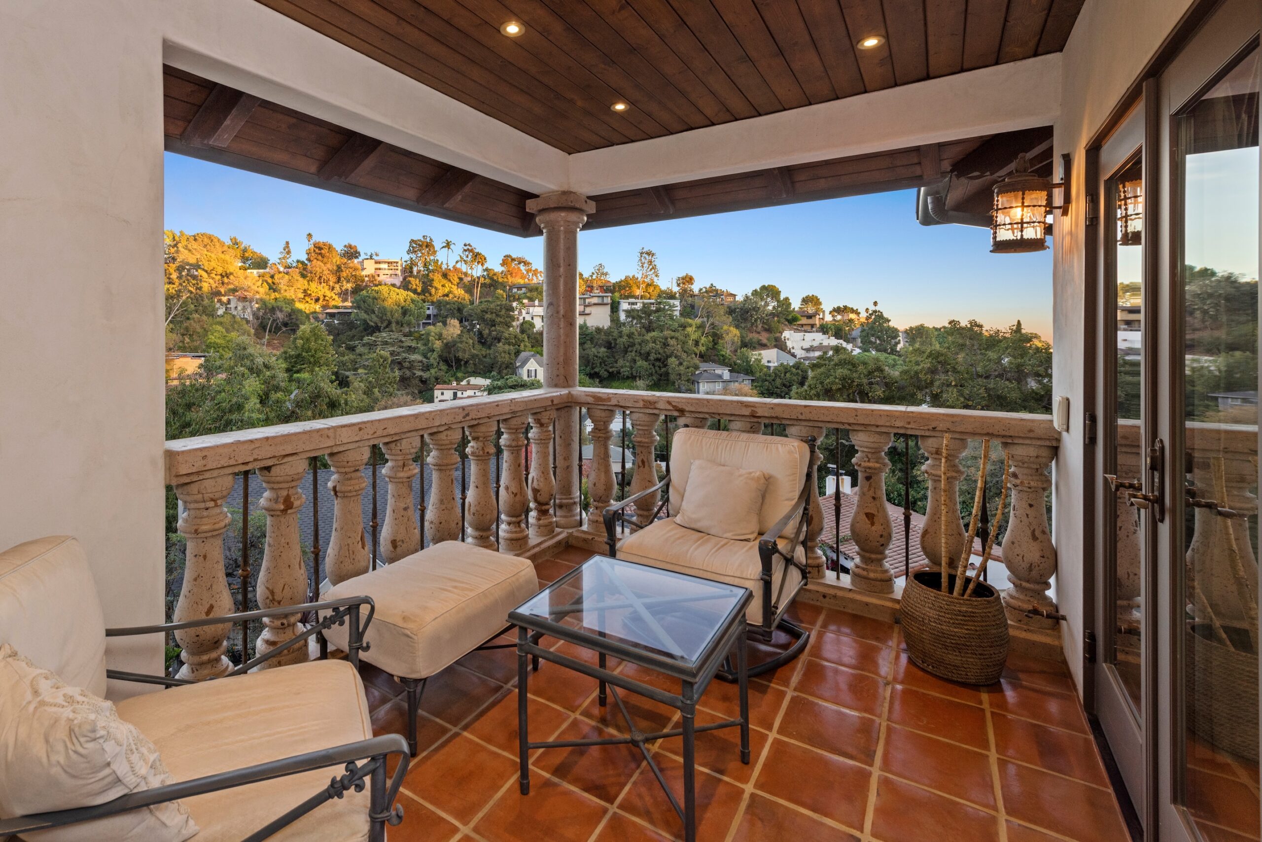 Nestled beneath the iconic Hollywood sign, this elegant four-bedroom, three-and-a-half-bathroom home in Beachwood Canyon offers a timeless blend of charm and sophistication. Set on a sprawling hillside lot, the property spans four levels and showcases serene canyon views from nearly every room. The open main level flows effortlessly from the living room to the dining area and kitchen, creating a welcoming space ideal for both relaxing and entertaining. The luxurious primary suite features a private balcony, a large sitting area, and a walk-in closet, while the spa-inspired bathroom provides a tranquil retreat. Additional highlights include a junior suite, two spacious bedrooms, and a fully equipped screening room with a bar, perfect for intimate gatherings. Practical amenities include an elevator, a three-car garage with dual access, and outdoor spaces designed for entertaining, complete with a built-in barbecue and expansive deck offering panoramic views. Conveniently located near Beachwood Cafe, Griffith Park, and Lake Hollywood, this home is a serene oasis with vintage Hollywood allure and modern conveniences.