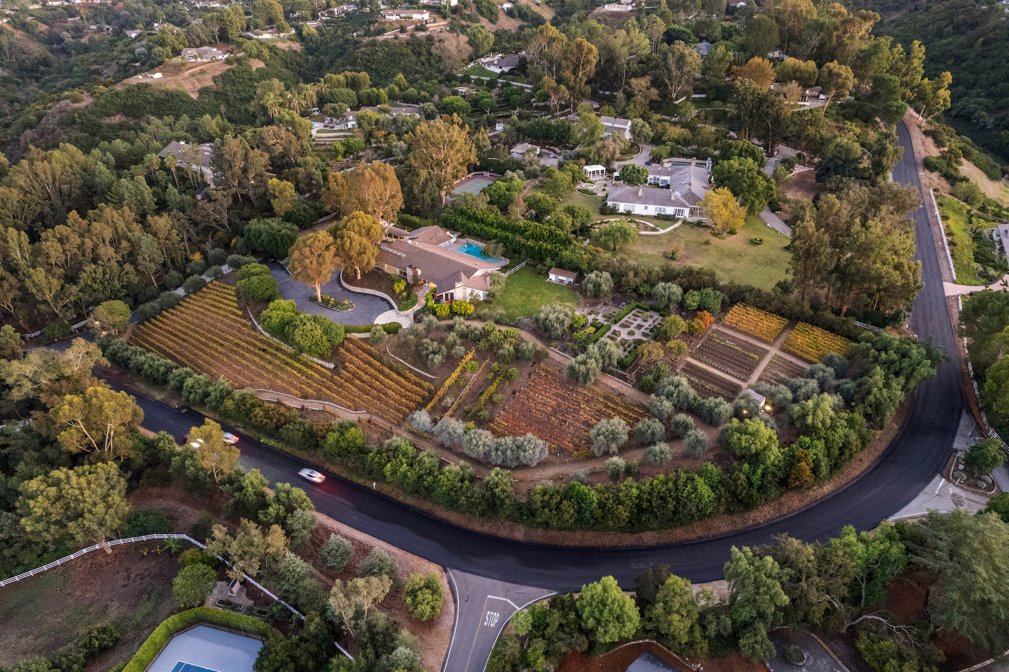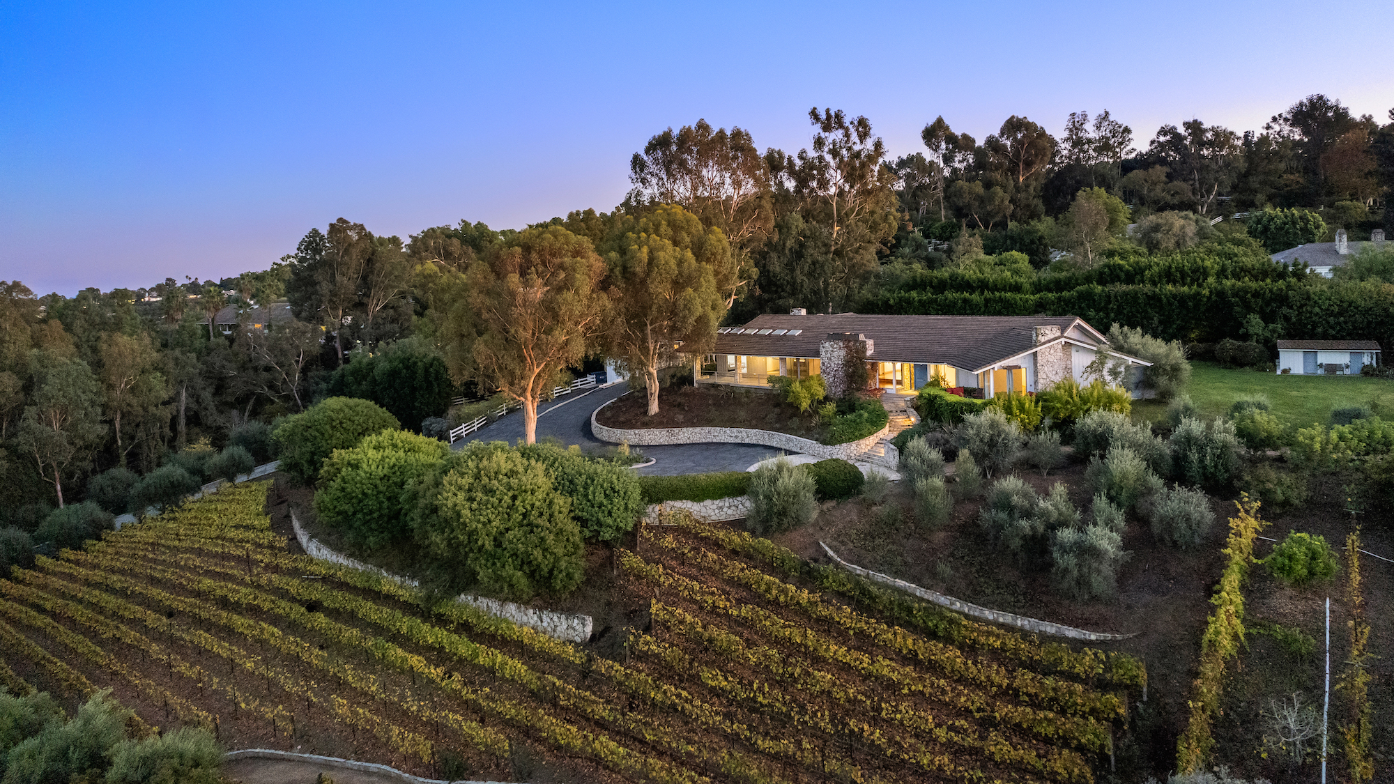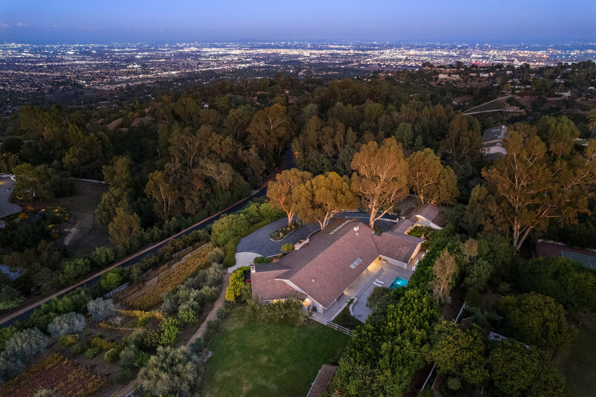 Situated on 5 sprawling acres in the heart of Rolling Hills, this expansive, private estate was built for renowned developer, Ernest Hahn as his personal residence. Featuring spectacular coastline and city lights views, the current owners planted approximately 2,500 Chardonnay and Pinot Noir vines, 85 olive trees as well as a formal herb garden and citrus orchard on the property. The grounds also include a swimming pool, spa, outdoor kitchen with pizza oven and fire pit. The main house includes 4 bedrooms plus an office, large living areas and a gourmet kitchen; walls of glass optimize the views. A spacious guest house, an oversized garage, a wine cellar and a private sports court are just a few of the other amenities. Continuously recognized as one of the safest cities in the US, the gated city of Rolling Hills has three entrances, miles of hiking and riding trails, as well as community tennis and pickleball courts. Located just minutes from South Bay beaches, downtown and Beverly Hills, Rolling Hills is located on the Palos Verdes Peninsula, which is known for its award winning schools, wonderful views and extensive horse trails.