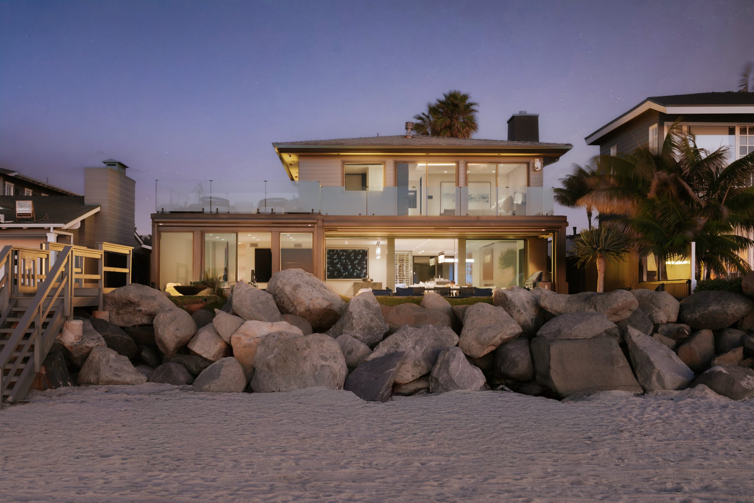 Once-in-a-lifetime opportunity to own one of the most coveted oceanfront properties in all of Del Mar. Ideally located directly on the sand within the exclusive, private gated enclave of Sandy Lane, comprised of only 12 residences. This fully remodeled coastal estate which feels like brand new construction offers five bedrooms (or four bedrooms plus office) along with a dedicated gym, set on an expansive 14,415 sq ft lot with 50 feet of unobstructed ocean frontage and direct private beach access. From the moment you enter, the sound of crashing waves and refreshing ocean breezes fill the home, with breathtaking views from nearly every room. Designed for both luxury and livability, the residence features an exceptional entertainer's bar and wine cellar, and a chef's kitchen equipped with premium stainless-steel appliances, seamlessly flowing into the family room highlighted by an oversized fireplace. The primary suite, located upstairs, captures dramatic, panoramic ocean views and opens to a private view deck. The spa-inspired primary bath delivers at every level, complete with a built-in sauna. Outdoor living is unparalleled, featuring a spacious oceanfront deck with outdoor kitchen, heaters, fire pit, and retractable shadescreating effortless indoor-outdoor living and unforgettable sunset experiences. Additional highlights include an ADU with 2 bedrooms and full bath and a 2 car garage. The sunset views are truly extraordinary.