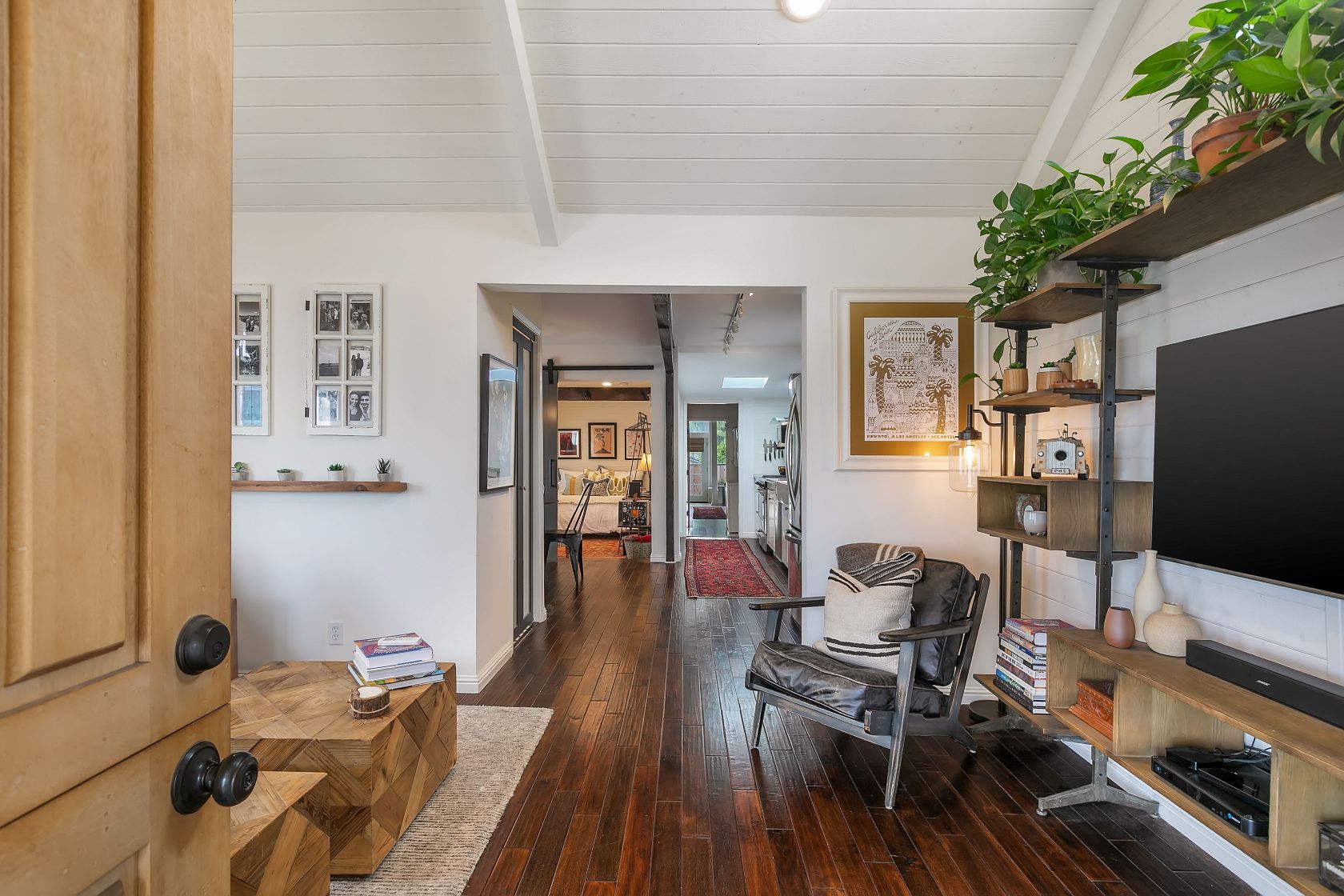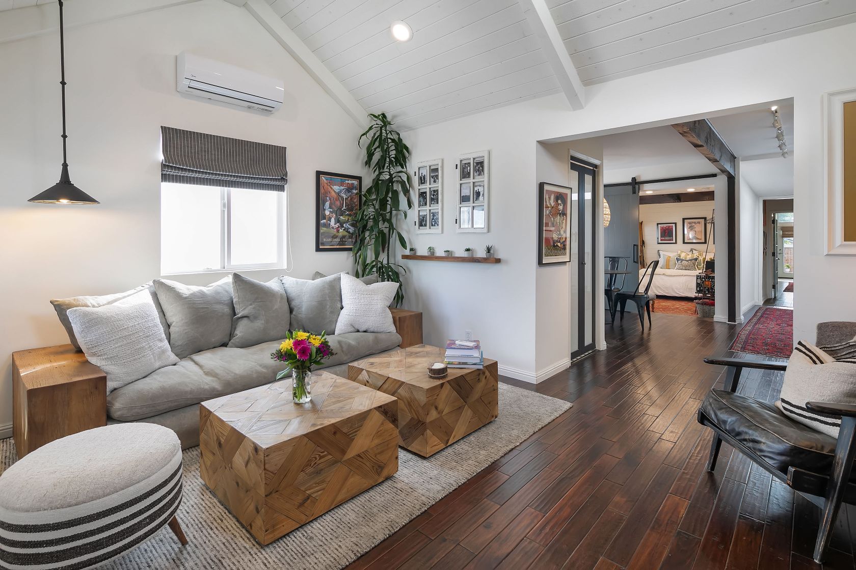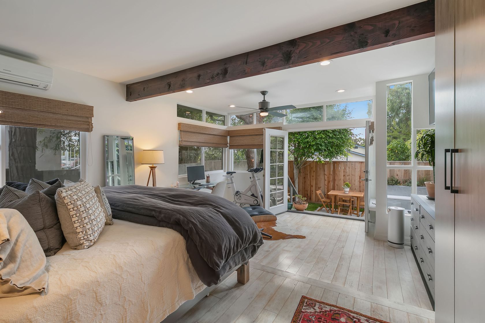 This spectacularly remodeled classic California Bungalow home in prime Santa Monica is on arguably the best walk streets in the neighborhood. Sitting just blocks from Rose Avenue restaurants and Venice beach, this private home on cul-de-sac Bentley Ct is the beach living you've been waiting for. The current owners opened the interior by moving walls and exposing the pitched roof and wooden beams to take advantage of all the natural light by use of custom skylights. The kitchen includes an oversized farmhouse sink and custom shelving. Both bathrooms have been meticulously redesigned to fit the beach lifestyle while each room has a split air-conditioning system. Walk into the sundrenched master bedroom which includes custom closets by California Closets and French doors that lead to your outdoor entertaining space. Fully equipped with a BBQ and fire pit, this is the place to kick-back and relax.