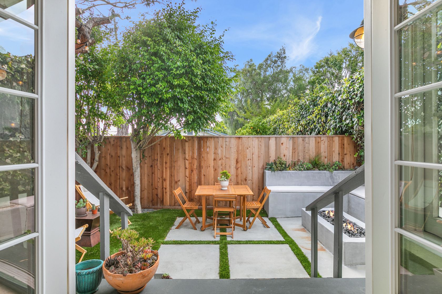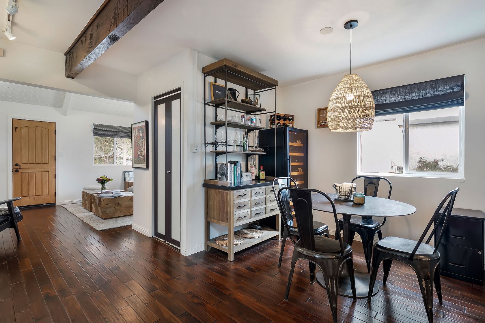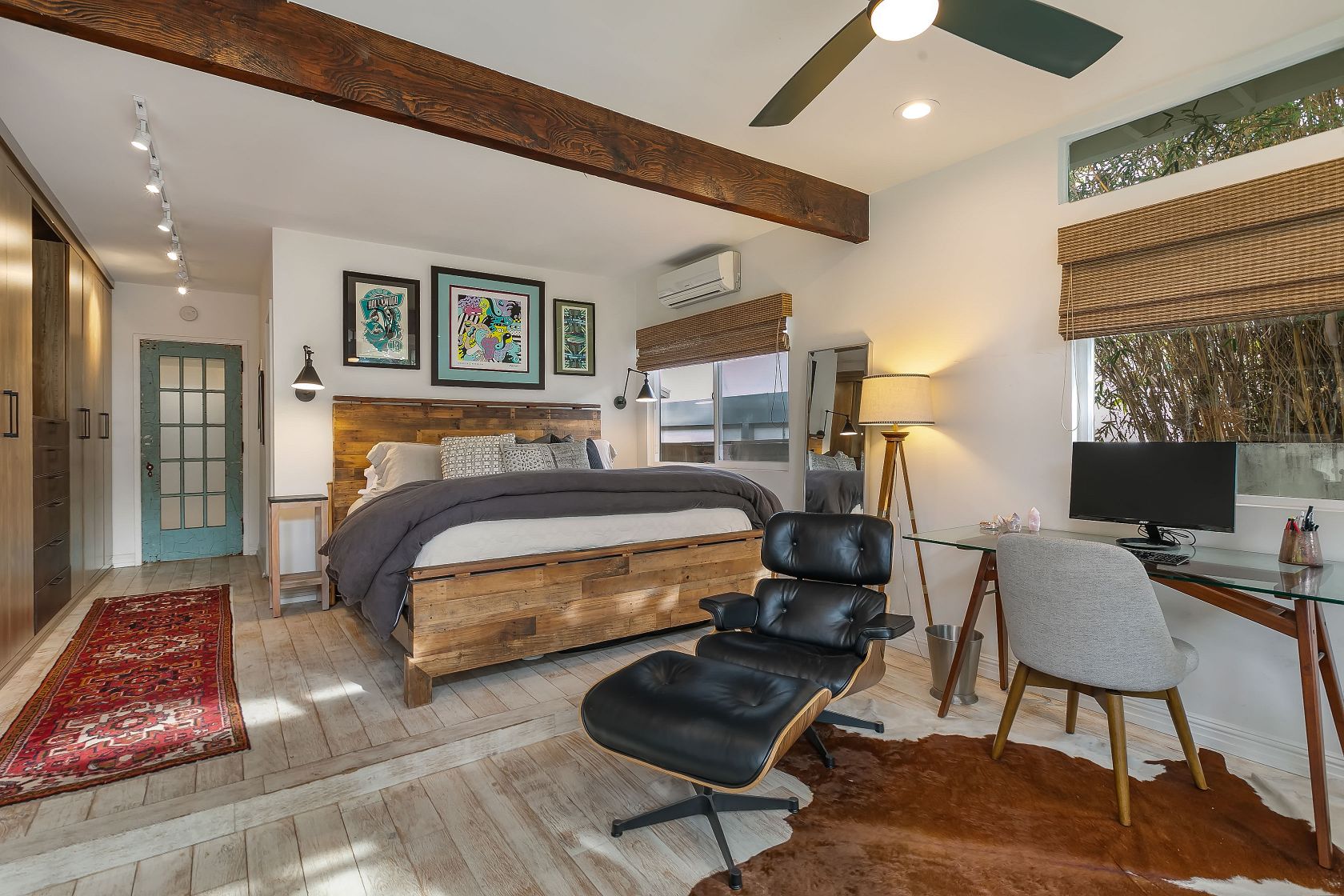 This spectacularly remodeled classic California Bungalow home in prime Santa Monica is on arguably the best walk streets in the neighborhood. Sitting just blocks from Rose Avenue restaurants and Venice beach, this private home on cul-de-sac Bentley Ct is the beach living you've been waiting for. The current owners opened the interior by moving walls and exposing the pitched roof and wooden beams to take advantage of all the natural light by use of custom skylights. The kitchen includes an oversized farmhouse sink and custom shelving. Both bathrooms have been meticulously redesigned to fit the beach lifestyle while each room has a split air-conditioning system. Walk into the sundrenched master bedroom which includes custom closets by California Closets and French doors that lead to your outdoor entertaining space. Fully equipped with a BBQ and fire pit, this is the place to kick-back and relax.
