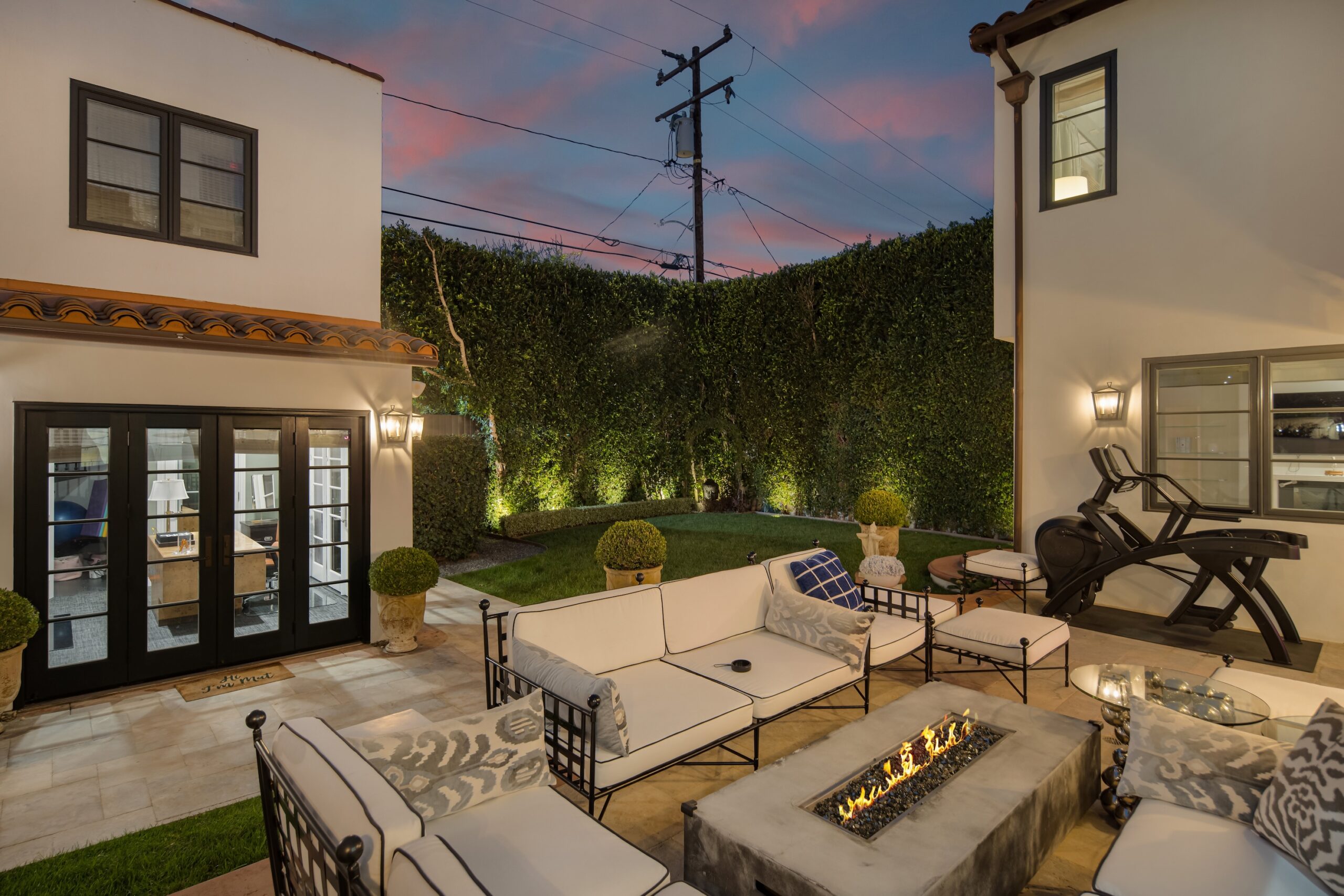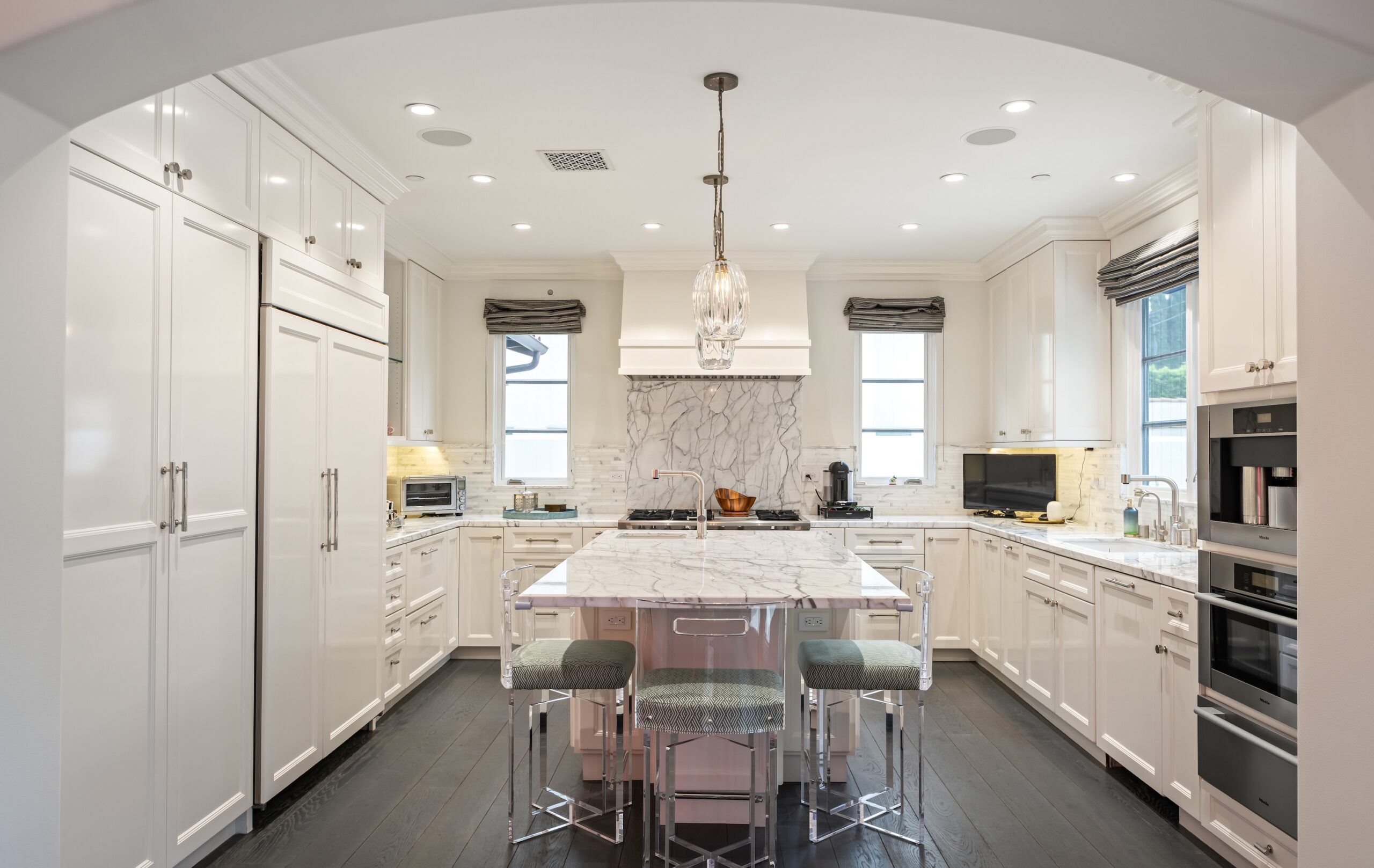 This elegantly remodeled, gated two-story Spanish-style home combines sophistication and modern functionality, featuring 4 bedrooms, 4 baths, and rich dark oak wood floors throughout. Charming arched doorways lend character, while the chef's kitchen is equipped with high-end appliances, including a Wolf cooktop, dual ovens, and a Miele coffee maker. Perfect for entertaining, the home includes a spacious formal dining room, a large living room with a cozy fireplace, and a family room that opens onto the back deck. Additional highlights include an indoor/outdoor audio system, a six-car driveway with a porte-cochere, and a custom 40-amp electric car charging station.