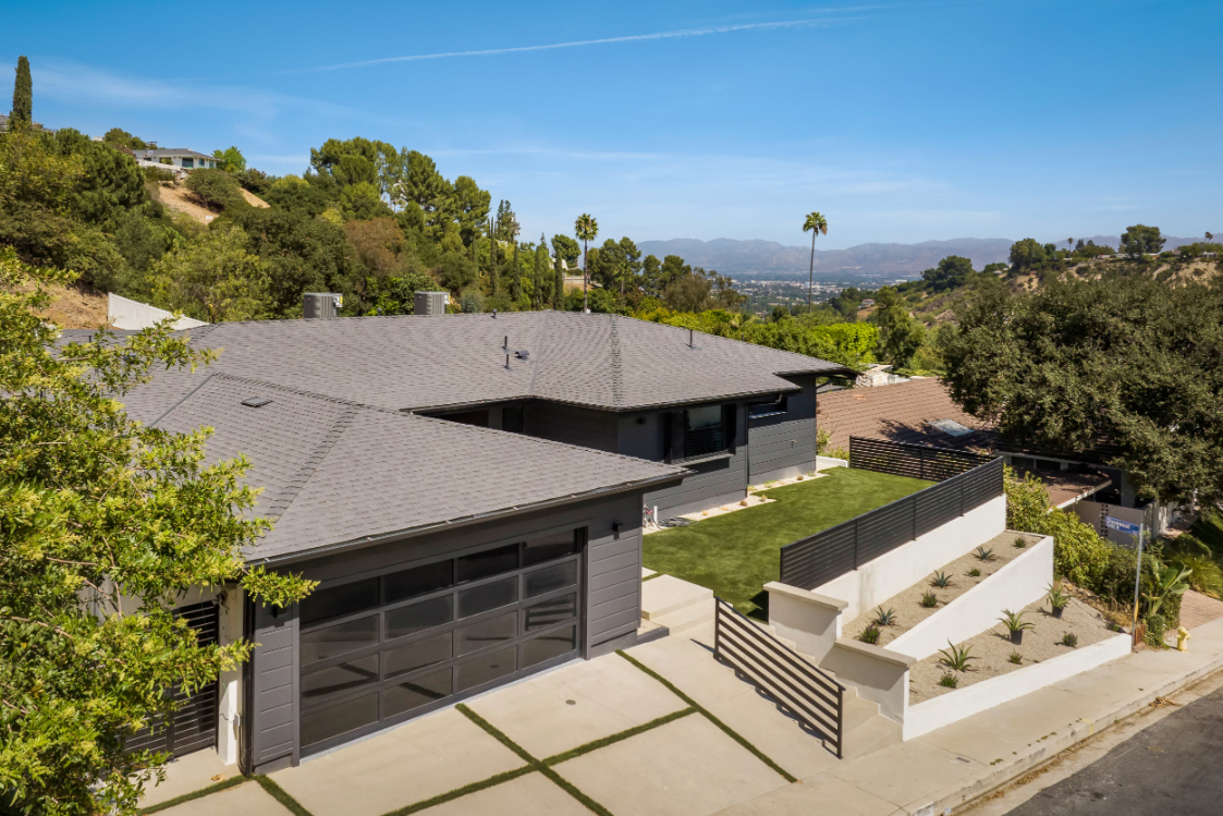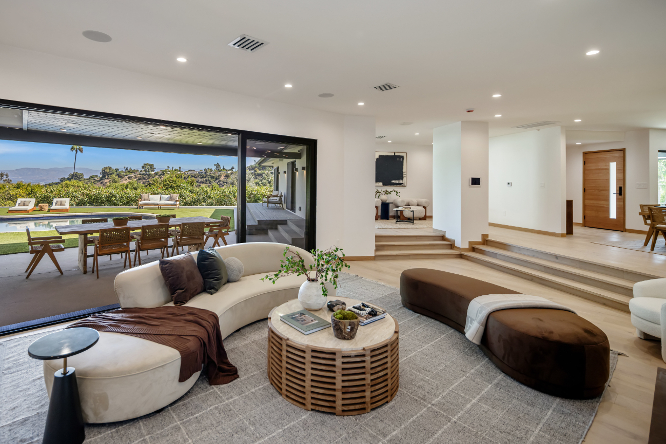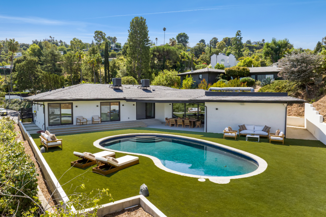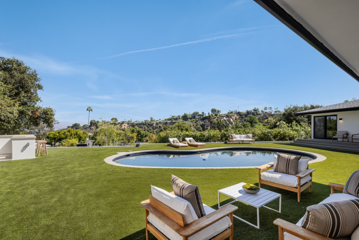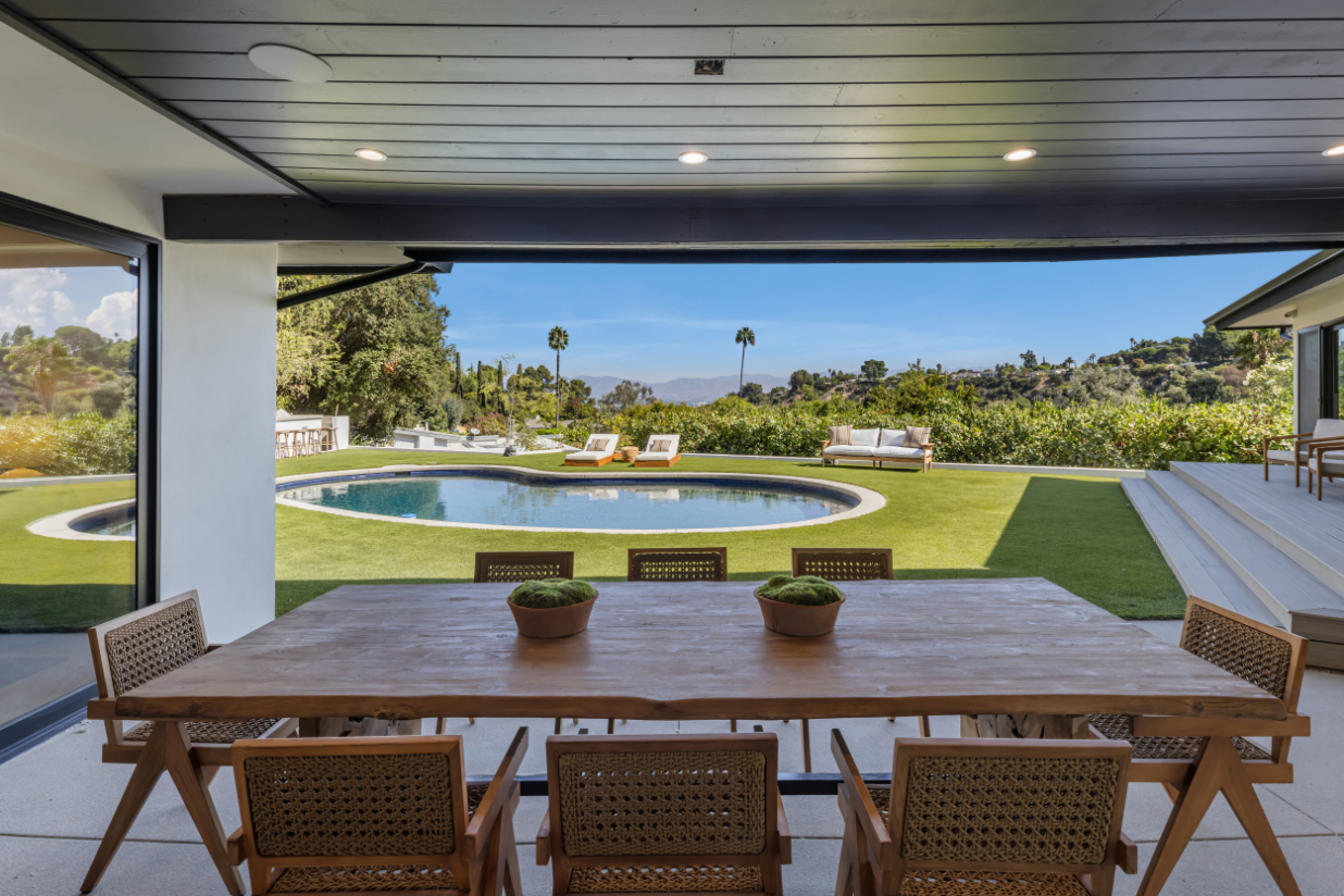 Experience an exceptionally remodeled 4-bedroom, 4-bathroom home in the coveted Sherman Oaks Hills a contemporary oasis that feels organic, bright, and effortlessly sophisticated. Thoughtfully redesigned down to the studs, the open-concept floor plan features wide-plank wood floors, custom finishes, and a seamless indoor/outdoor flow, highlighting the desired California lifestyle. At the heart of the home, a spacious chef's kitchen with oversized center island, custom cabinetry, and professional-grade appliances opens effortlessly to the dining and living areas, creating an inviting space for both everyday living and entertaining. Expansive glass doors lead to a private backyard retreat with an expansive covered patio, outdoor lounge area, al-fresco dining, and a resort-style pool framed by hillside vistas and the city lights below. Enhancing the outdoor experience is a fully built-out private kitchen, ideal for hosting a crowd, or intimate gatherings. The primary suite offers direct access to the backyard and includes a spa-like bath with soaking tub, dual vanities, and designer finishes. The landscaped and gated front yard provides additional privacy and curb appeal. Other highlights include a family room, dedicated laundry room, and attached two-car garage. Perfectly situated just minutes to the Westside, Mulholland's private school row, and within the desirable Roscomare Road Elementary district, this home blends modern luxury with convenience in one of Sherman Oaks' most sought-after settings.