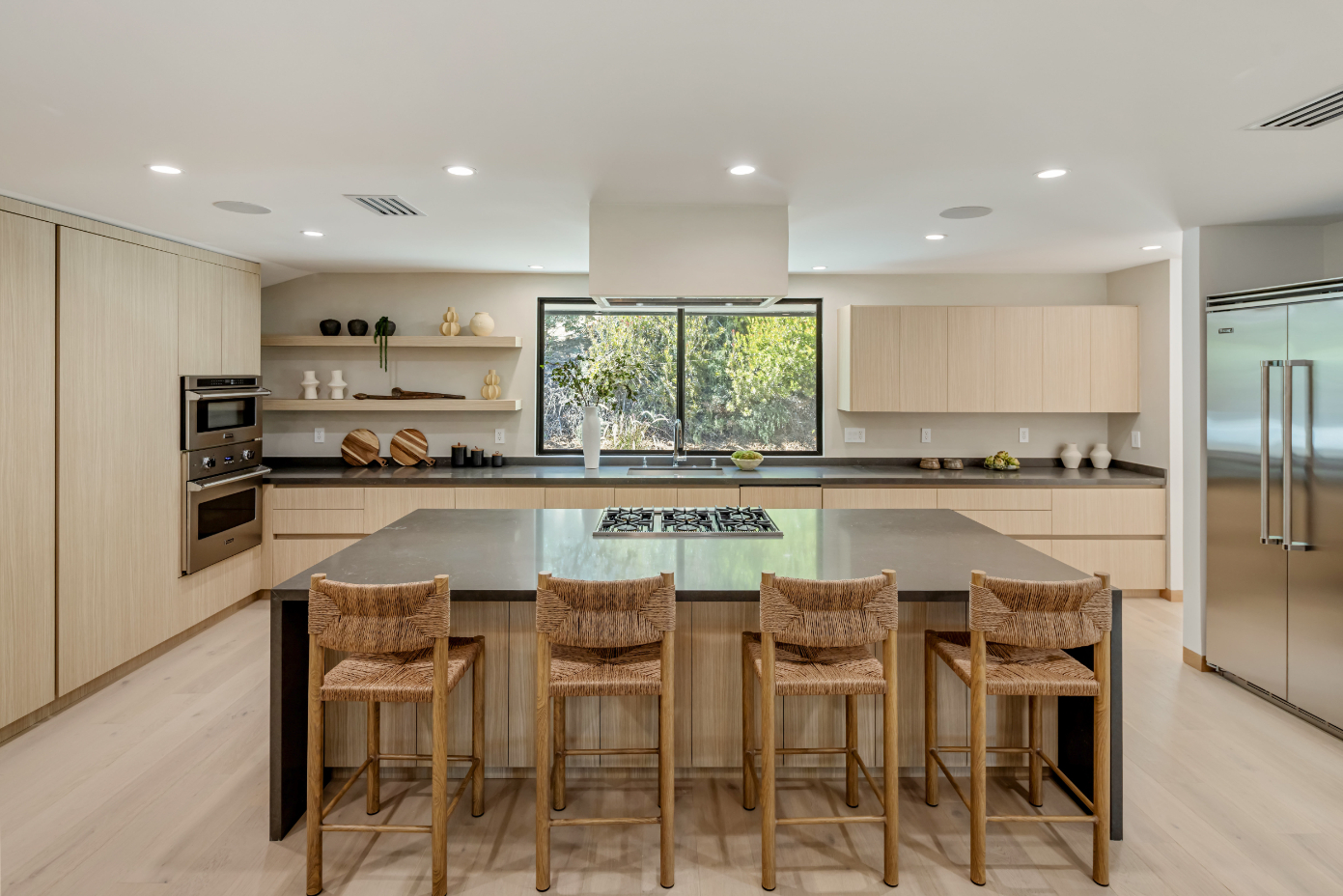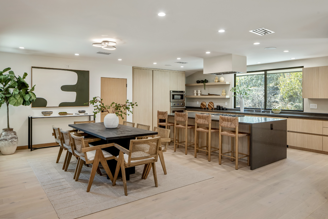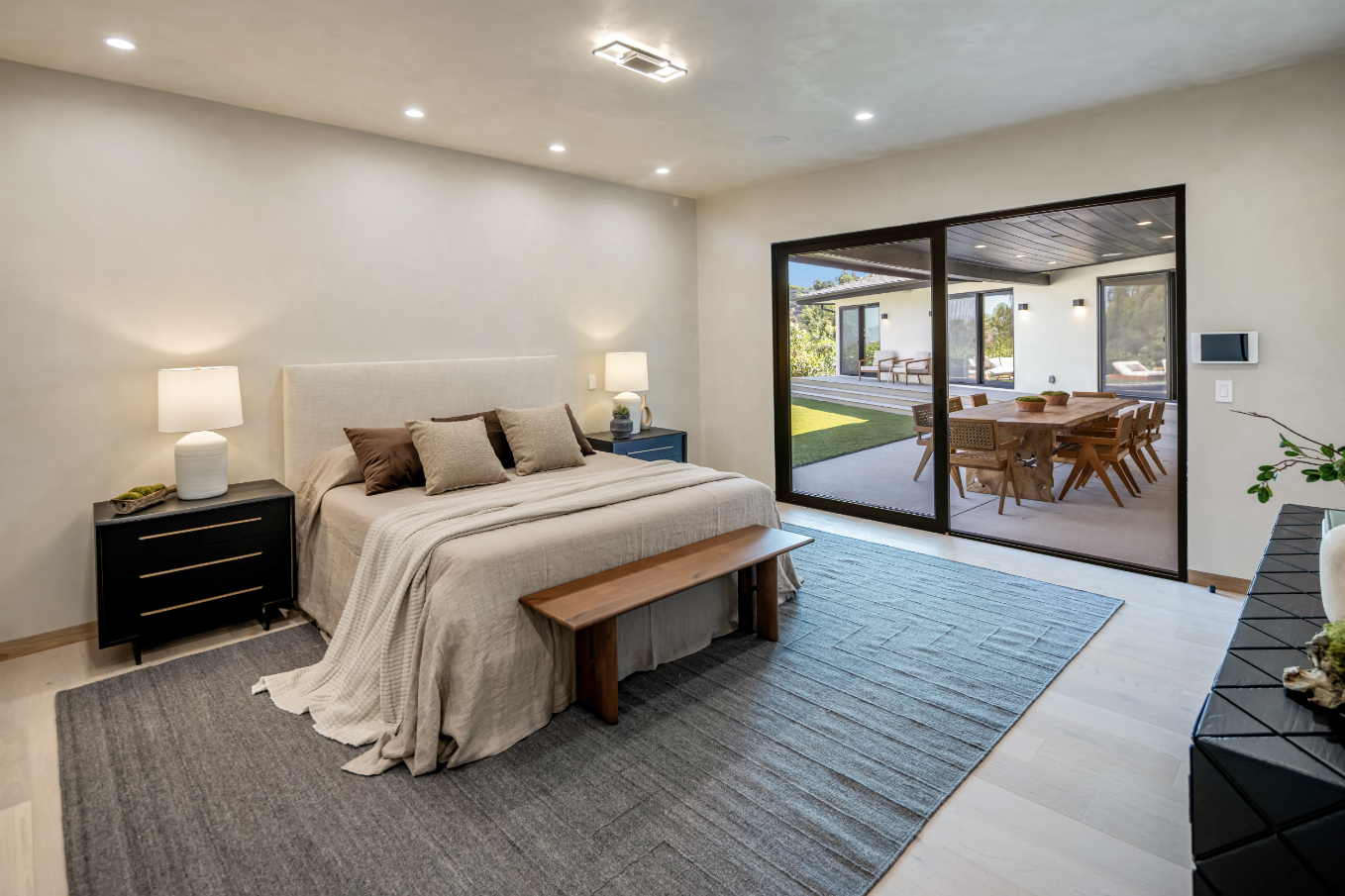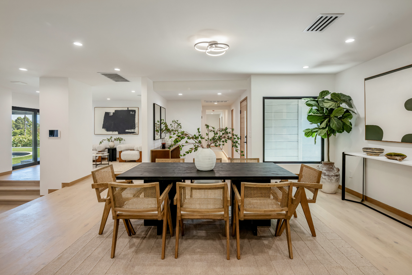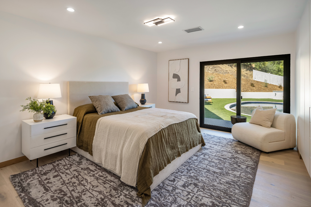 Experience an exceptionally remodeled 4-bedroom, 4-bathroom home in the coveted Sherman Oaks Hills a contemporary oasis that feels organic, bright, and effortlessly sophisticated. Thoughtfully redesigned down to the studs, the open-concept floor plan features wide-plank wood floors, custom finishes, and a seamless indoor/outdoor flow, highlighting the desired California lifestyle. At the heart of the home, a spacious chef's kitchen with oversized center island, custom cabinetry, and professional-grade appliances opens effortlessly to the dining and living areas, creating an inviting space for both everyday living and entertaining. Expansive glass doors lead to a private backyard retreat with an expansive covered patio, outdoor lounge area, al-fresco dining, and a resort-style pool framed by hillside vistas and the city lights below. Enhancing the outdoor experience is a fully built-out private kitchen, ideal for hosting a crowd, or intimate gatherings. The primary suite offers direct access to the backyard and includes a spa-like bath with soaking tub, dual vanities, and designer finishes. The landscaped and gated front yard provides additional privacy and curb appeal. Other highlights include a family room, dedicated laundry room, and attached two-car garage. Perfectly situated just minutes to the Westside, Mulholland's private school row, and within the desirable Roscomare Road Elementary district, this home blends modern luxury with convenience in one of Sherman Oaks' most sought-after settings.