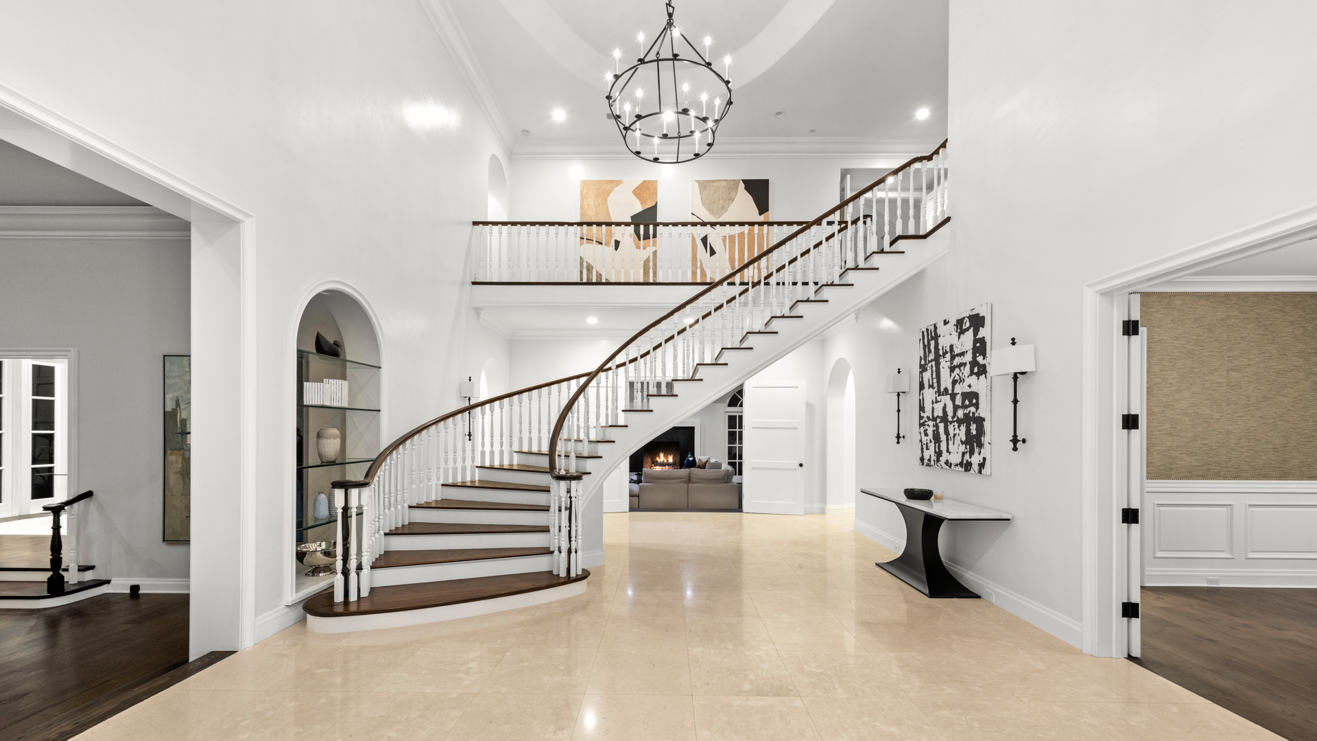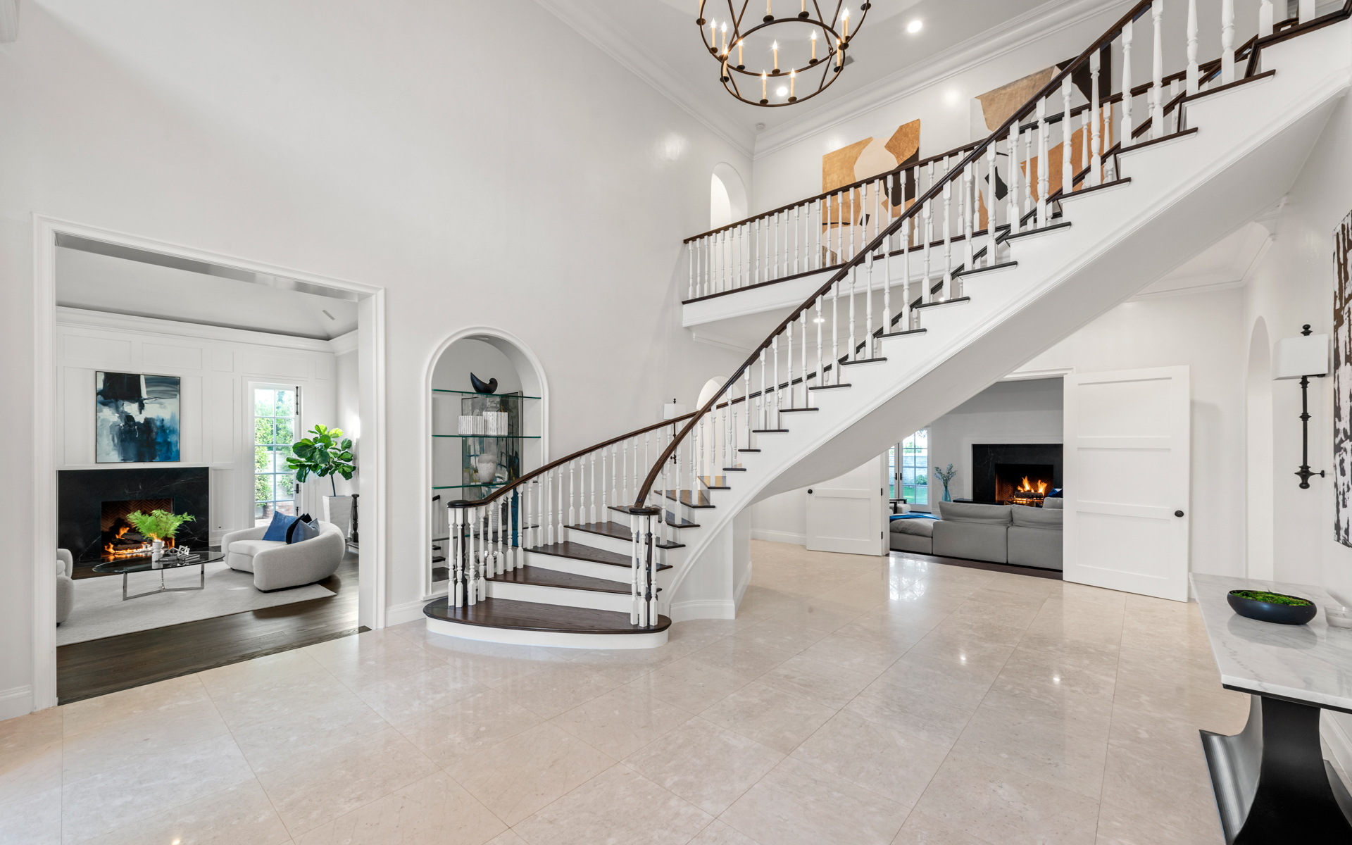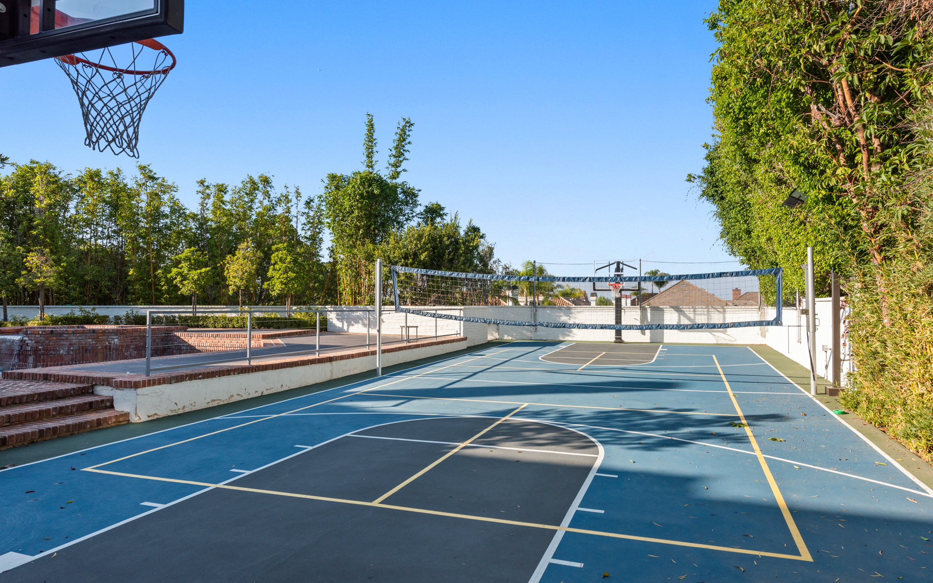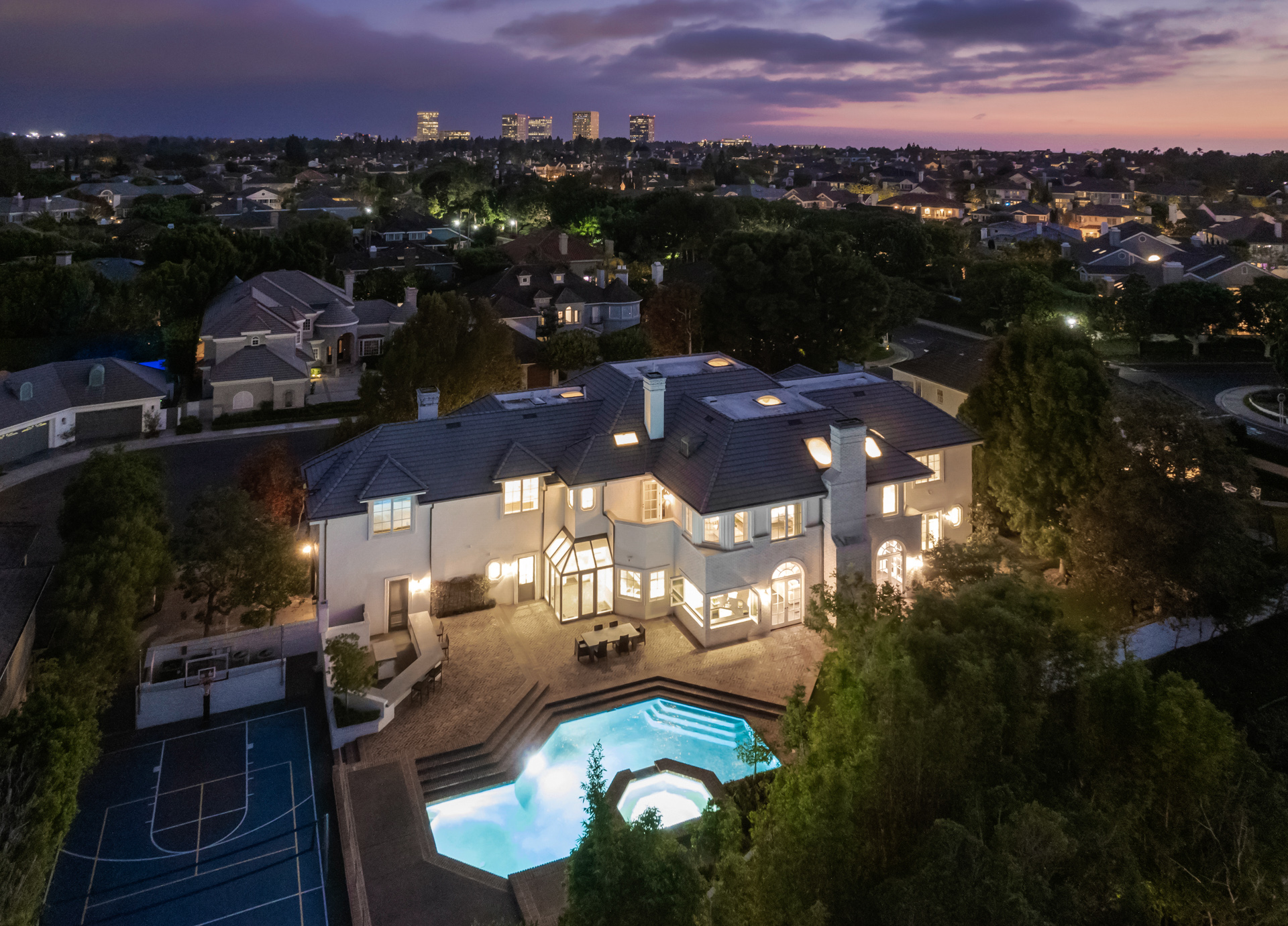 Located in the heart of Newport Beach in the prestigious Belcourt gated community sits this impressive, one-of-a-kind estate at the end of a quiet cul-de-sac. Set on over half an acre of well-manicured grounds, the home boasts an impressive ~8,200sf of livable space with 5 bedrooms and 6.5 bathrooms. A dramatic two-story foyer instantly captivates your attention toward an architecturally profound floating staircase. The property offers a well thought out and conducive floor plan designed for those that appreciate quality and comfort. The main level showcases an impressive formal living room, office, family room with a built-in bar equipped with folding glass paneled windows, formal dining room, and a gourmet chef's kitchen that features top-of-the-line appliances, an expansive center island, butler's pantry, and a breakfast room with tons of bright, natural light. Glide up to the second level where you can find three additional ensuite bedrooms, a spacious bonus room, and the primary suite that includes a fireplace, attached deck overlooking the impressive grounds, and a spa-like bathroom with two separate restrooms, a sauna, and palatial walk-in closet. The resort-style backyard includes a glistening pool and spa, outdoor kitchen and BBQ area, full basketball and volleyball court, and a beautifully manicured yard for endless entertaining. Recent upgrades include new oak and marble flooring, new custom carpets in bedrooms, solid wood paneling with tasteful accent walls done with custom craftsmanship, designer counter tops, designer backsplash, premium quality appliances and brilliant chandeliers.