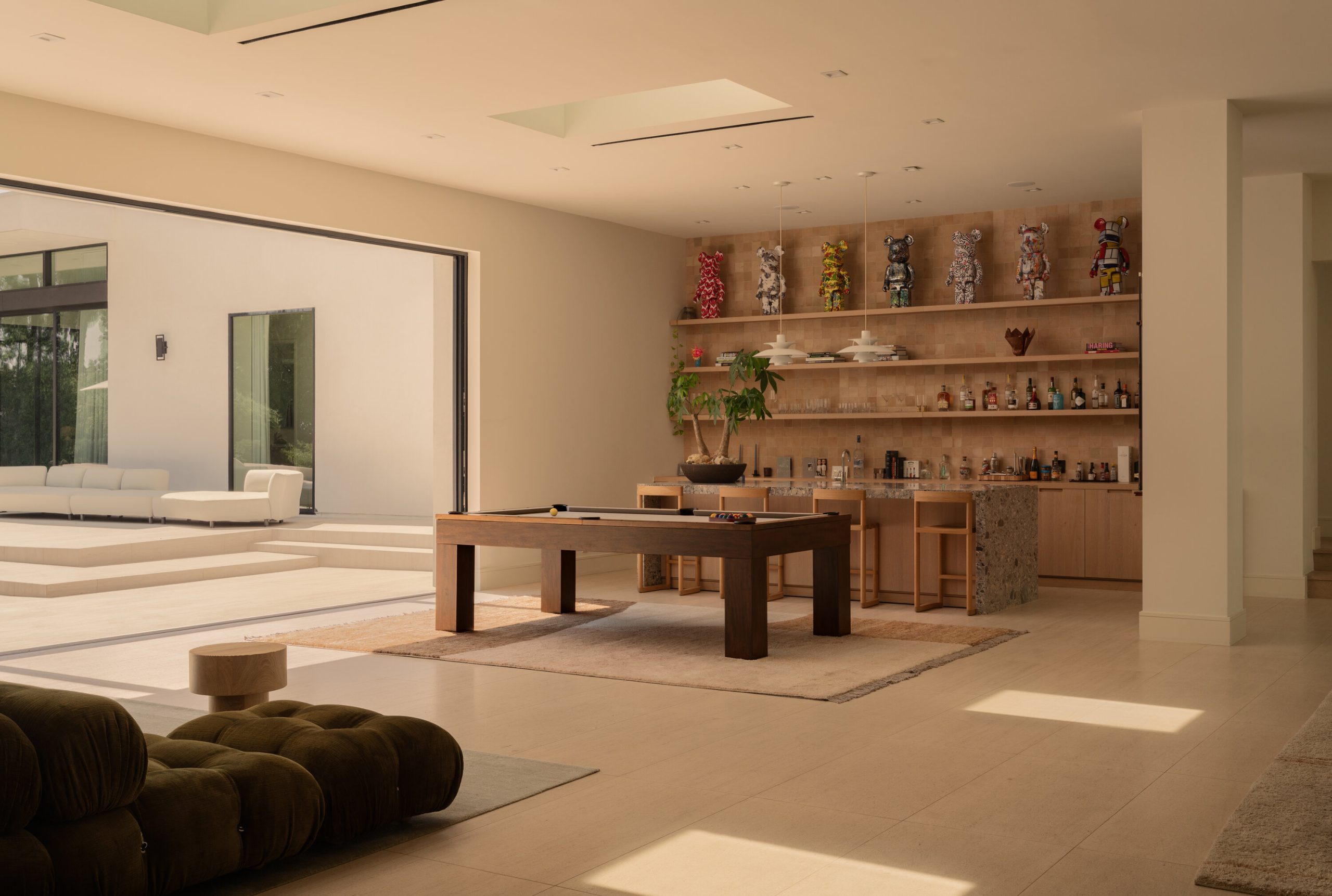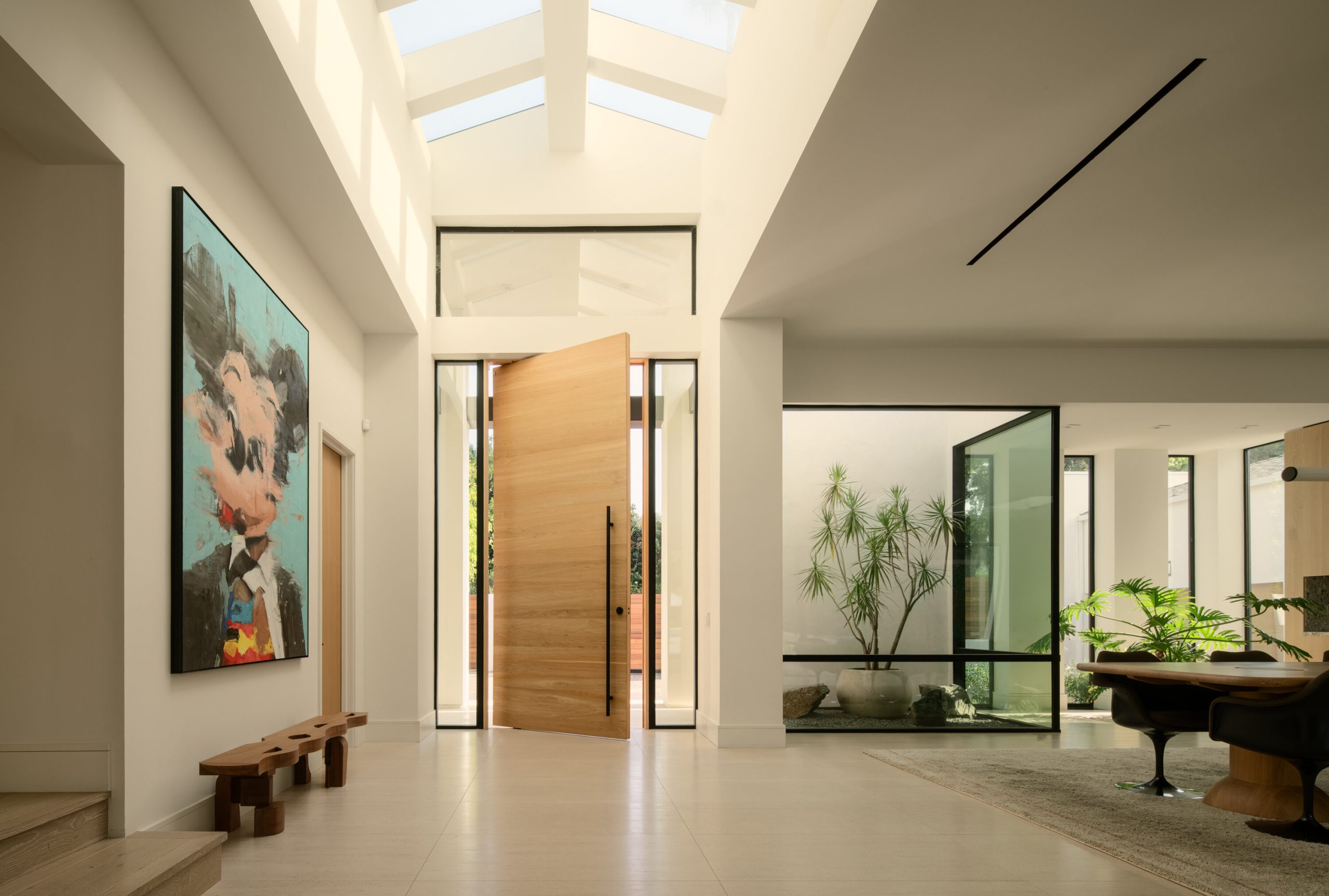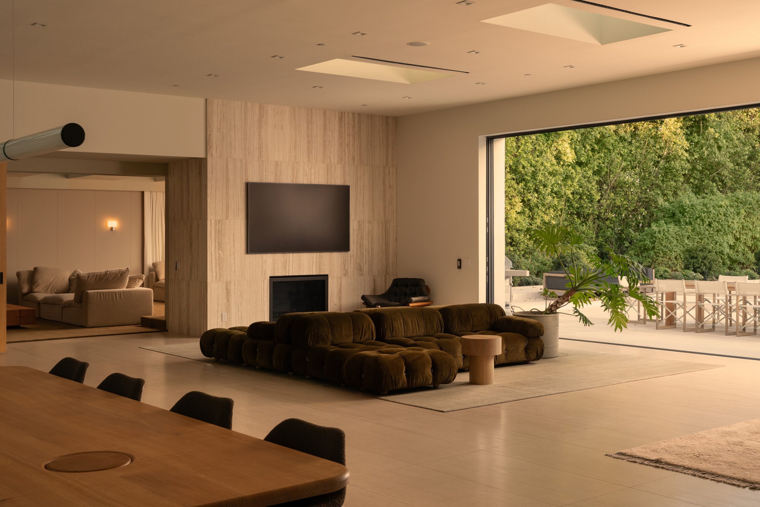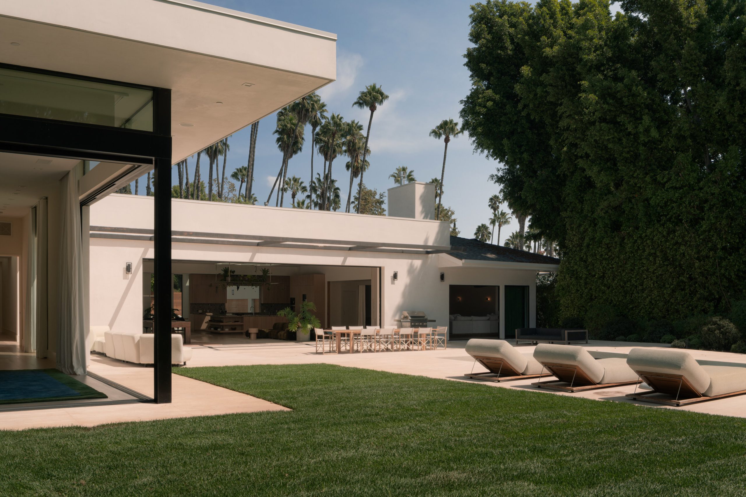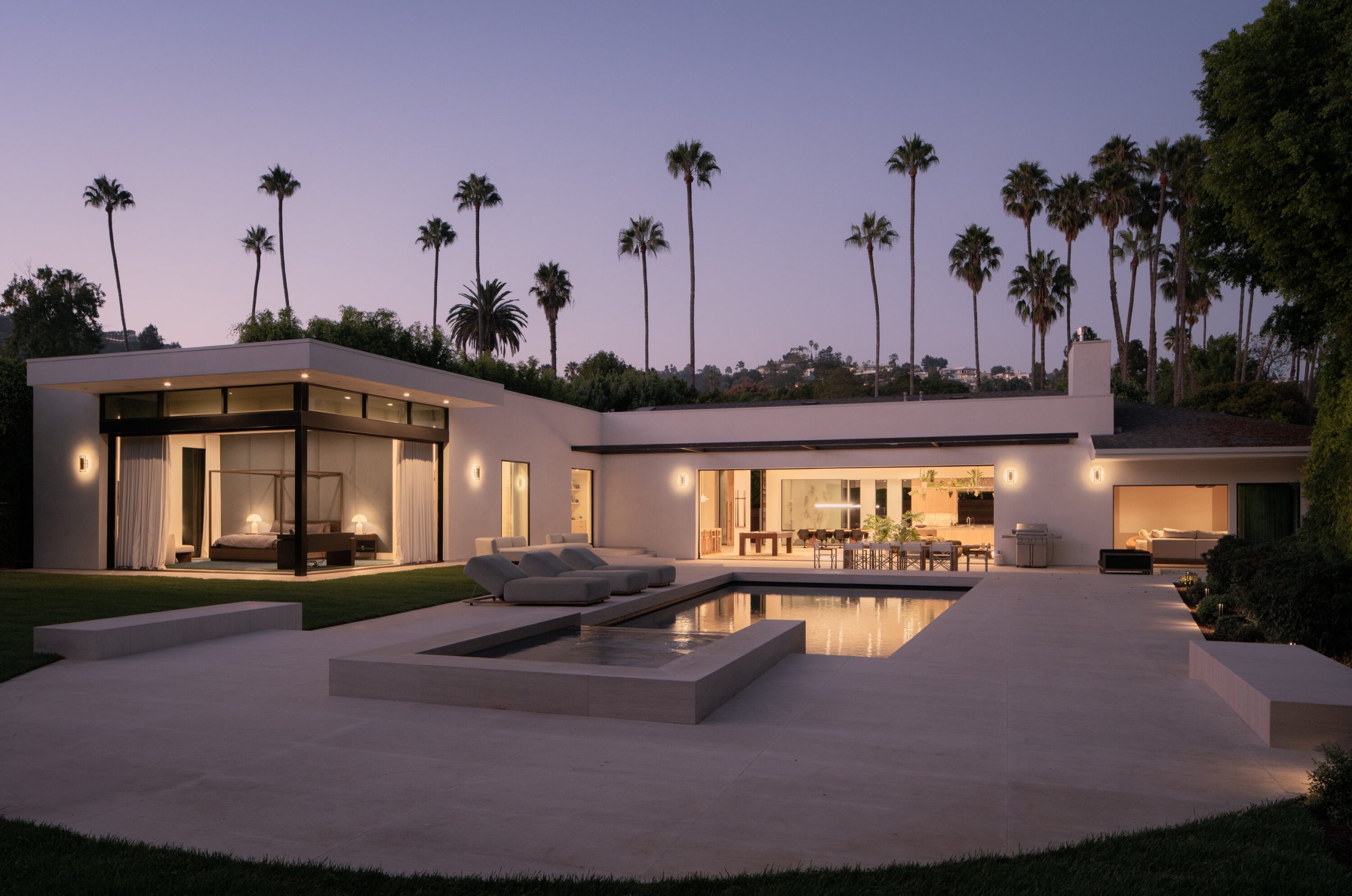 Located in the most prime section of Beverly Hills behind private gates on over half an acre of flat, fully usable land, this single-story contemporary residence blends architectural character with warm, livable design. Soaring 12-foot ceilings and skylights throughout create an open, sunlit flow from the kitchen to the family room, anchored by a wet bar and floor-to-ceiling pocket doors that open seamlessly to the grounds. The home's four bedrooms include a dramatic primary suite with retractable glass walls overlooking the pool and lush landscaping cultivating an effortless indoor-outdoor connection that defines the California lifestyle. The pool and spa serve as the centerpiece of the outdoor living space, offering a tranquil backdrop for daytime lounging and evening gatherings. Designed for both everyday living and entertaining, the home features a professional movie theater with stadium seating, a custom bar, and multiple outdoor gathering areas framed by mature trees for total privacy. Additional highlights include a 3-car garage, ample guest parking, and an exterior carport for security. At twilight, the property glows with its modern lines and layered landscape lighting creating a resort-like ambiance in the heart of Beverly Hills.