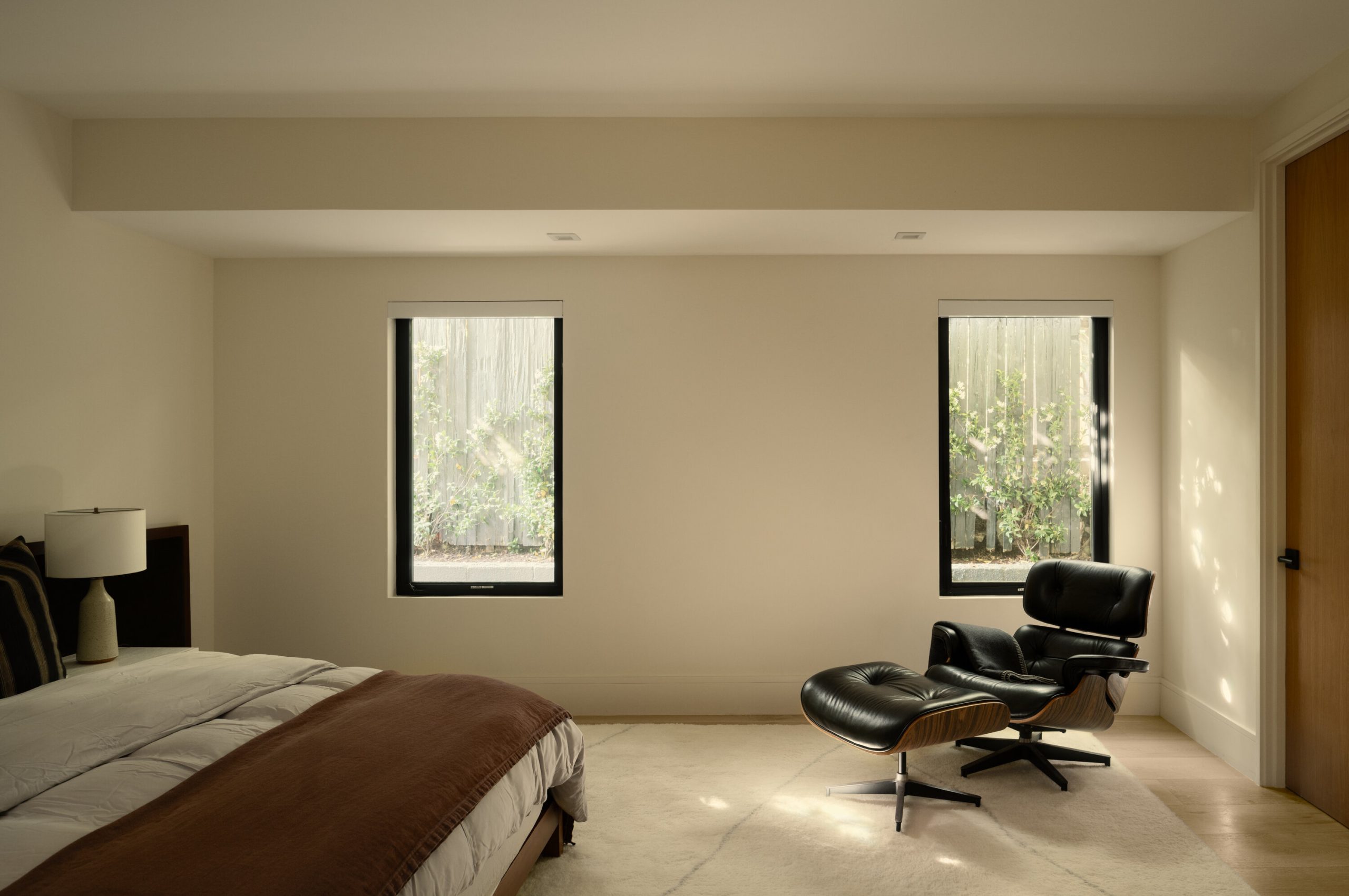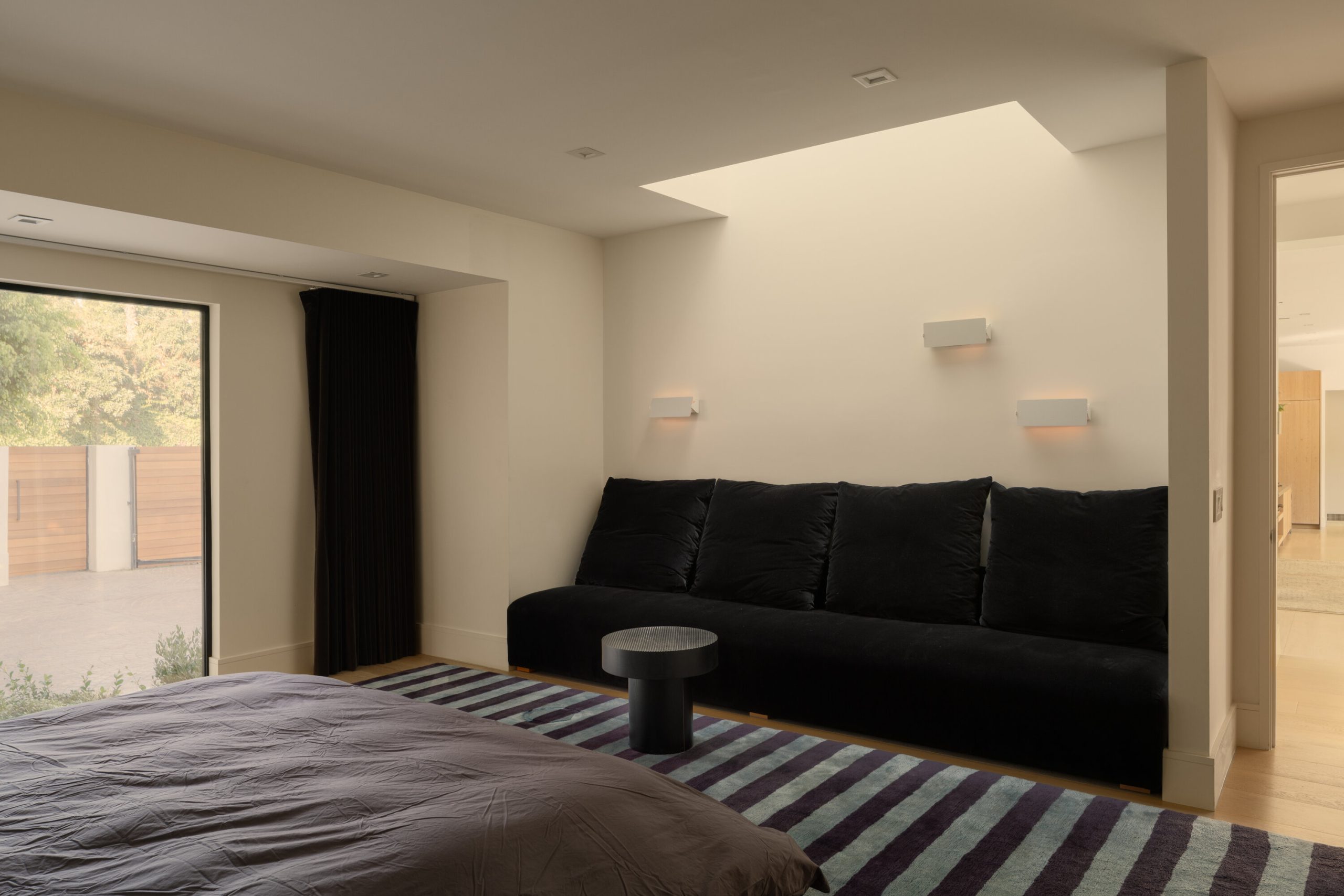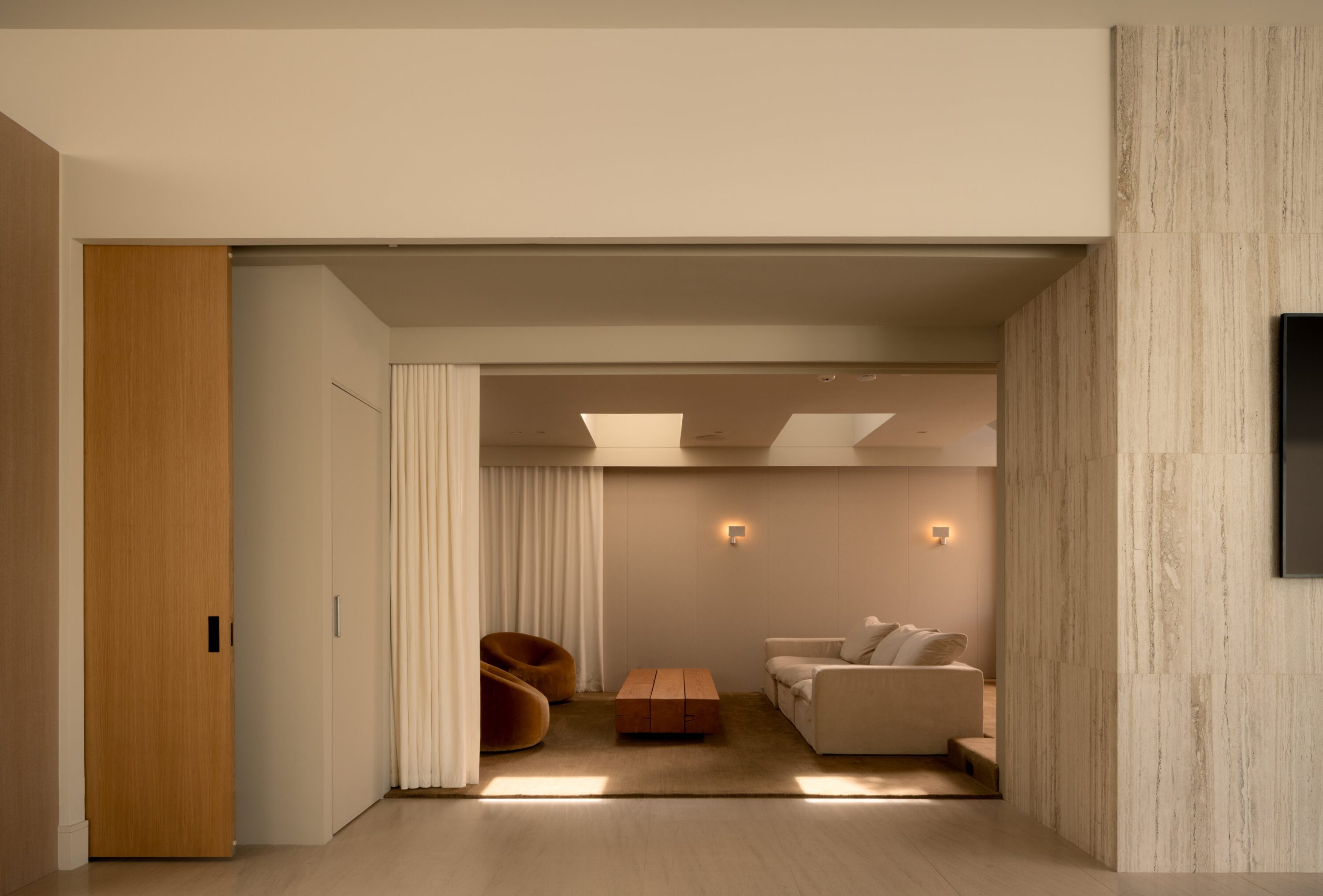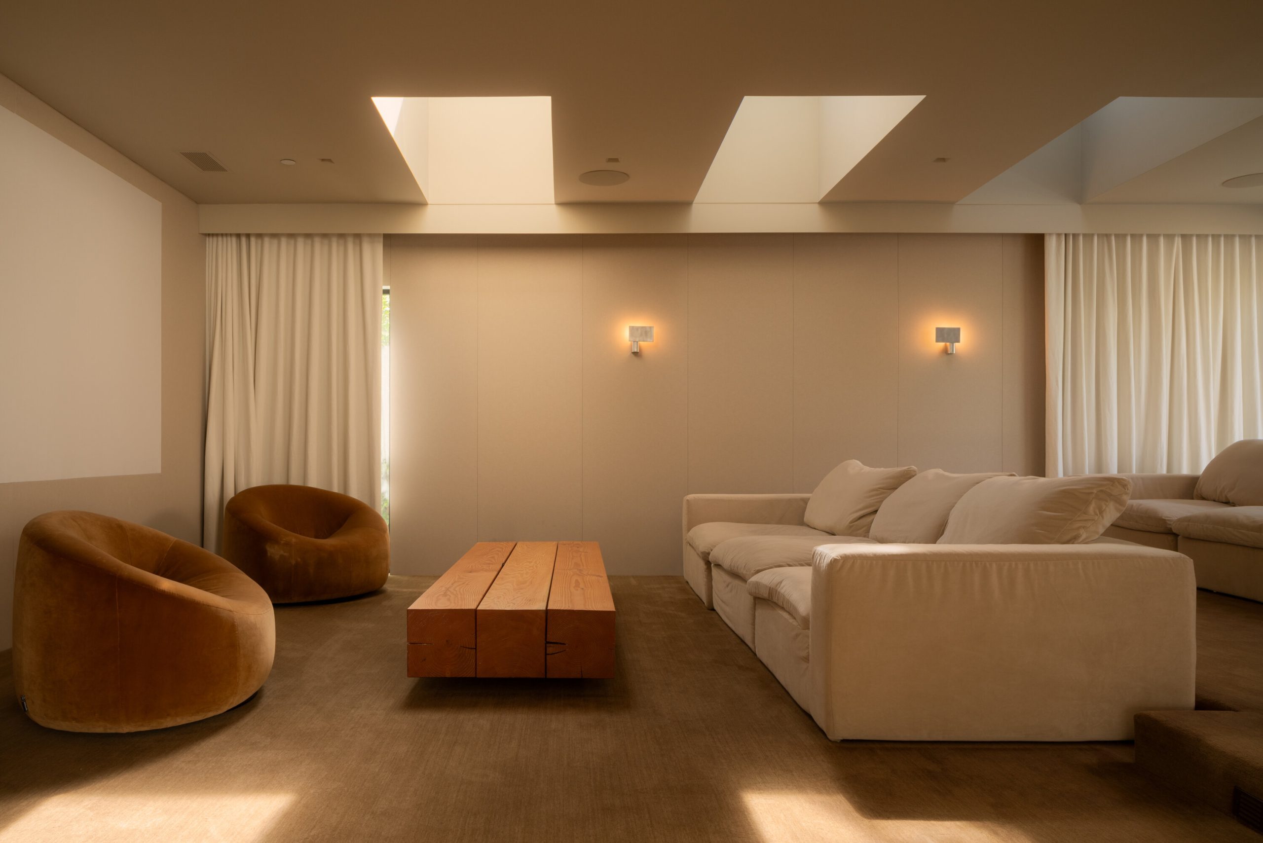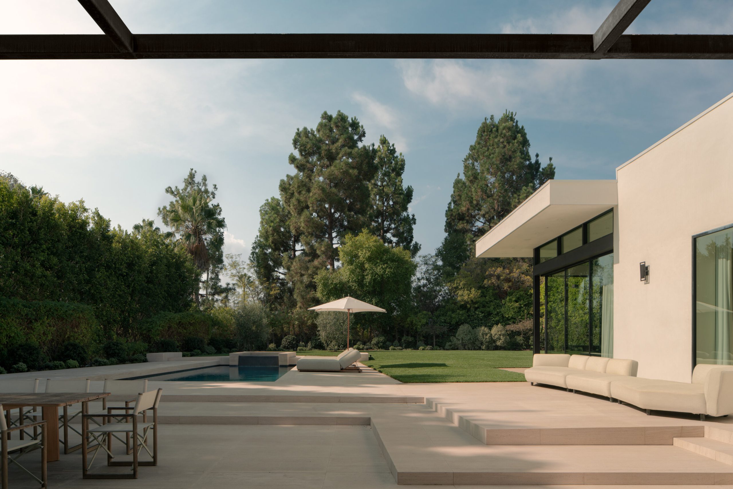 Located in the most prime section of Beverly Hills behind private gates on over half an acre of flat, fully usable land, this single-story contemporary residence blends architectural character with warm, livable design. Soaring 12-foot ceilings and skylights throughout create an open, sunlit flow from the kitchen to the family room, anchored by a wet bar and floor-to-ceiling pocket doors that open seamlessly to the grounds. The home's four bedrooms include a dramatic primary suite with retractable glass walls overlooking the pool and lush landscaping cultivating an effortless indoor-outdoor connection that defines the California lifestyle. The pool and spa serve as the centerpiece of the outdoor living space, offering a tranquil backdrop for daytime lounging and evening gatherings. Designed for both everyday living and entertaining, the home features a professional movie theater with stadium seating, a custom bar, and multiple outdoor gathering areas framed by mature trees for total privacy. Additional highlights include a 3-car garage, ample guest parking, and an exterior carport for security. At twilight, the property glows with its modern lines and layered landscape lighting creating a resort-like ambiance in the heart of Beverly Hills.
