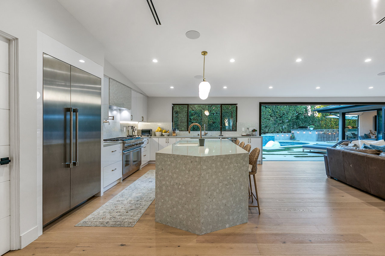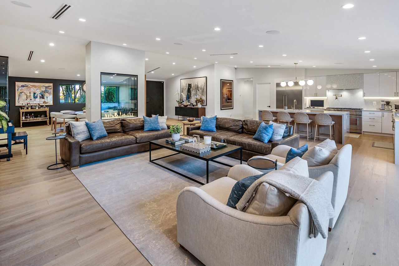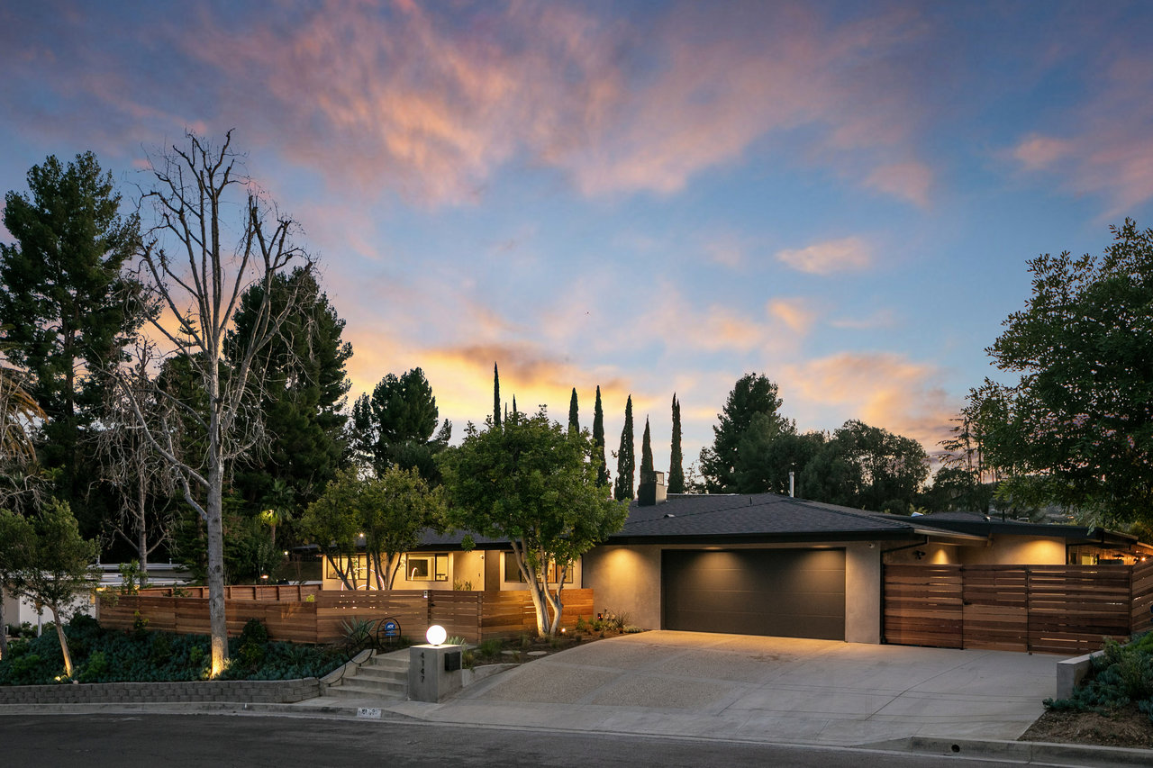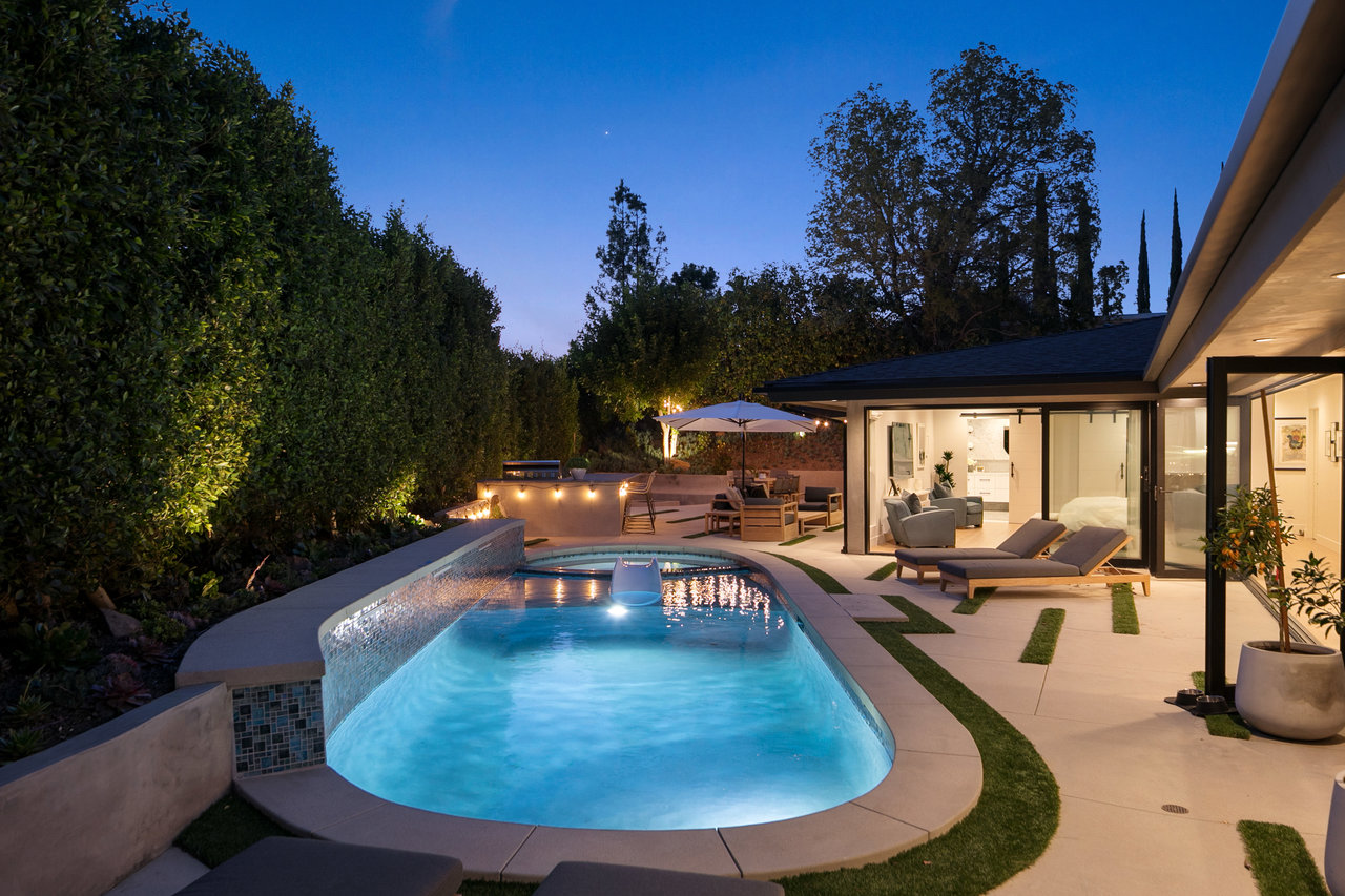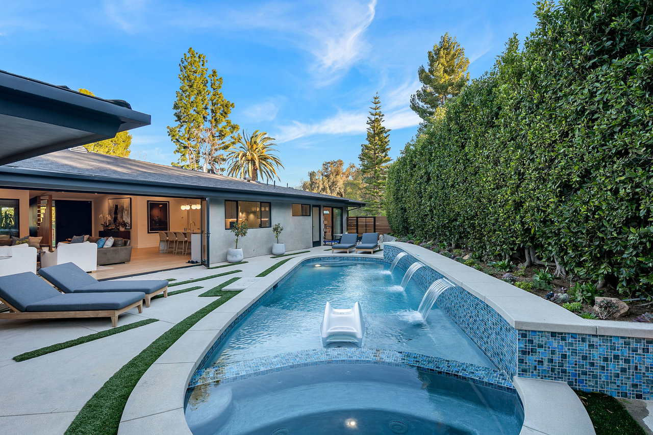 Situated on a serene and secluded corner lot, just moments from the famed Ventura Blvd, this ~4,200 square foot home showcases 5 bedrooms all en-suite, 6 bathrooms and a complete open floor plan. Outfitted with exceptional design and finishes, the home radiates natural light with walls of glass that allow for a complete indoor/outdoor flow. The main living area hosts a grand, see-through fireplace, unifying the dining room, living room, and gourmet chef's kitchen. An entertainer's dream, the kitchen features top-of-the-line appliances, a large stone-topped waterfall island with seating, and white bespoke cabinetry. The primary suite includes floor-to-ceiling glass sliding doors, a generous walk-in closet, and bath with dual vanities, sunken tub, and a walk-in shower with rainfall shower-head. California living at its finest, this home seamlessly allows for the grand interior space to flow out to the backyard that has lush, matured greenery, a pool, spa, outdoor BBQ area with island seating, and fire pit. Other features included in this home include a movie theater, gym, wine storage wall, office, and complete smart home system. Setting the bar for entertaining, convenience, and luxury, this home has it all!
