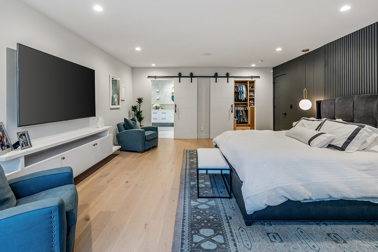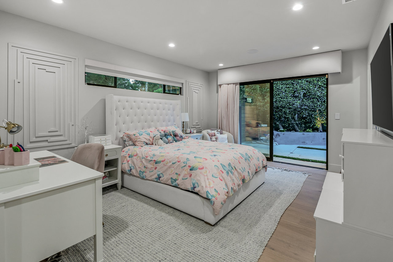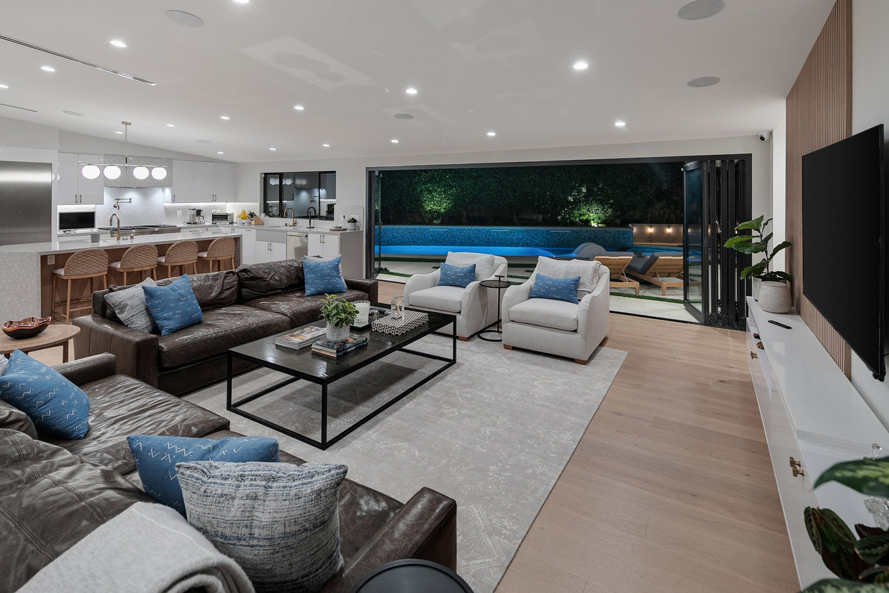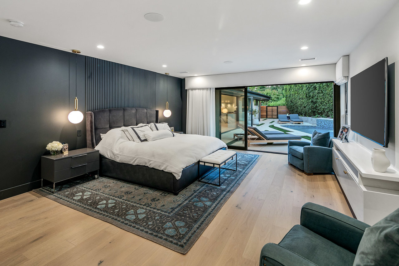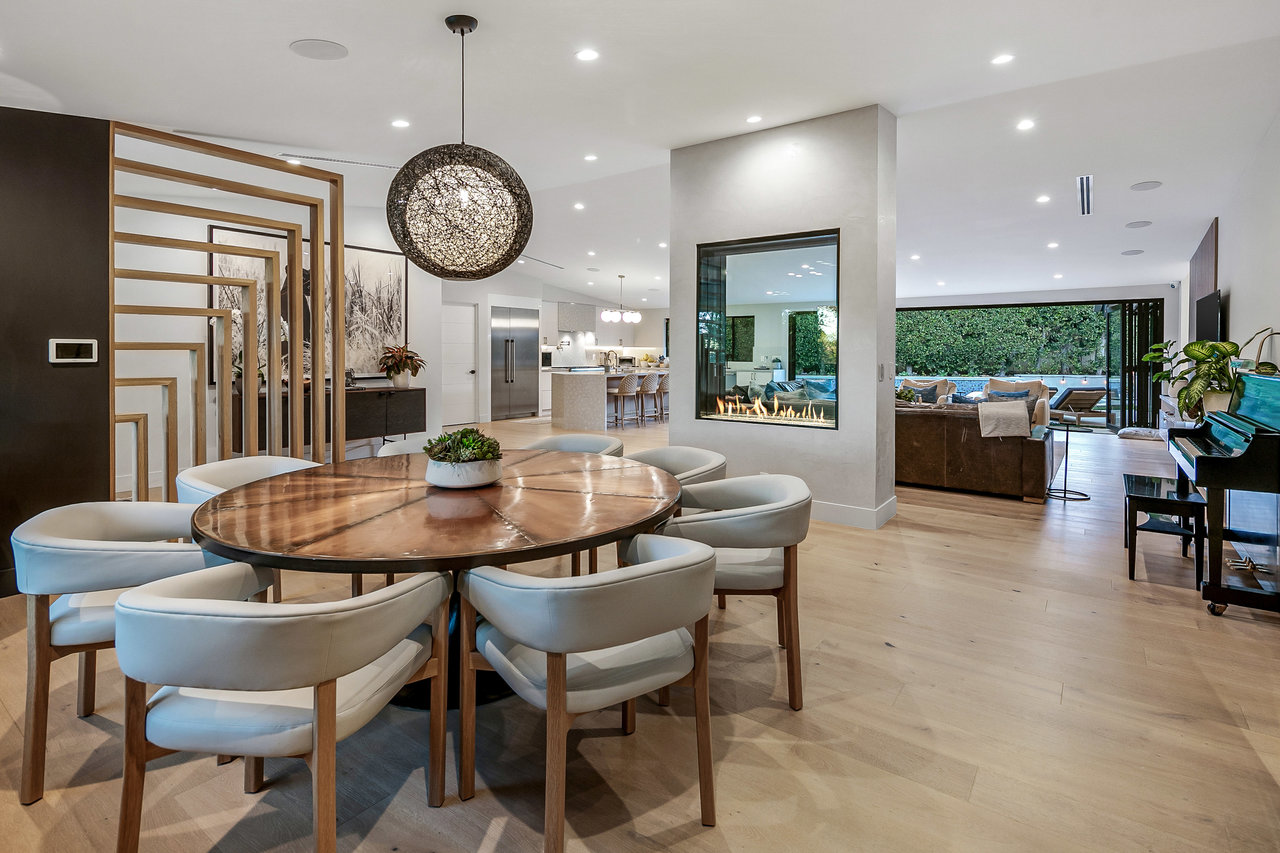 Situated on a serene and secluded corner lot, just moments from the famed Ventura Blvd, this ~4,200 square foot home showcases 5 bedrooms all en-suite, 6 bathrooms and a complete open floor plan. Outfitted with exceptional design and finishes, the home radiates natural light with walls of glass that allow for a complete indoor/outdoor flow. The main living area hosts a grand, see-through fireplace, unifying the dining room, living room, and gourmet chef's kitchen. An entertainer's dream, the kitchen features top-of-the-line appliances, a large stone-topped waterfall island with seating, and white bespoke cabinetry. The primary suite includes floor-to-ceiling glass sliding doors, a generous walk-in closet, and bath with dual vanities, sunken tub, and a walk-in shower with rainfall shower-head. California living at its finest, this home seamlessly allows for the grand interior space to flow out to the backyard that has lush, matured greenery, a pool, spa, outdoor BBQ area with island seating, and fire pit. Other features included in this home include a movie theater, gym, wine storage wall, office, and complete smart home system. Setting the bar for entertaining, convenience, and luxury, this home has it all!