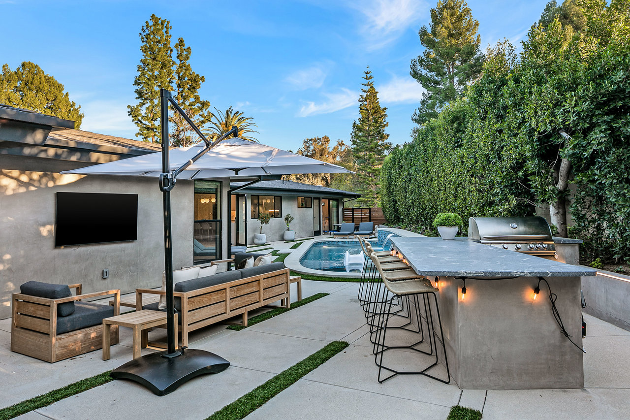 string(1226) "Situated on a serene and secluded corner lot, just moments from the famed Ventura Blvd, this ~4,200 square foot home showcases 5 bedrooms all en-suite, 6 bathrooms and a complete open floor plan. Outfitted with exceptional design and finishes, the home radiates natural light with walls of glass that allow for a complete indoor/outdoor flow. The main living area hosts a grand, see-through fireplace, unifying the dining room, living room, and gourmet chef's kitchen. An entertainer's dream, the kitchen features top-of-the-line appliances, a large stone-topped waterfall island with seating, and white bespoke cabinetry. The primary suite includes floor-to-ceiling glass sliding doors, a generous walk-in closet, and bath with dual vanities, sunken tub, and a walk-in shower with rainfall shower-head. California living at its finest, this home seamlessly allows for the grand interior space to flow out to the backyard that has lush, matured greenery, a pool, spa, outdoor BBQ area with island seating, and fire pit. Other features included in this home include a movie theater, gym, wine storage wall, office, and complete smart home system. Setting the bar for entertaining, convenience, and luxury, this home has it all!"