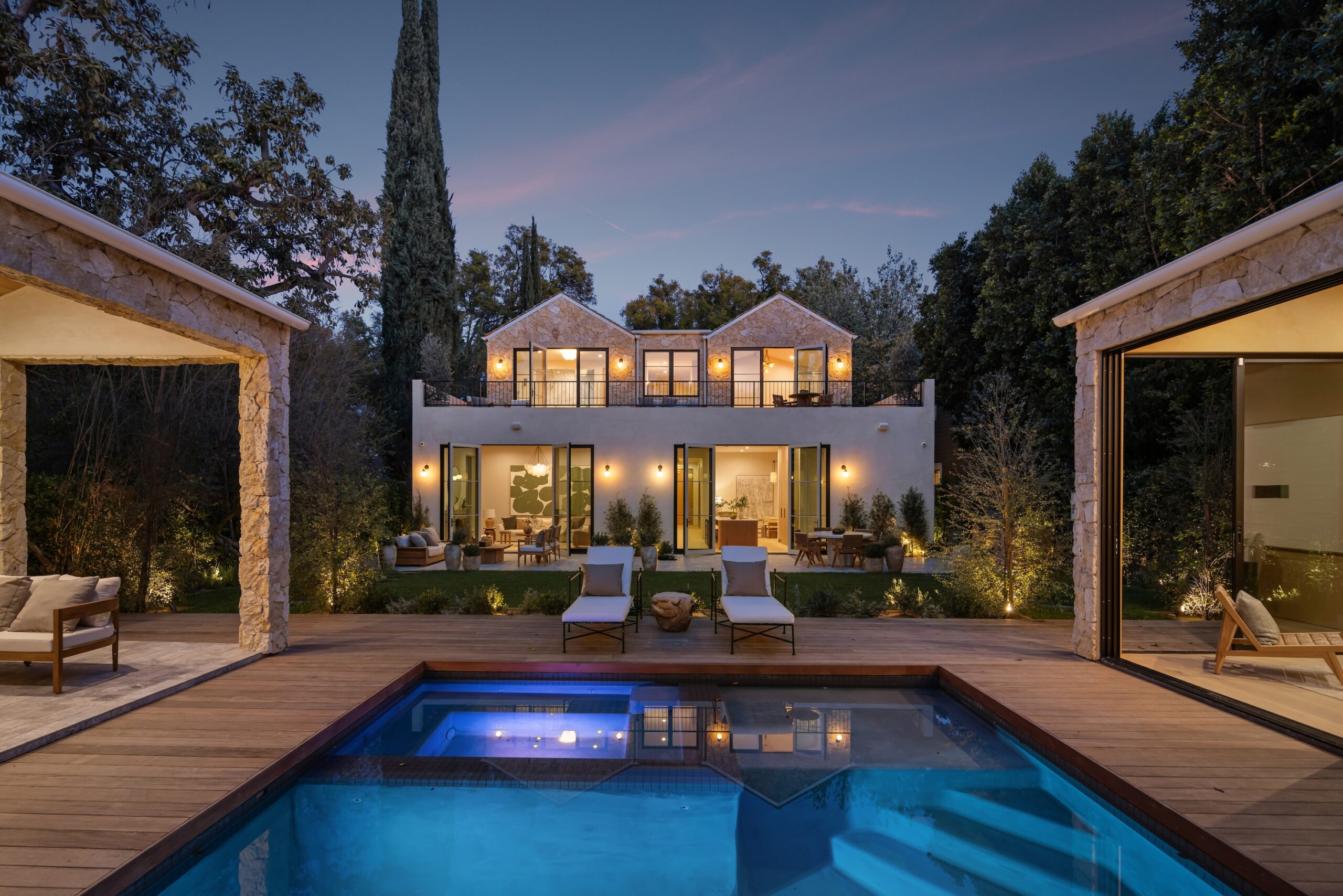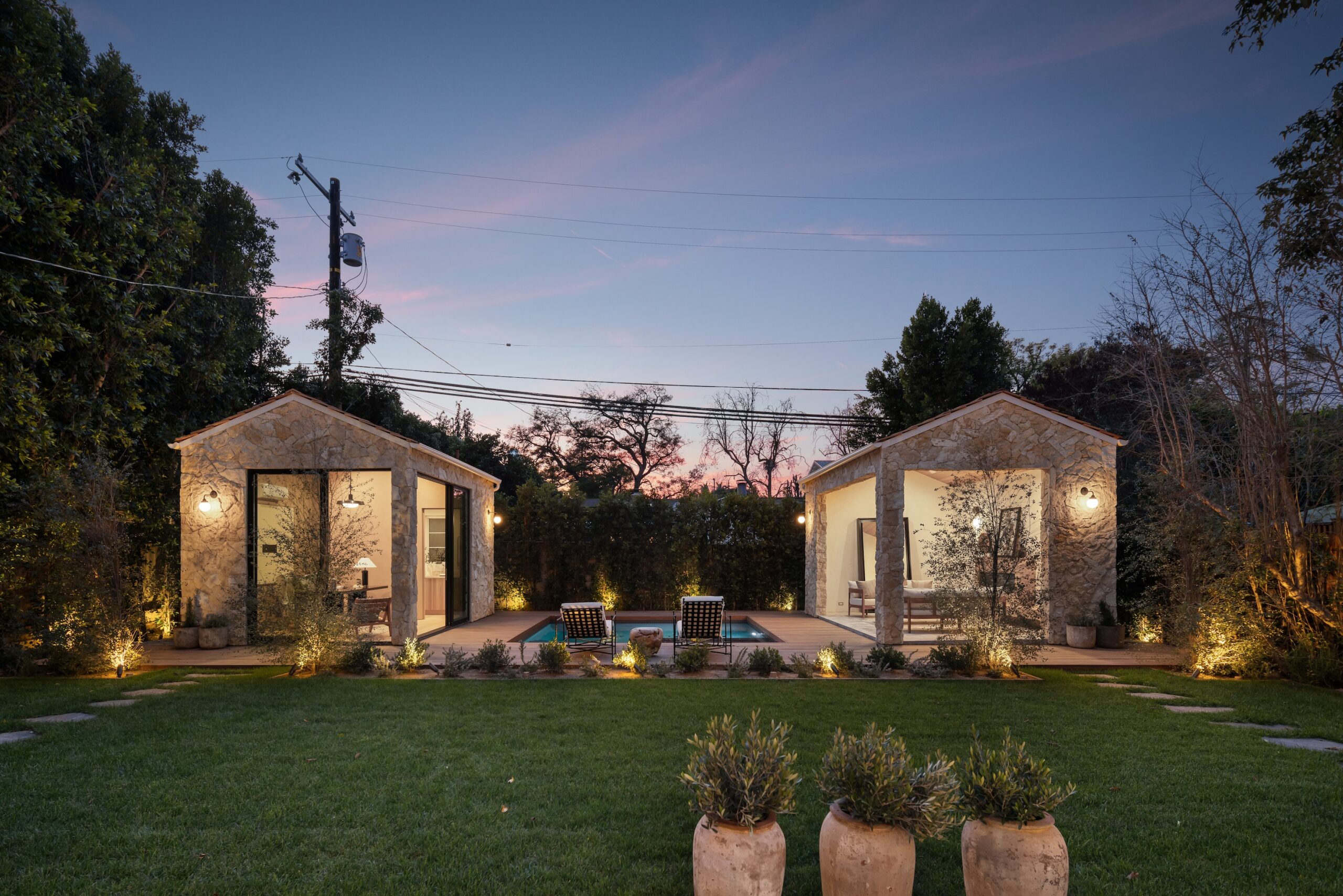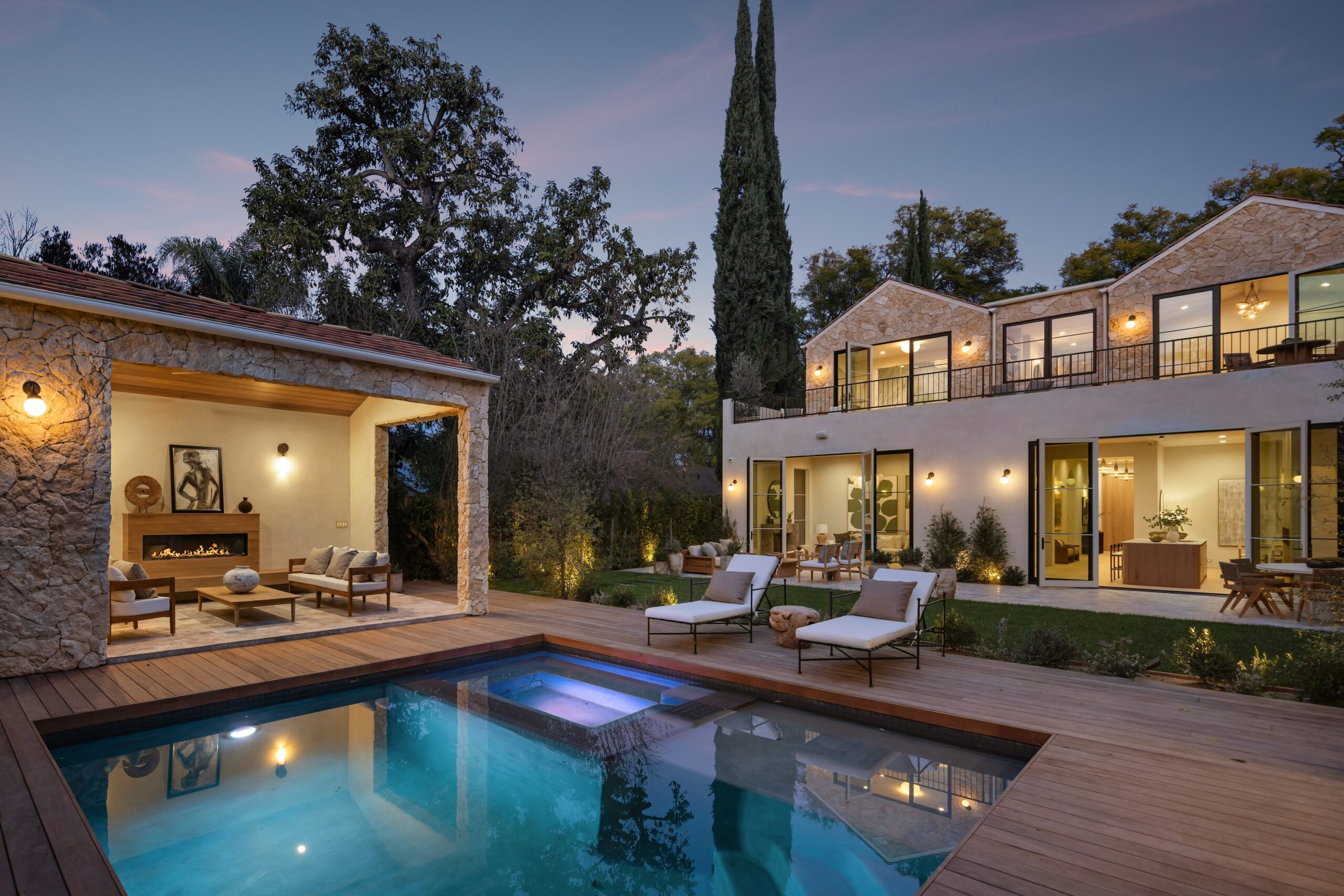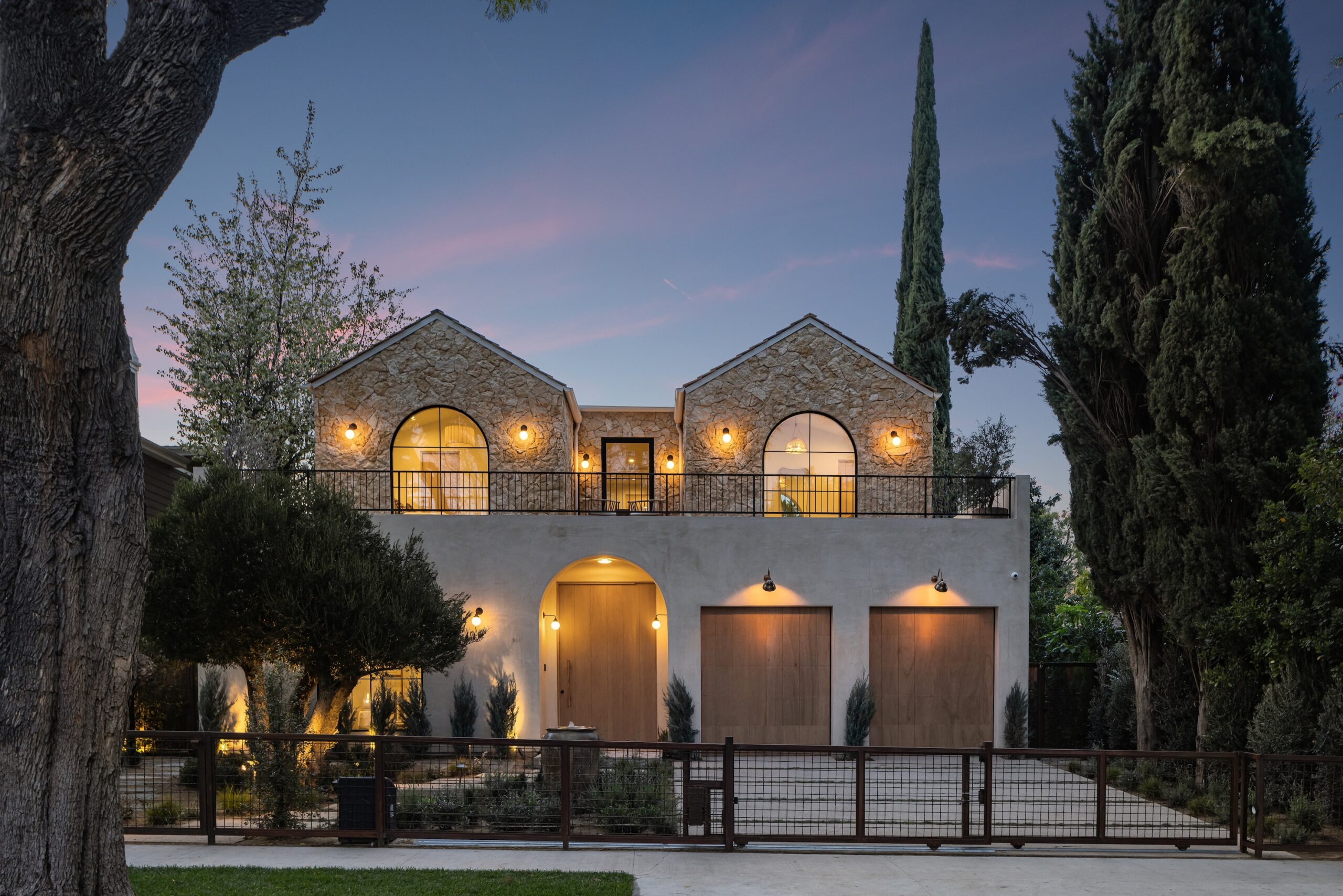 4163 Ventura Canyon Ave presents a breathtaking fusion of elegance and contemporary luxury. Tucked behind gates in a lush, private setting, this newly built residence showcases exquisite craftsmanship, warm organic textures, and an effortless indoor-outdoor flow. Step through the grand arched entry into a sunlit interior defined by soaring ceilings, refined plaster walls, and European white oak flooring in a stunning chevron pattern. The open-concept living spaces exude warmth and sophistication, anchored by a chef's kitchen with custom walnut cabinetry, marble countertops, a prep kitchen for additional functionality, and seamless access to the outdoor oasis. The adjoining dining and family room, illuminated by expansive glass doors, extends onto an alfresco lounge overlooking the serene backyard. The primary suite is a private sanctuary, featuring a fireplace, vaulted ceilings, and direct access to a tranquil terrace. The spa-like ensuite is adorned with book-matched marble, dual rain showers, a freestanding soaking tub, and custom oak vanities. Generous secondary bedrooms boast designer finishes and oversized arched windows framing picturesque views. Outside, the meticulously landscaped grounds offer multiple patios, a lush lawn, and a sparkling pool and spa, perfect for entertaining or quiet relaxation. A detached guest house provides additional versatility, ideal for a home office, gym, or retreat. Every detail of this residence reflects an unparalleled commitment to quality and design, creating a home that is as striking as it is inviting. Nestled in a prime Sherman Oaks location, moments from fine dining and upscale shopping, this architectural masterpiece delivers the ultimate California lifestyle. Square footage is as follows: 4,089 Main House; 231 Cabana; 231 Rec Room; Total 4,551SF.