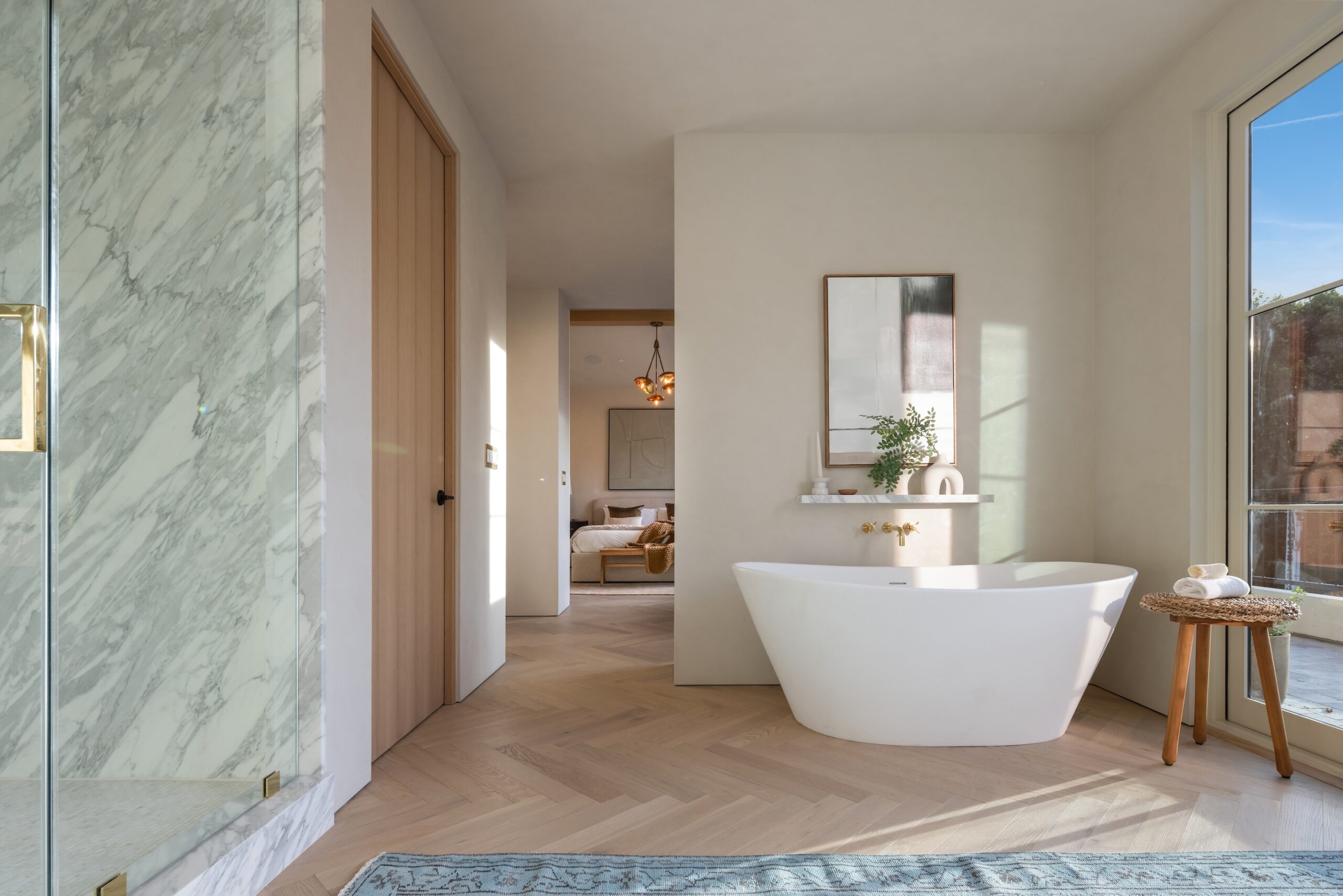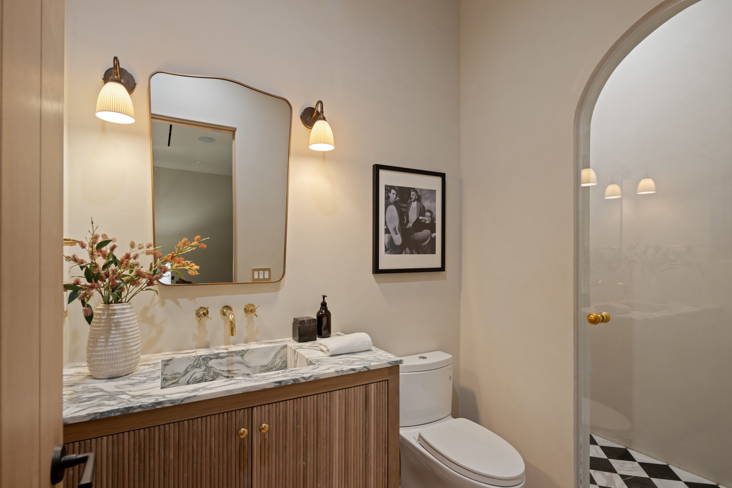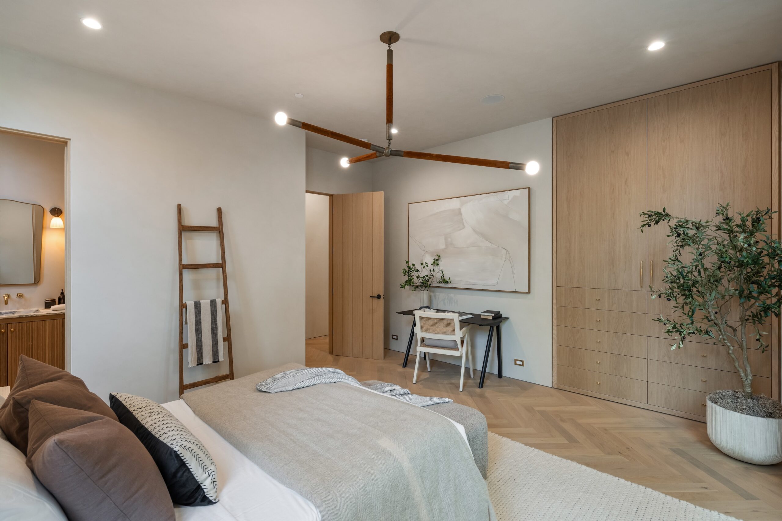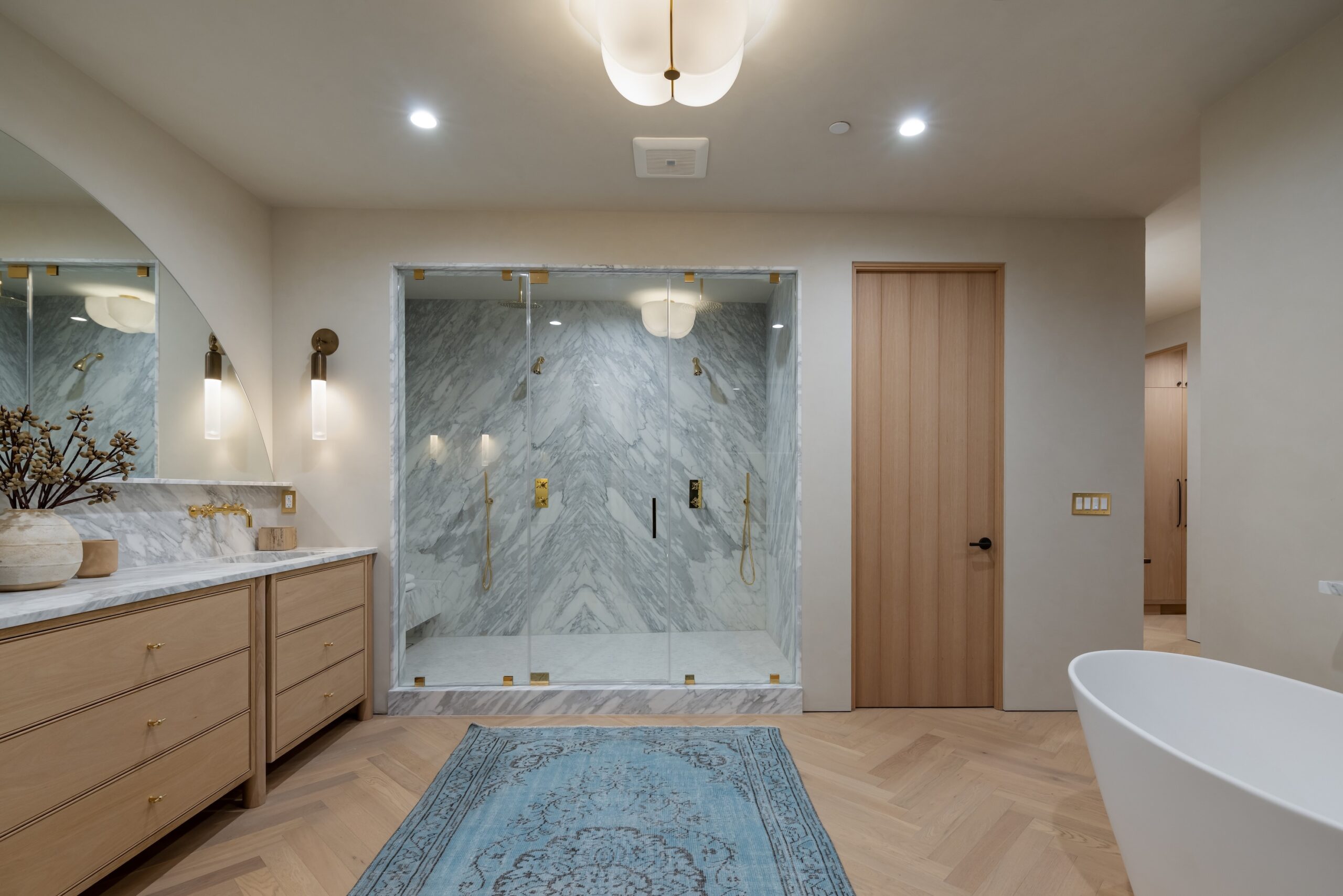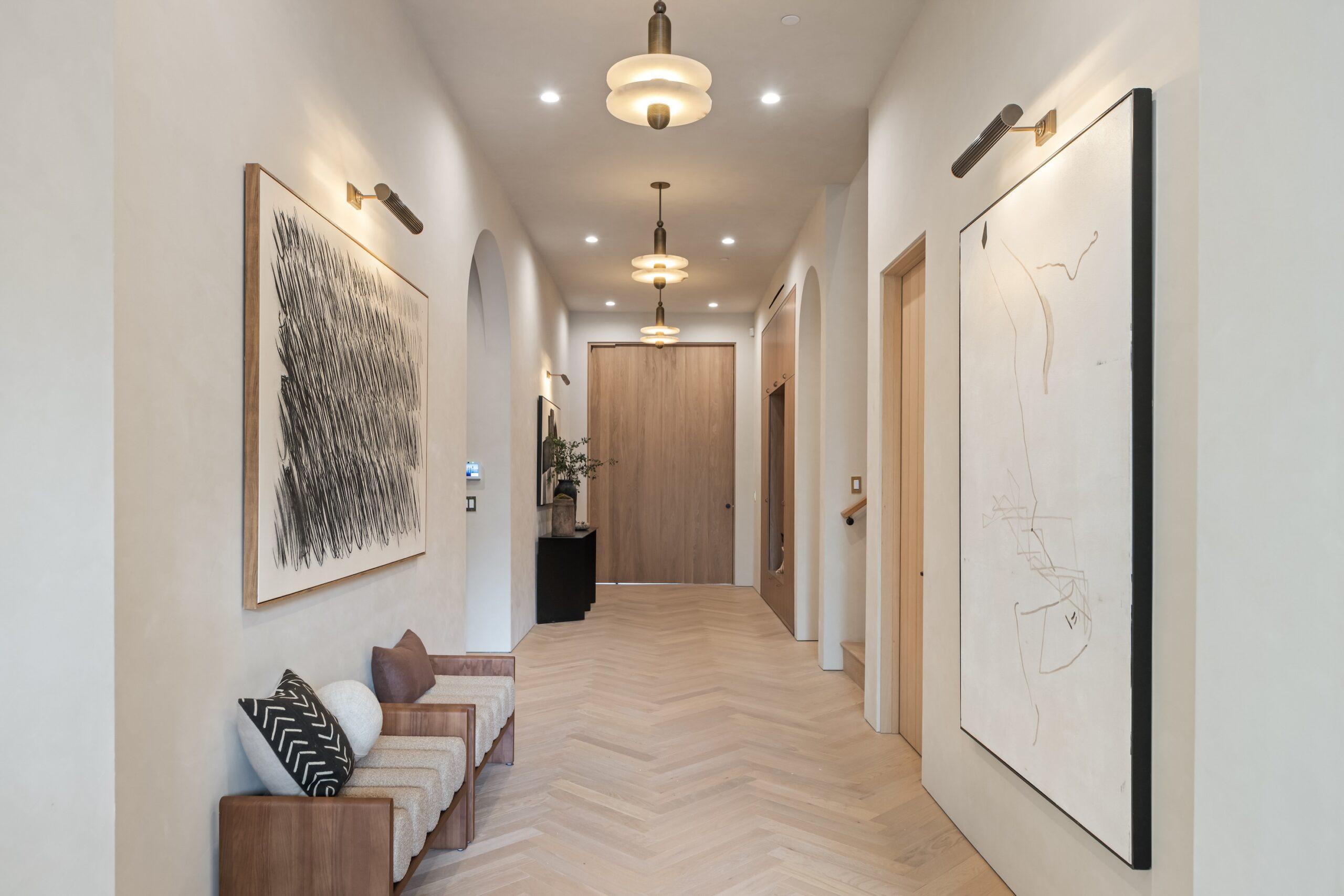 4163 Ventura Canyon Ave presents a breathtaking fusion of elegance and contemporary luxury. Tucked behind gates in a lush, private setting, this newly built residence showcases exquisite craftsmanship, warm organic textures, and an effortless indoor-outdoor flow. Step through the grand arched entry into a sunlit interior defined by soaring ceilings, refined plaster walls, and European white oak flooring in a stunning chevron pattern. The open-concept living spaces exude warmth and sophistication, anchored by a chef's kitchen with custom walnut cabinetry, marble countertops, a prep kitchen for additional functionality, and seamless access to the outdoor oasis. The adjoining dining and family room, illuminated by expansive glass doors, extends onto an alfresco lounge overlooking the serene backyard. The primary suite is a private sanctuary, featuring a fireplace, vaulted ceilings, and direct access to a tranquil terrace. The spa-like ensuite is adorned with book-matched marble, dual rain showers, a freestanding soaking tub, and custom oak vanities. Generous secondary bedrooms boast designer finishes and oversized arched windows framing picturesque views. Outside, the meticulously landscaped grounds offer multiple patios, a lush lawn, and a sparkling pool and spa, perfect for entertaining or quiet relaxation. A detached guest house provides additional versatility, ideal for a home office, gym, or retreat. Every detail of this residence reflects an unparalleled commitment to quality and design, creating a home that is as striking as it is inviting. Nestled in a prime Sherman Oaks location, moments from fine dining and upscale shopping, this architectural masterpiece delivers the ultimate California lifestyle. Square footage is as follows: 4,089 Main House; 231 Cabana; 231 Rec Room; Total 4,551SF.