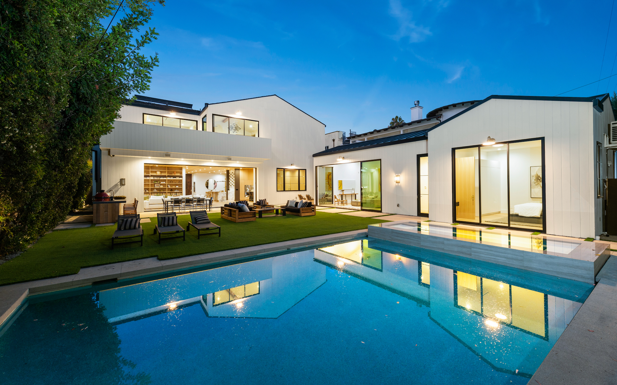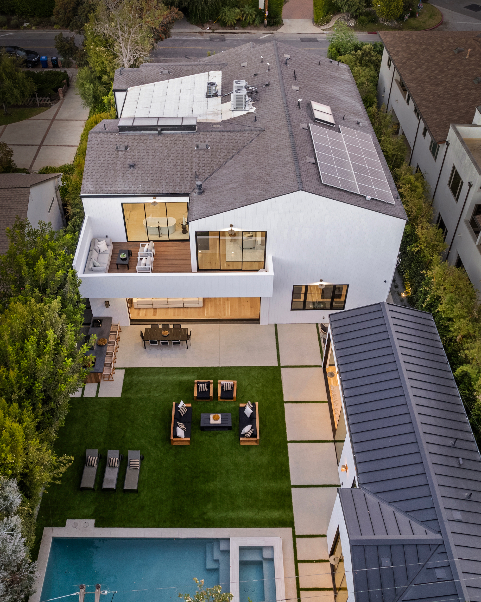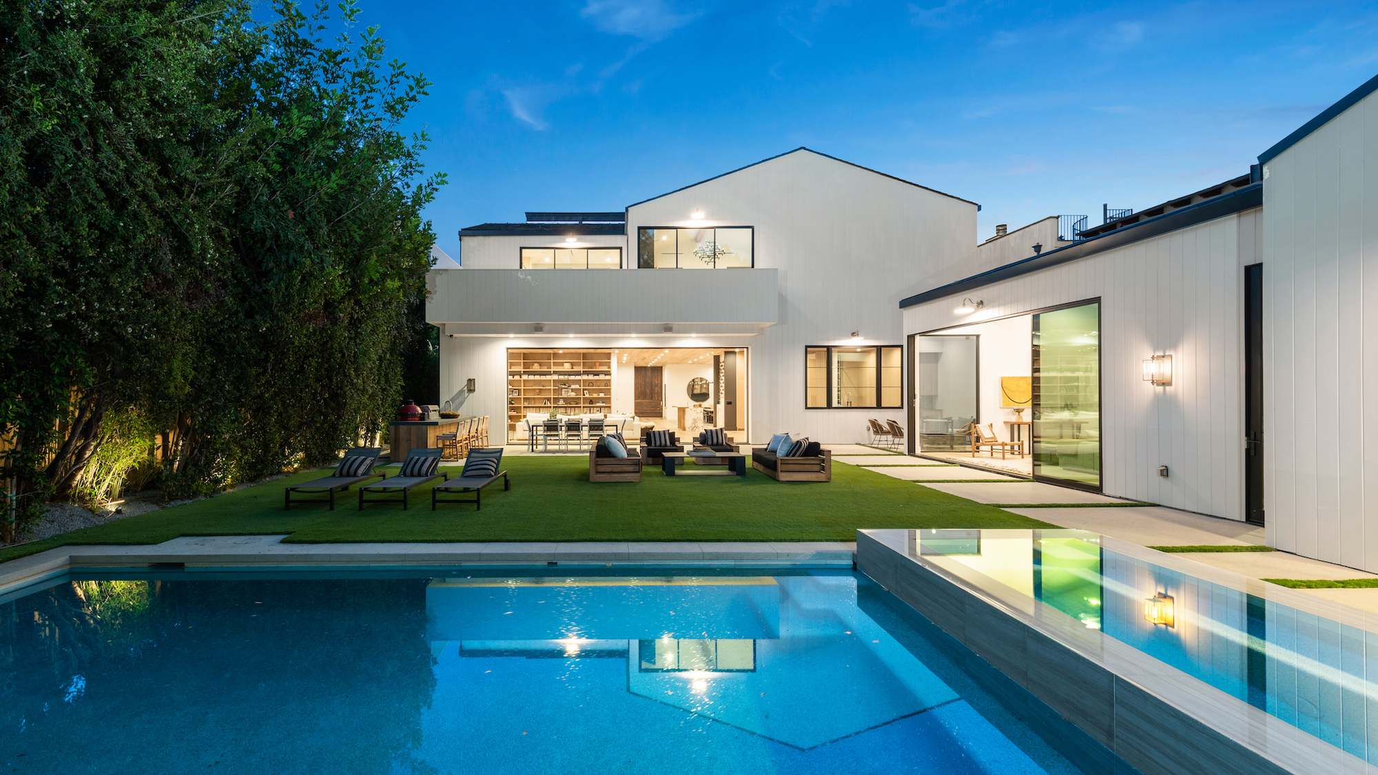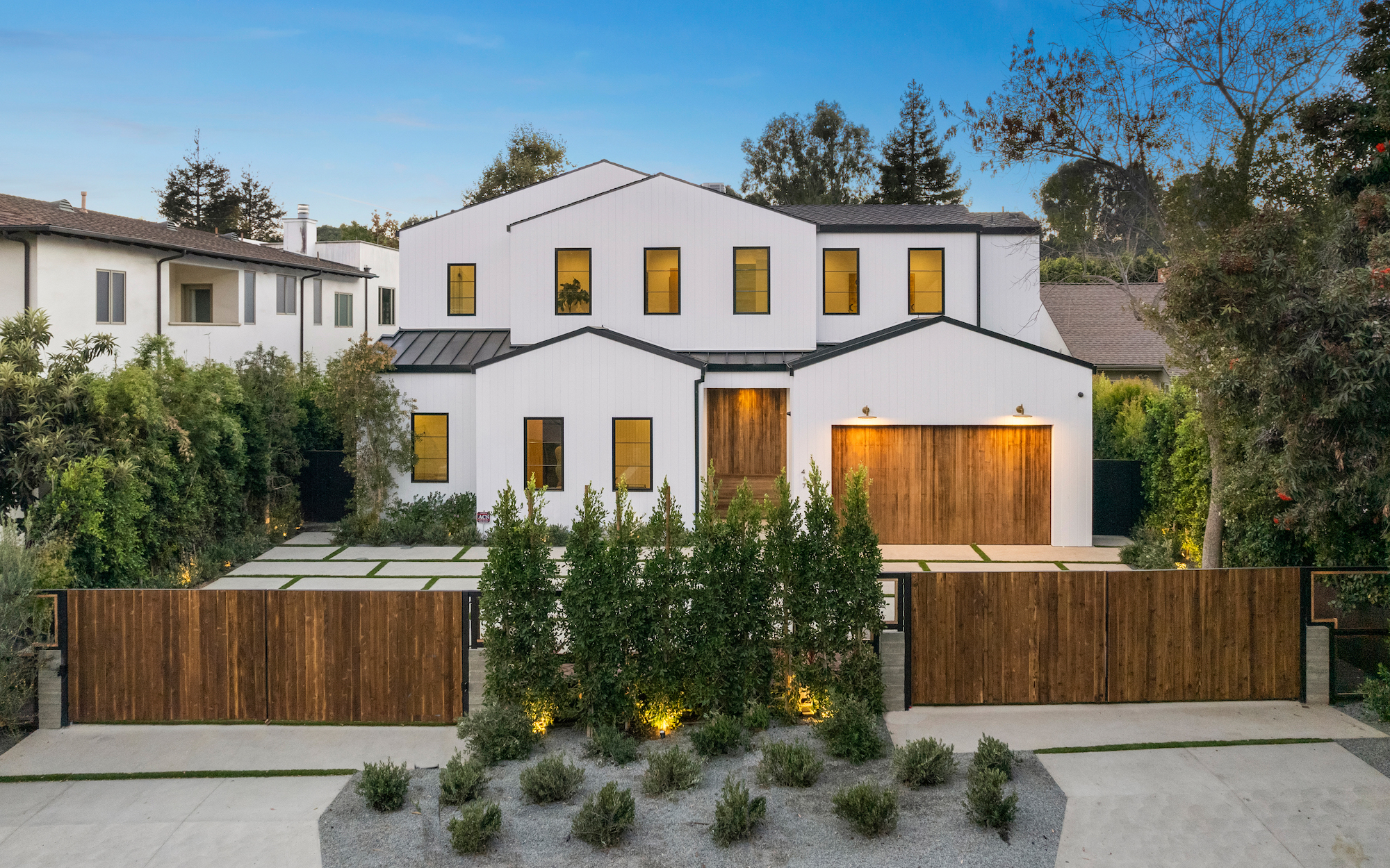 Ideally situated in the acclaimed Brentwood neighborhood, this newly constructed 6 bedroom and 7 bathroom designer residence features a contemporary take on the modern farmhouse. High-end elements from architectural designer Jae Omar and architect Eran Gispan are seamlessly woven throughout to generate a luxurious feel with a comfortable aire, including live edge surfaces, seamless cabinetry, statement bathrooms, and a thoughtful balance of natural materials. A flexible open layout blends the living and dining areas, alongside a gourmet kitchen, highlighted by dual islands, custom cabinetry, chef-grade appliances, and elegant stone surfaces. Upstairs, a remarkable primary suite encompasses a spa-grade bathroom, floor to ceiling marble fireplace, custom oversized walk-in closet, and a private balcony. Just outside, a mix of smart hardscaping and intricate landscaping composes a rear oasis, complete with outdoor kitchen and spacious pool with attached spa. The secondary bedrooms and bathrooms are situated across the 7,420 square foot residence and are laid out for both functionality and privacy. Adding to the residence is a home theater, attached garage with electric vehicle charging, dedicated laundry room, smart home technology, top-grade heating and cooling systems, and an ideal location.