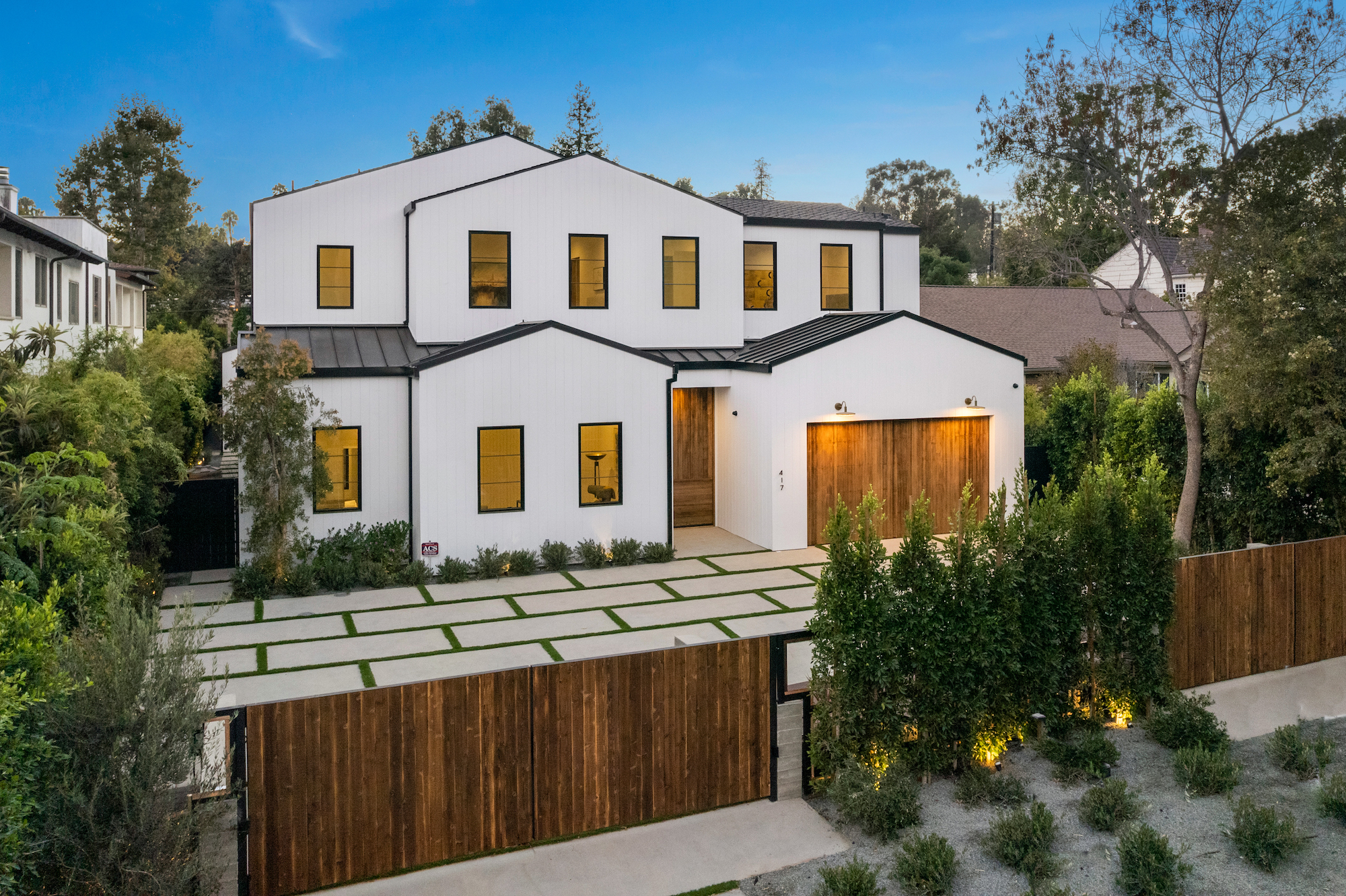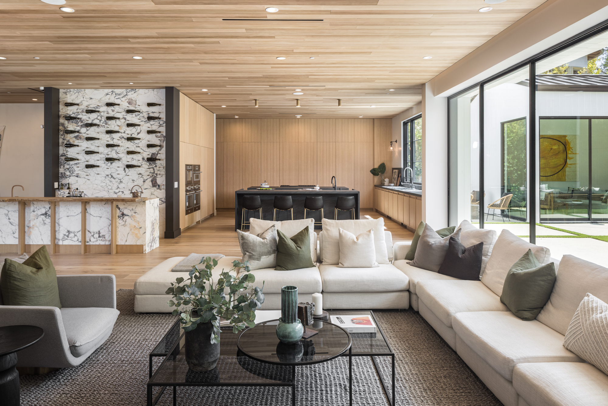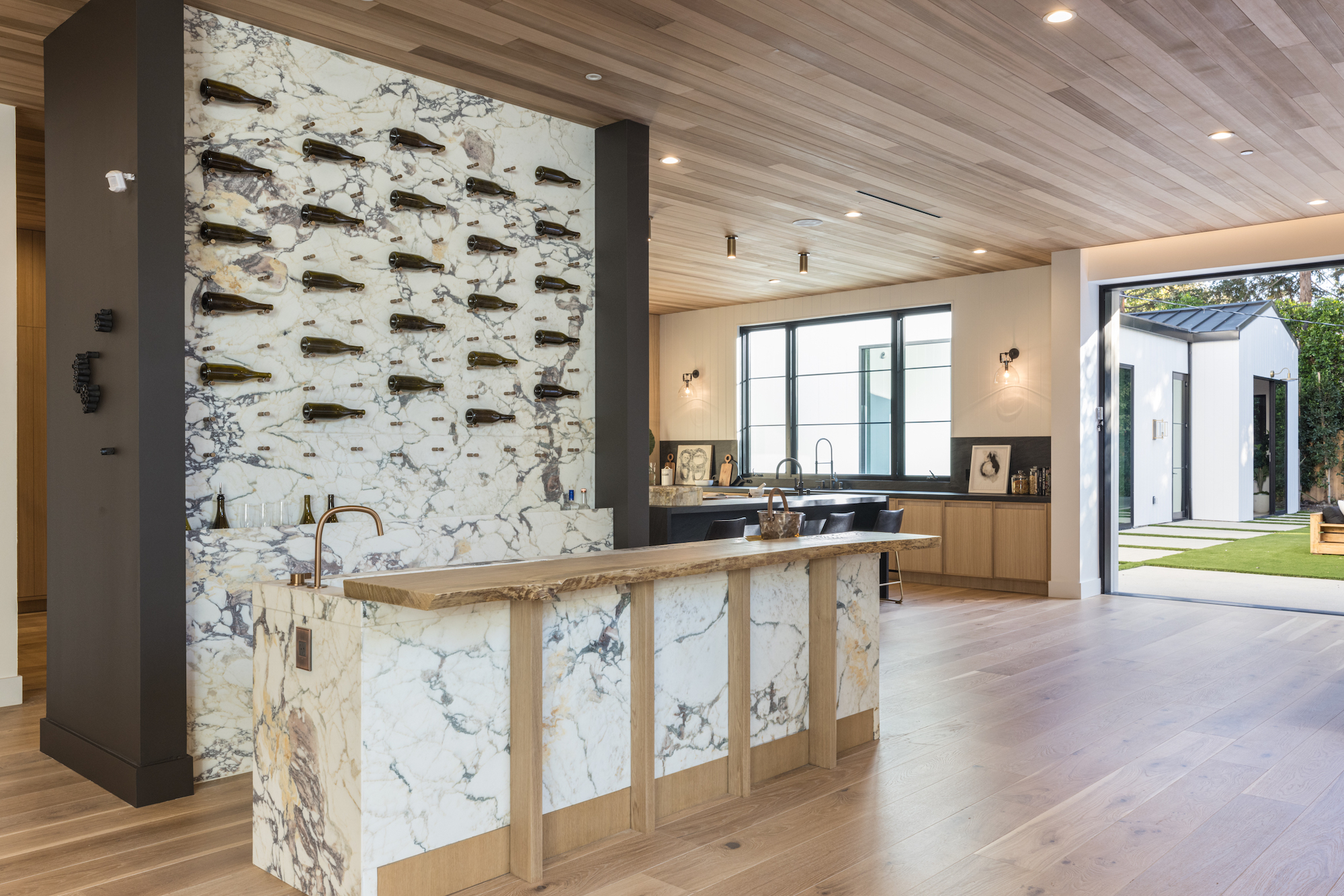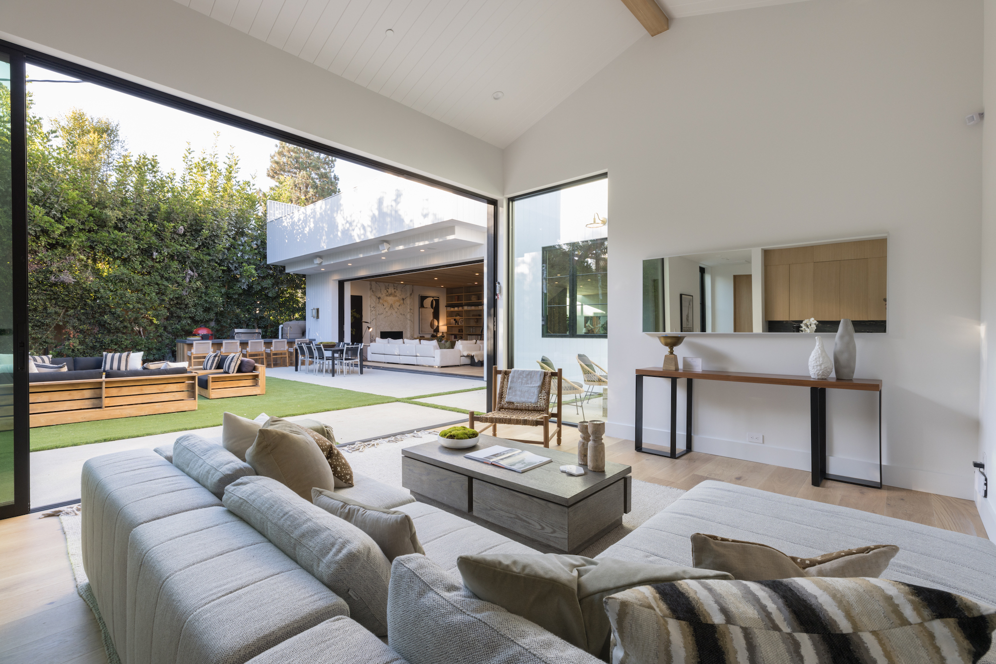 Ideally situated in the acclaimed Brentwood neighborhood, this newly constructed 6 bedroom and 7 bathroom designer residence features a contemporary take on the modern farmhouse. High-end elements from architectural designer Jae Omar and architect Eran Gispan are seamlessly woven throughout to generate a luxurious feel with a comfortable aire, including live edge surfaces, seamless cabinetry, statement bathrooms, and a thoughtful balance of natural materials. A flexible open layout blends the living and dining areas, alongside a gourmet kitchen, highlighted by dual islands, custom cabinetry, chef-grade appliances, and elegant stone surfaces. Upstairs, a remarkable primary suite encompasses a spa-grade bathroom, floor to ceiling marble fireplace, custom oversized walk-in closet, and a private balcony. Just outside, a mix of smart hardscaping and intricate landscaping composes a rear oasis, complete with outdoor kitchen and spacious pool with attached spa. The secondary bedrooms and bathrooms are situated across the 7,420 square foot residence and are laid out for both functionality and privacy. Adding to the residence is a home theater, attached garage with electric vehicle charging, dedicated laundry room, smart home technology, top-grade heating and cooling systems, and an ideal location.