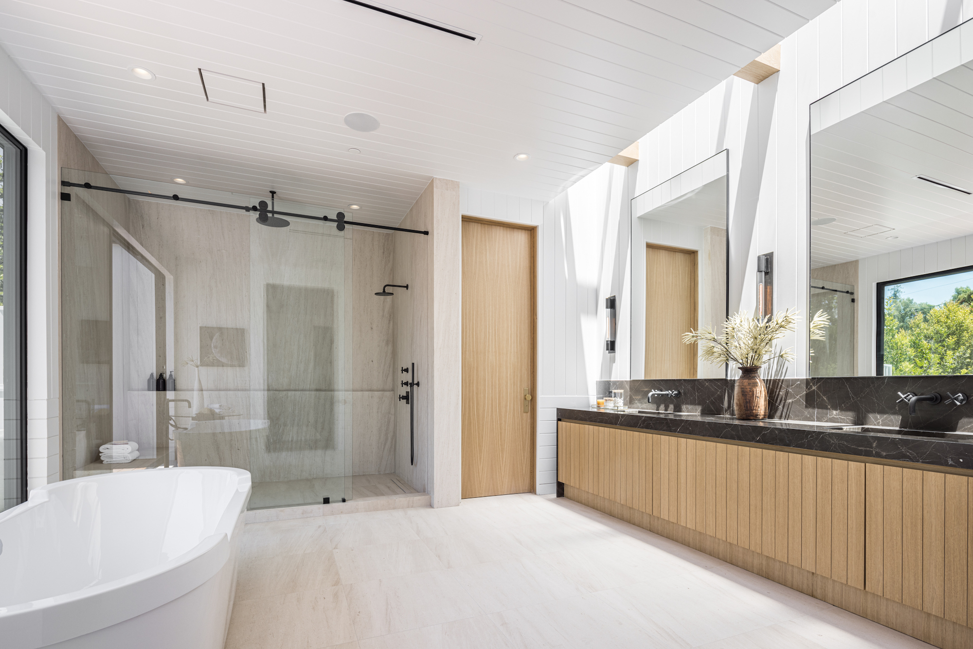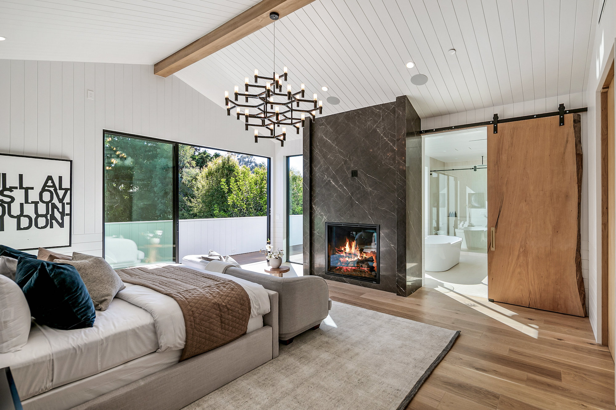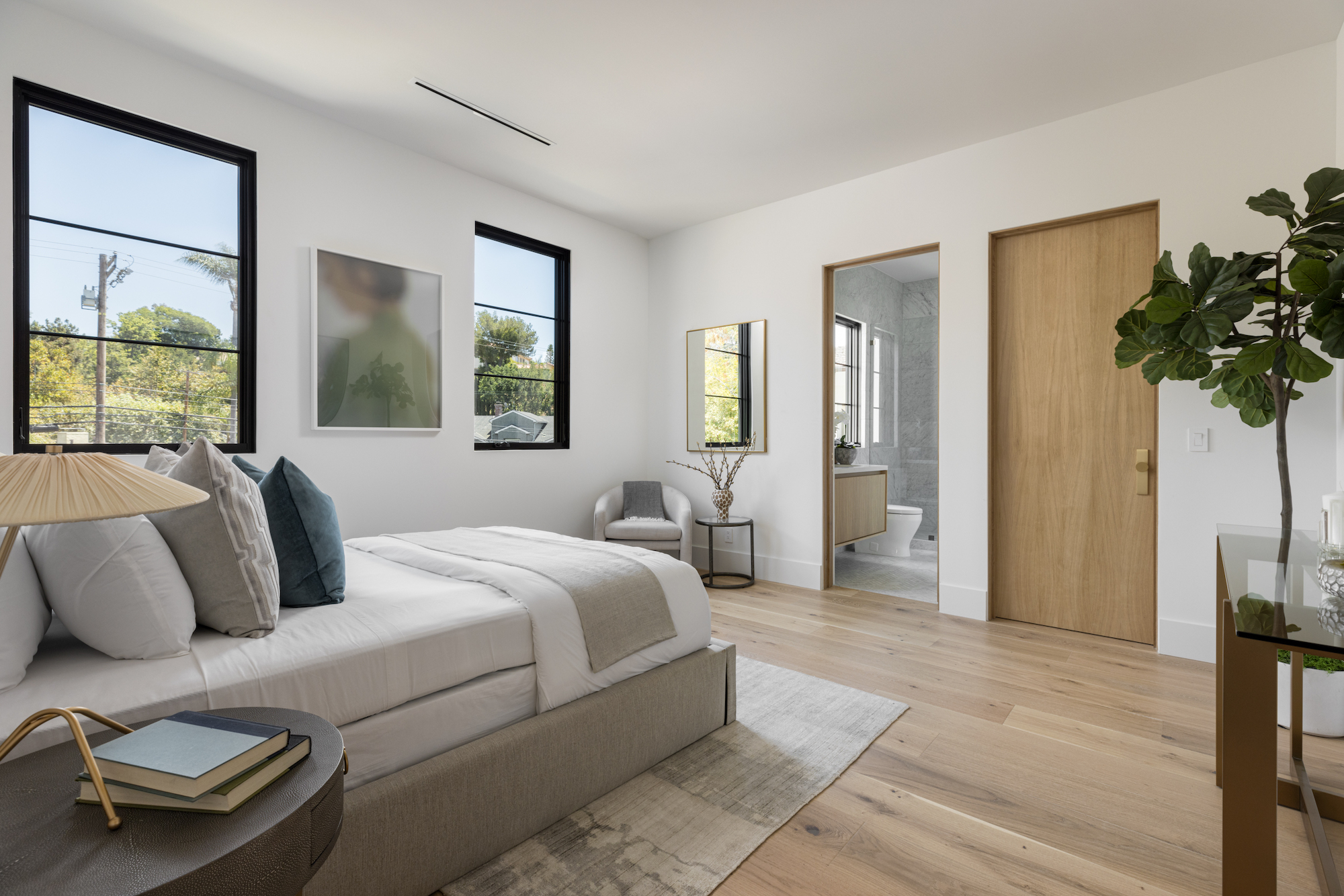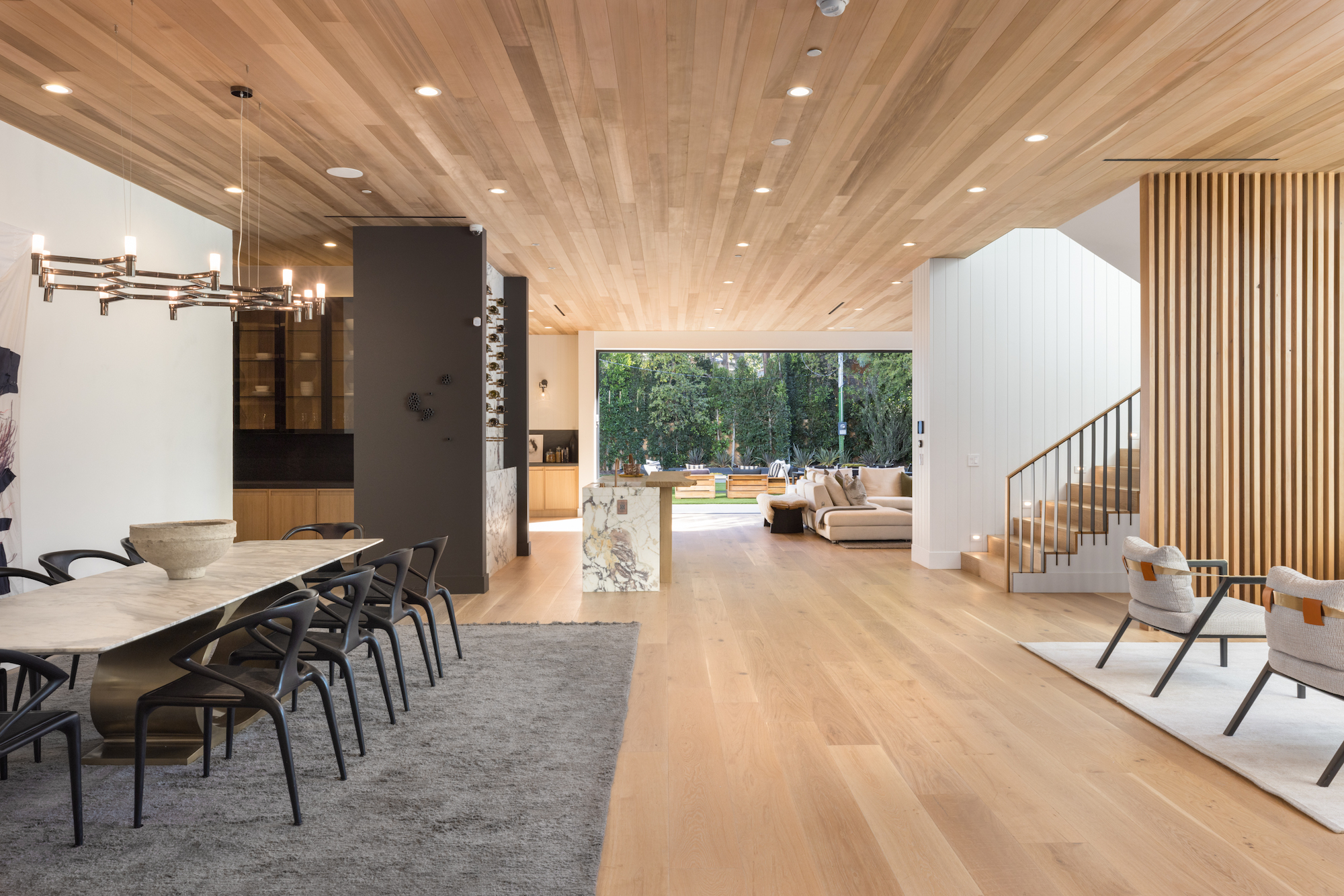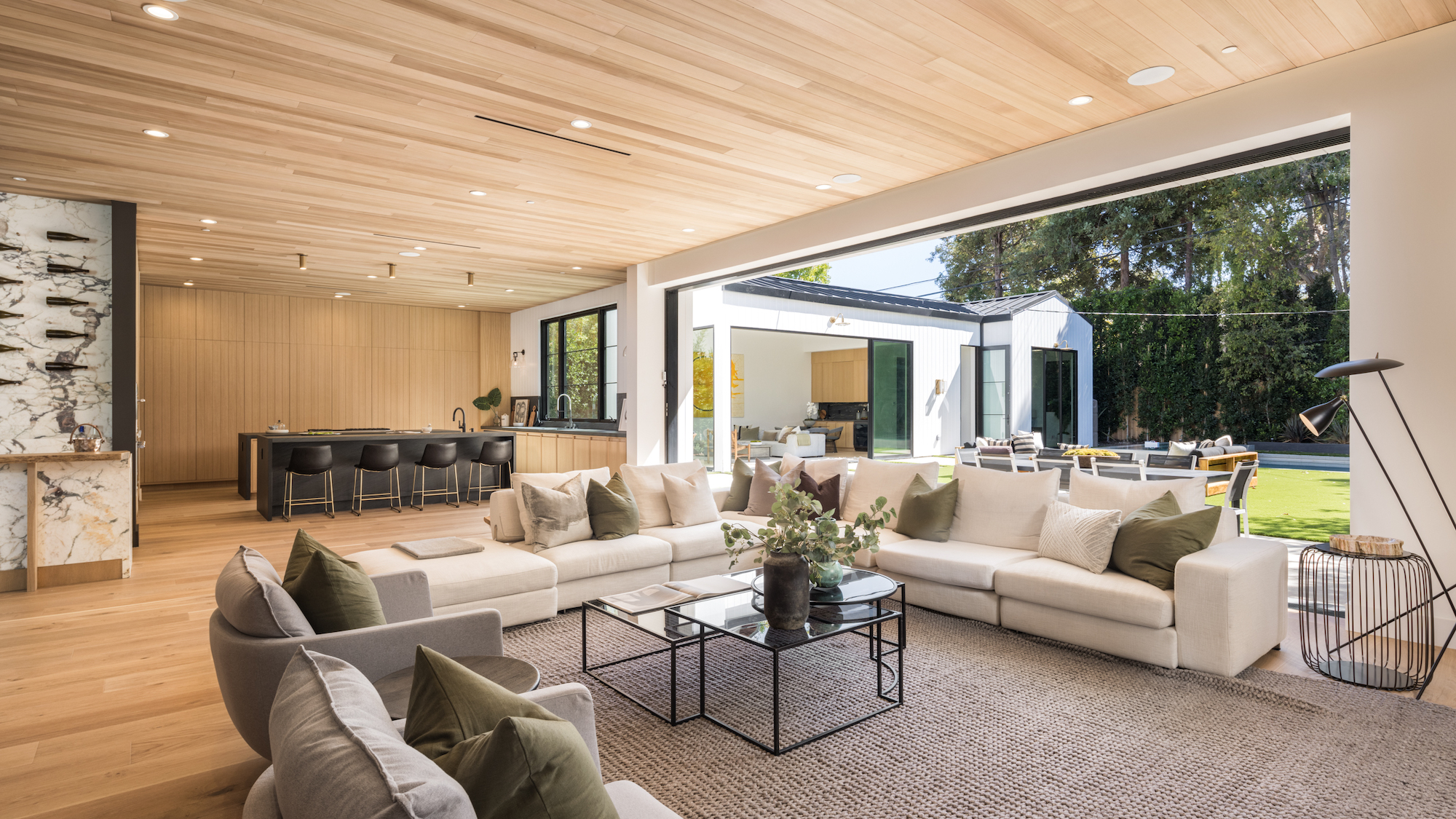Ideally situated in the acclaimed Brentwood neighborhood, this newly constructed 6 bedroom and 7 bathroom designer residence features a contemporary take on the modern farmhouse. High-end elements from architectural designer Jae Omar and architect Eran Gispan are seamlessly woven throughout to generate a luxurious feel with a comfortable aire, including live edge surfaces, seamless cabinetry, statement bathrooms, and a thoughtful balance of natural materials. A flexible open layout blends the living and dining areas, alongside a gourmet kitchen, highlighted by dual islands, custom cabinetry, chef-grade appliances, and elegant stone surfaces. Upstairs, a remarkable primary suite encompasses a spa-grade bathroom, floor to ceiling marble fireplace, custom oversized walk-in closet, and a private balcony. Just outside, a mix of smart hardscaping and intricate landscaping composes a rear oasis, complete with outdoor kitchen and spacious pool with attached spa. The secondary bedrooms and bathrooms are situated across the 7,420 square foot residence and are laid out for both functionality and privacy. Adding to the residence is a home theater, attached garage with electric vehicle charging, dedicated laundry room, smart home technology, top-grade heating and cooling systems, and an ideal location.