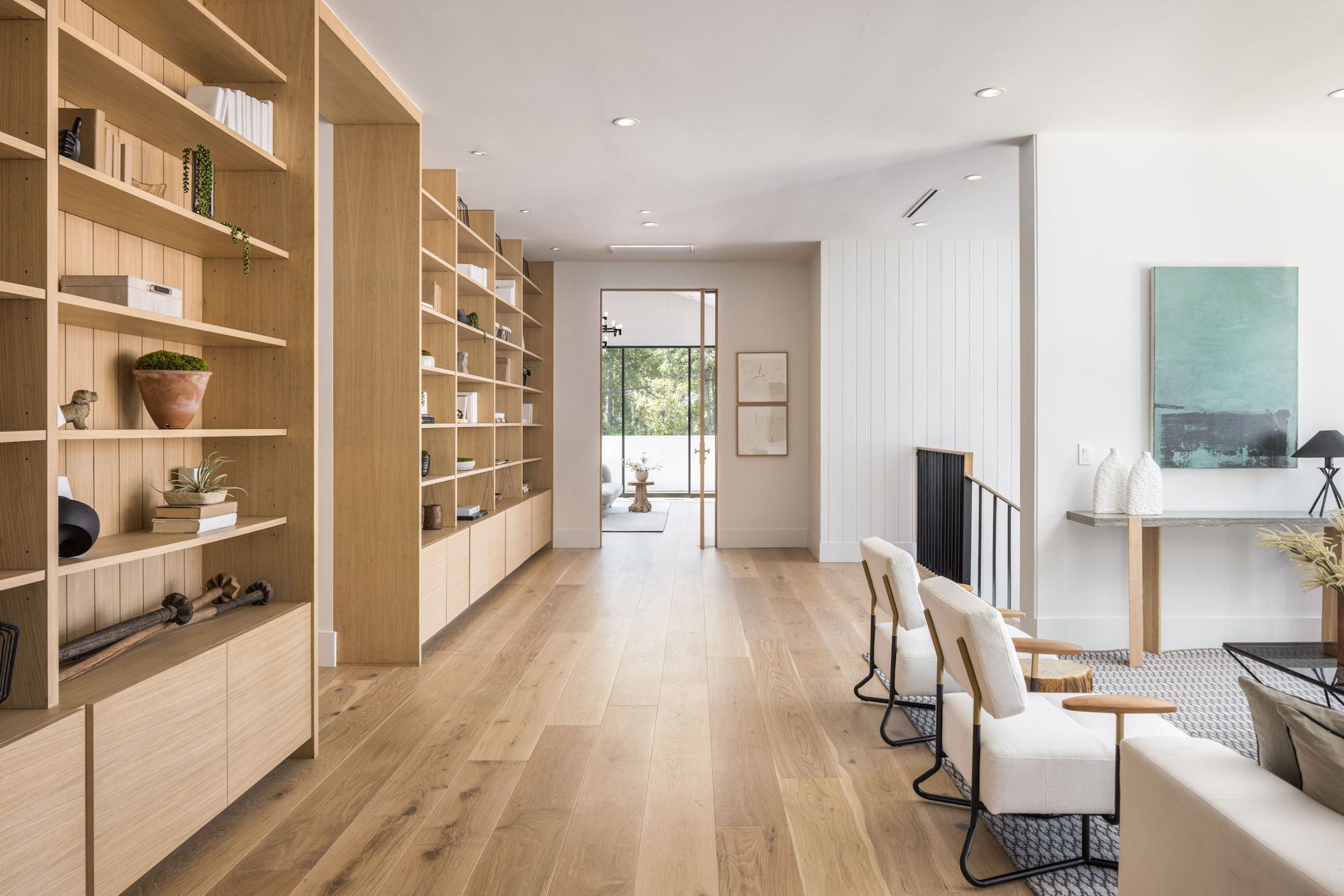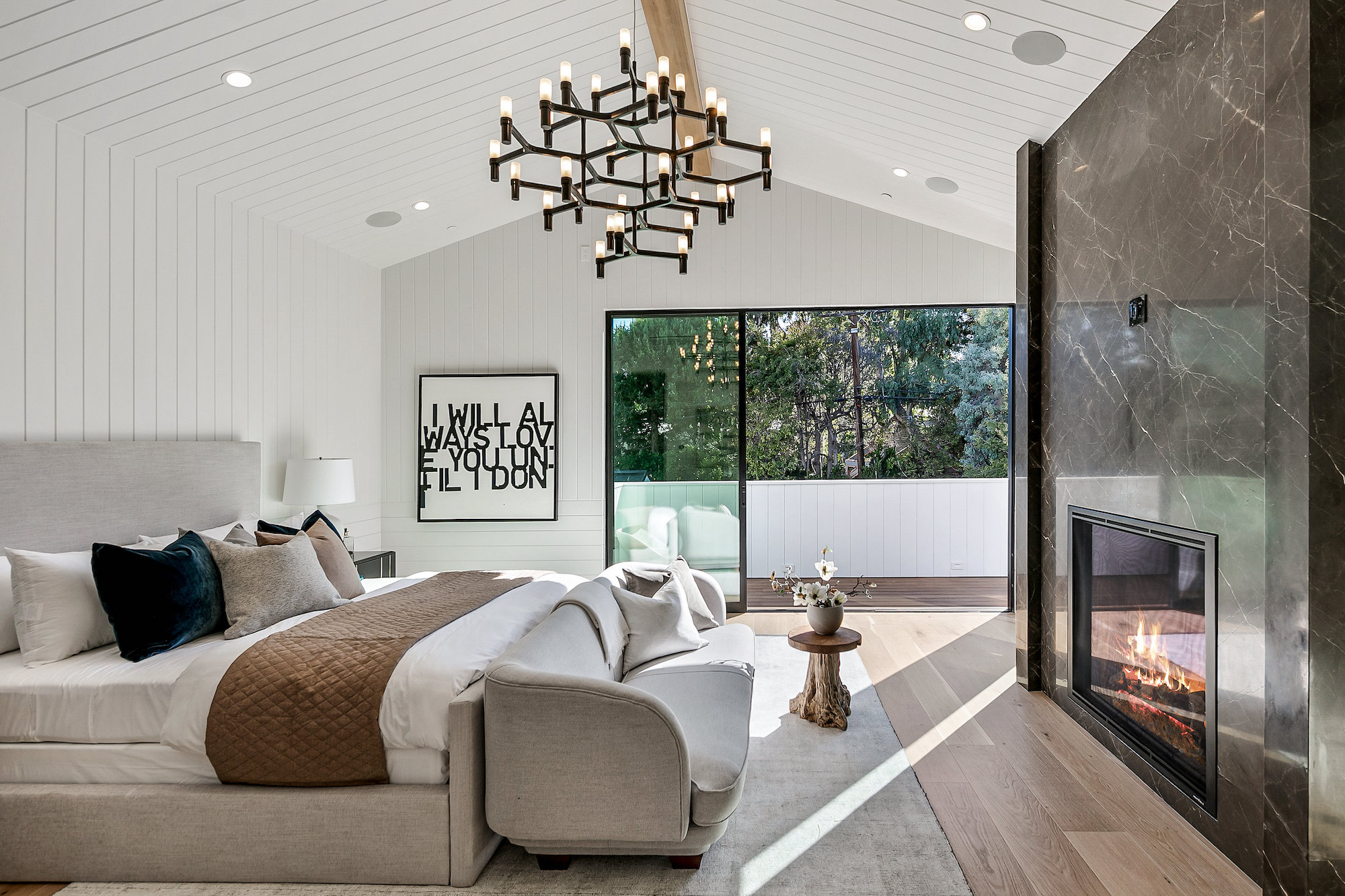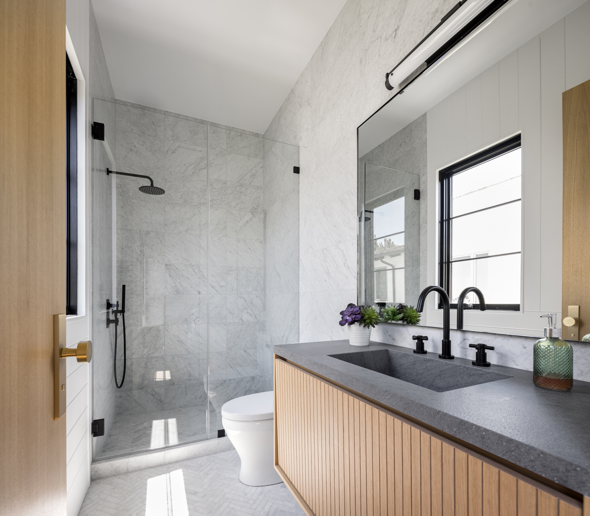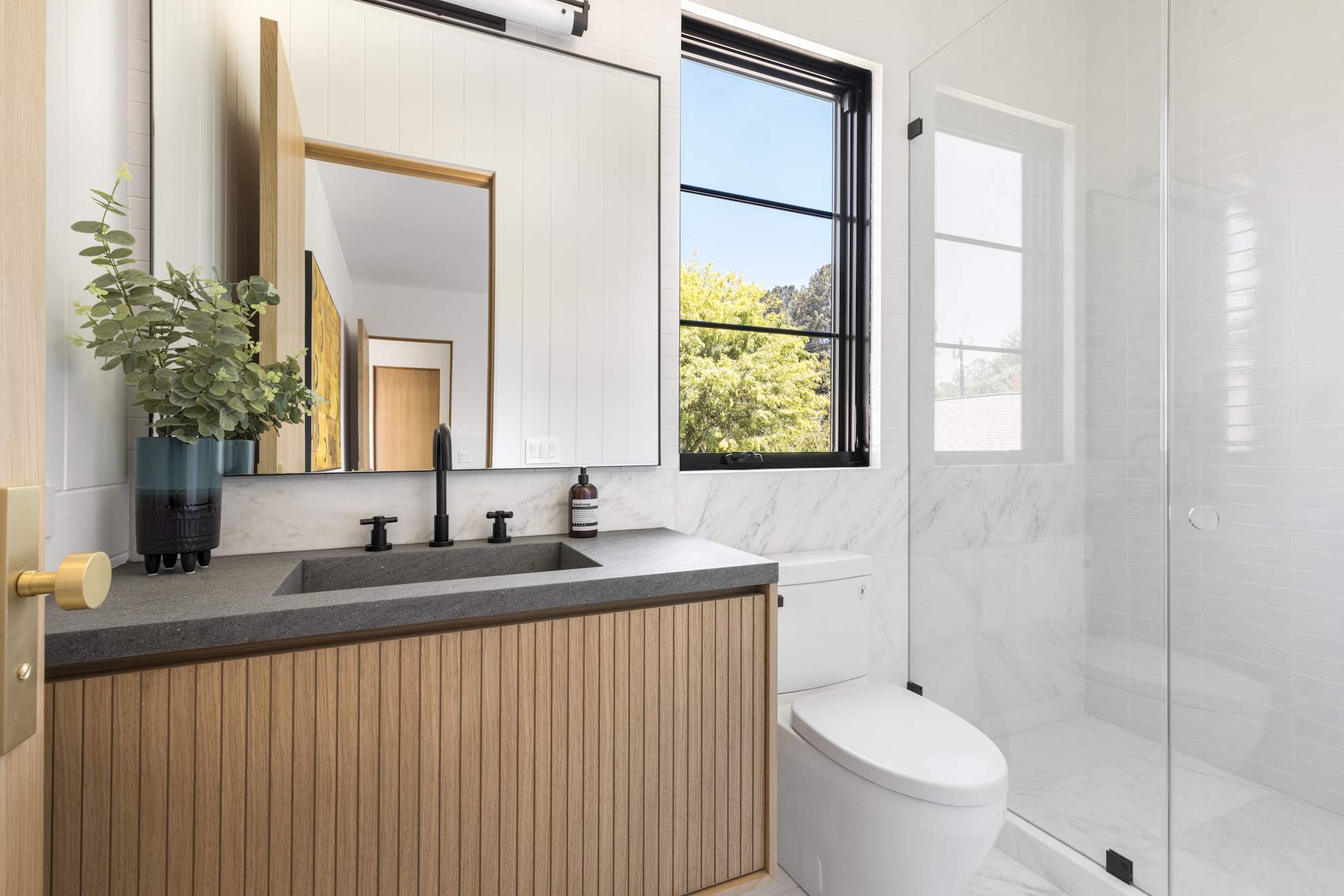 Ideally situated in the acclaimed Brentwood neighborhood, this newly constructed 6 bedroom and 7 bathroom designer residence features a contemporary take on the modern farmhouse. High-end elements from architectural designer Jae Omar and architect Eran Gispan are seamlessly woven throughout to generate a luxurious feel with a comfortable aire, including live edge surfaces, seamless cabinetry, statement bathrooms, and a thoughtful balance of natural materials. A flexible open layout blends the living and dining areas, alongside a gourmet kitchen, highlighted by dual islands, custom cabinetry, chef-grade appliances, and elegant stone surfaces. Upstairs, a remarkable primary suite encompasses a spa-grade bathroom, floor to ceiling marble fireplace, custom oversized walk-in closet, and a private balcony. Just outside, a mix of smart hardscaping and intricate landscaping composes a rear oasis, complete with outdoor kitchen and spacious pool with attached spa. The secondary bedrooms and bathrooms are situated across the 7,420 square foot residence and are laid out for both functionality and privacy. Adding to the residence is a home theater, attached garage with electric vehicle charging, dedicated laundry room, smart home technology, top-grade heating and cooling systems, and an ideal location.