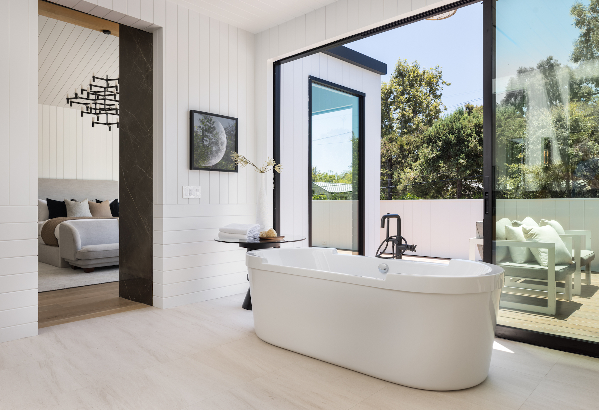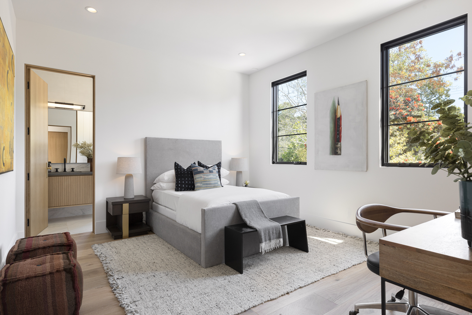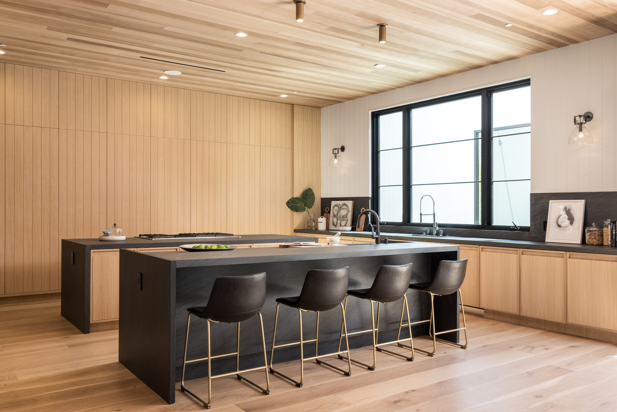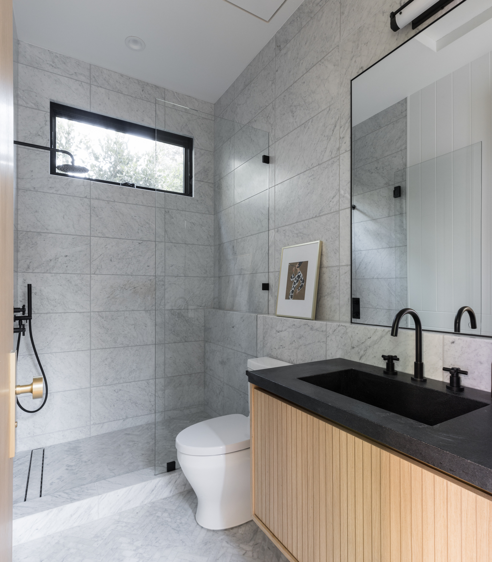 Ideally situated in the acclaimed Brentwood neighborhood, this newly constructed 6 bedroom and 7 bathroom designer residence features a contemporary take on the modern farmhouse. High-end elements from architectural designer Jae Omar and architect Eran Gispan are seamlessly woven throughout to generate a luxurious feel with a comfortable aire, including live edge surfaces, seamless cabinetry, statement bathrooms, and a thoughtful balance of natural materials. A flexible open layout blends the living and dining areas, alongside a gourmet kitchen, highlighted by dual islands, custom cabinetry, chef-grade appliances, and elegant stone surfaces. Upstairs, a remarkable primary suite encompasses a spa-grade bathroom, floor to ceiling marble fireplace, custom oversized walk-in closet, and a private balcony. Just outside, a mix of smart hardscaping and intricate landscaping composes a rear oasis, complete with outdoor kitchen and spacious pool with attached spa. The secondary bedrooms and bathrooms are situated across the 7,420 square foot residence and are laid out for both functionality and privacy. Adding to the residence is a home theater, attached garage with electric vehicle charging, dedicated laundry room, smart home technology, top-grade heating and cooling systems, and an ideal location.