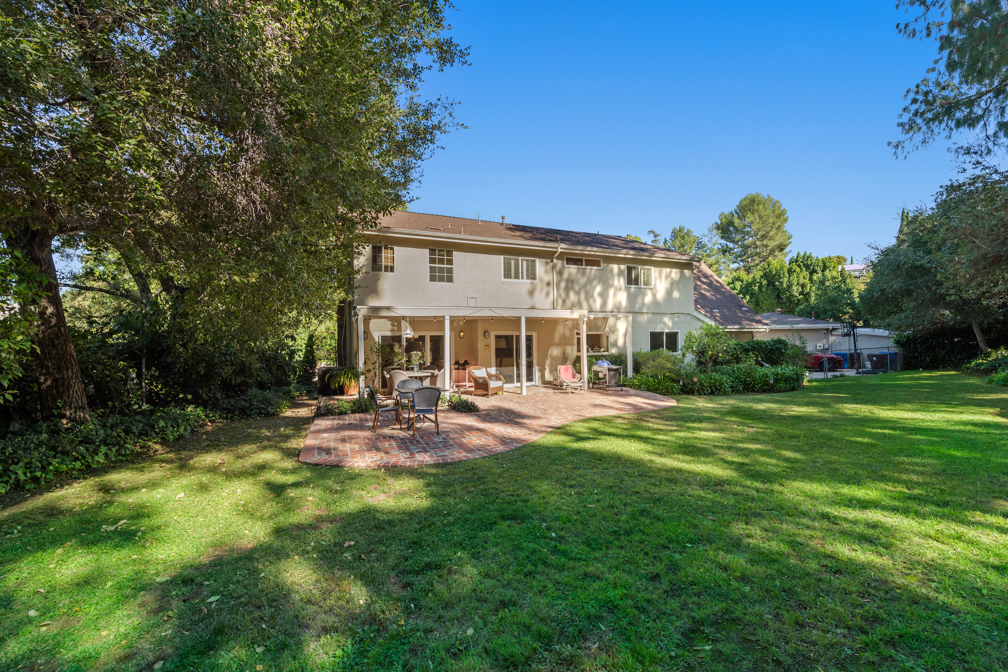 Located within the sought-after Lanai Road Elementary school district, this meticulously maintained residence boasts 6 bedrooms and 4.5 baths. Nestled at the peaceful end of a tree-lined cul-de-sac in prime Encino, this traditional two-story home seamlessly blends style and comfort. Upon crossing the welcoming threshold, you'll be greeted by a spacious living room adorned with a marble fireplace, a large picture window featuring a cozy window seat, and an adjoining elegant dining room that provides picturesque views of the expansive grounds. The kitchen has undergone a tasteful transformation with stone countertops, a custom glass tile backsplash, cabinetry, and a charming breakfast area. Completing the lower level, you'll find a versatile bedroom or office with an adjoining bathroom, a convenient powder room, and a well-organized pantry storage room. An exquisitely remodeled staircase leads to an upper-level landing area adorned with built-in storage cabinetry. Upstairs, you'll discover four generous bedrooms, and an oversized primary suite featuring a fireplace, ample closets, a dressing area, a separate shower, and a spa tub. The extensive private yard, enveloped in lush greenery, showcases a delightful brick patio, ideal for al fresco dining, a spacious grassy area with ample space for a pool, and majestic towering trees that create a tranquil Southern California ambiance. Additional home features include wood floors, recessed lighting, and a 2-car garage. With easy access to both Ventura Blvd shops and dining, as well as the Westside, this property provides a comfortable, well-rounded, and convenient lifestyle.