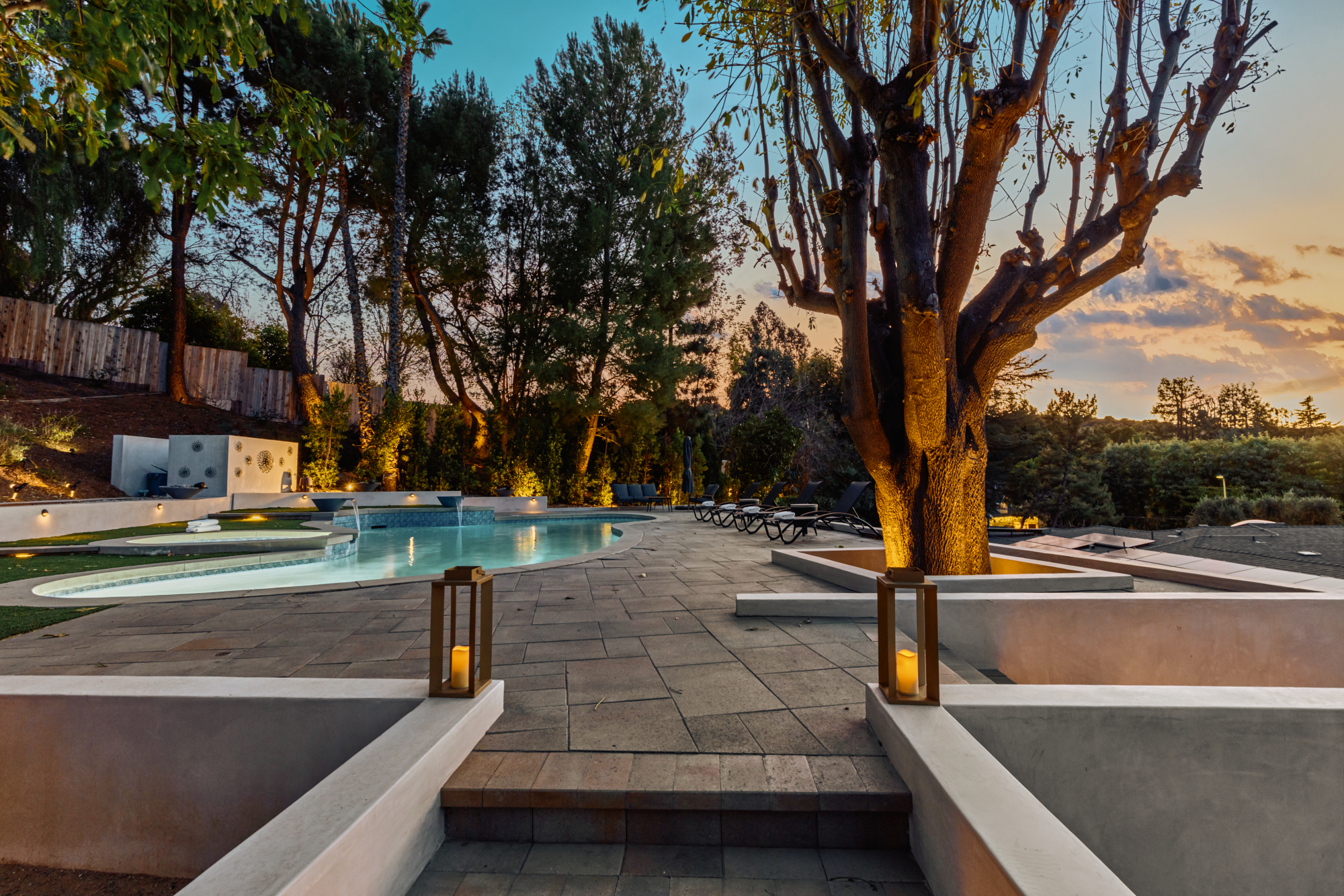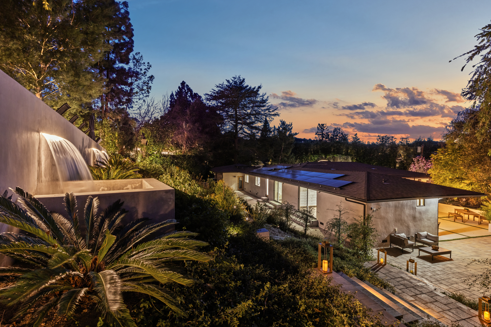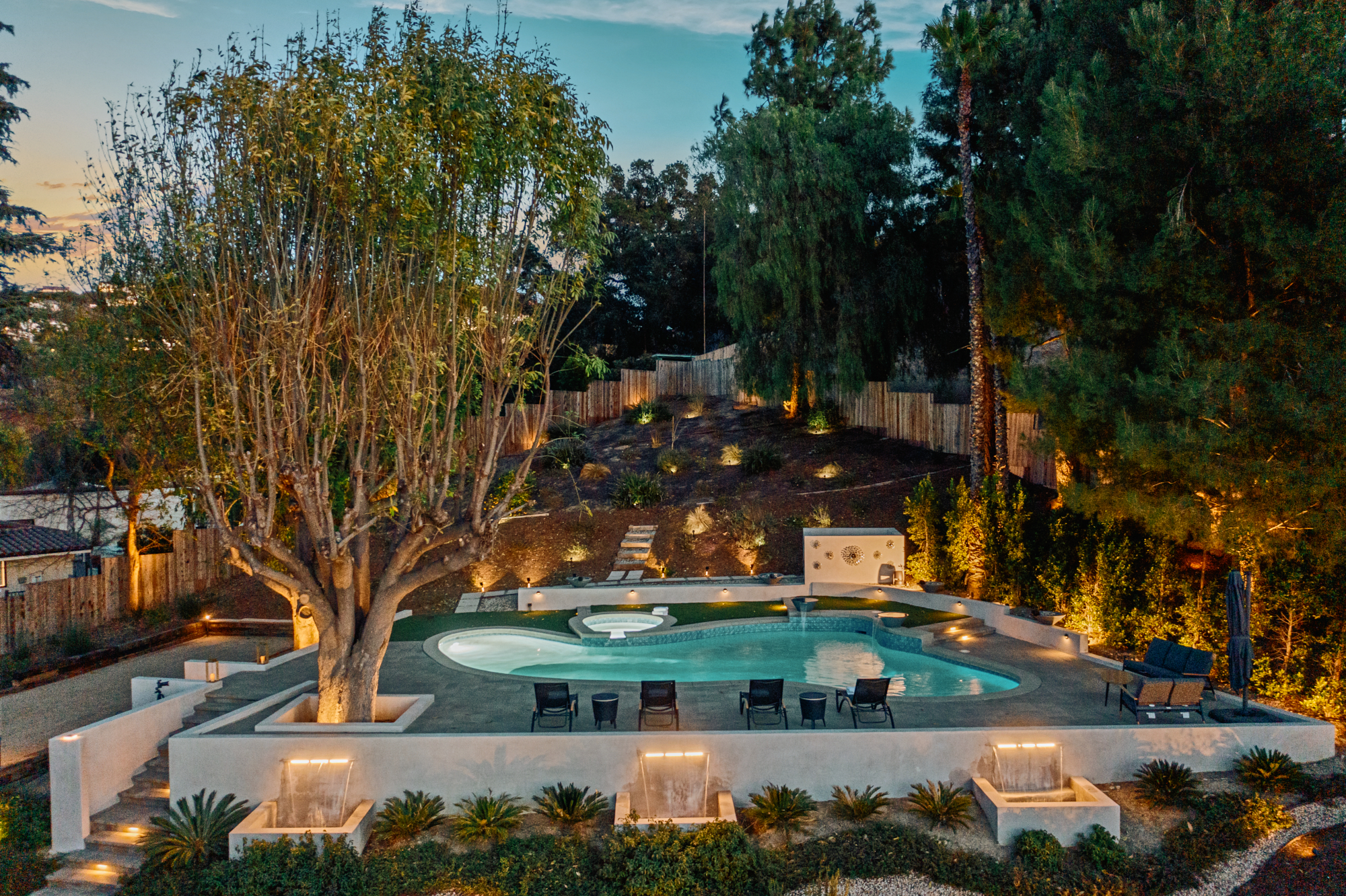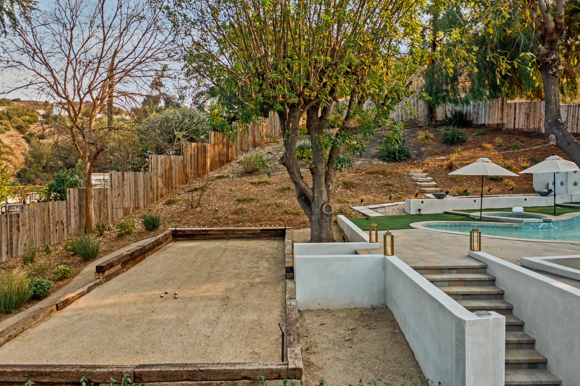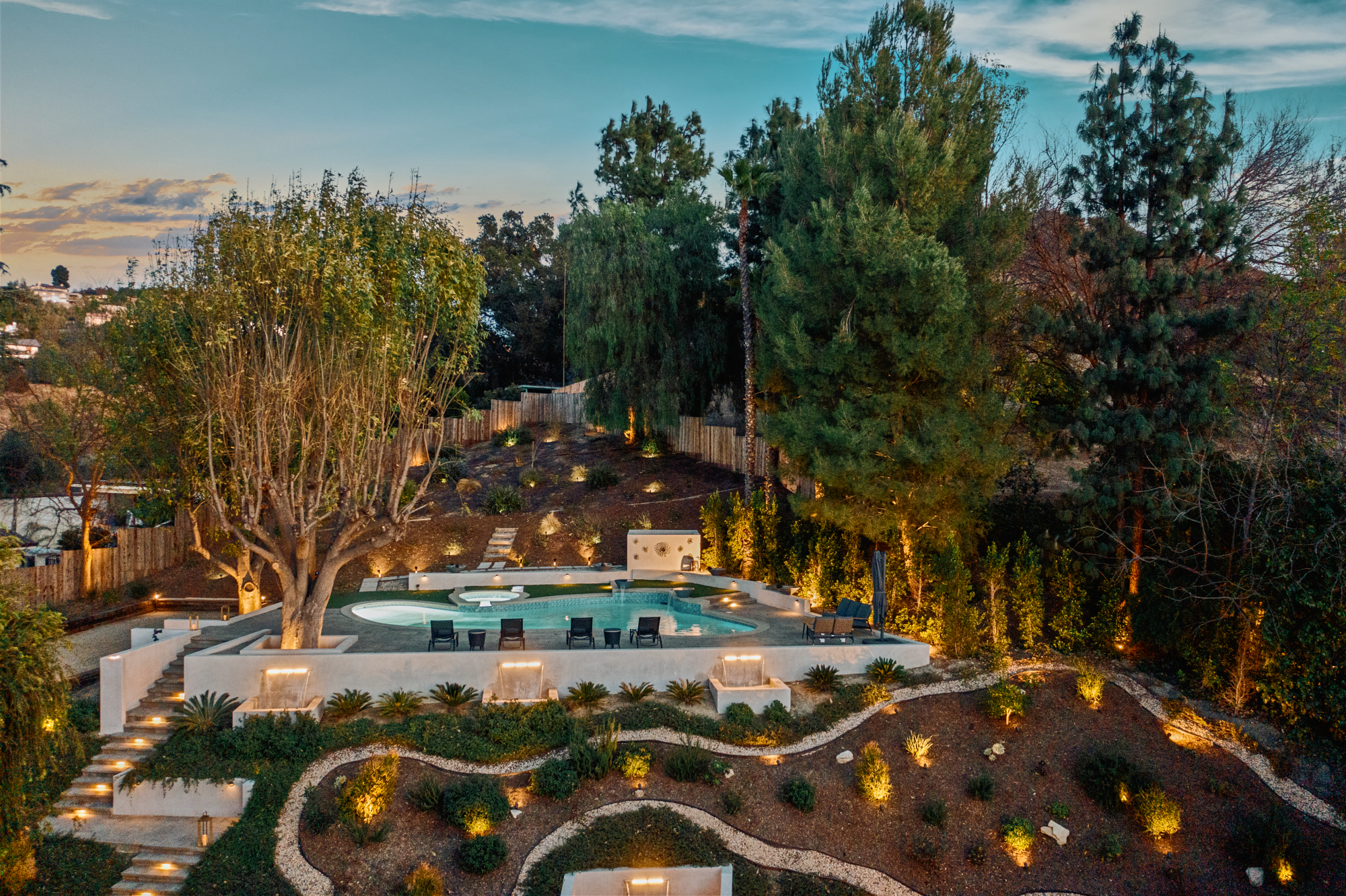 This exceptional single-story mid-century modern home in Woodland Hills sits on over half an acre along coveted Natoma Ave., where the street meets scenic hiking trails and the elevated setting provides privacy along with sweeping views of the hills and valley. Inside, double doors open to sun-filled spaces enhanced by expansive windows and skylights, leading to an open-concept living area designed for both style and comfort. The chef's kitchen features high-end appliances, a generous waterfall island, and refined finishes, flowing seamlessly into the living and dining areas anchored by a custom wine bar. The spacious primary suite offers a peaceful retreat with a walk-in closet and spa-like bath, while three versatile secondary bedrooms capture natural light and beautiful views. Outside, the resort-like backyard becomes an unforgettable highlight, complete with a sparkling pool, cascading waterfalls, ample lounging and gathering zones, multiple vantage points, a fire pit, bocce court, and lush landscaping is an ideal setting for effortless indoor-outdoor living and memorable entertaining.
