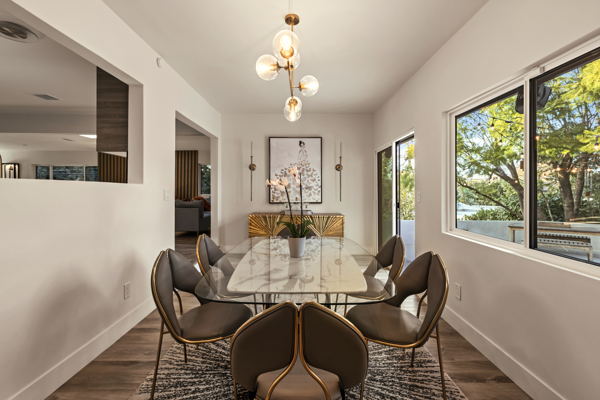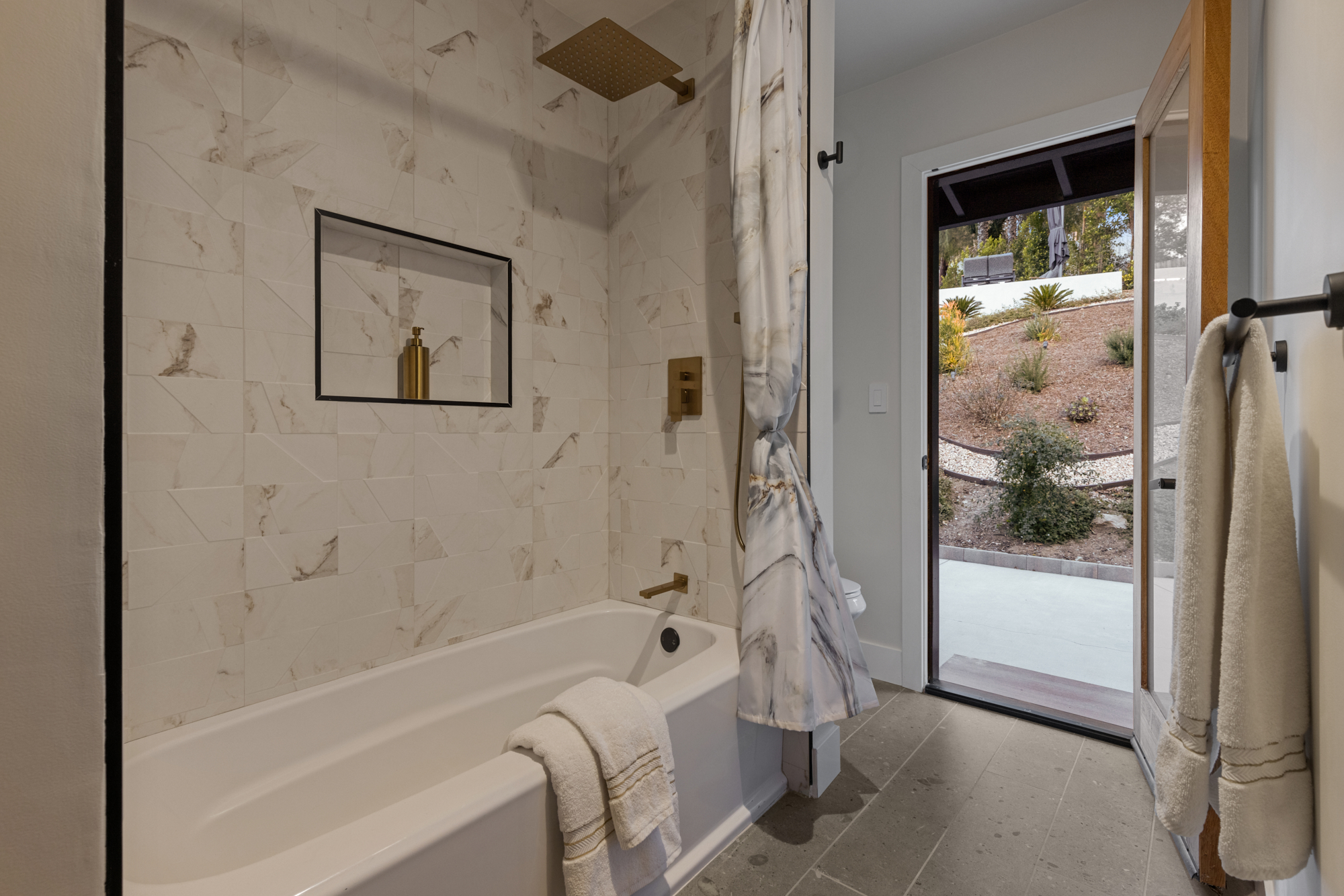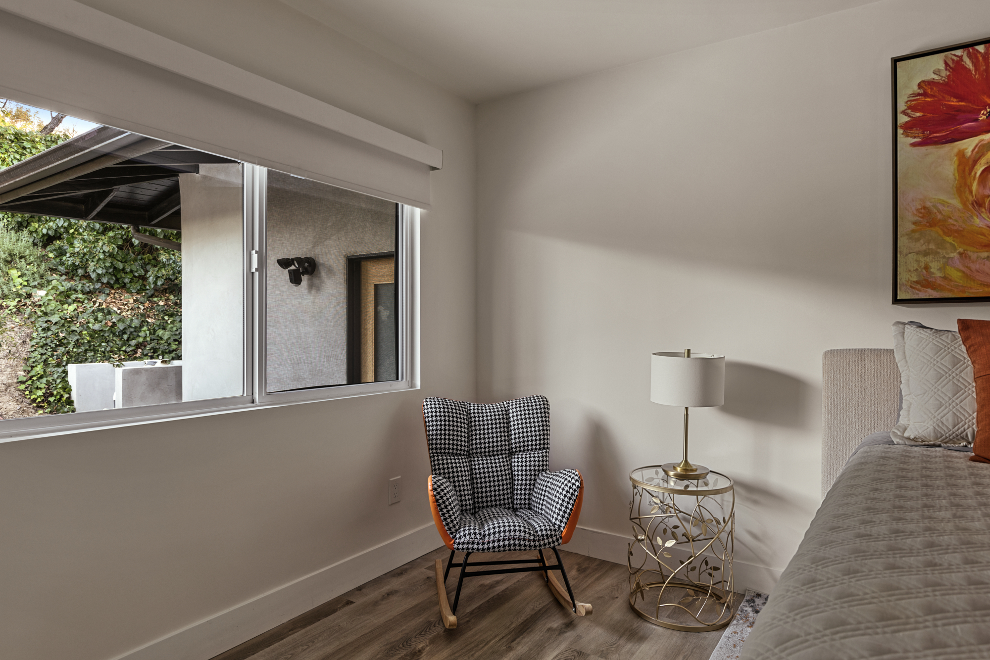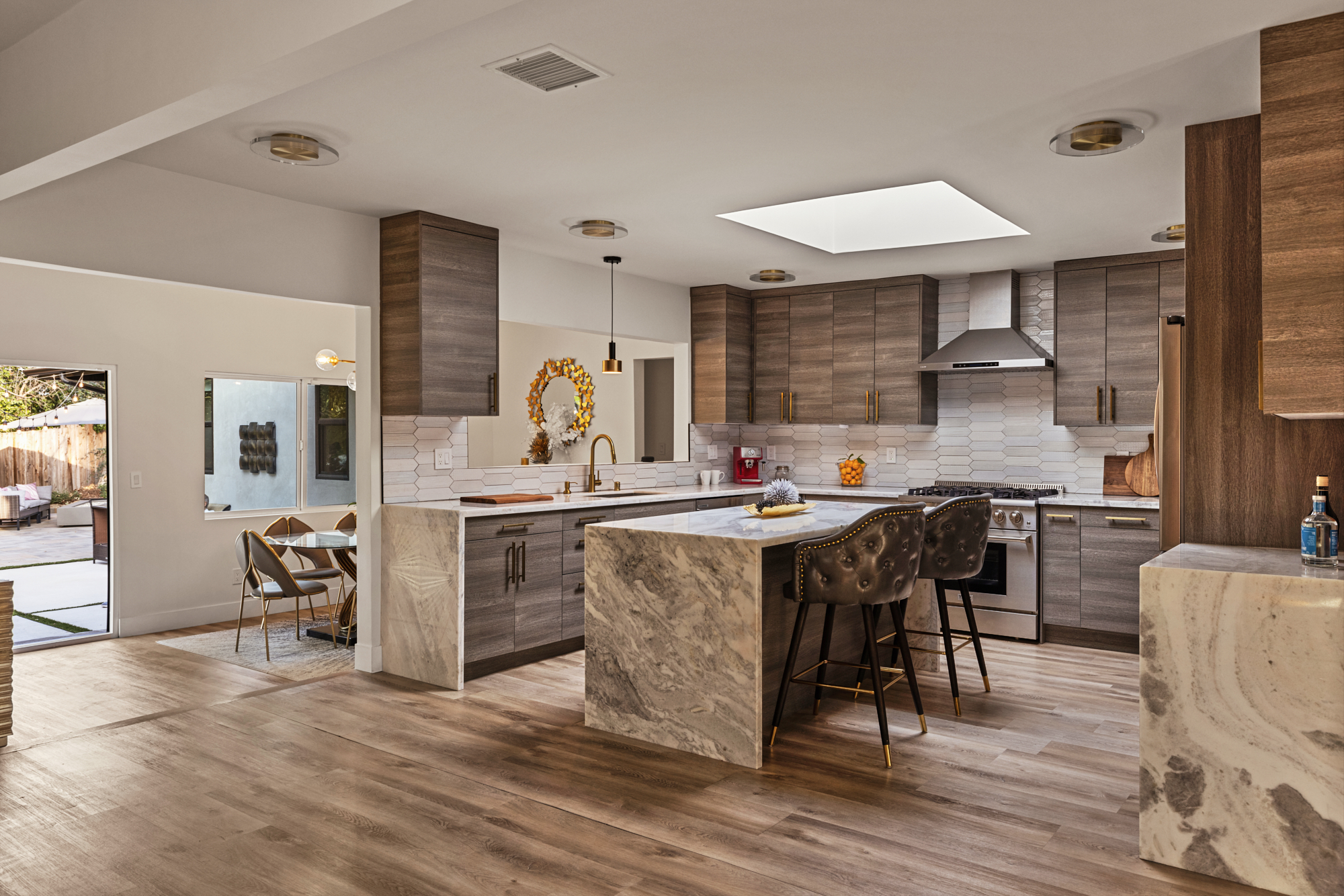 This exceptional single-story mid-century modern home in Woodland Hills sits on over half an acre along coveted Natoma Ave., where the street meets scenic hiking trails and the elevated setting provides privacy along with sweeping views of the hills and valley. Inside, double doors open to sun-filled spaces enhanced by expansive windows and skylights, leading to an open-concept living area designed for both style and comfort. The chef's kitchen features high-end appliances, a generous waterfall island, and refined finishes, flowing seamlessly into the living and dining areas anchored by a custom wine bar. The spacious primary suite offers a peaceful retreat with a walk-in closet and spa-like bath, while three versatile secondary bedrooms capture natural light and beautiful views. Outside, the resort-like backyard becomes an unforgettable highlight, complete with a sparkling pool, cascading waterfalls, ample lounging and gathering zones, multiple vantage points, a fire pit, bocce court, and lush landscaping is an ideal setting for effortless indoor-outdoor living and memorable entertaining.